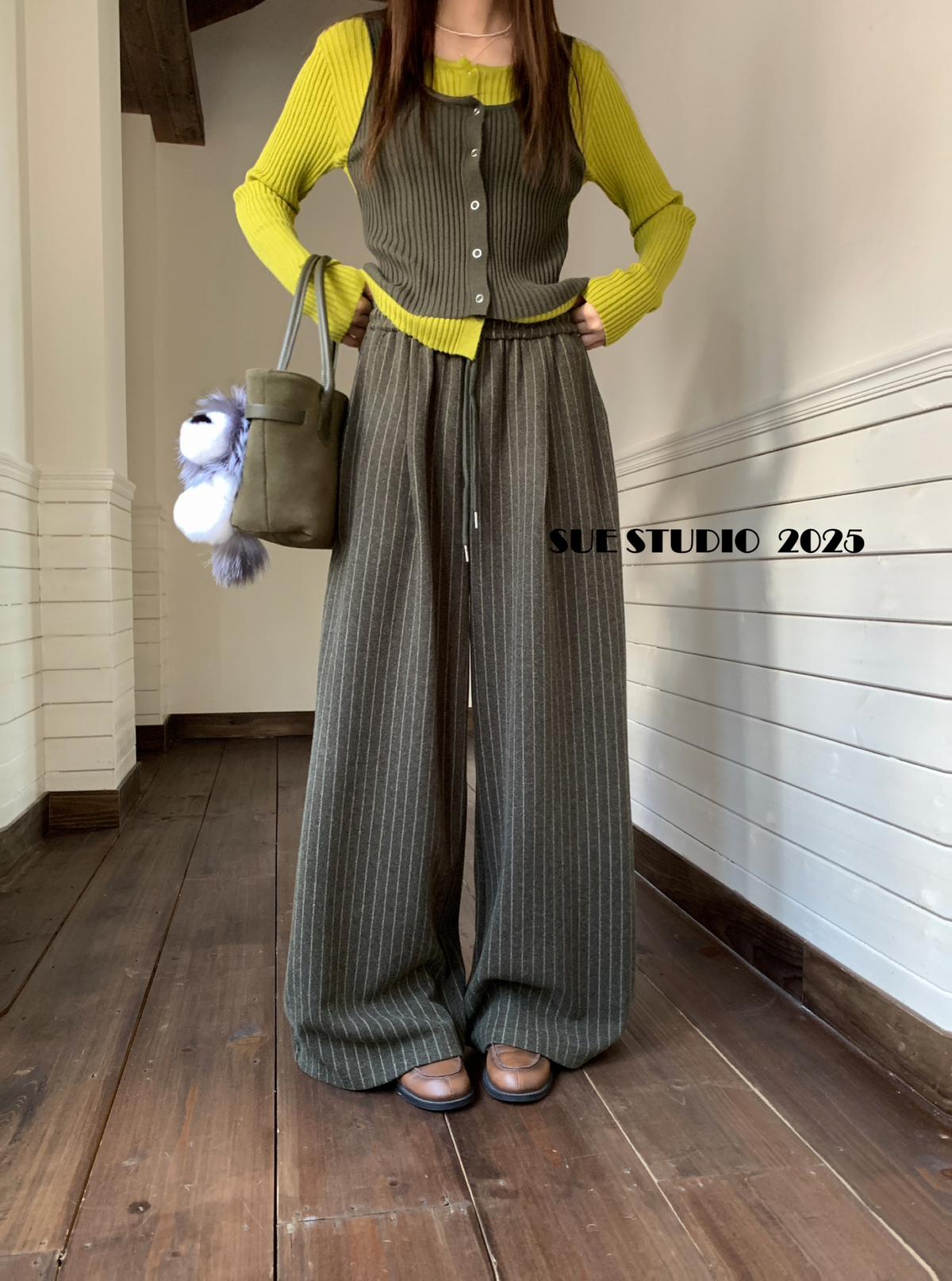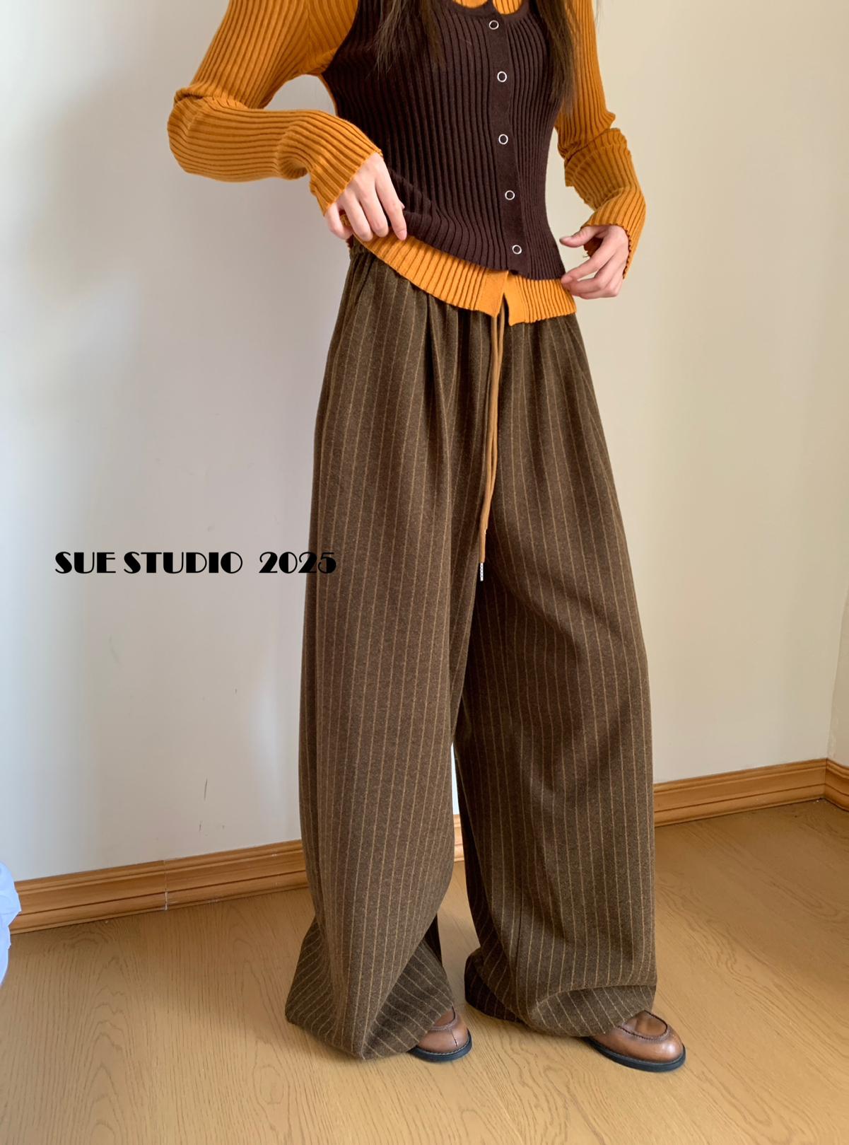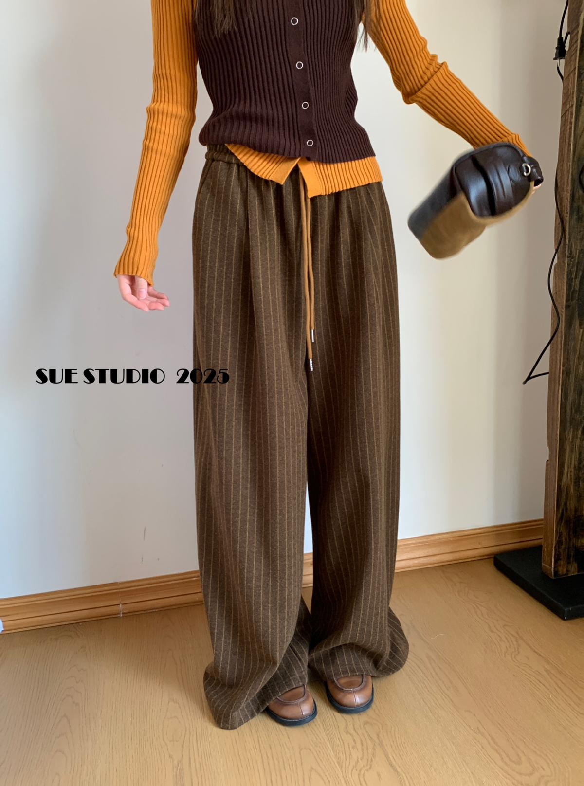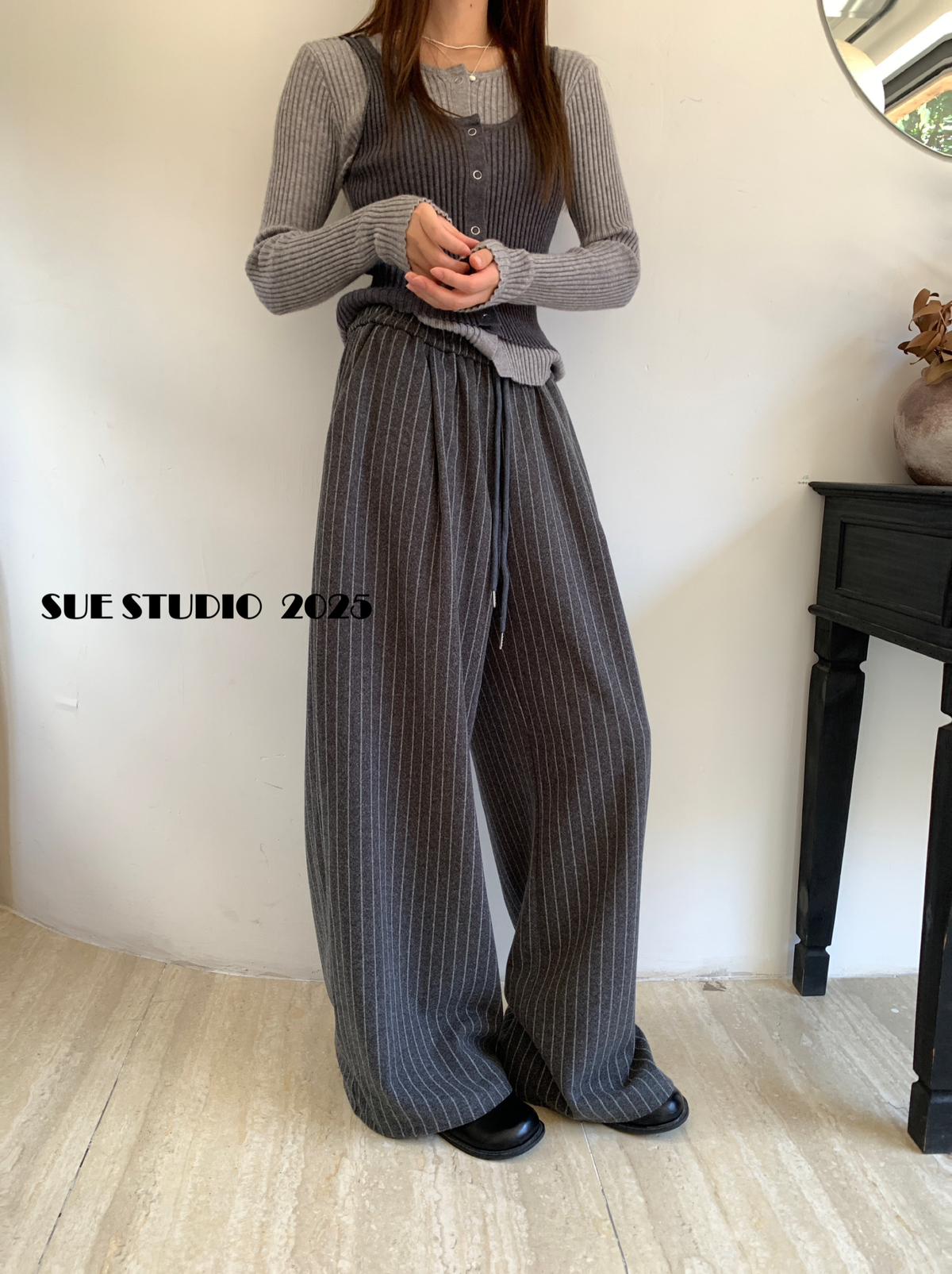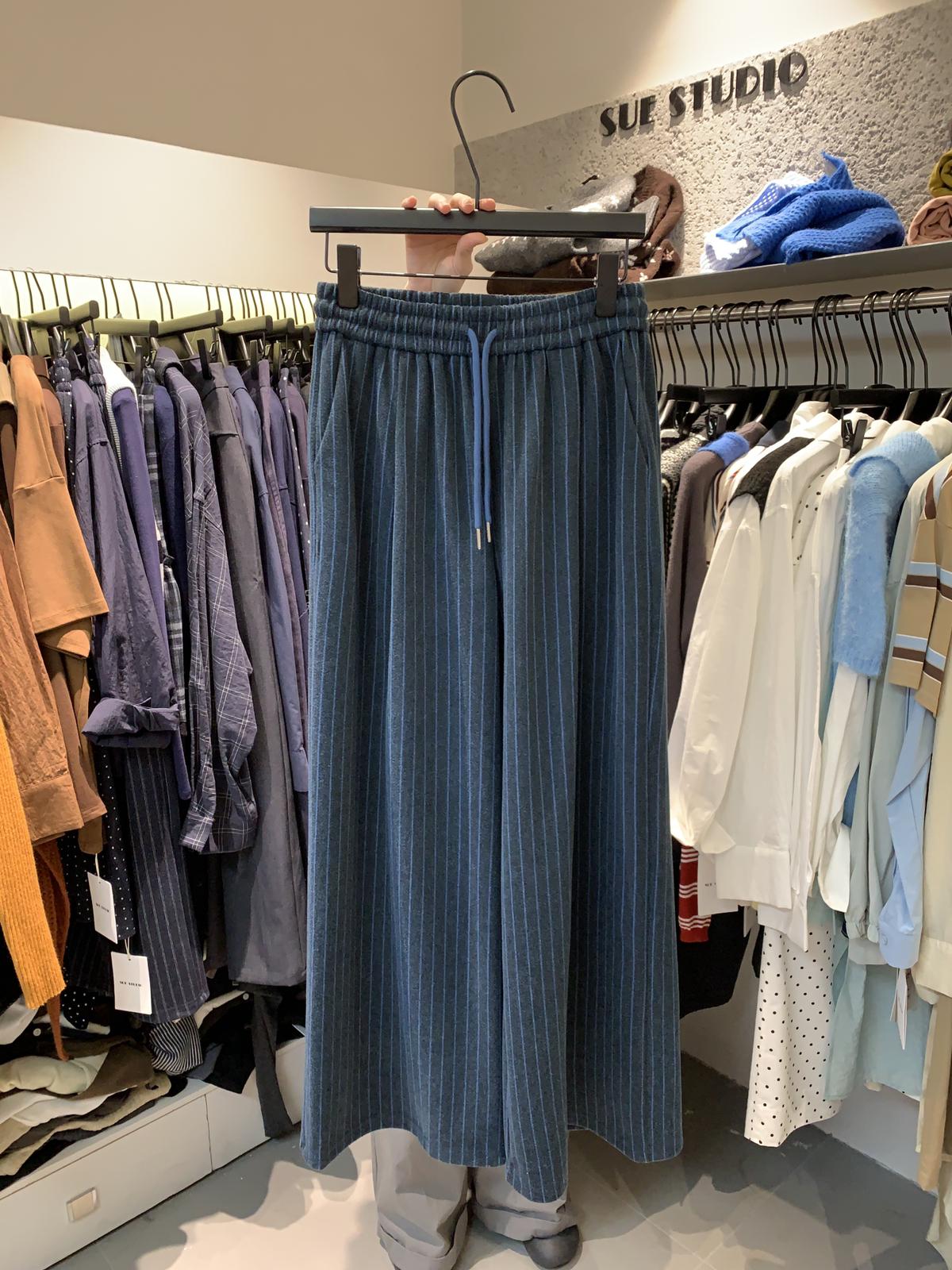 【C7277】韓系簡約加厚款豎紋鬆緊腰顯瘦顯高休閒褲