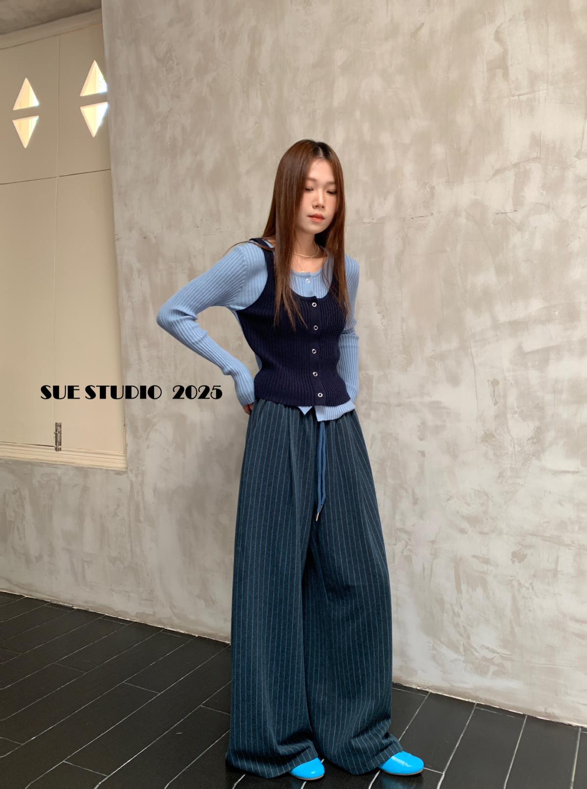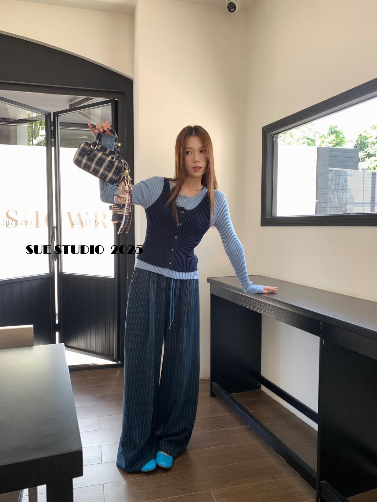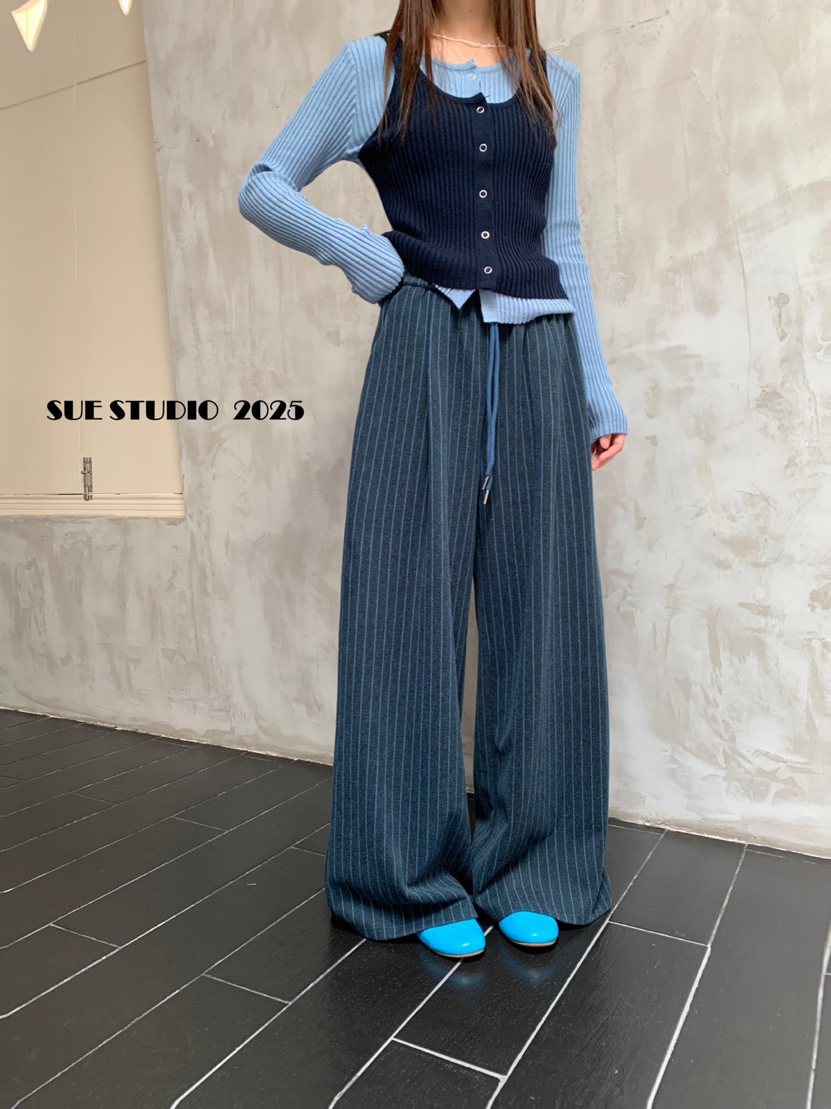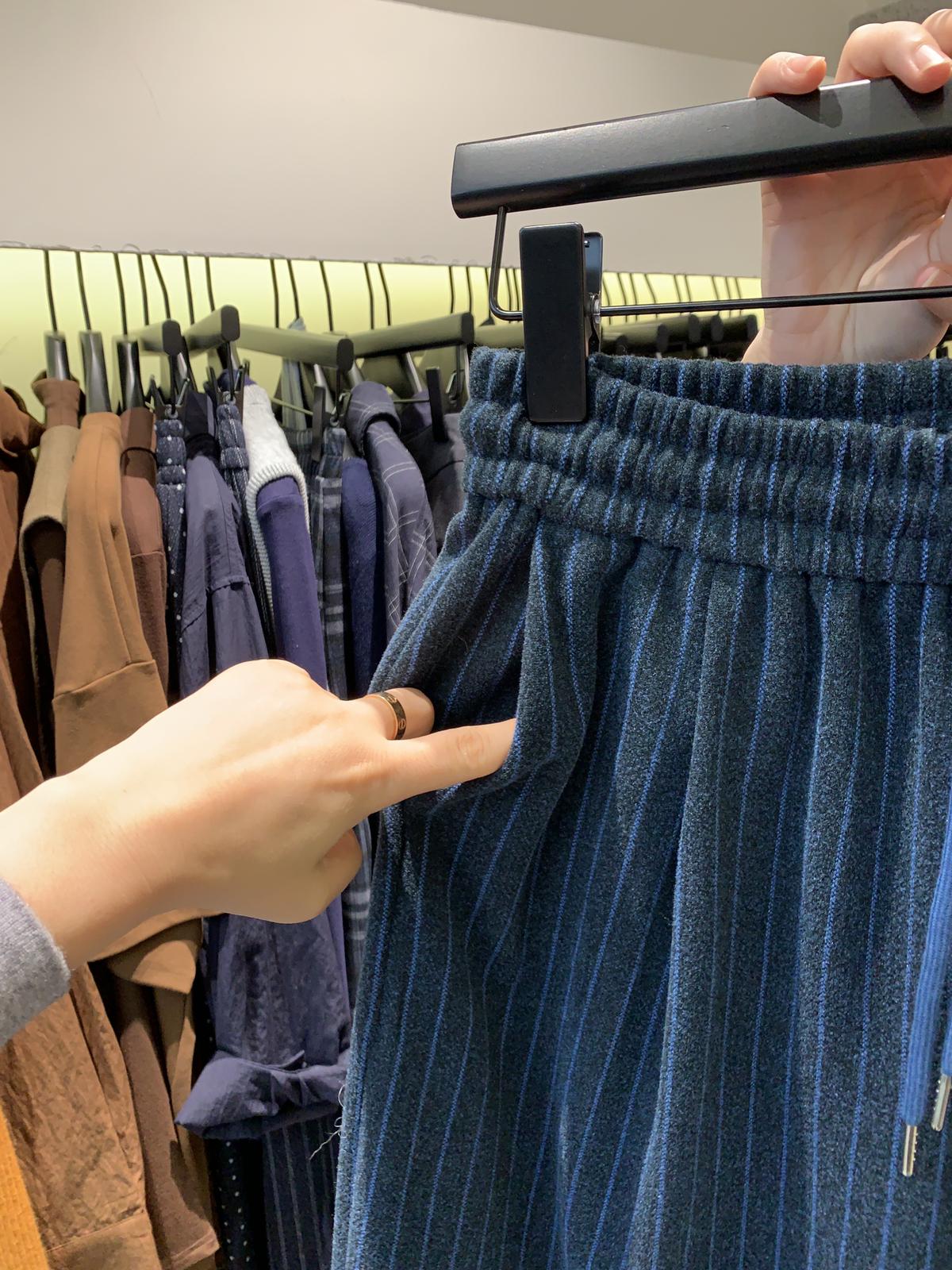 【C7277】韓系簡約加厚款豎紋鬆緊腰顯瘦顯高休閒褲