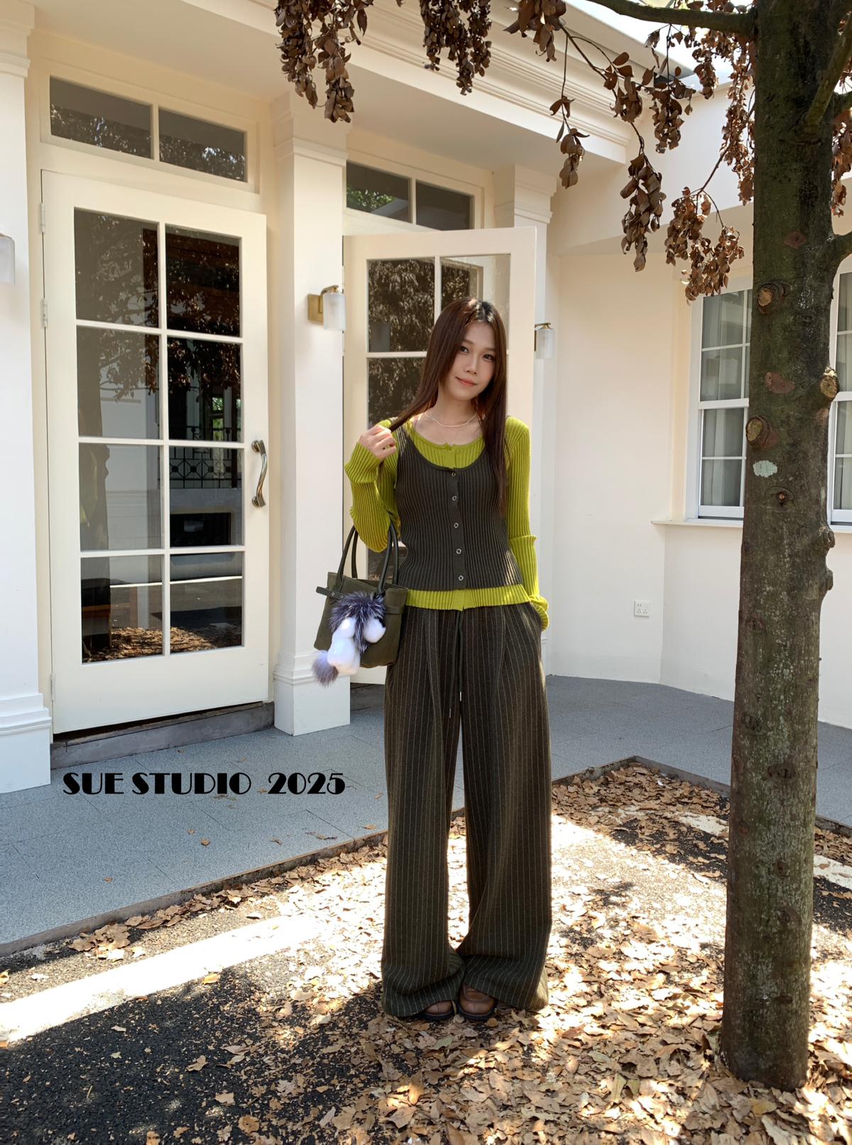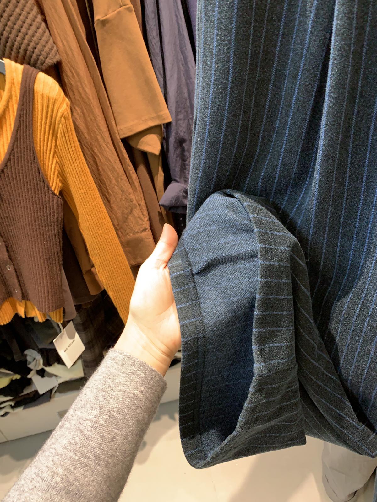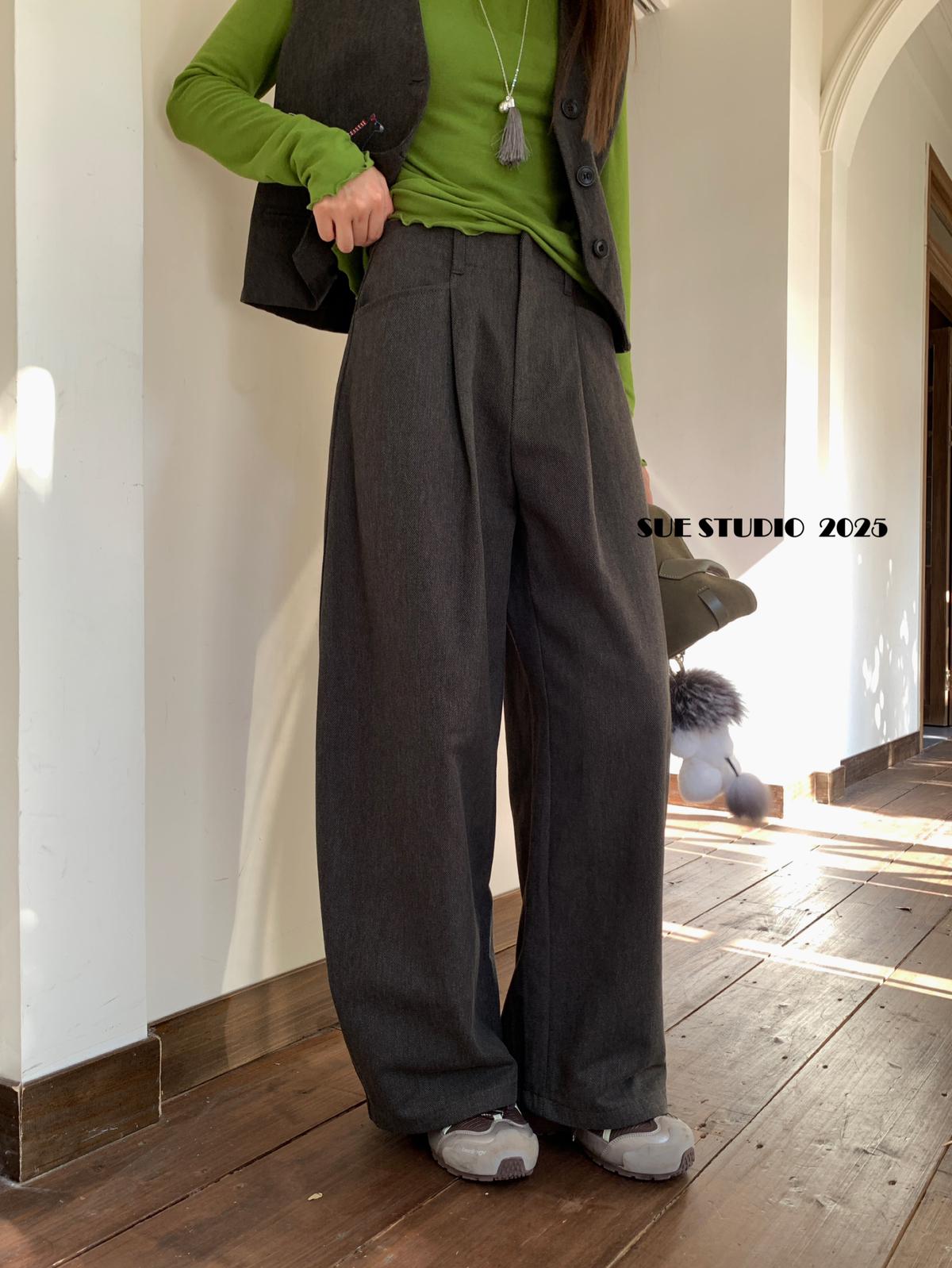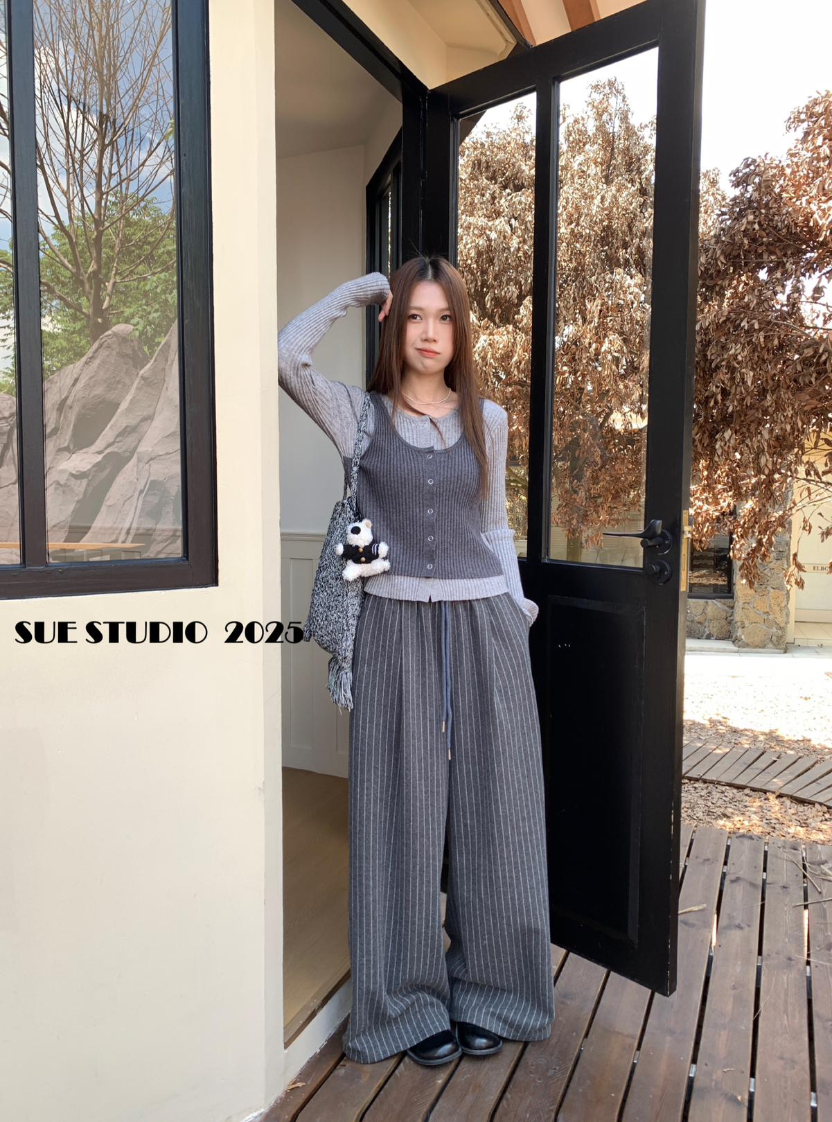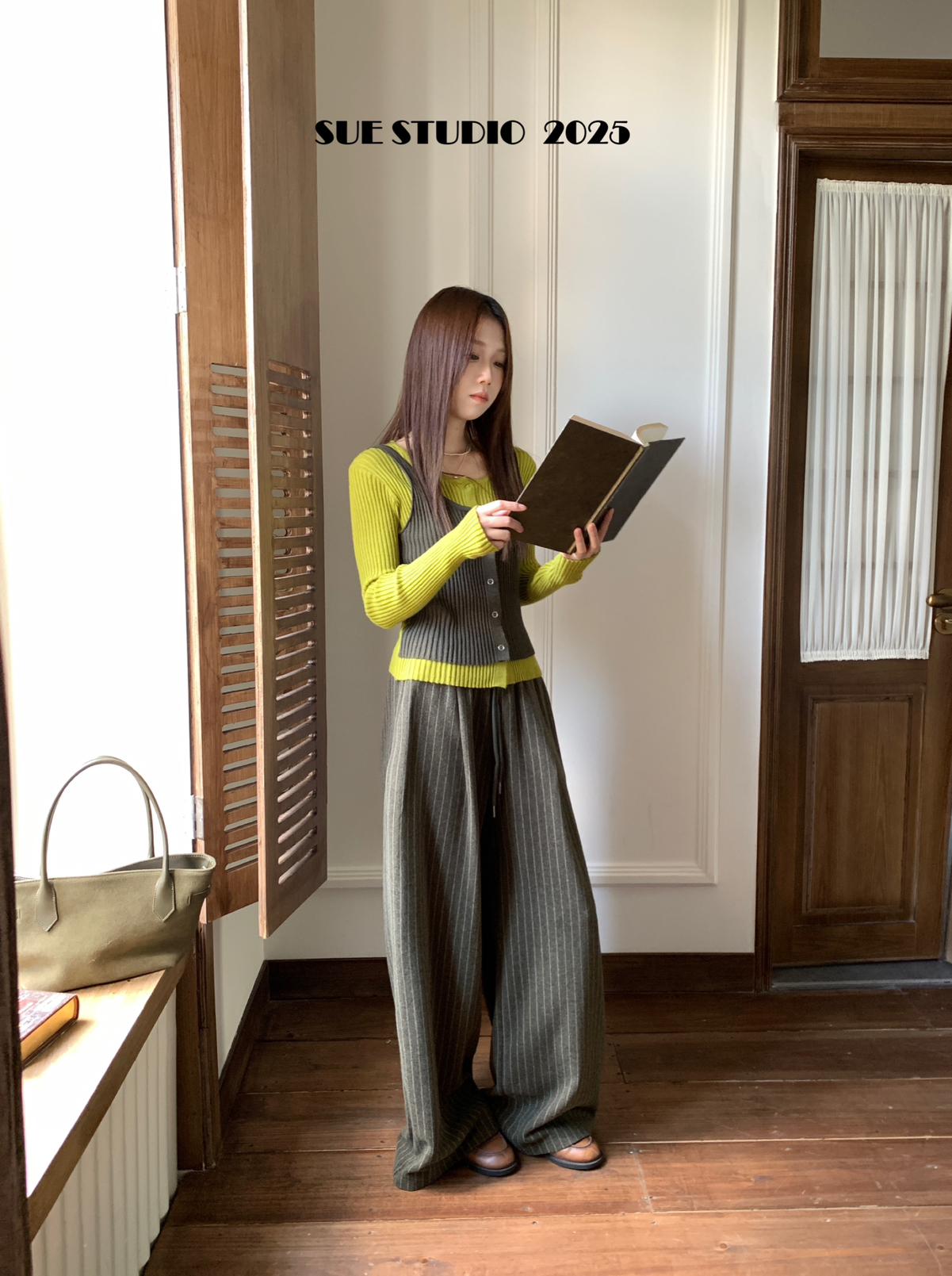 【C7277】韓系簡約加厚款豎紋鬆緊腰顯瘦顯高休閒褲