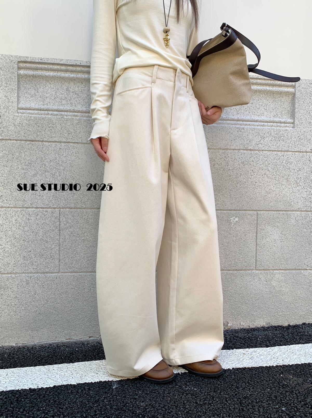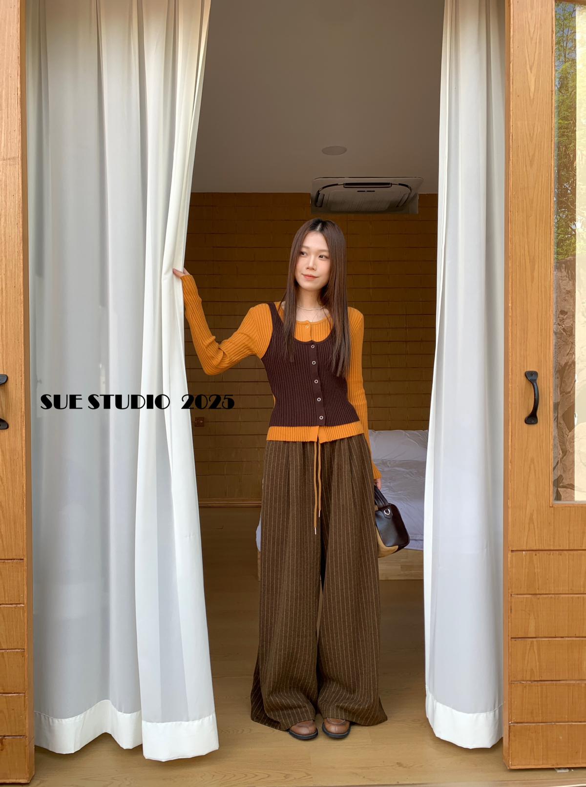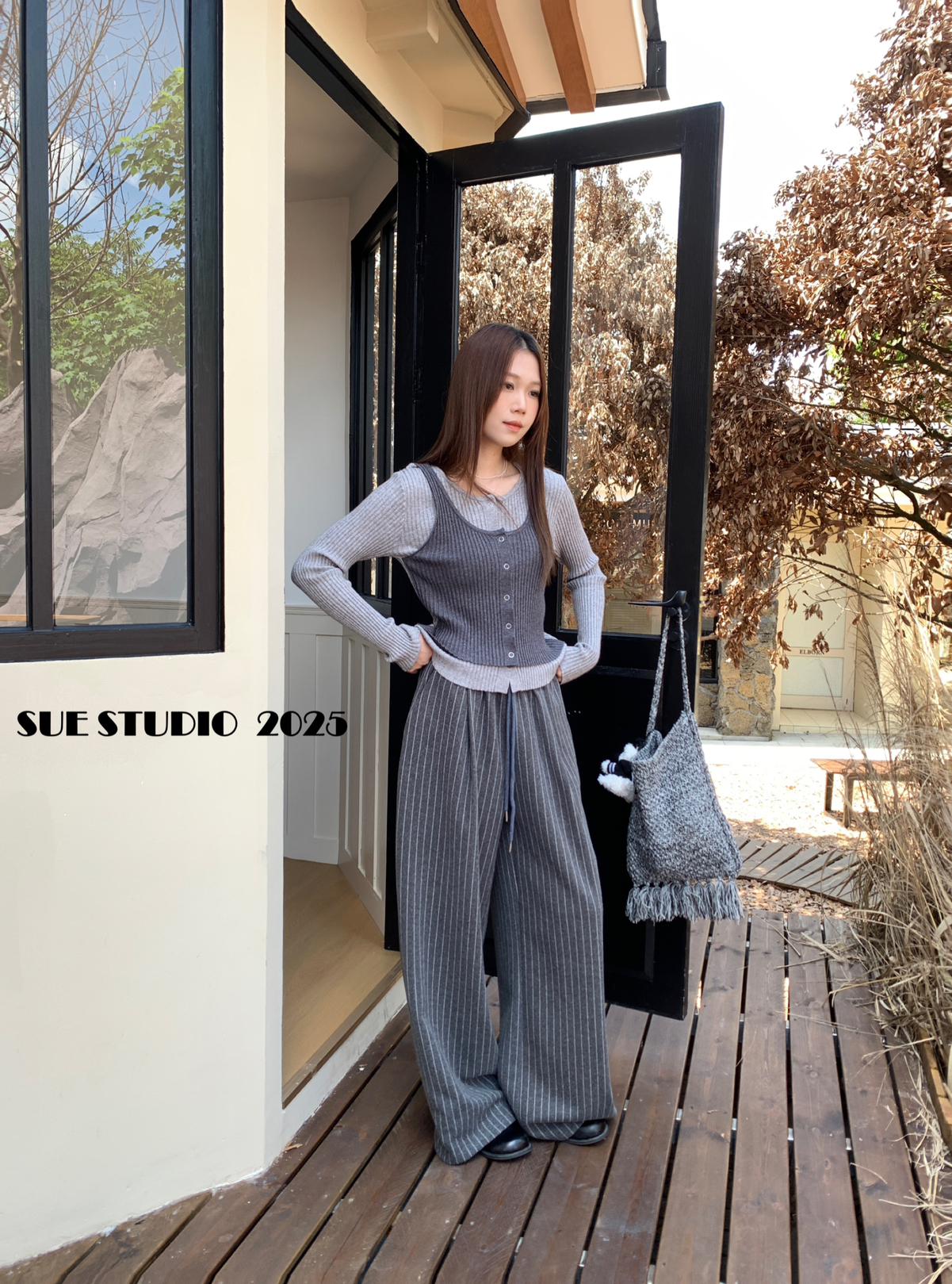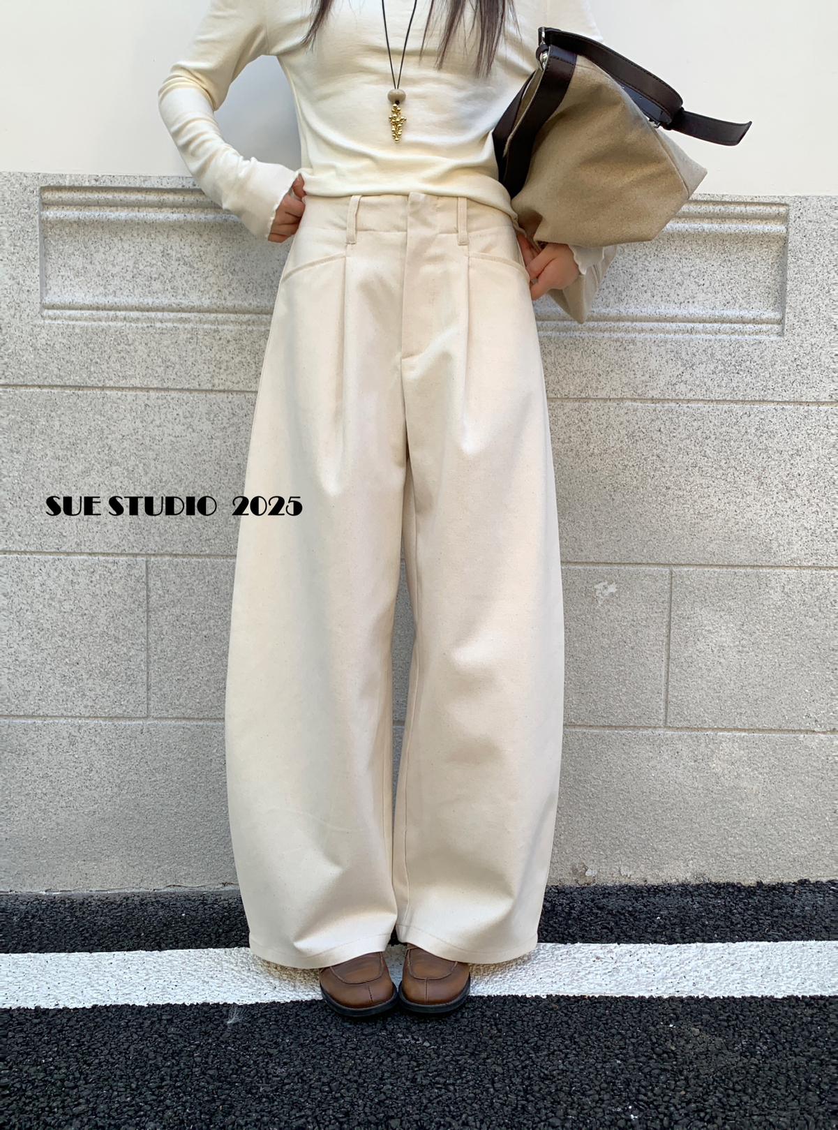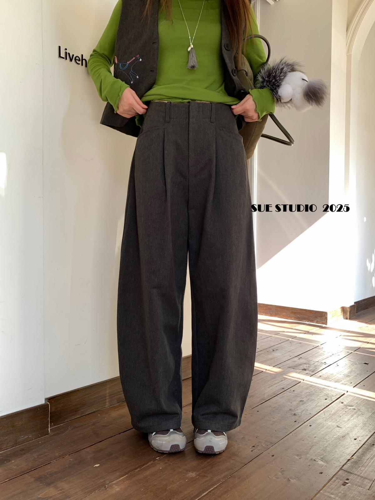 【C7277】韓系簡約加厚款豎紋鬆緊腰顯瘦顯高休閒褲