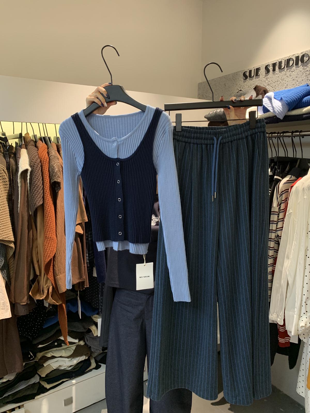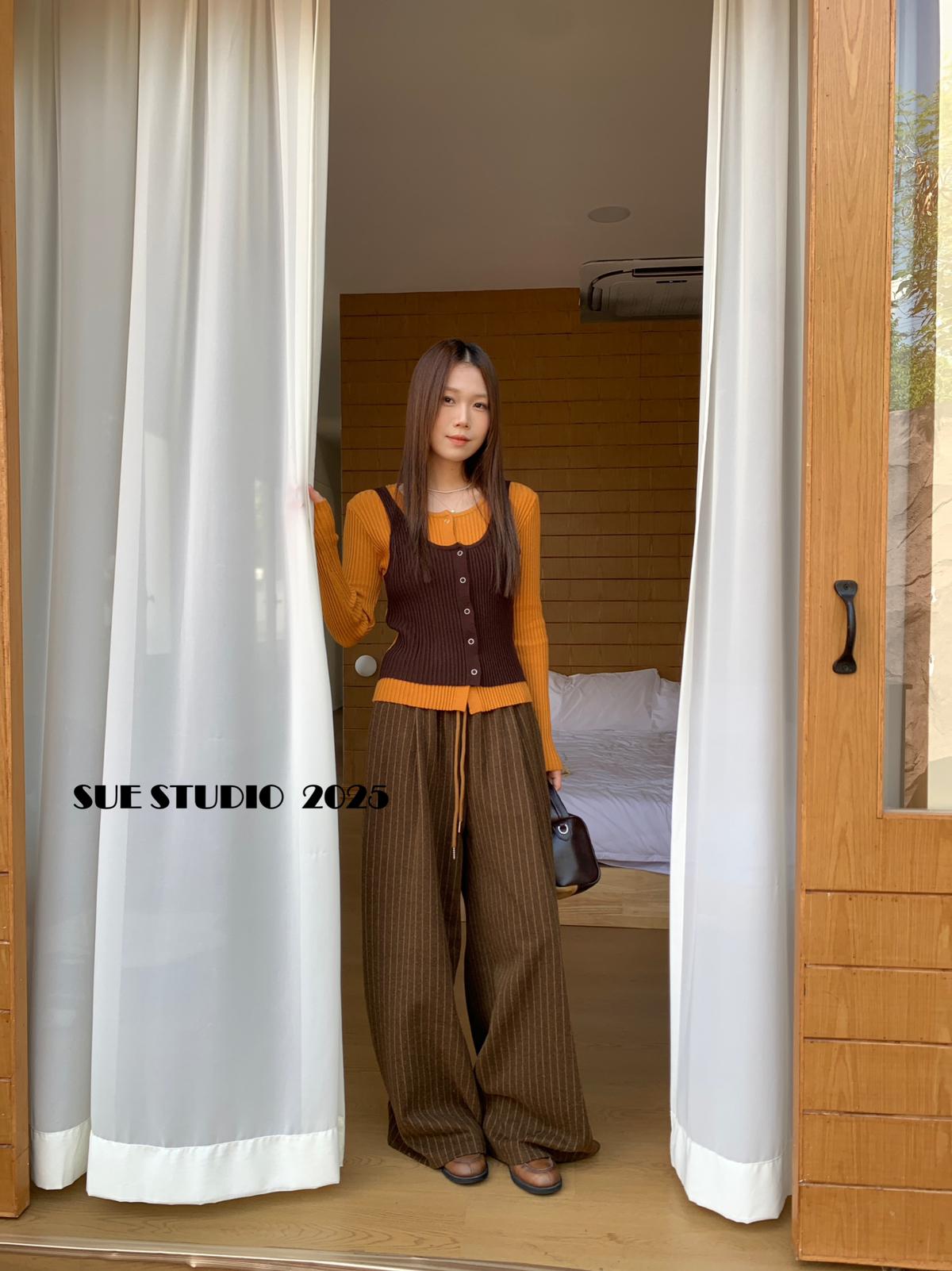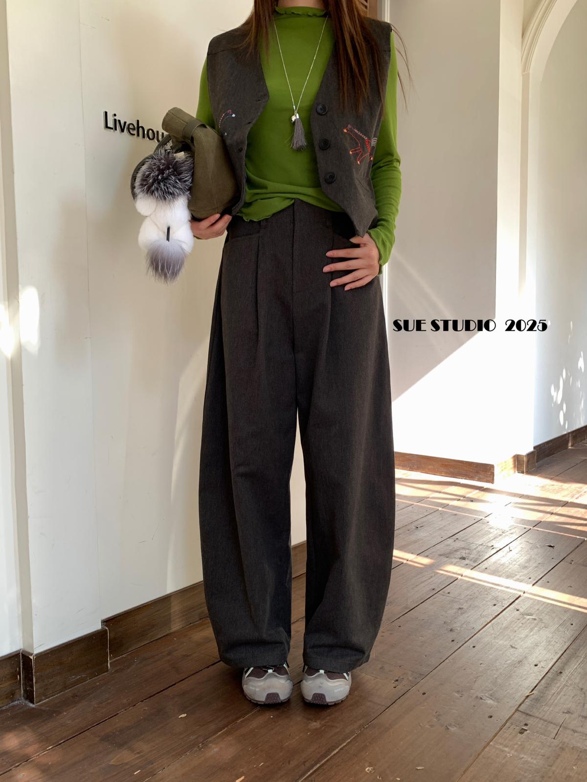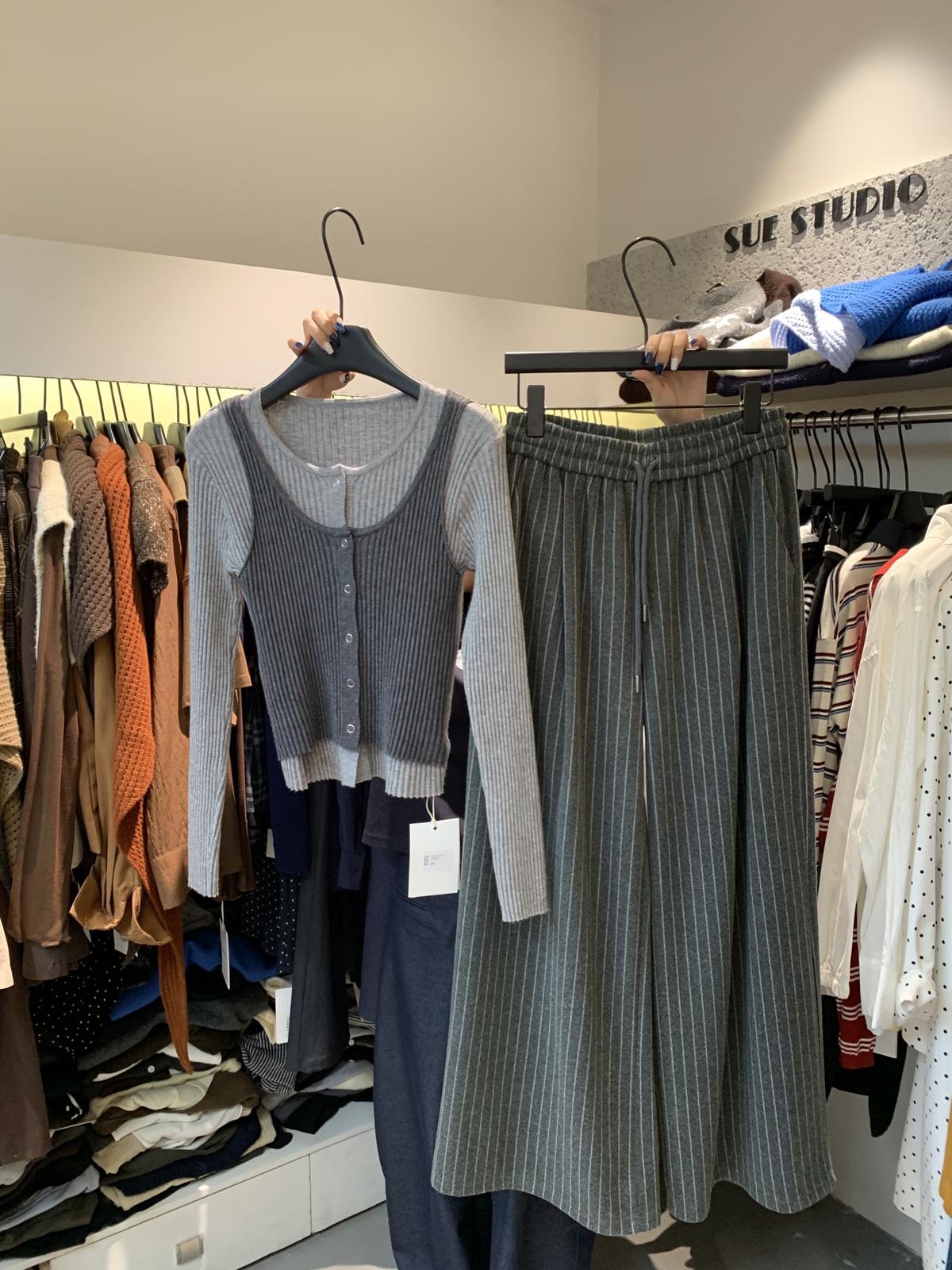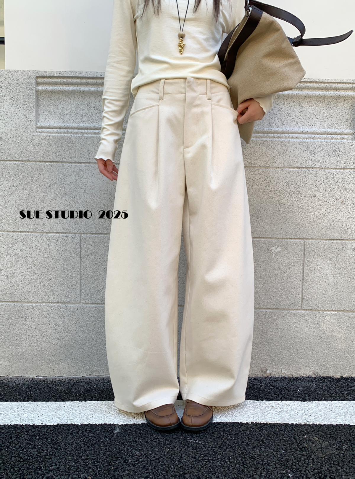 【C7277】韓系簡約加厚款豎紋鬆緊腰顯瘦顯高休閒褲
