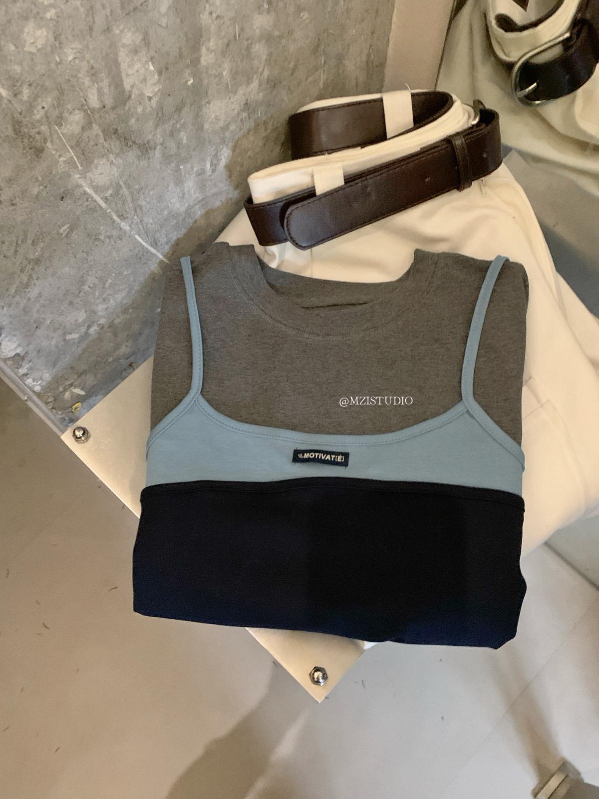 【C7288】chic韓女穿搭秋冬輕亞風假兩件吊帶撞色設計顯瘦好搭配長袖T恤