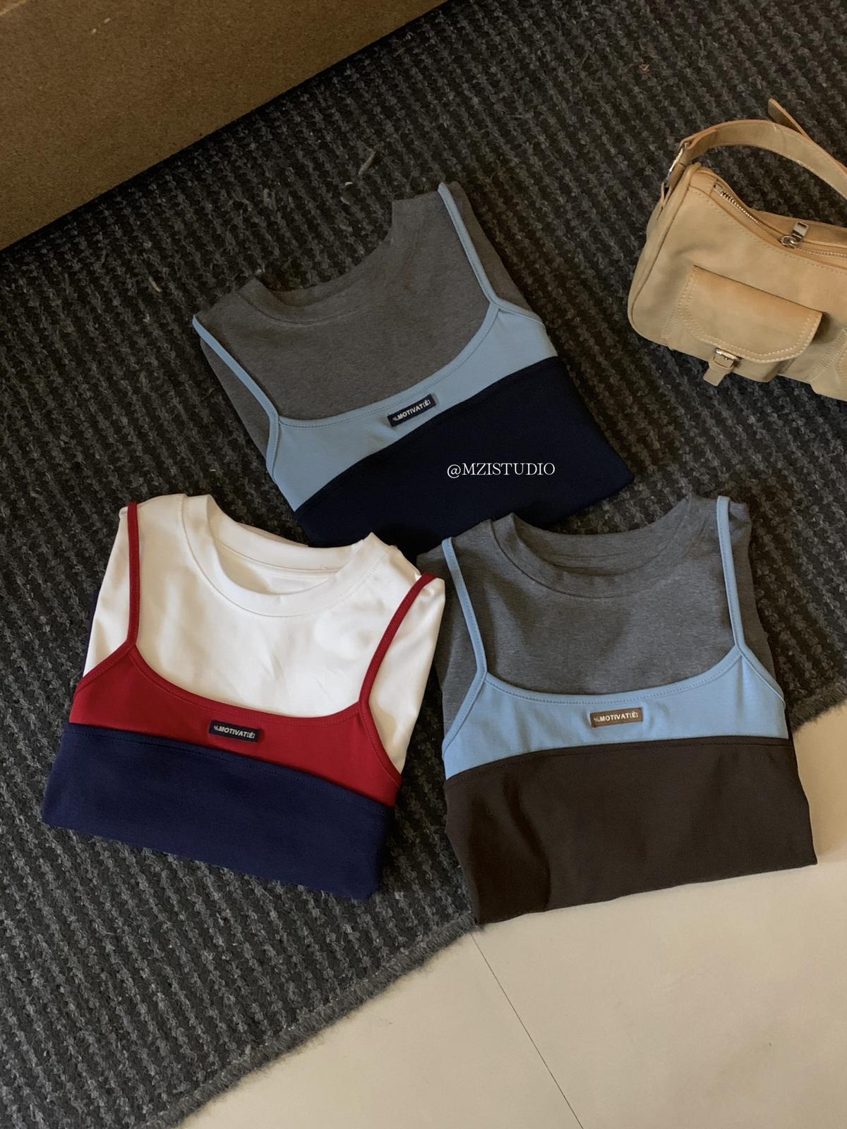 3. 【C7288】chic韓女穿搭秋冬輕亞風假兩件吊帶撞色設計顯瘦好搭配長袖T恤