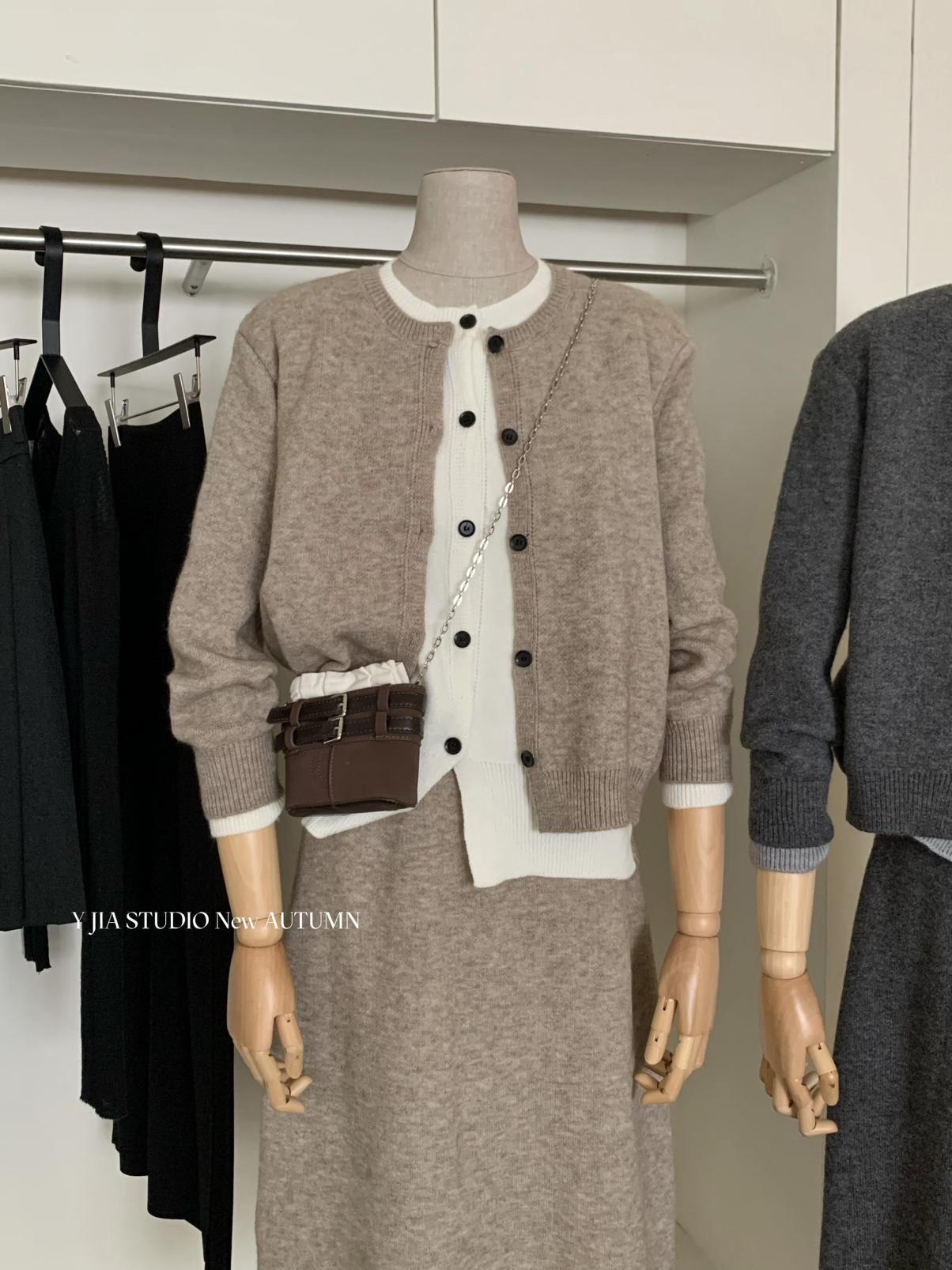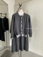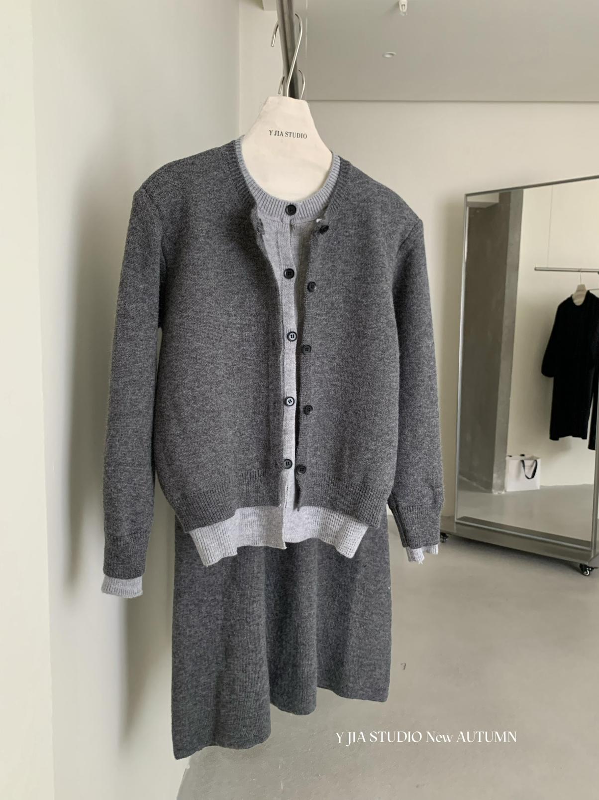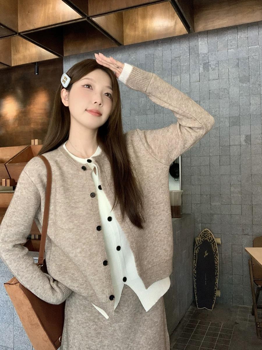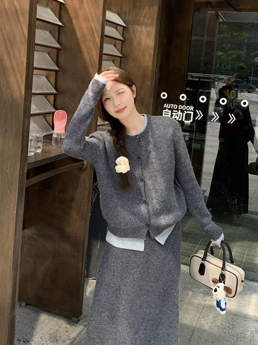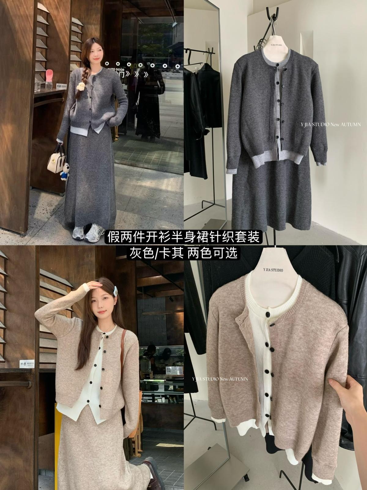 【C7359】設計感撞色假兩件針織開衫+半身裙套裝