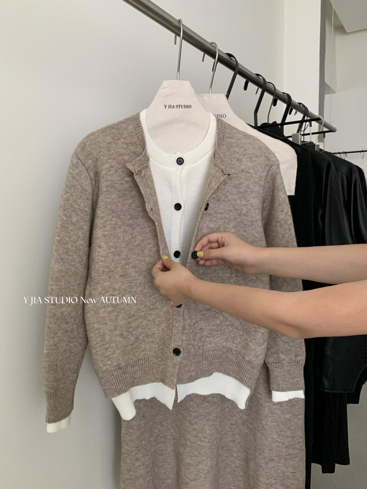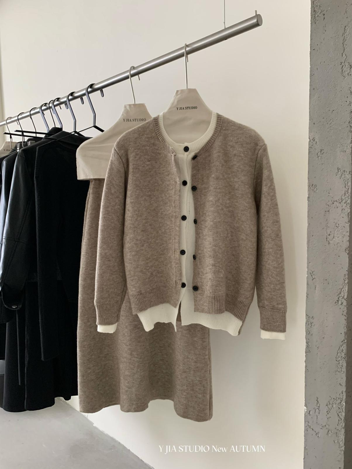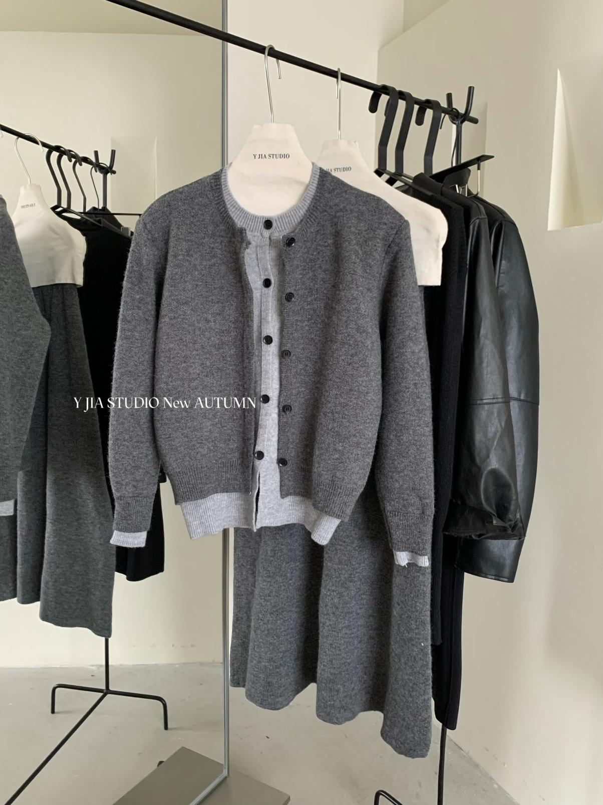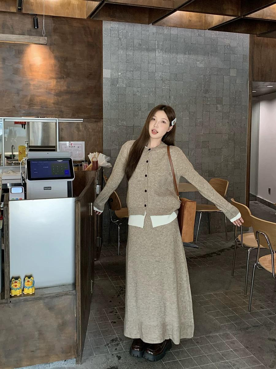 【C7359】設計感撞色假兩件針織開衫+半身裙套裝