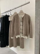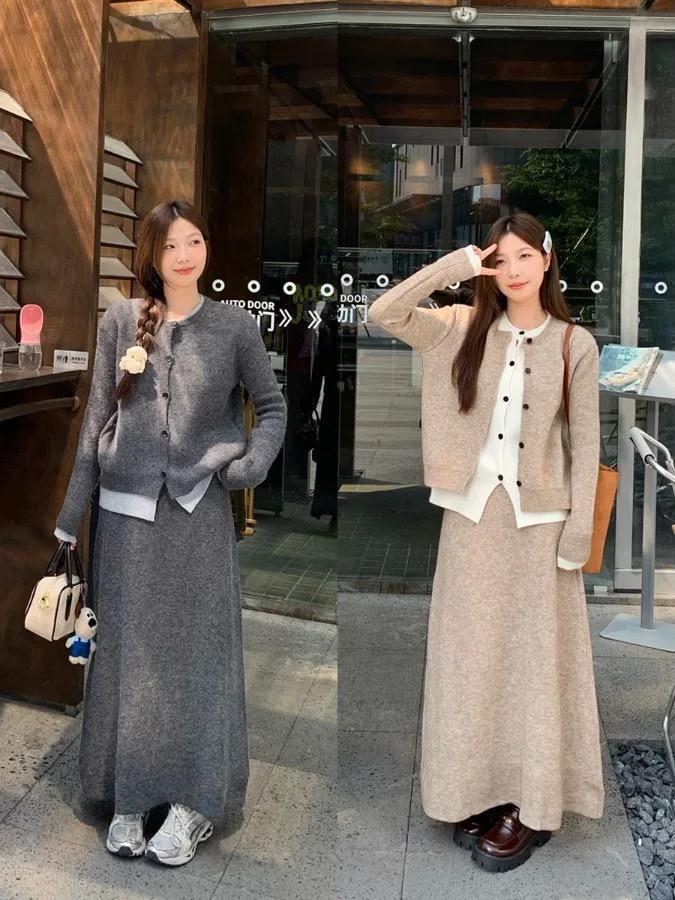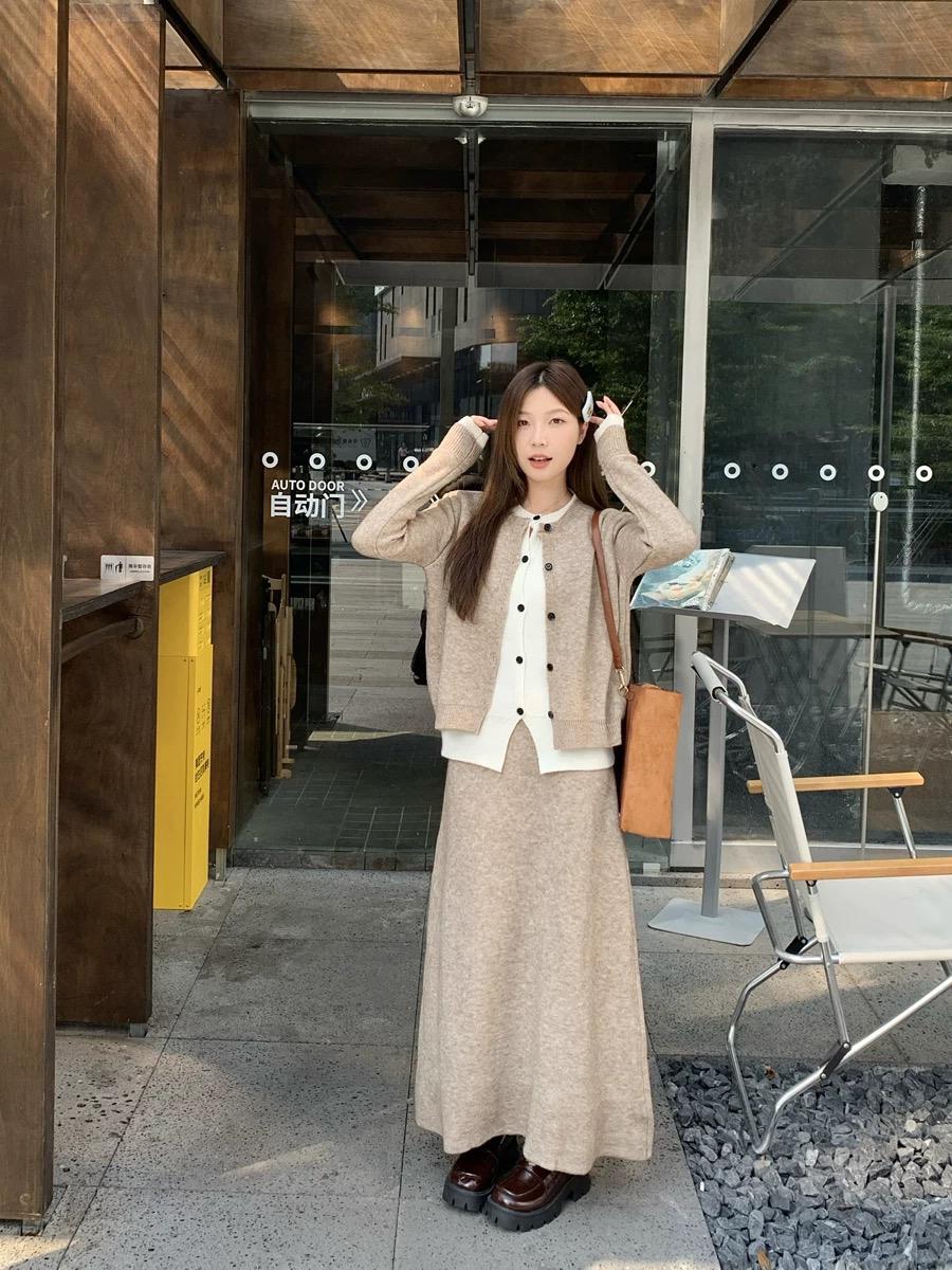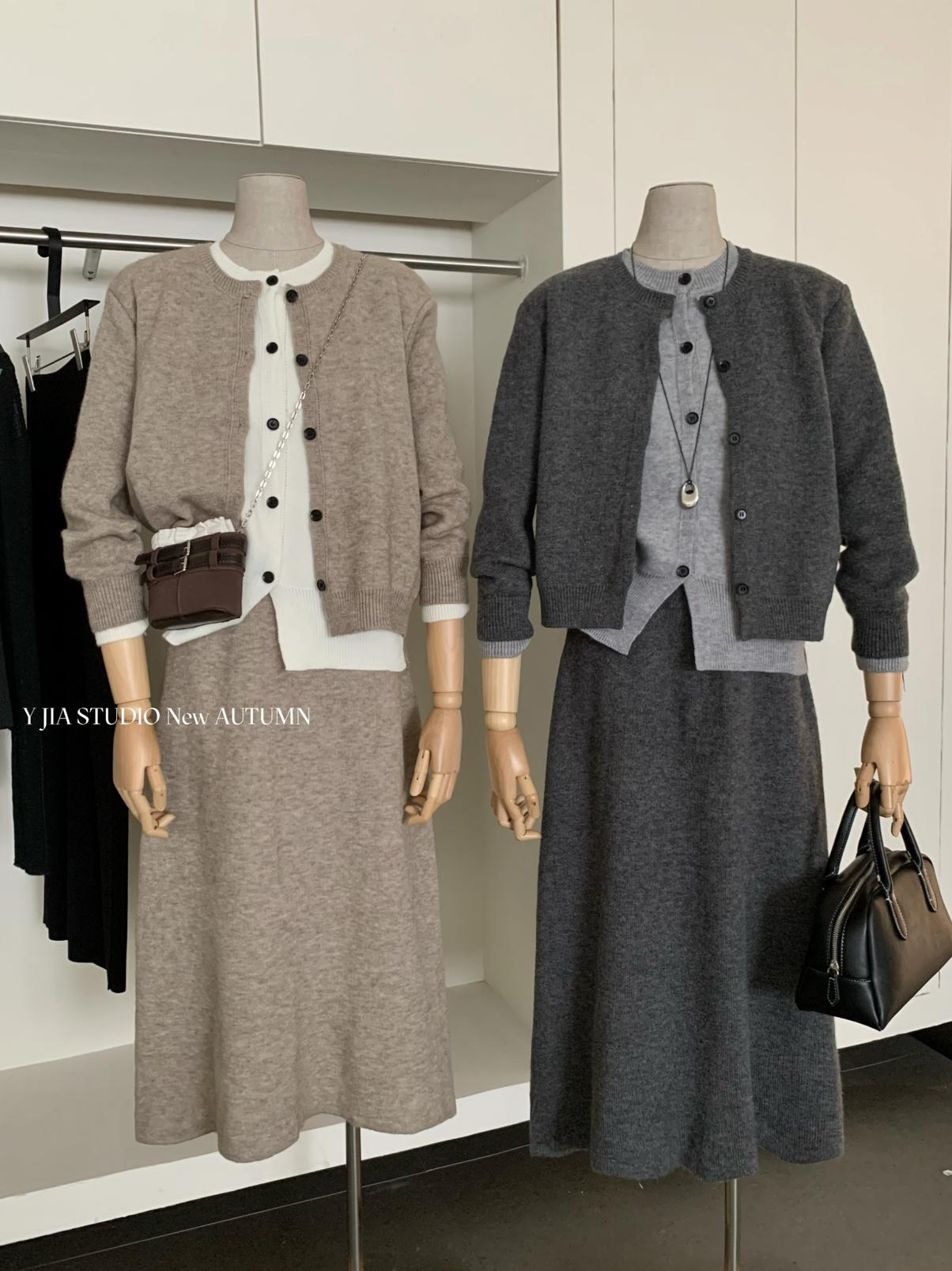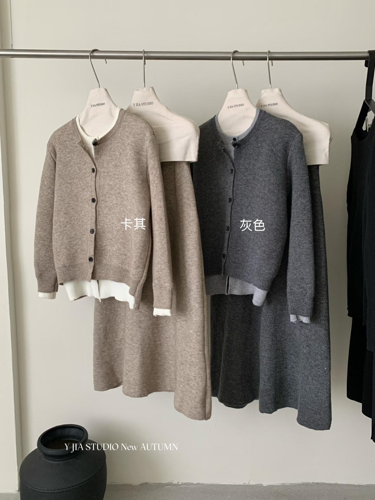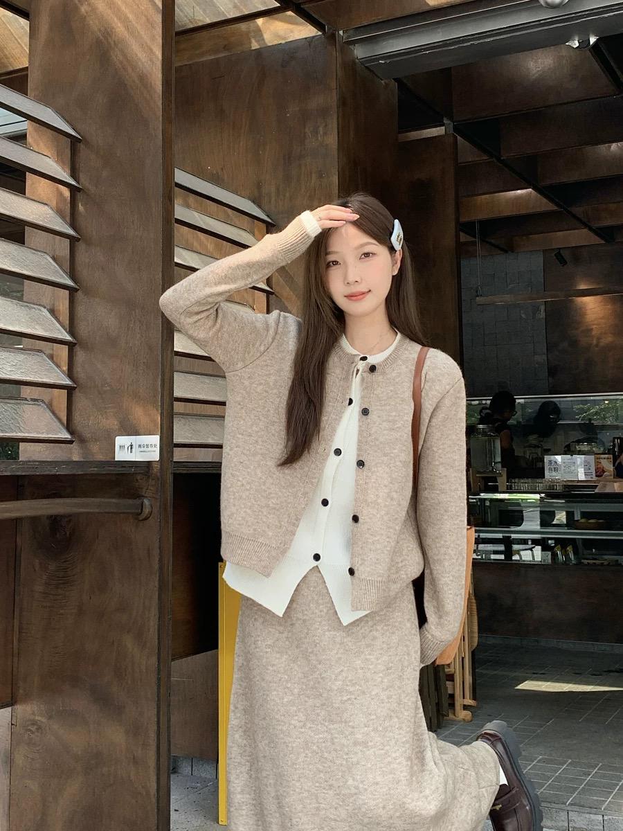 【C7359】設計感撞色假兩件針織開衫+半身裙套裝