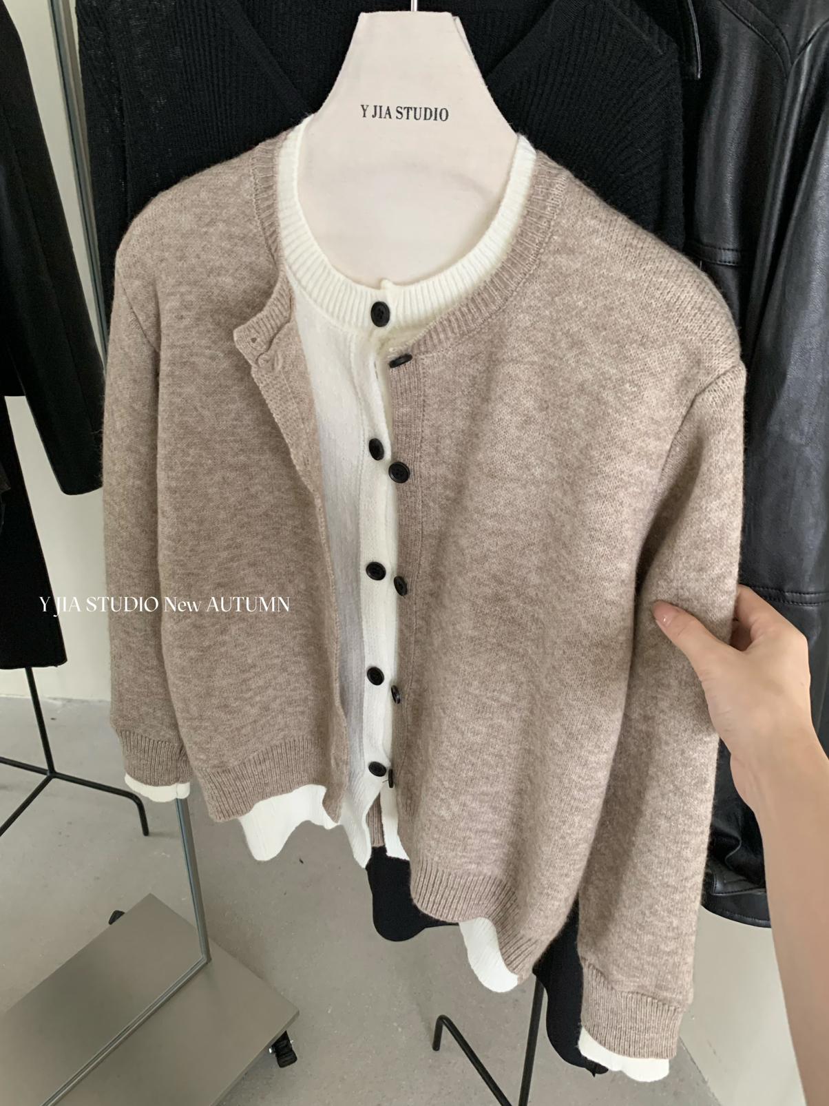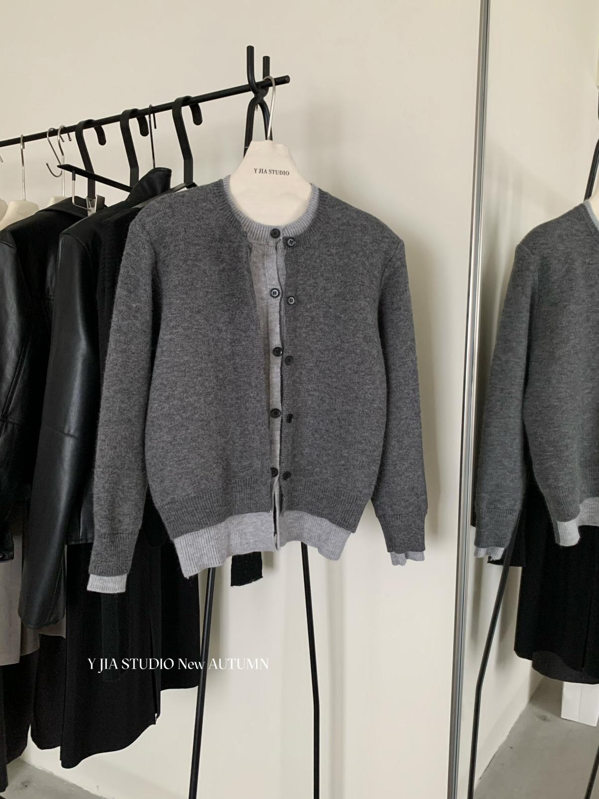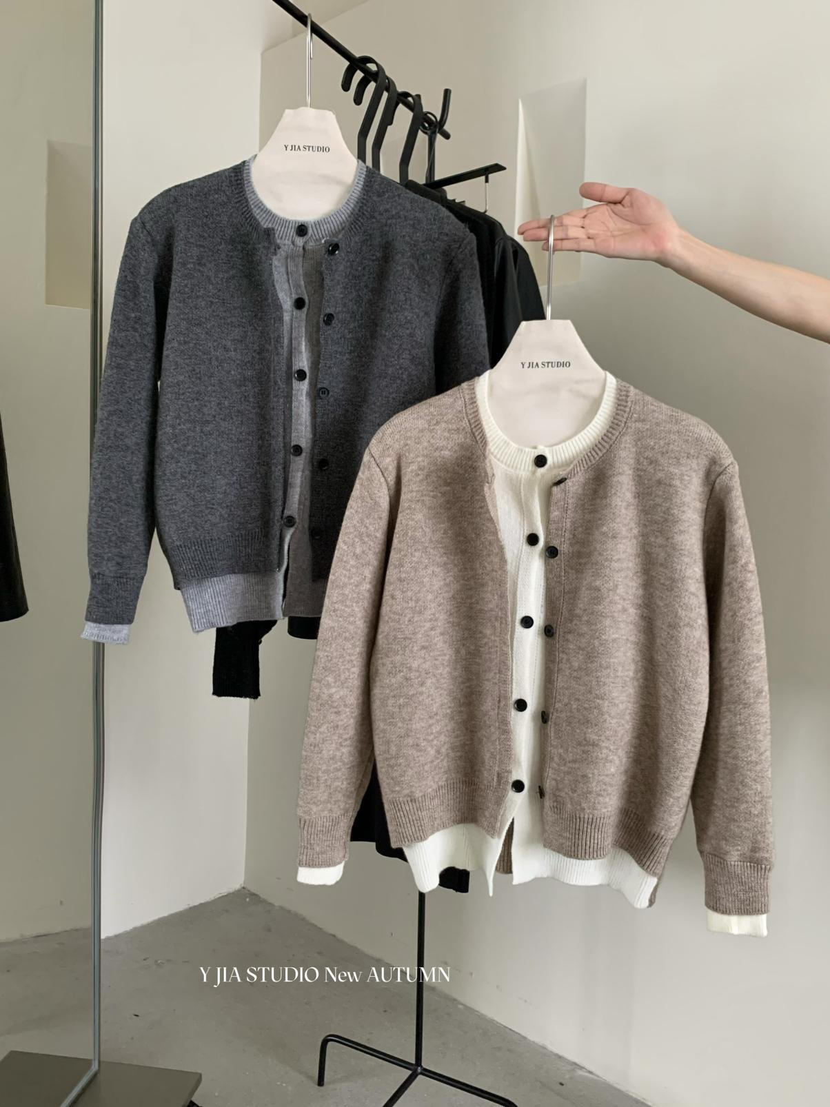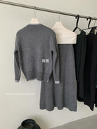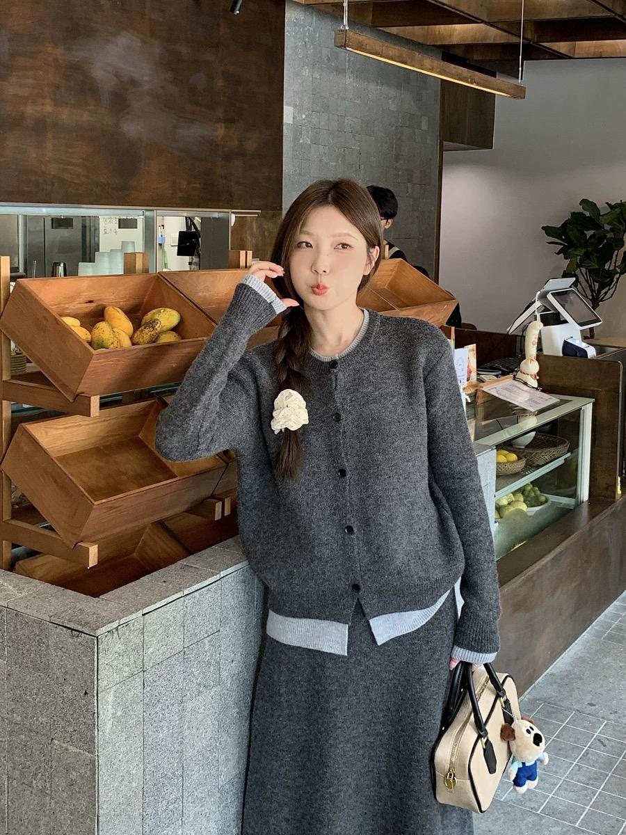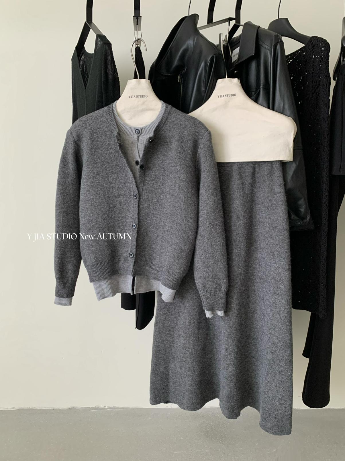 【C7359】設計感撞色假兩件針織開衫+半身裙套裝