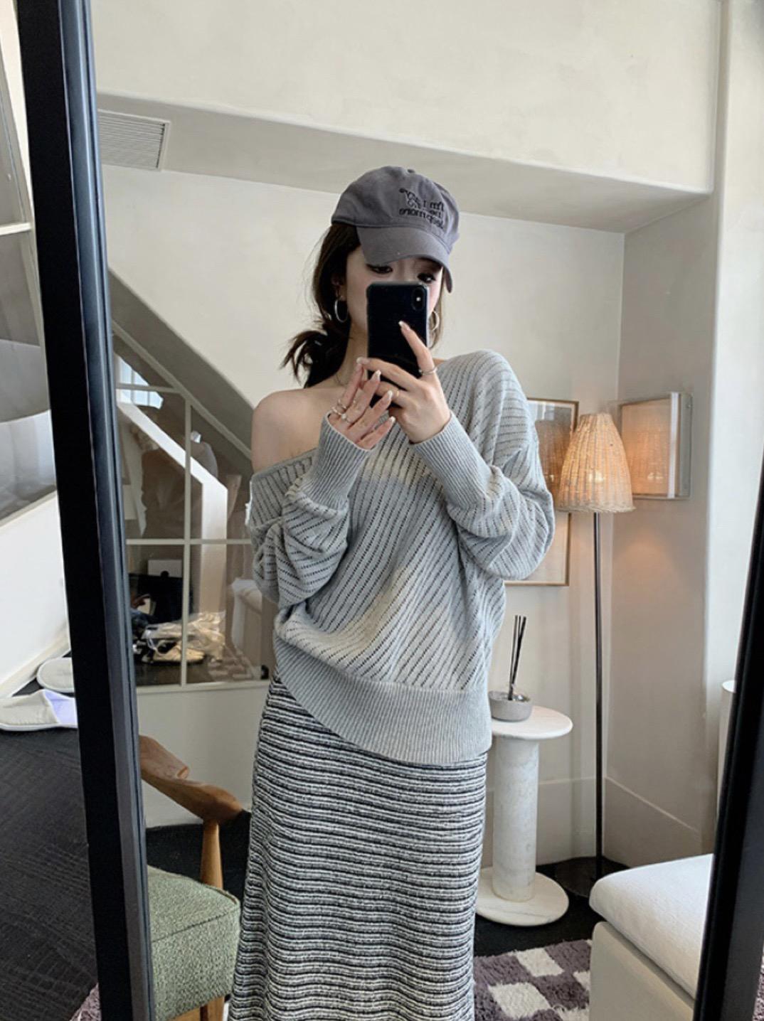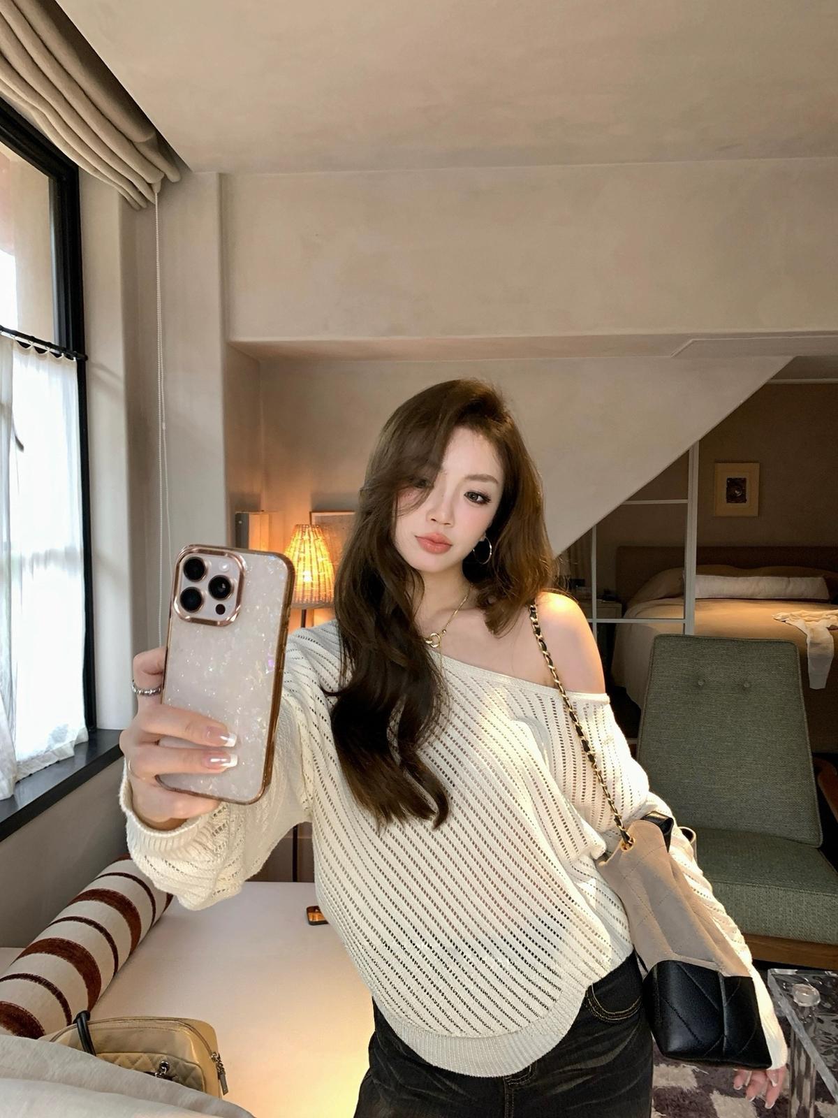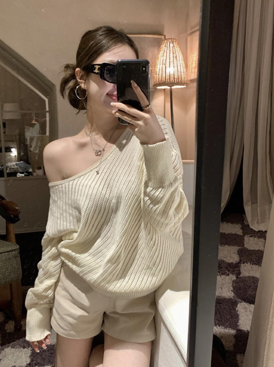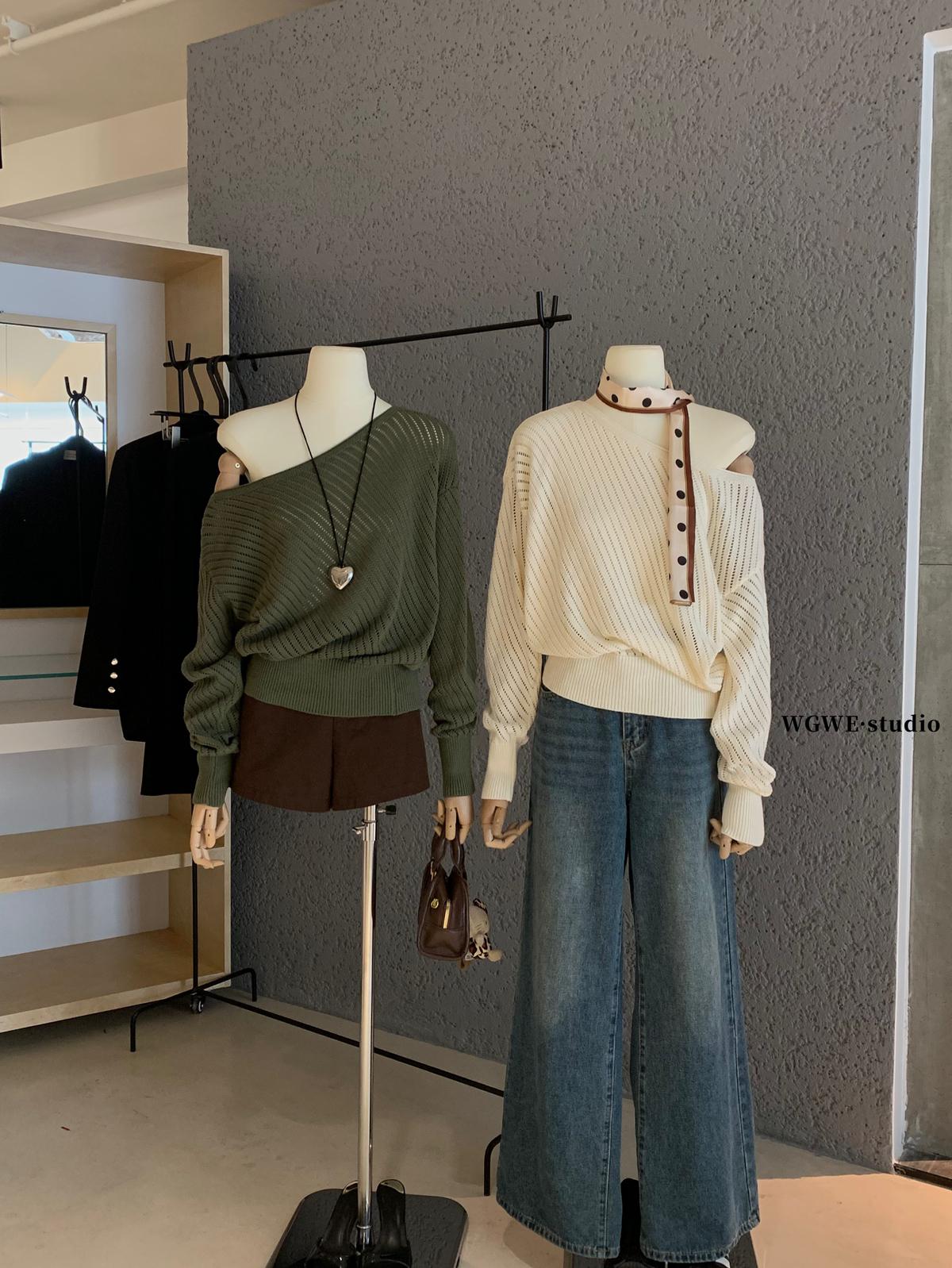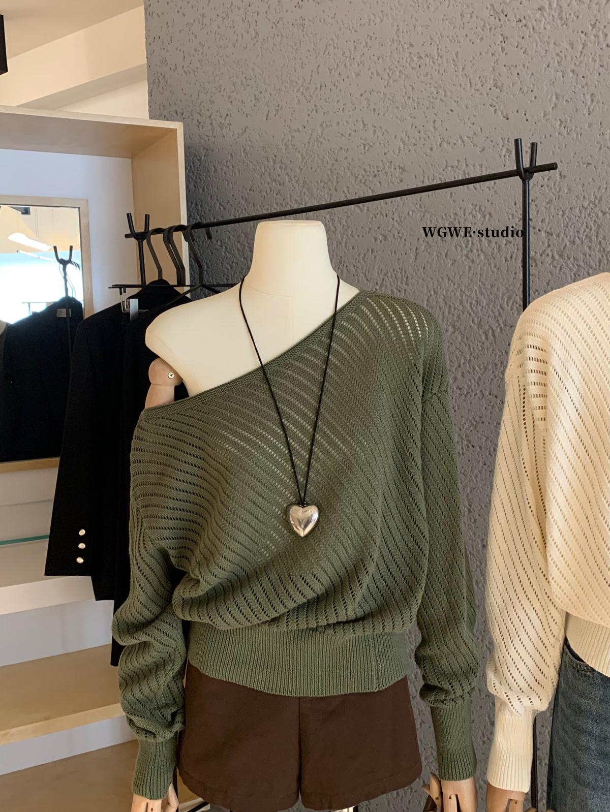 【C7363】斜肩針織衫新款秋季顯瘦氛圍感鏤空針織衫