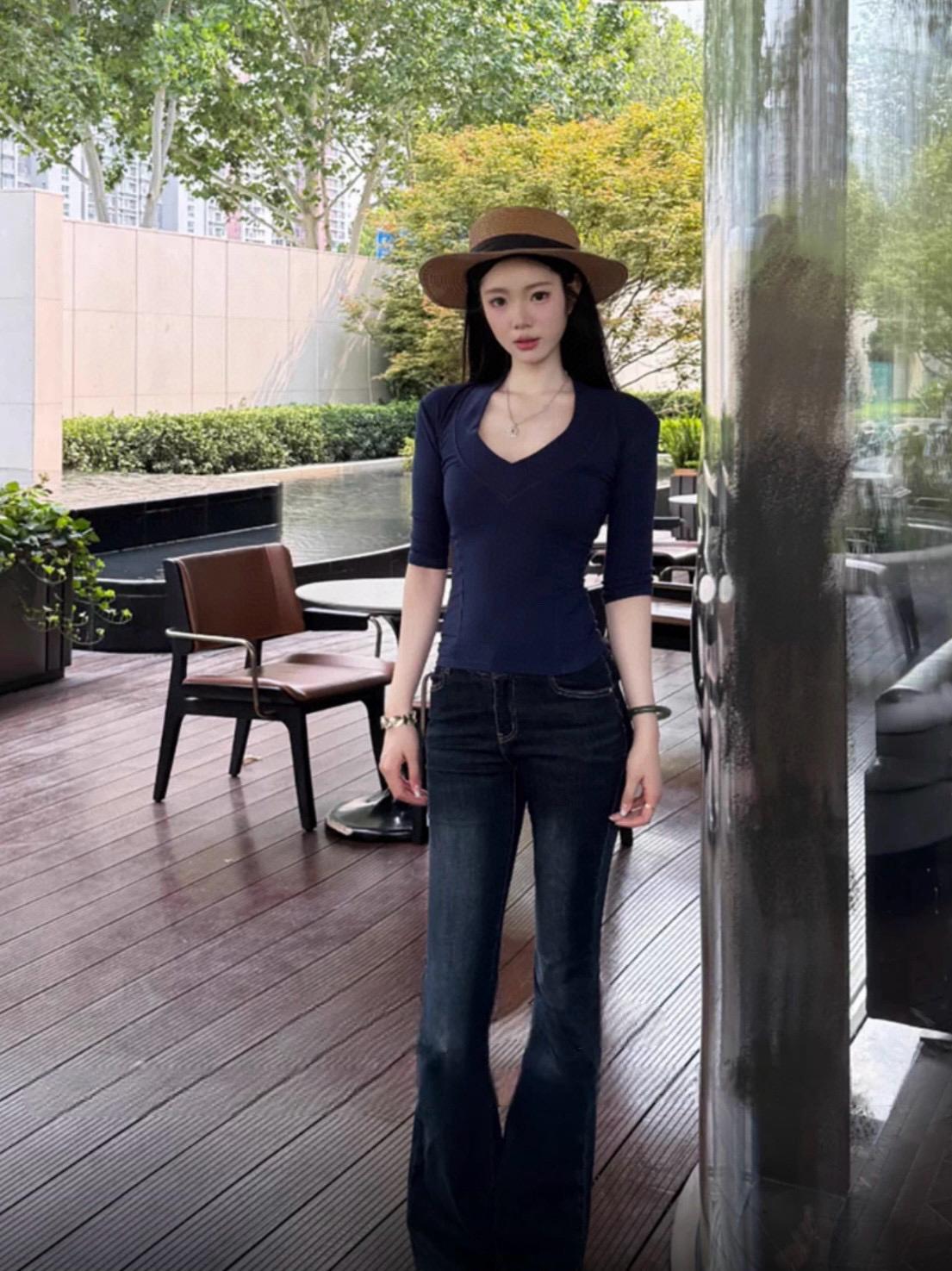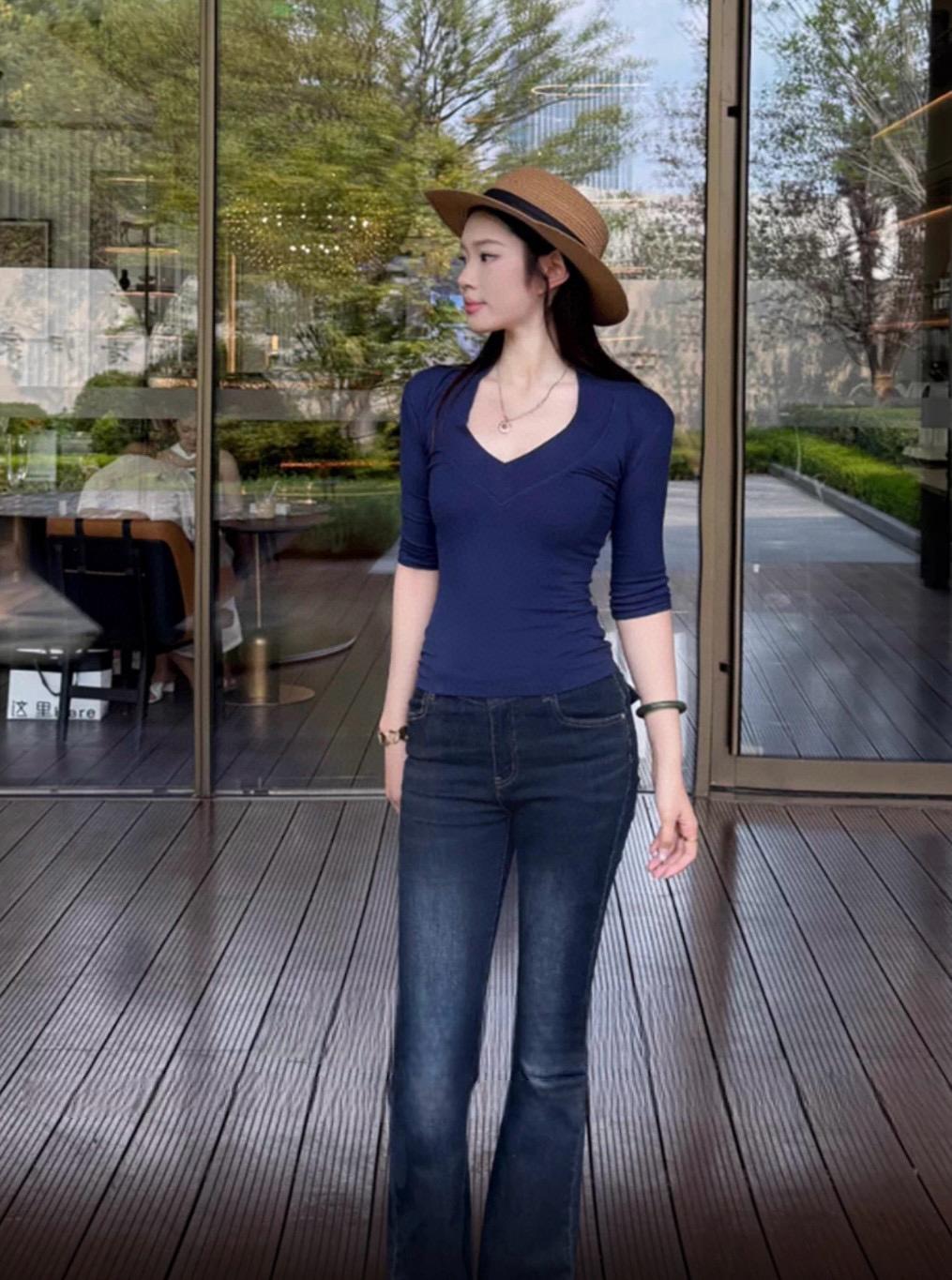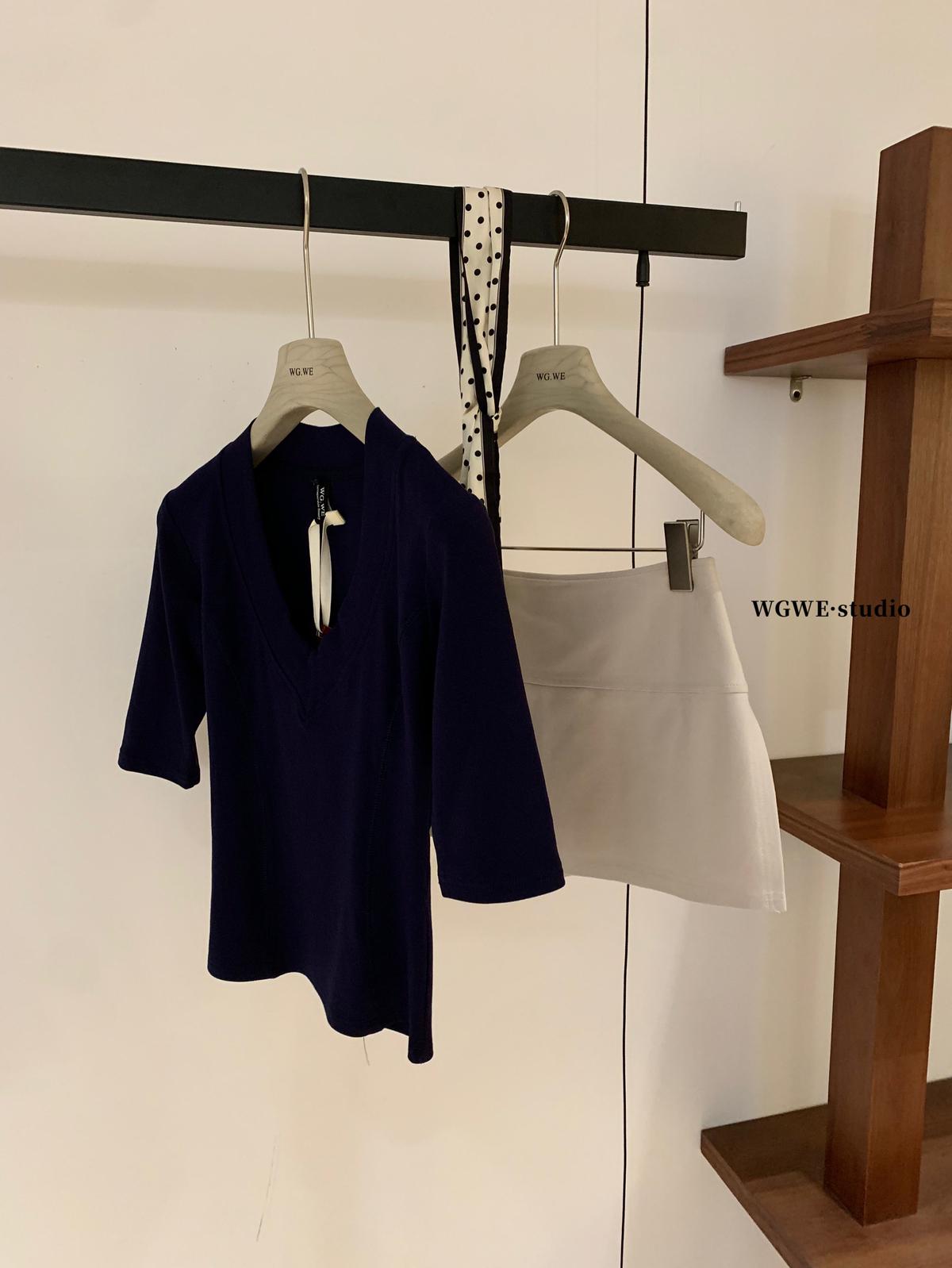 3. 【C7409】韓系辣妹深V領正肩中袖輕熟純欲修身顯瘦內搭短袖T恤