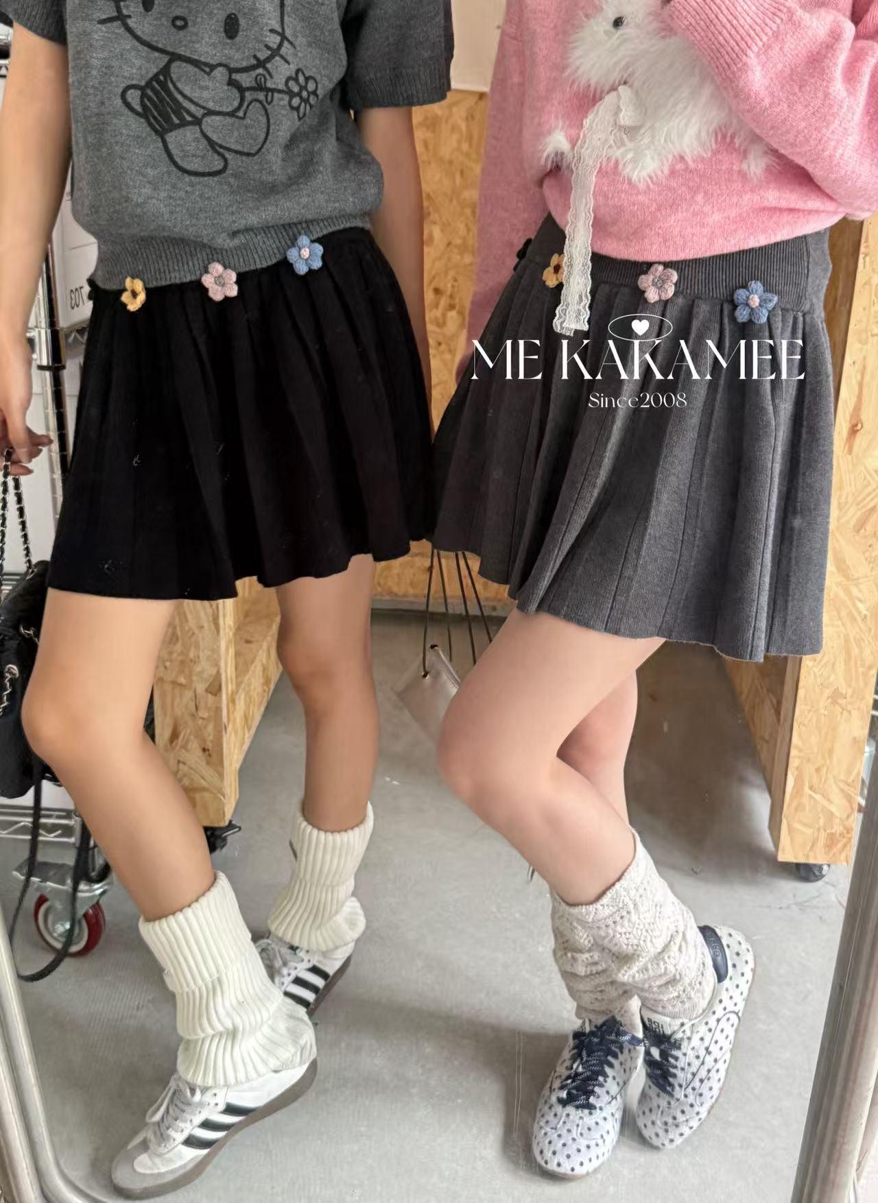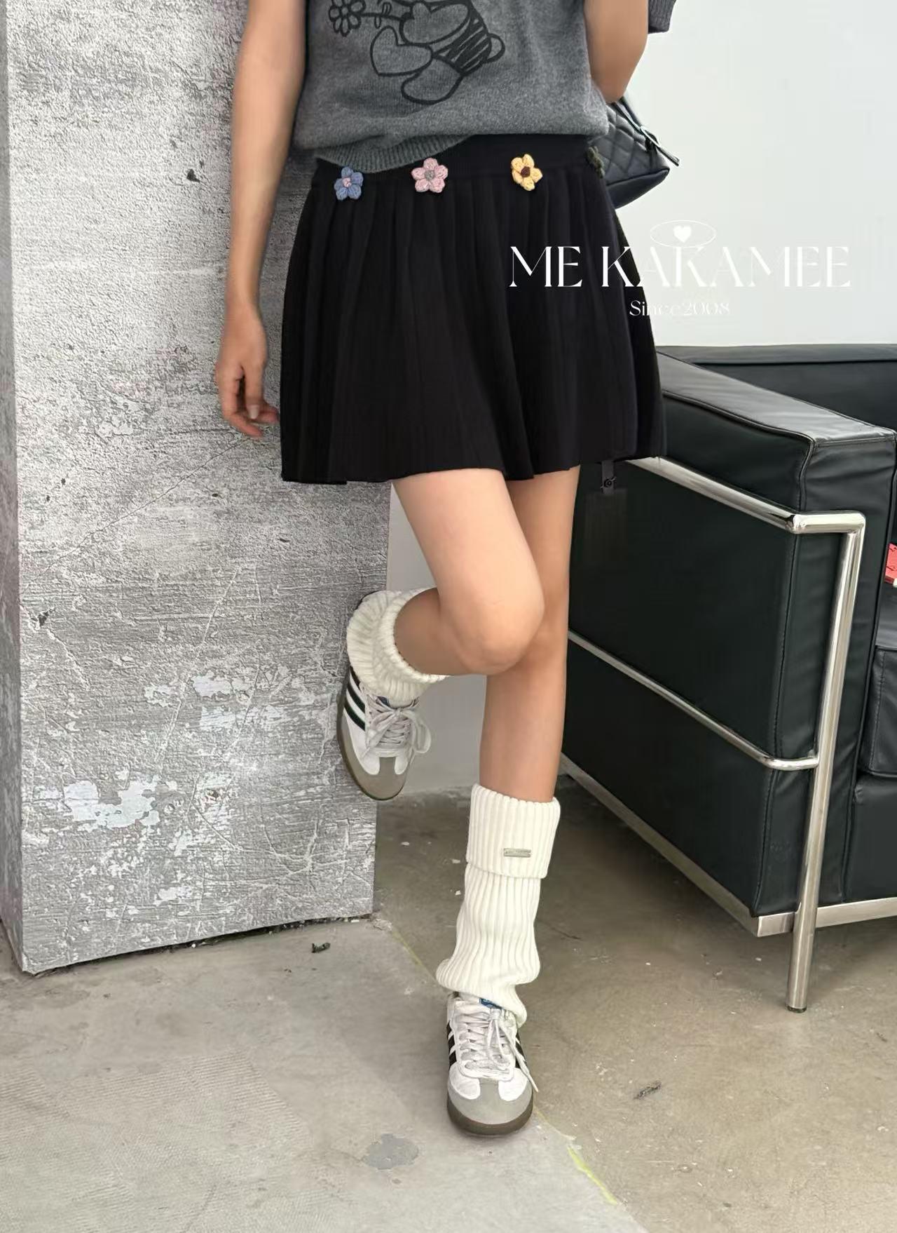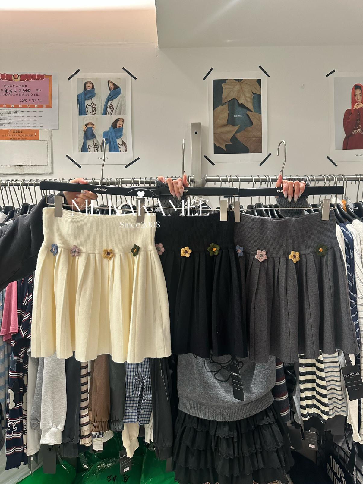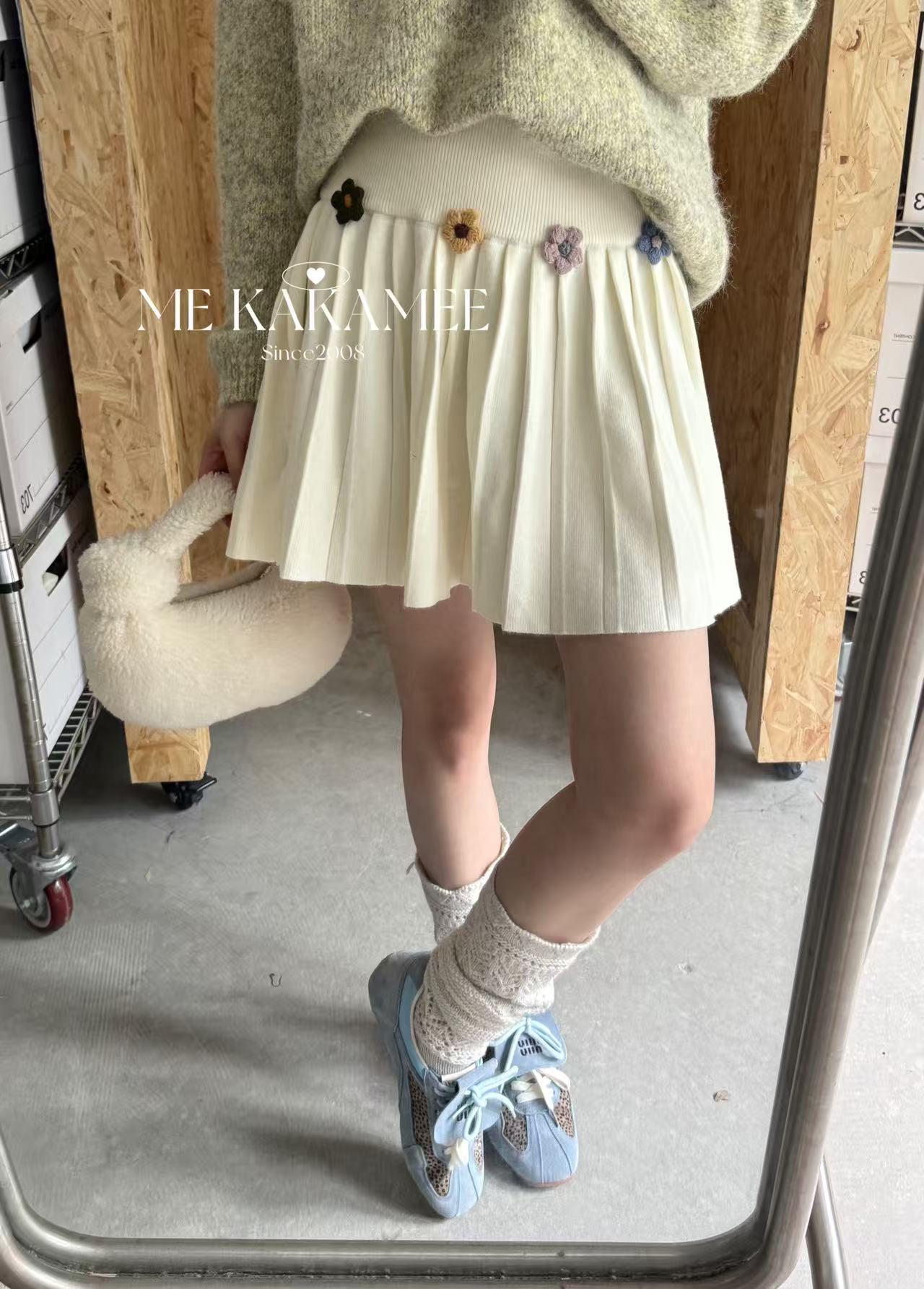 【C7506】秋新品立體花朵百褶針織半身裙