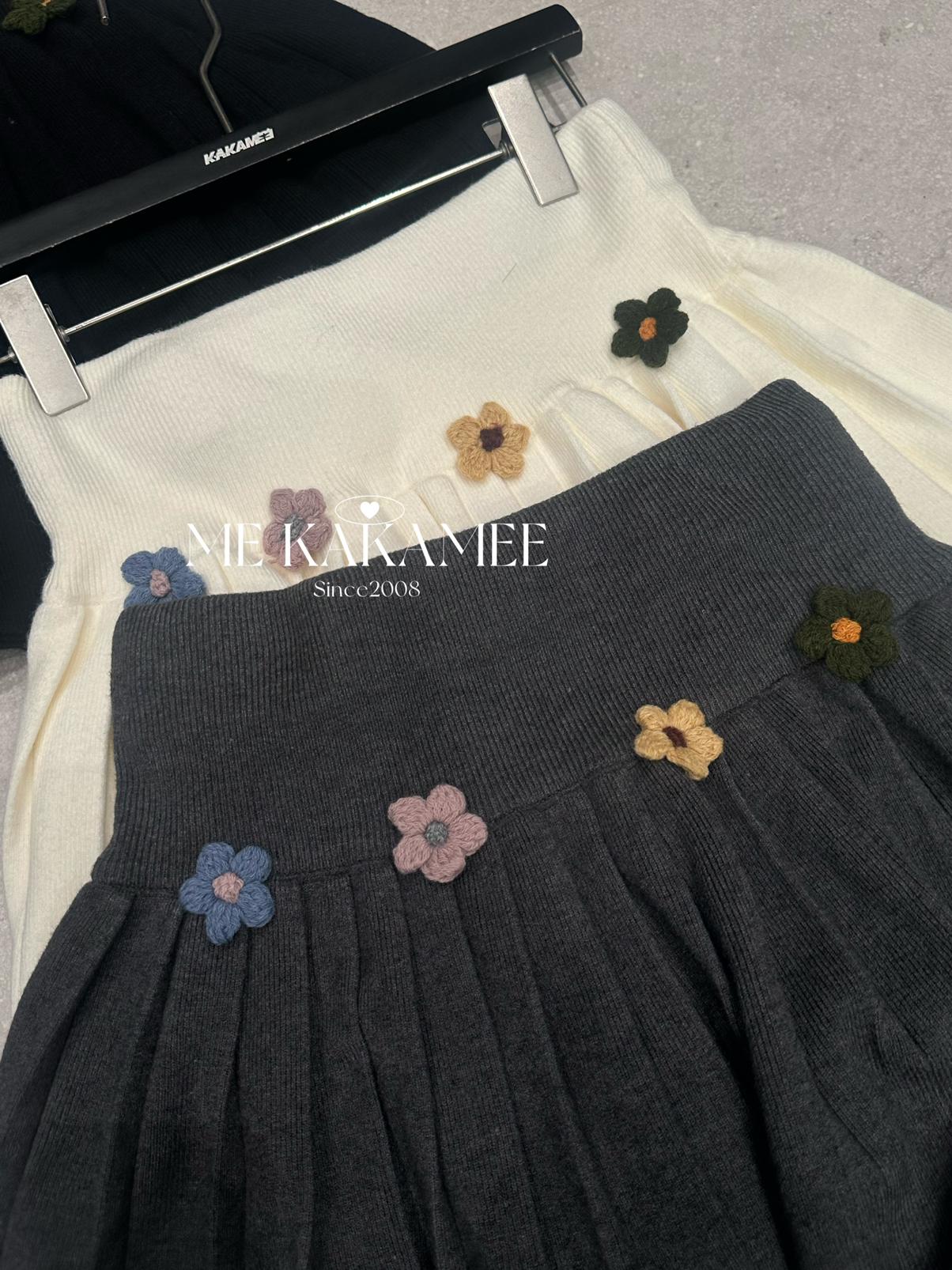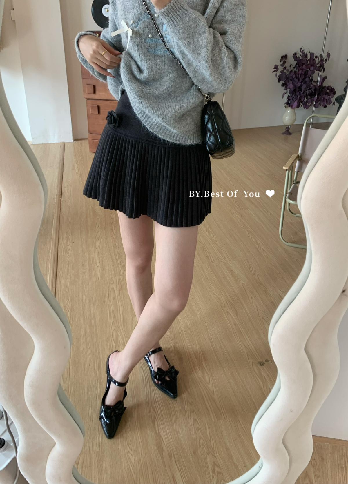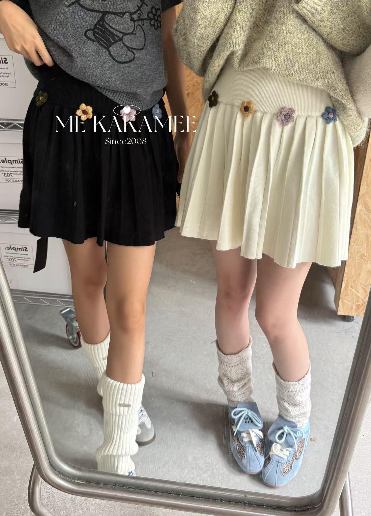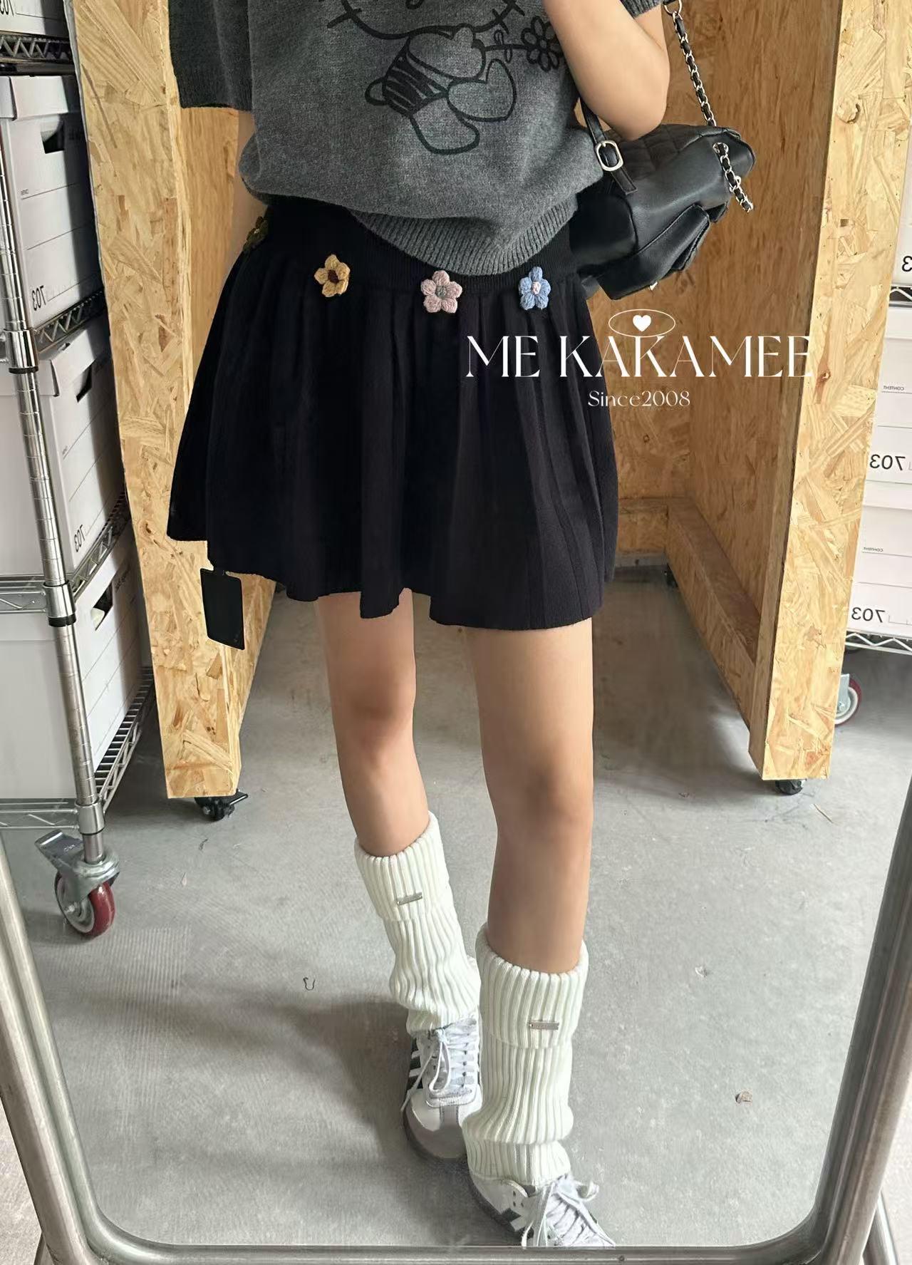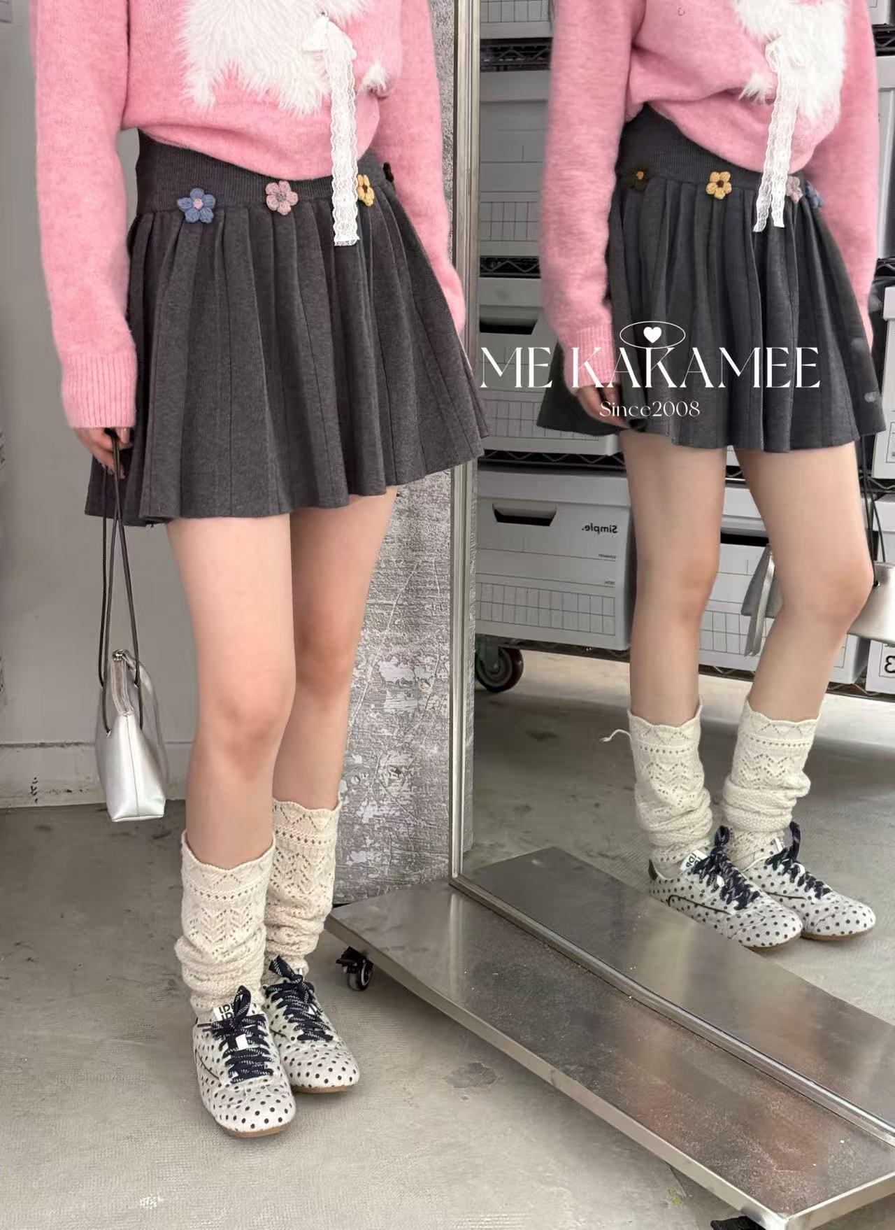 【C7506】秋新品立體花朵百褶針織半身裙