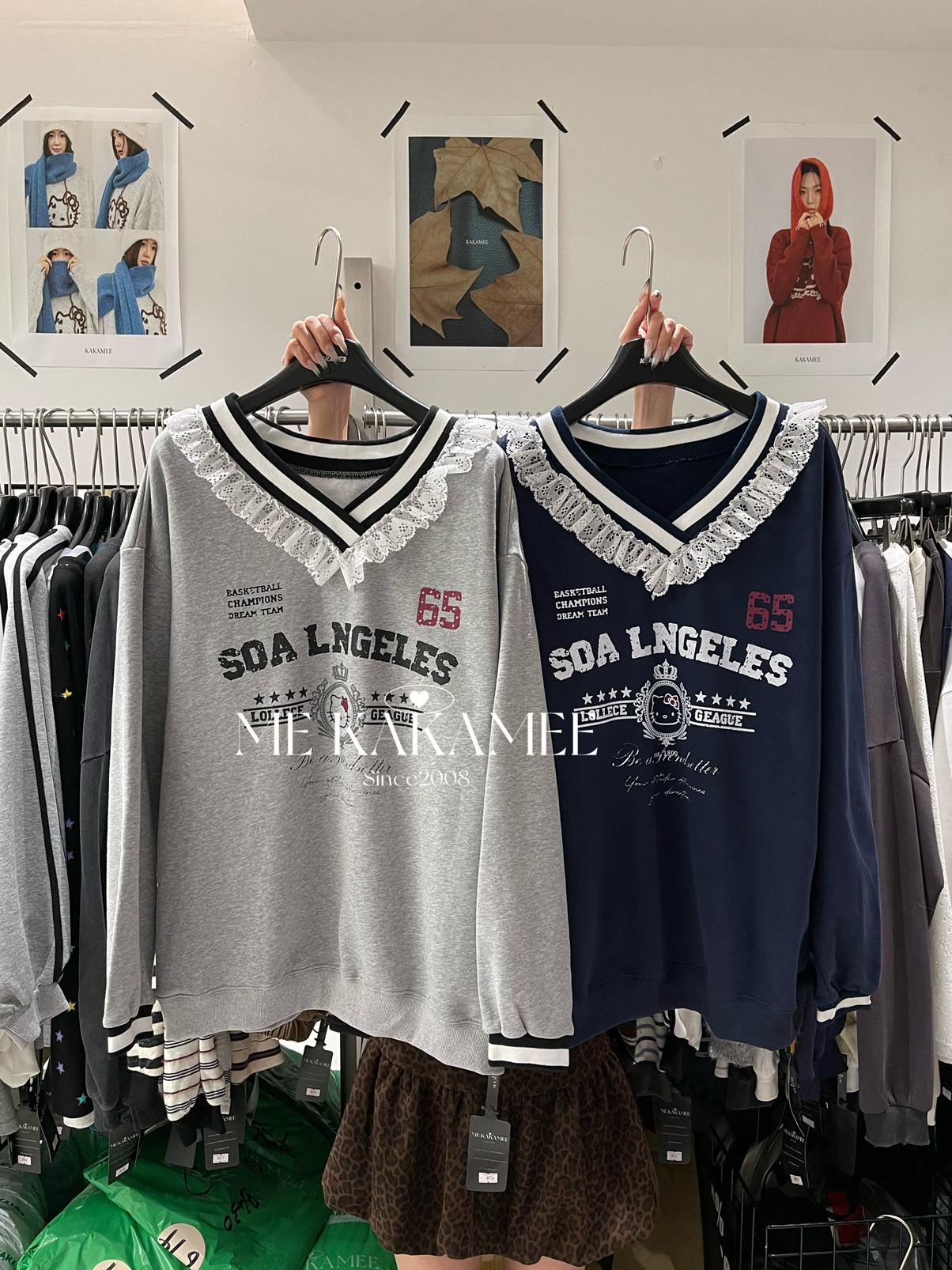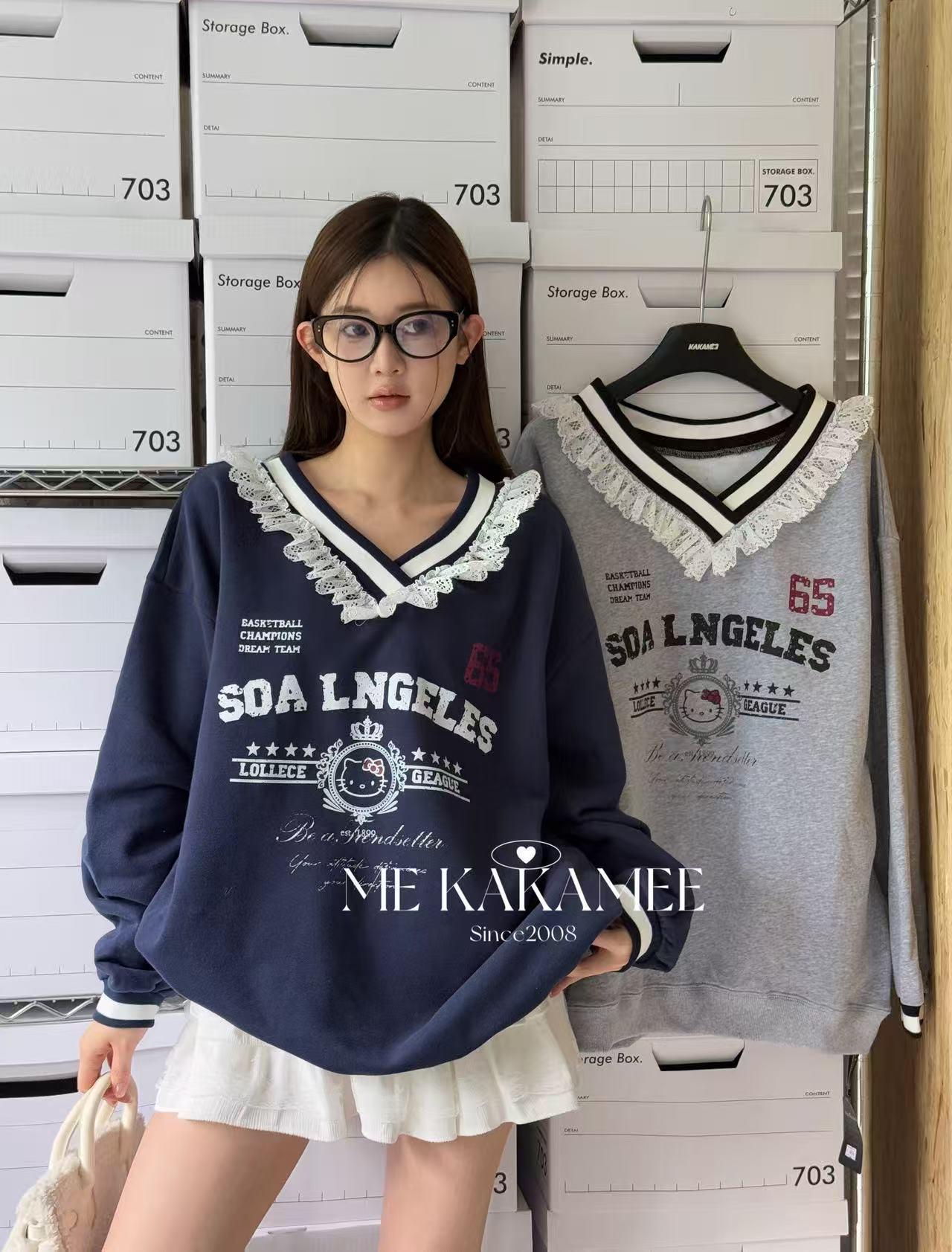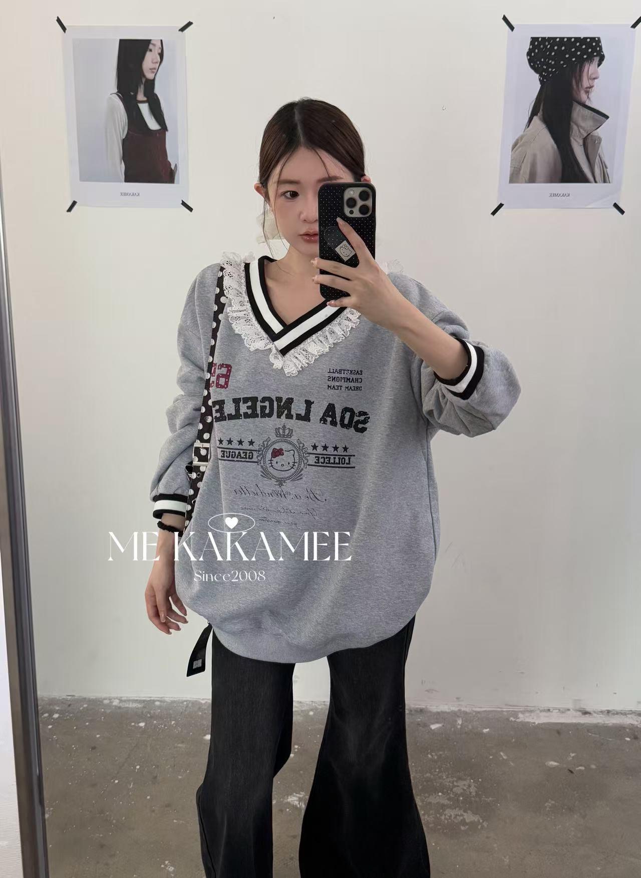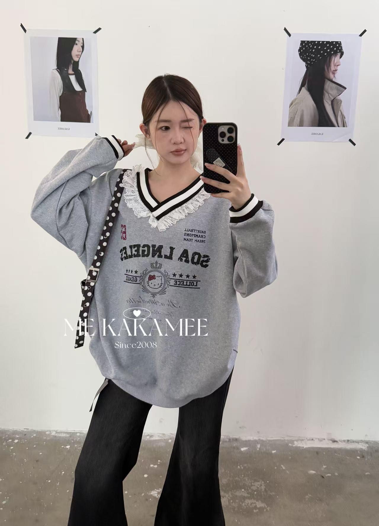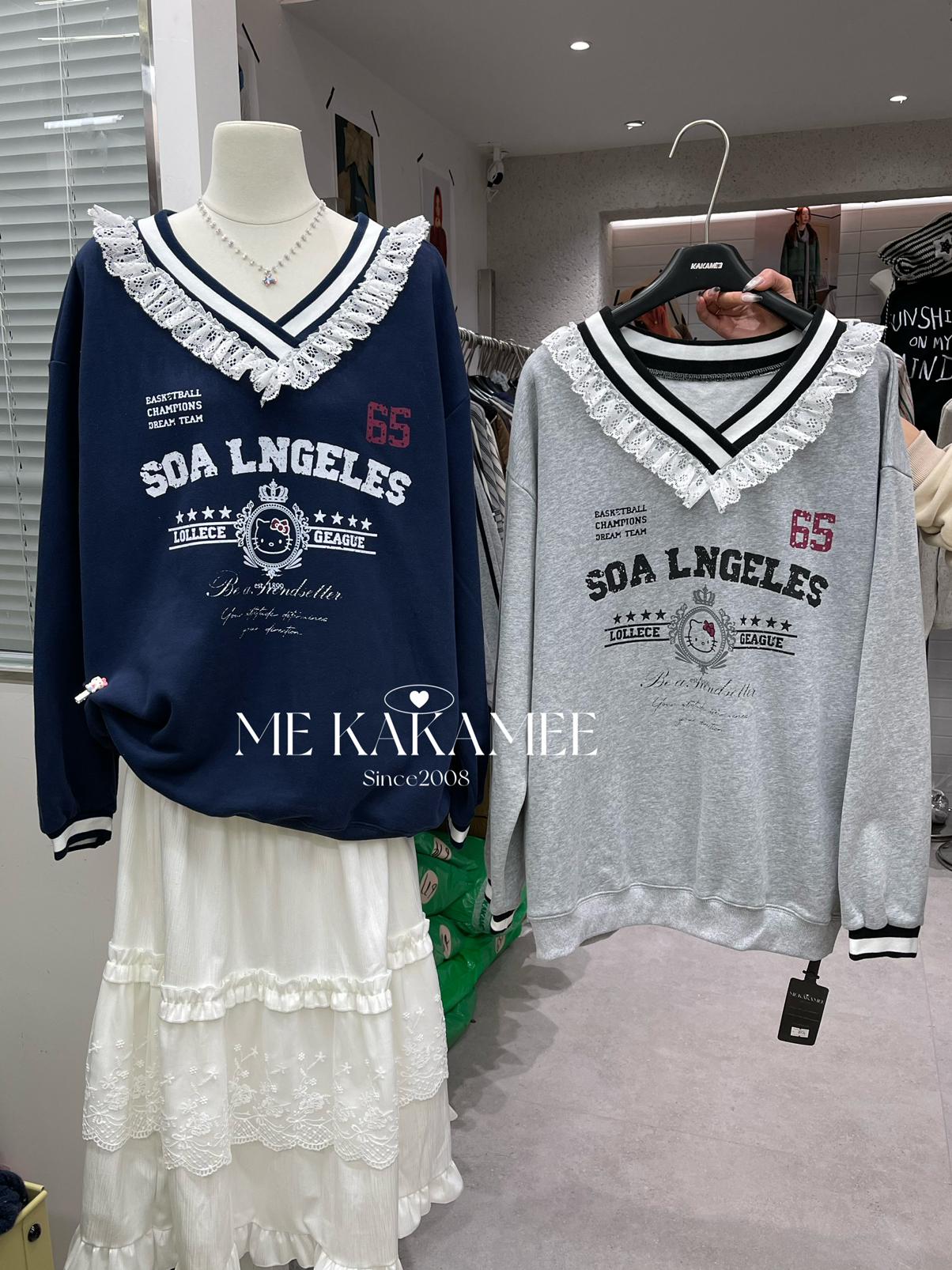【C7510】秋新品 噴畫KT蕾絲設計薄絨衛衣