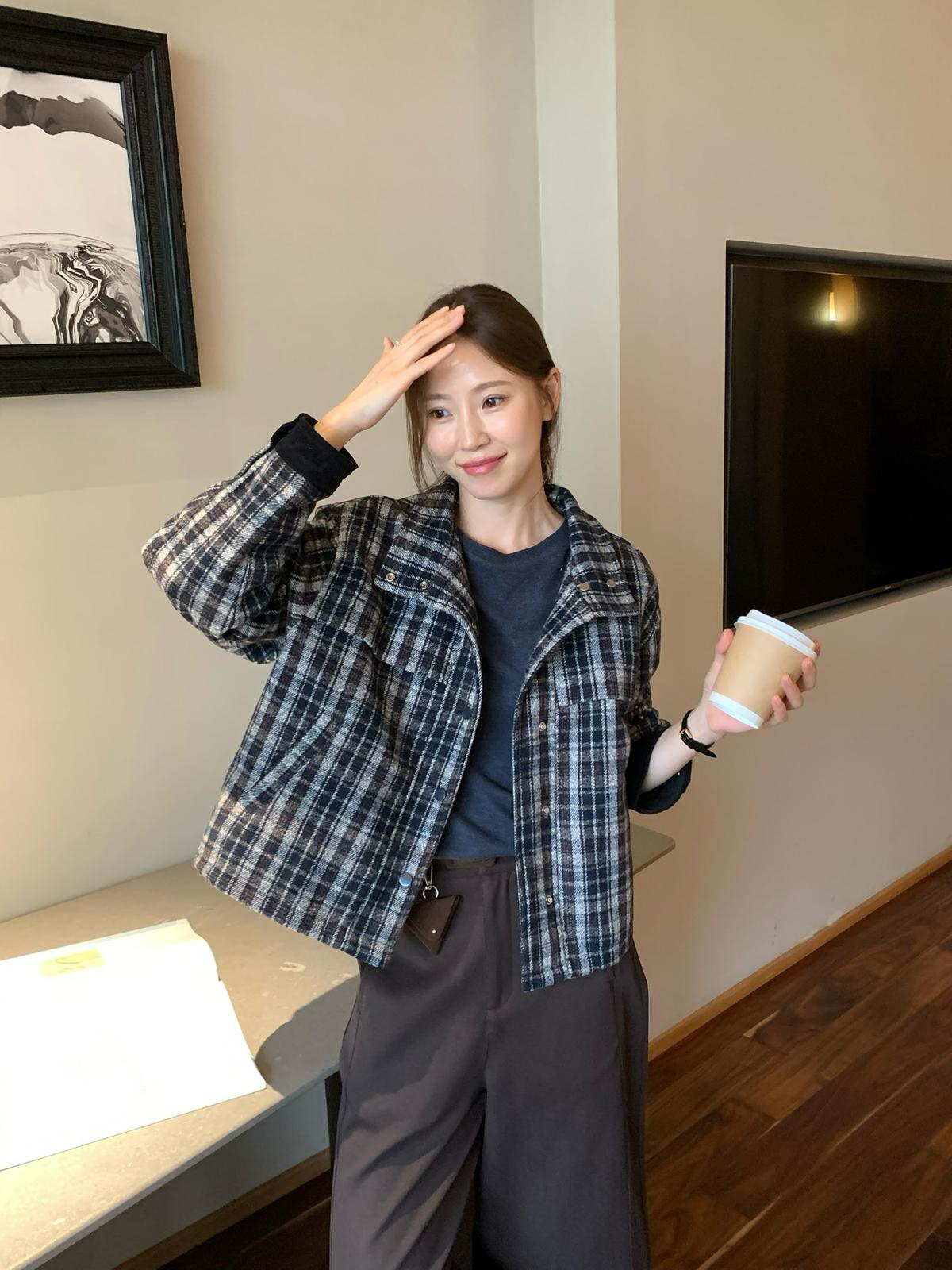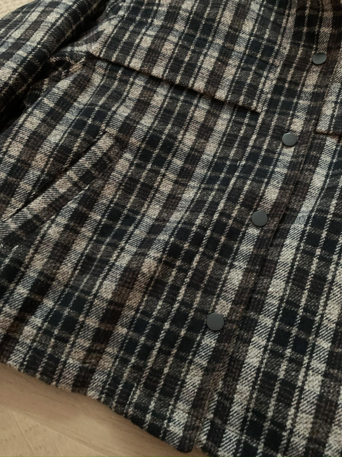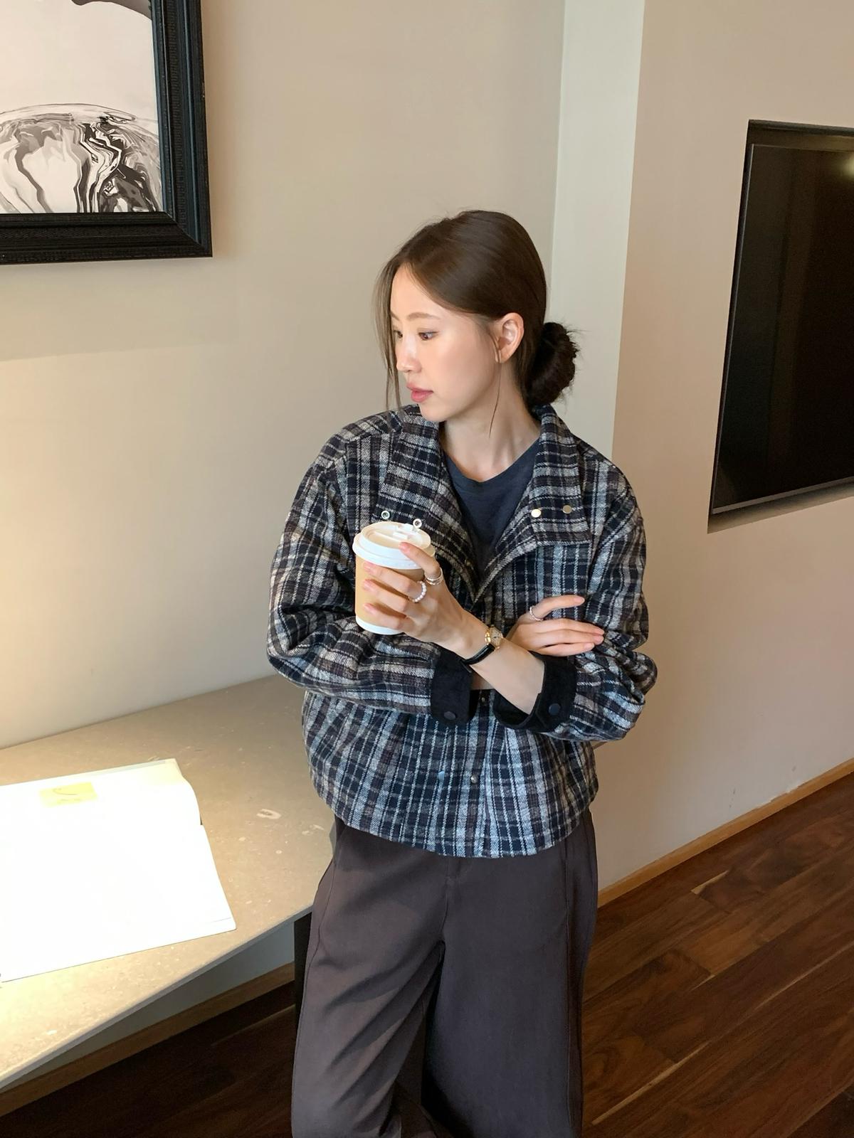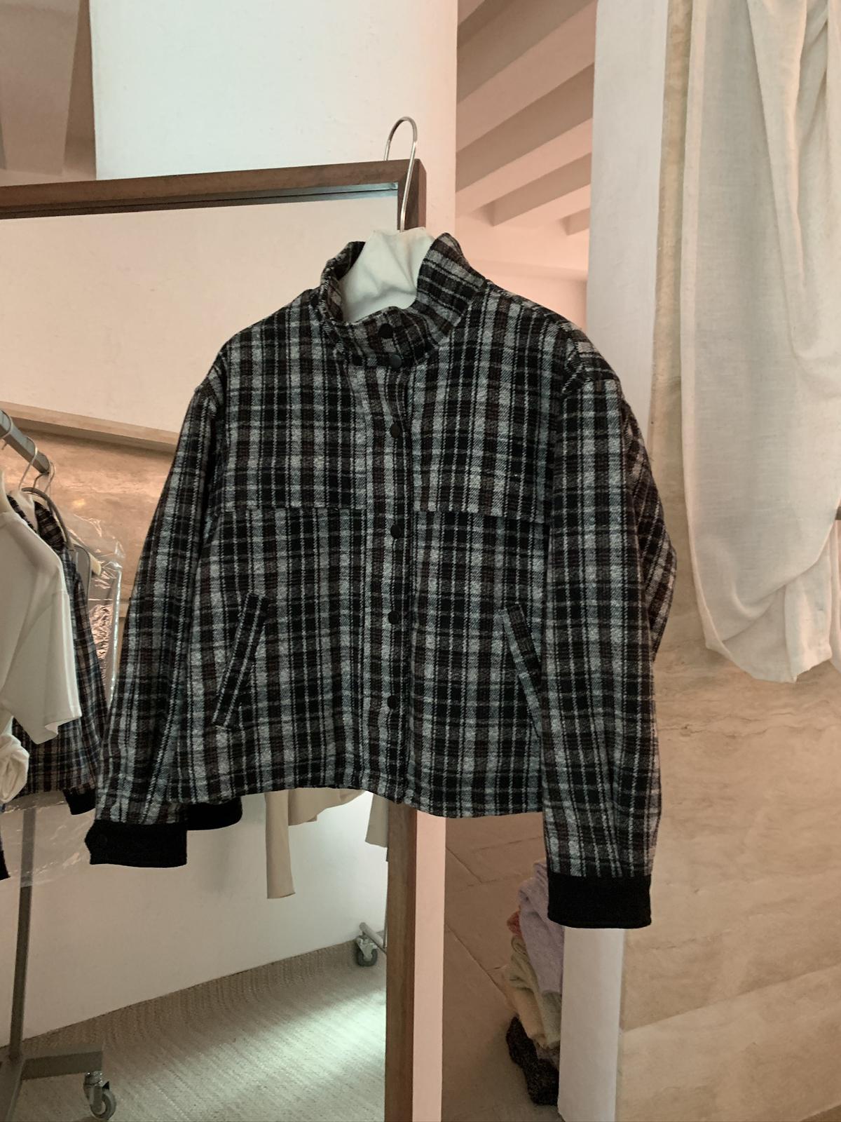 【C7531】復古休閒拼接撞色格紋設計感夾棉保暖棉服外套