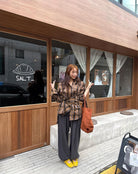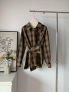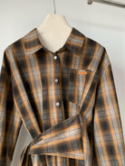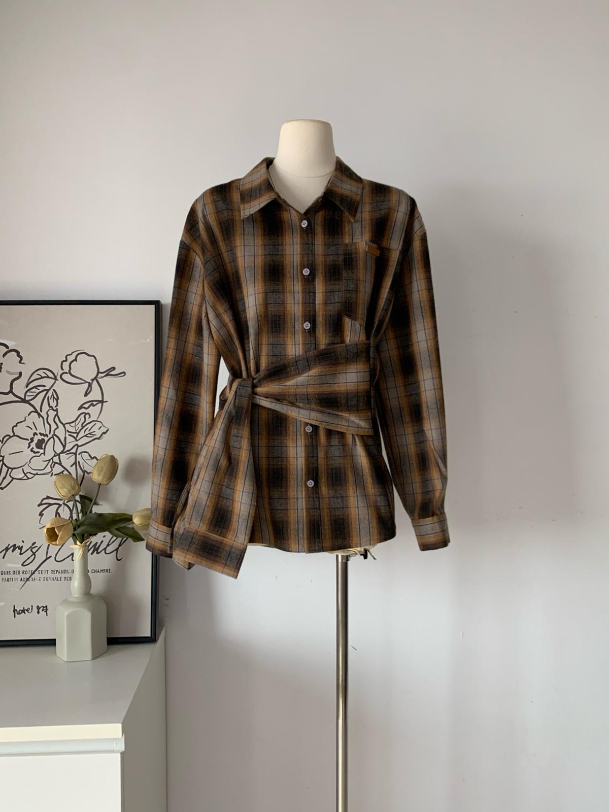 【C7517】韓系新款小衆撞色格子長袖繫帶襯衫