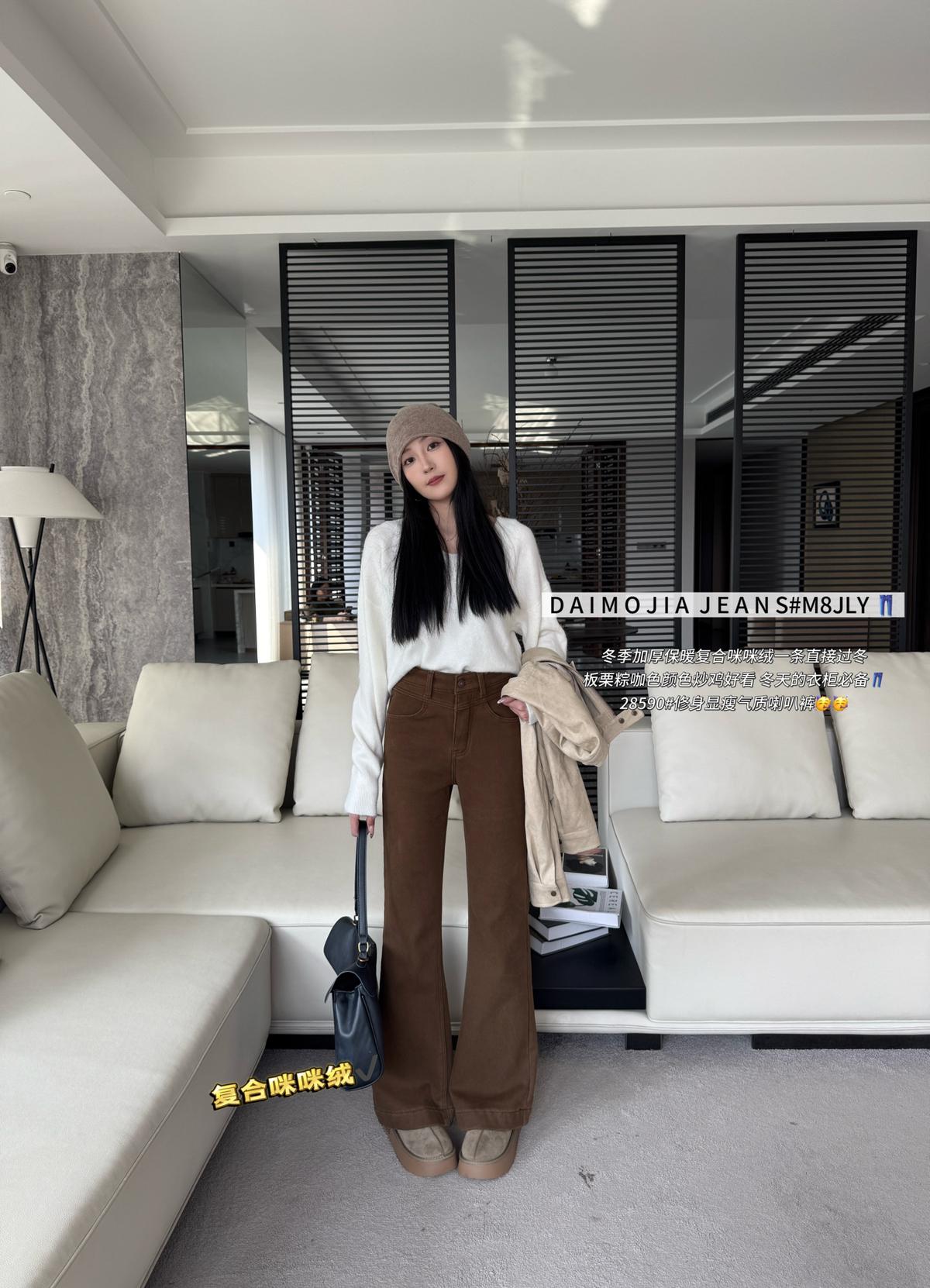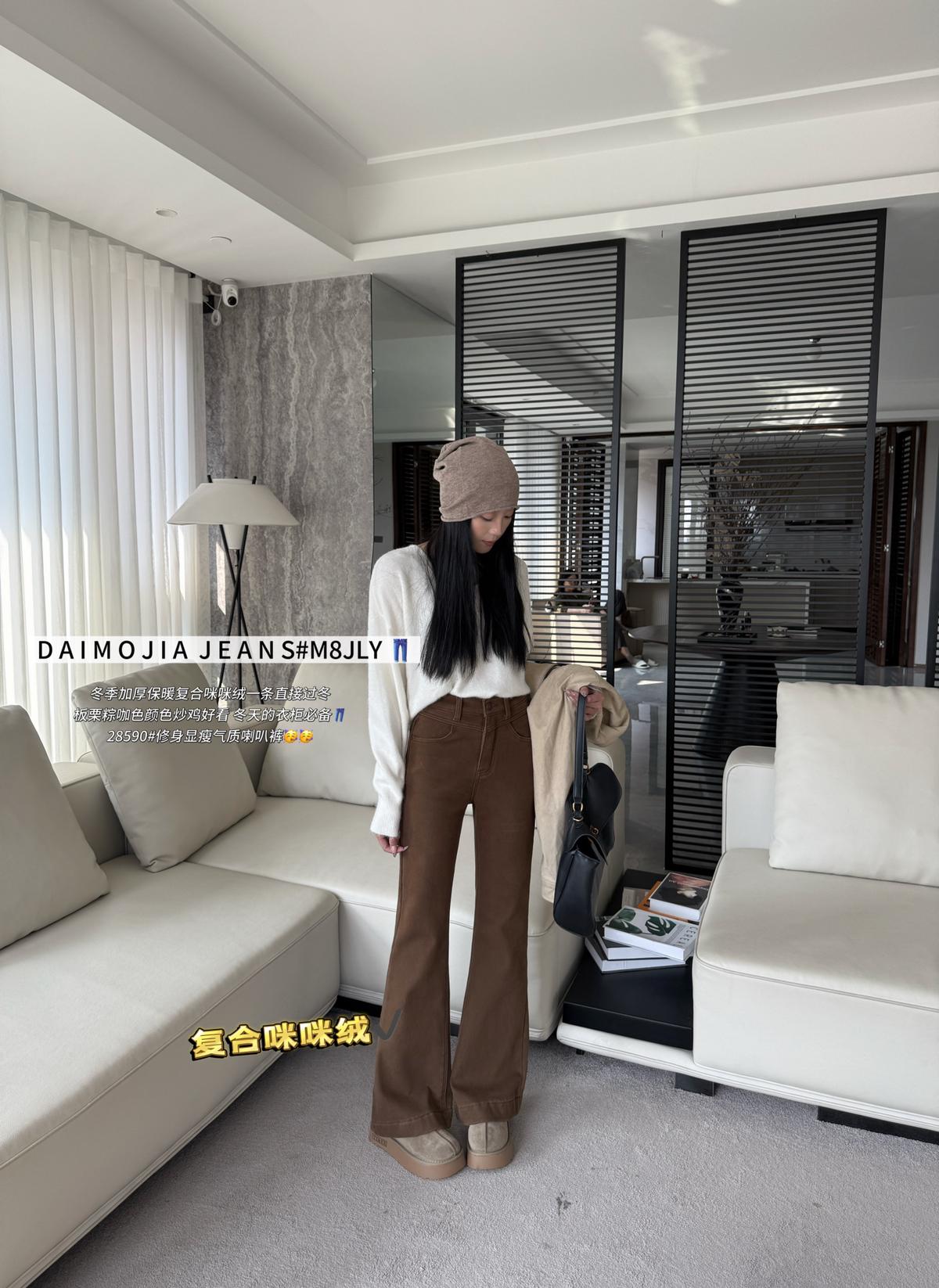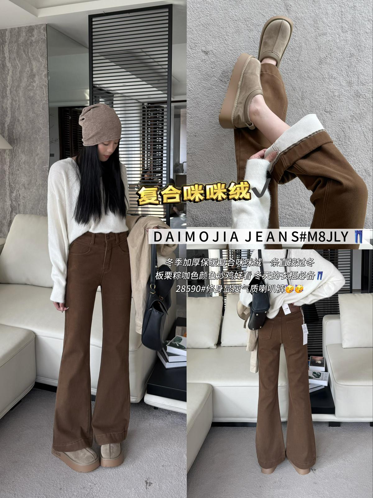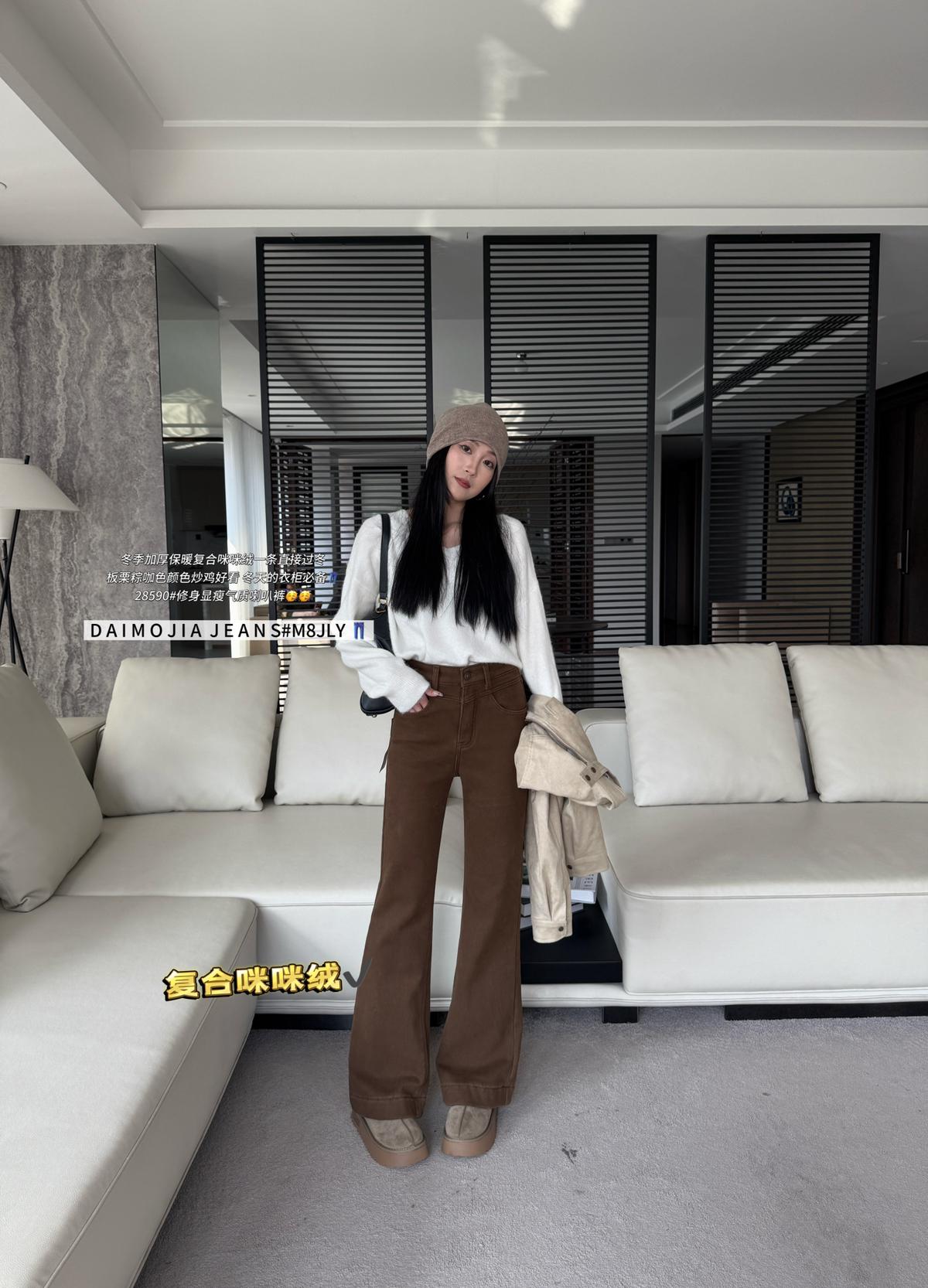 【C7537】冬季加厚保暖複合密密絨板栗糉咖色修身顯瘦彈力喇叭褲牛仔褲