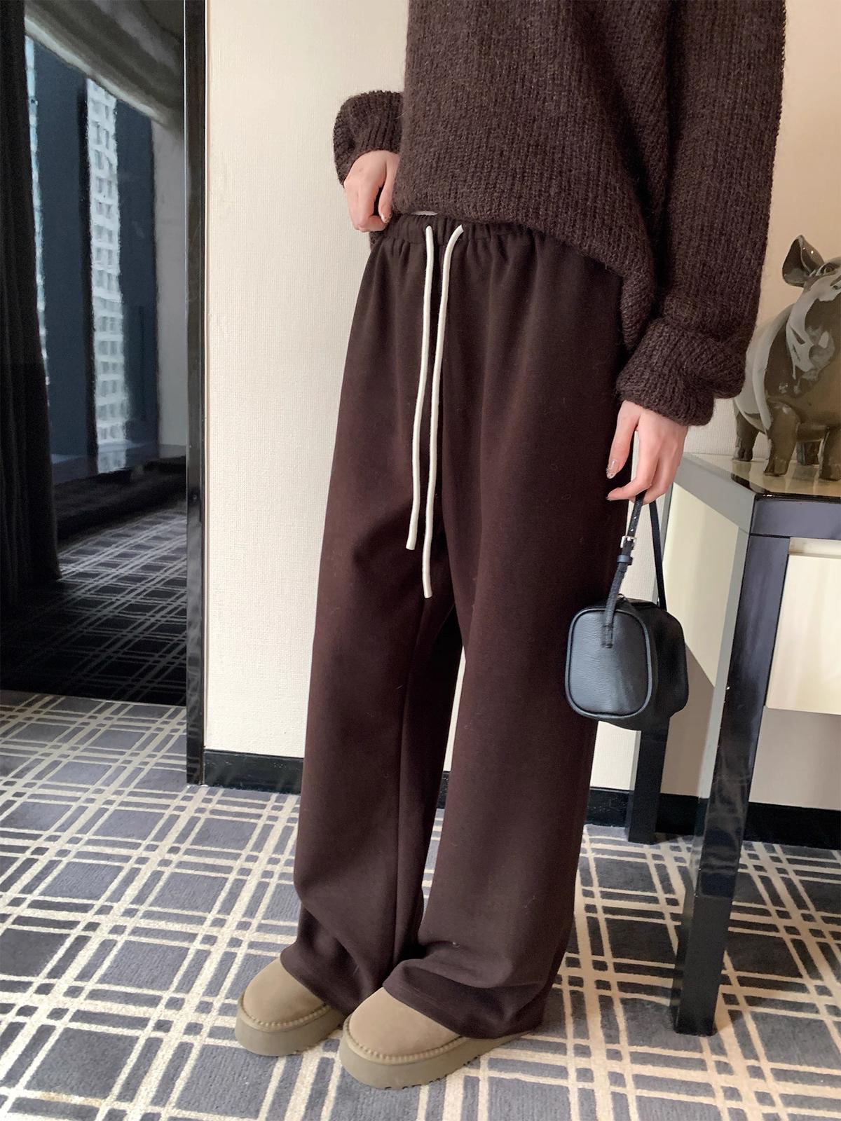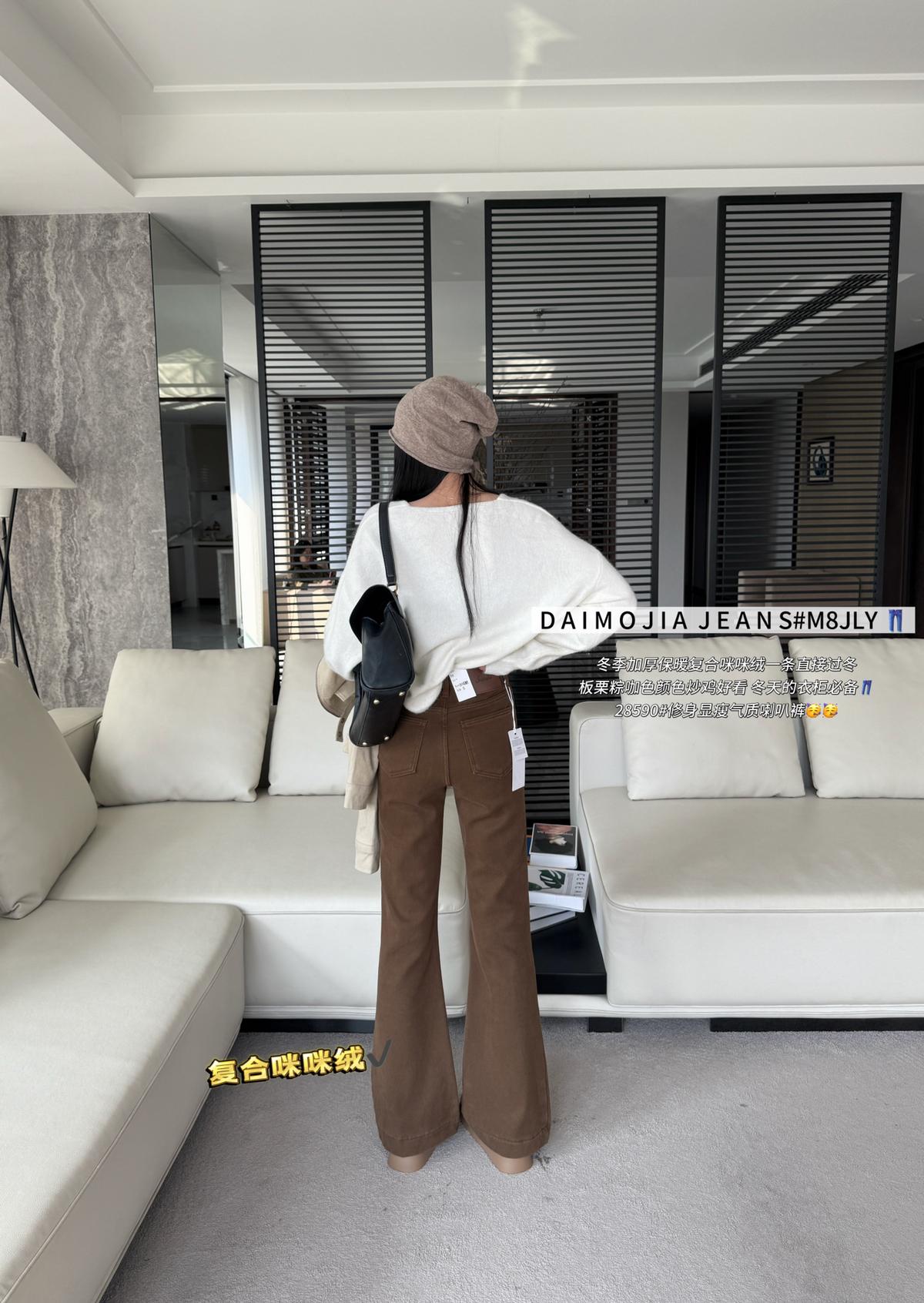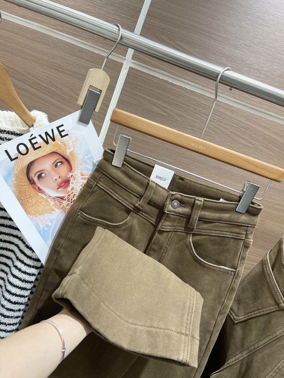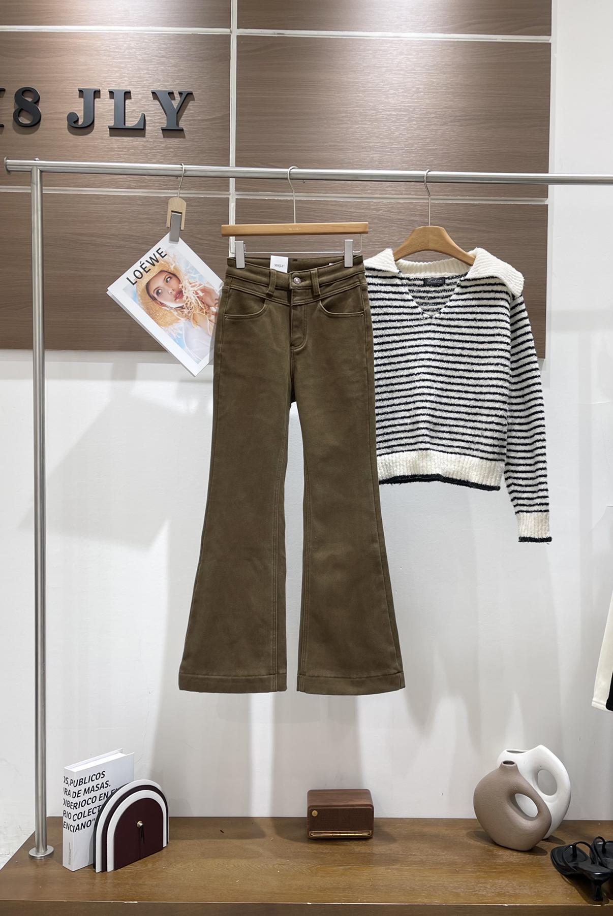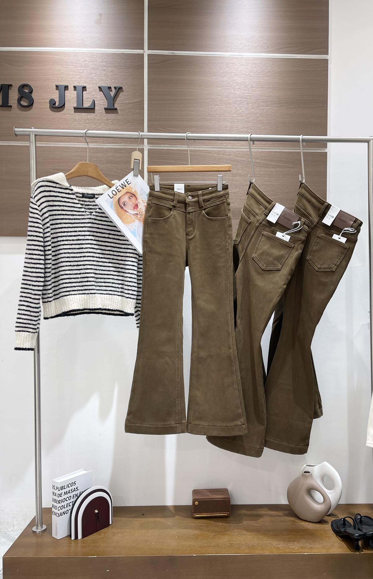【C7537】冬季加厚保暖複合密密絨板栗糉咖色修身顯瘦彈力喇叭褲牛仔褲