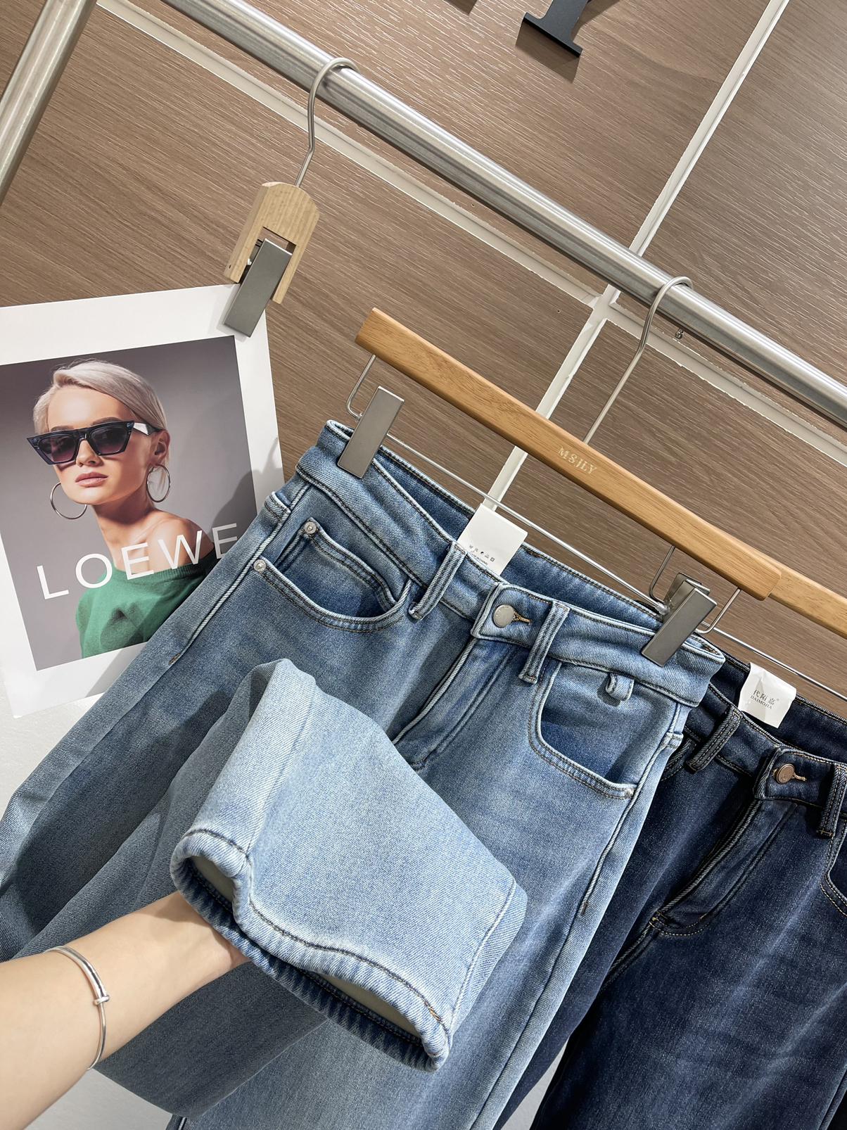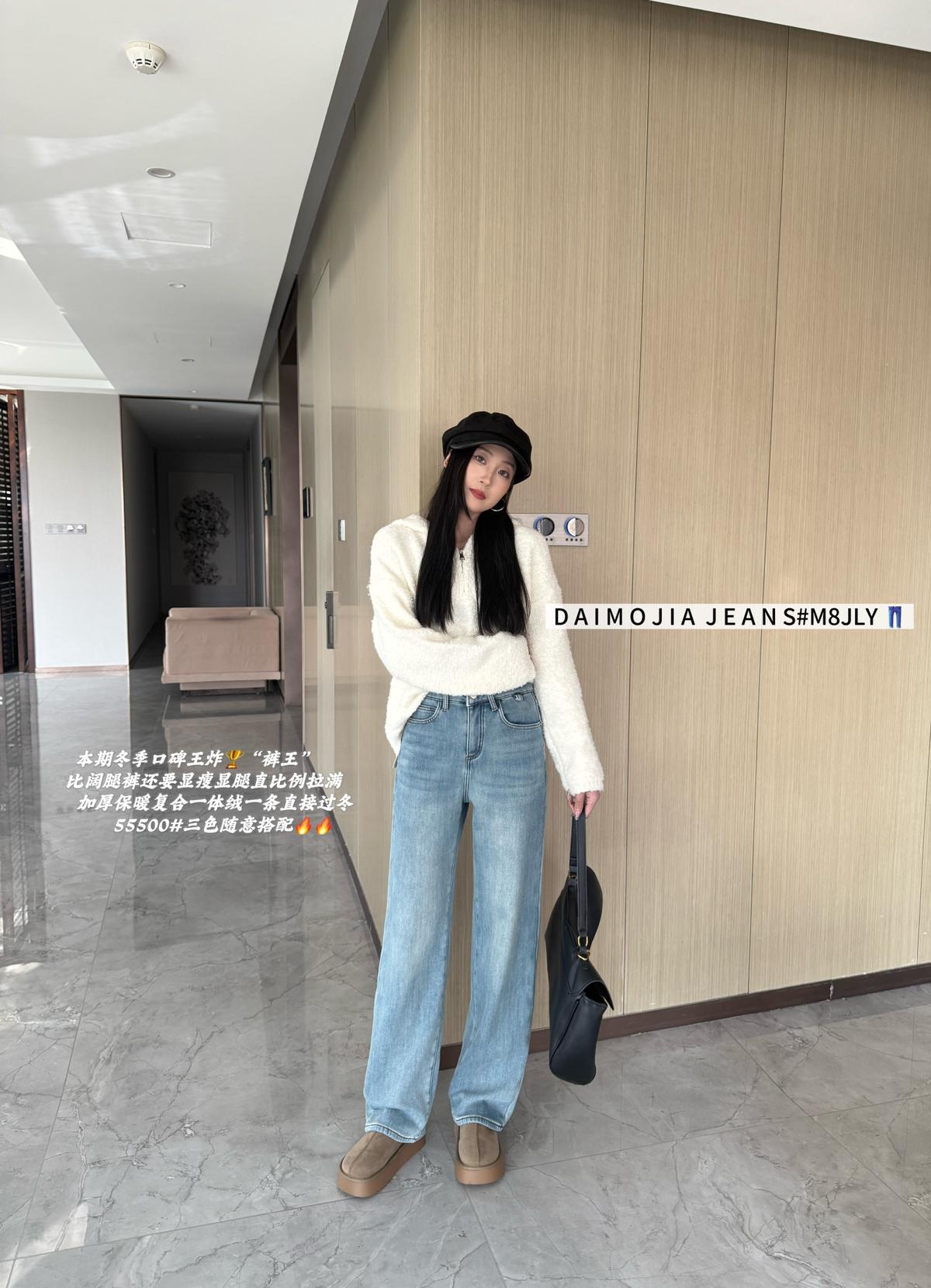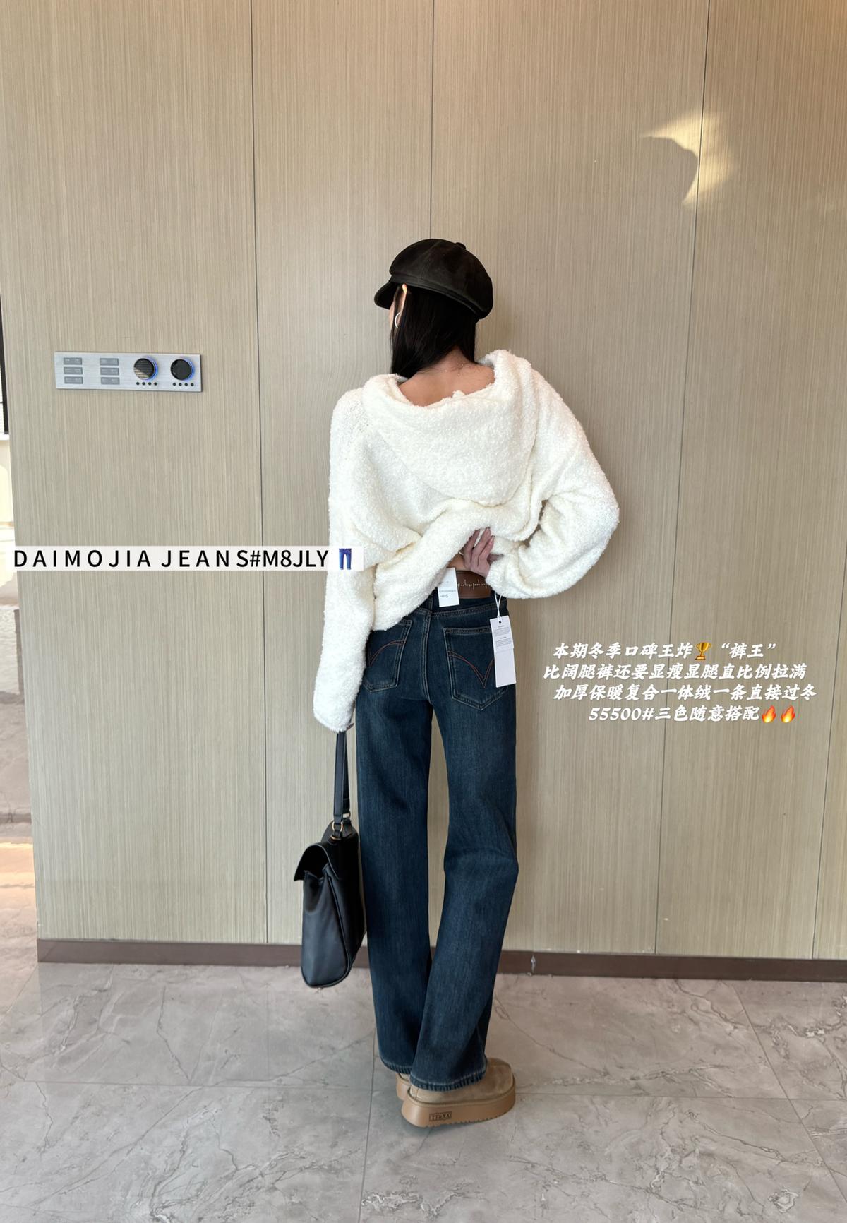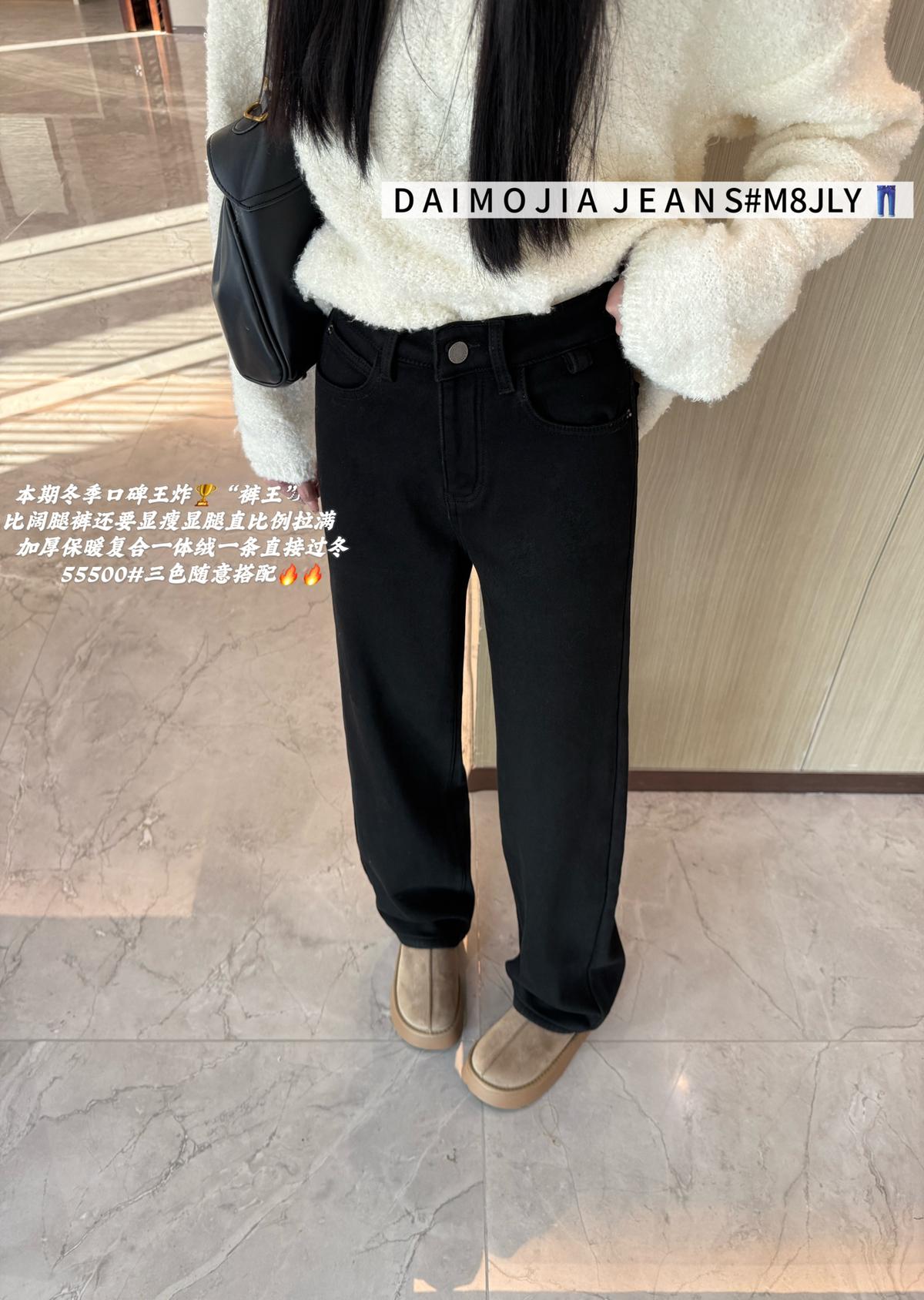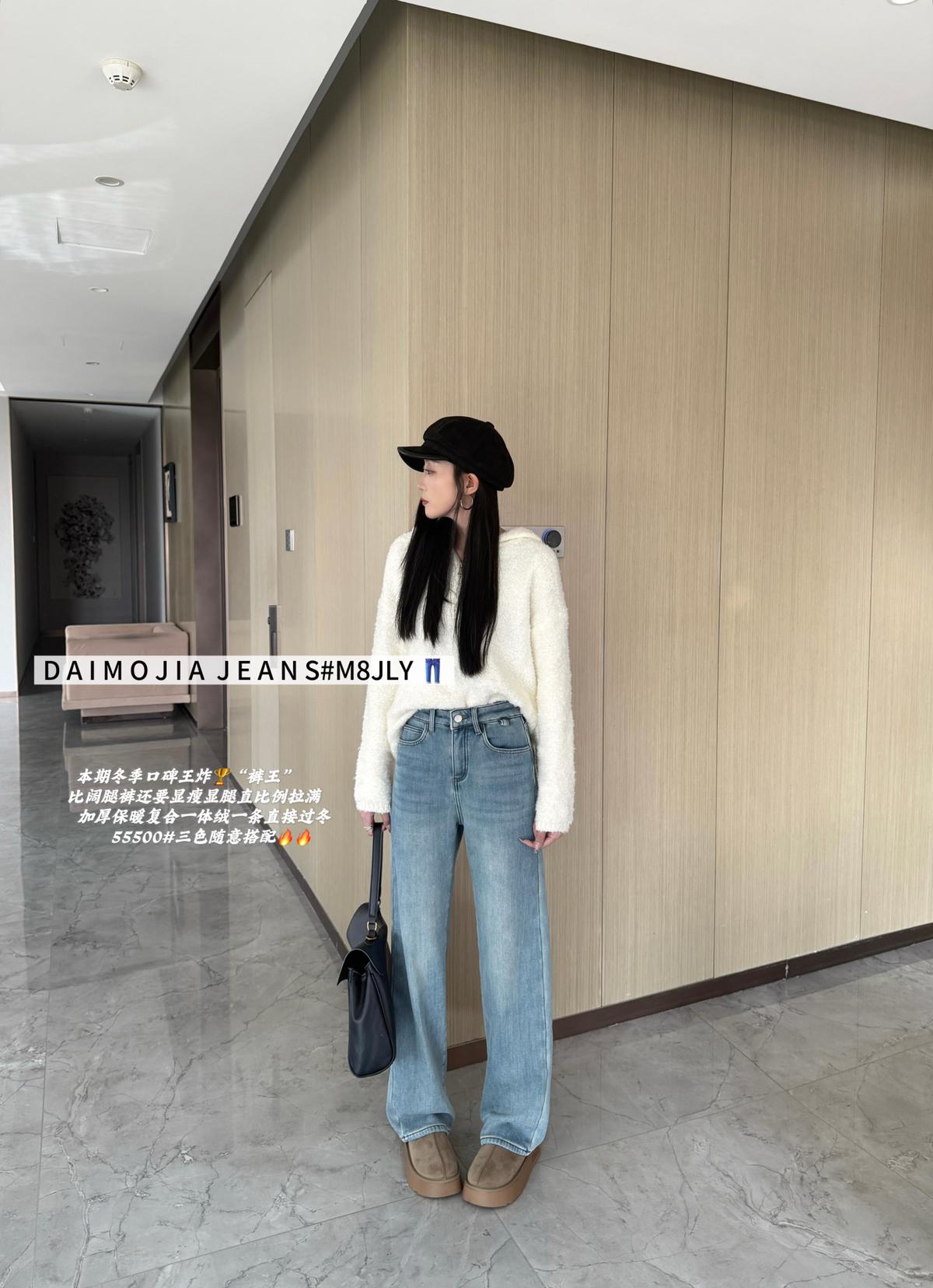 【C7538】冬季保暖加厚複合絨三色可選後口袋撞色繡線彈力窄版直筒褲牛仔褲
