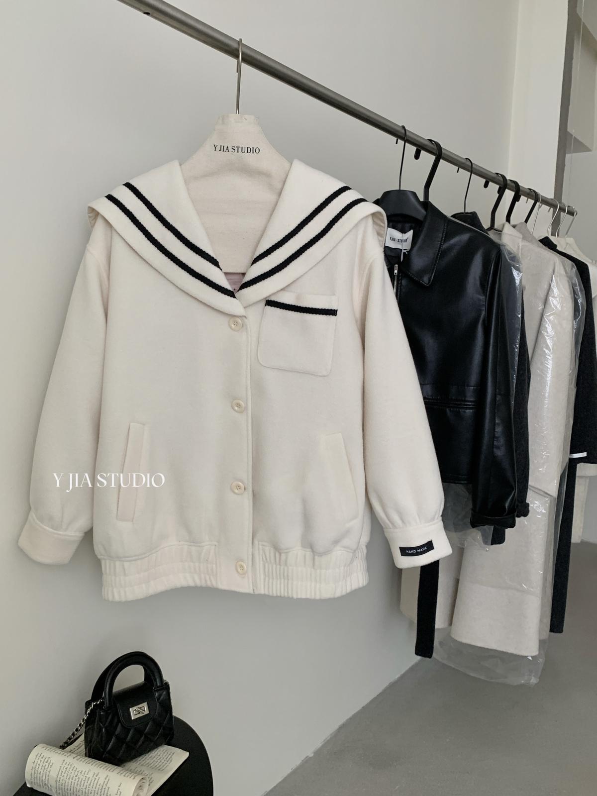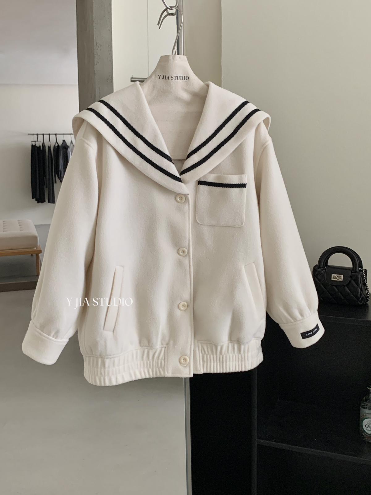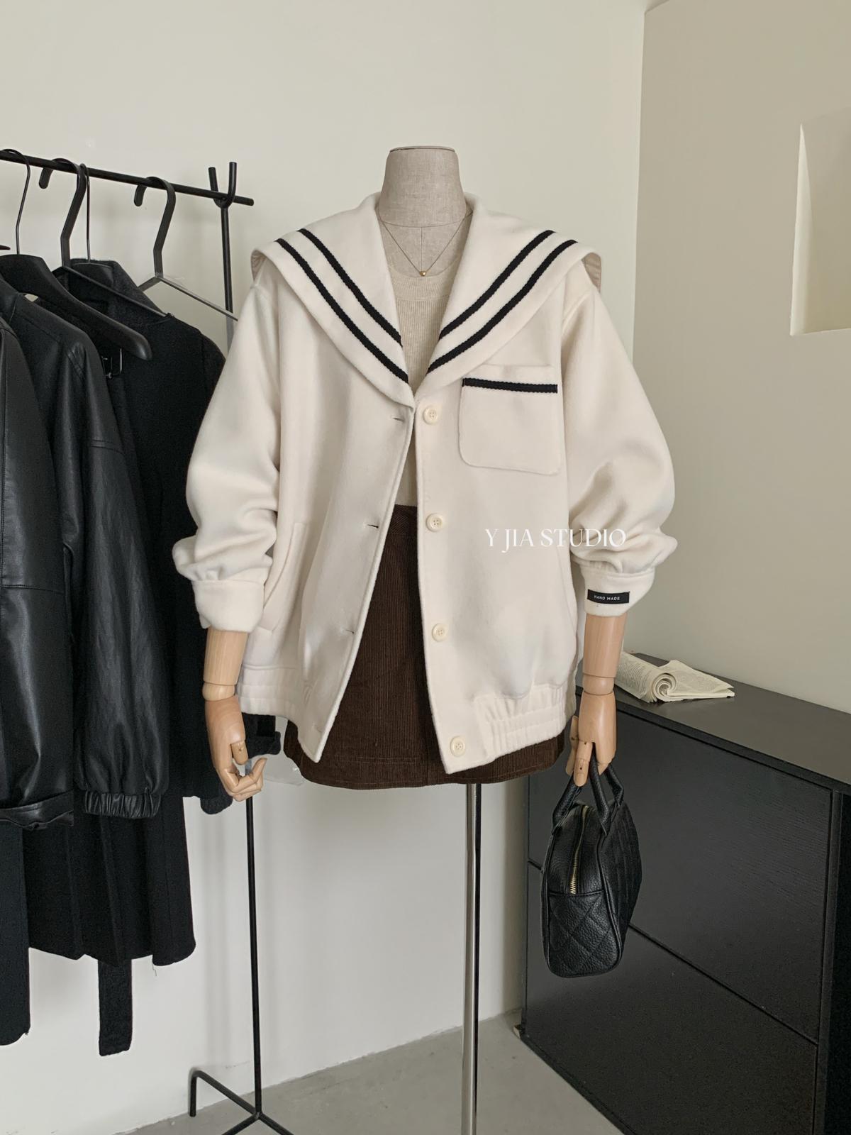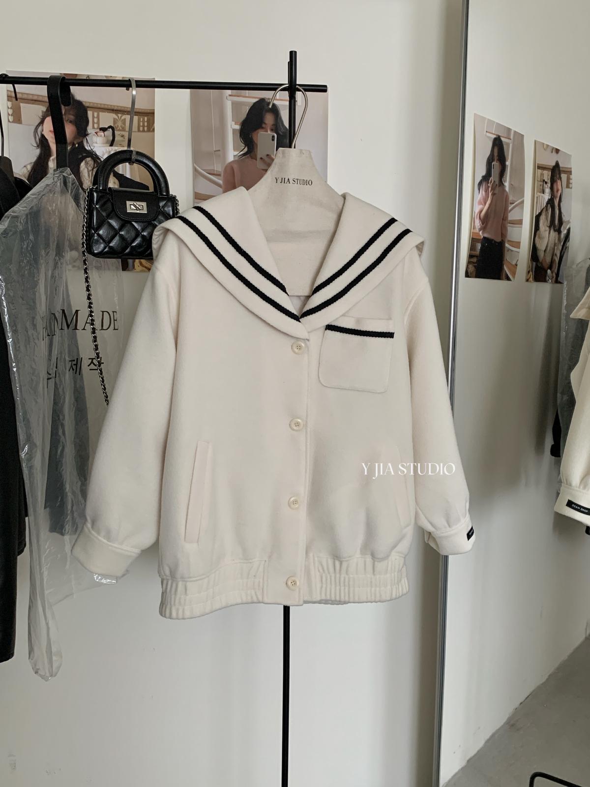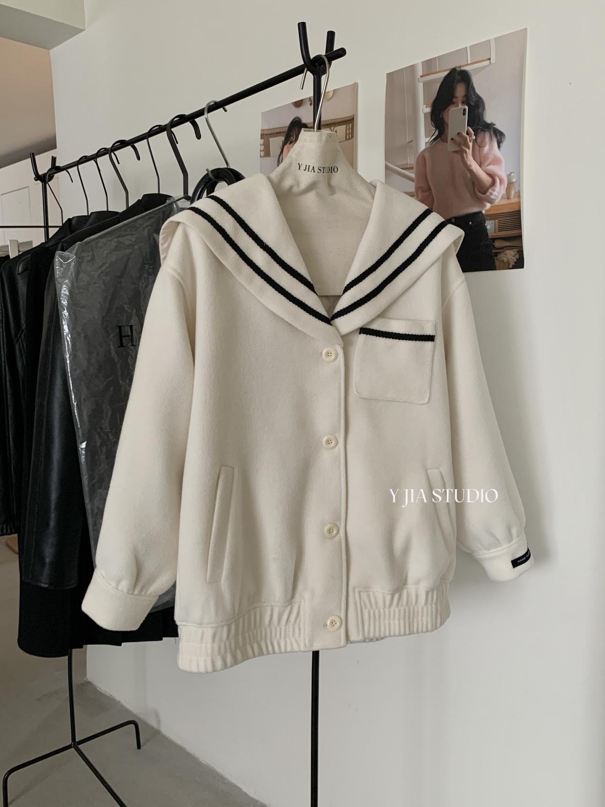 【C7543】miu系海軍領寬鬆顯瘦撞色毛呢短外套