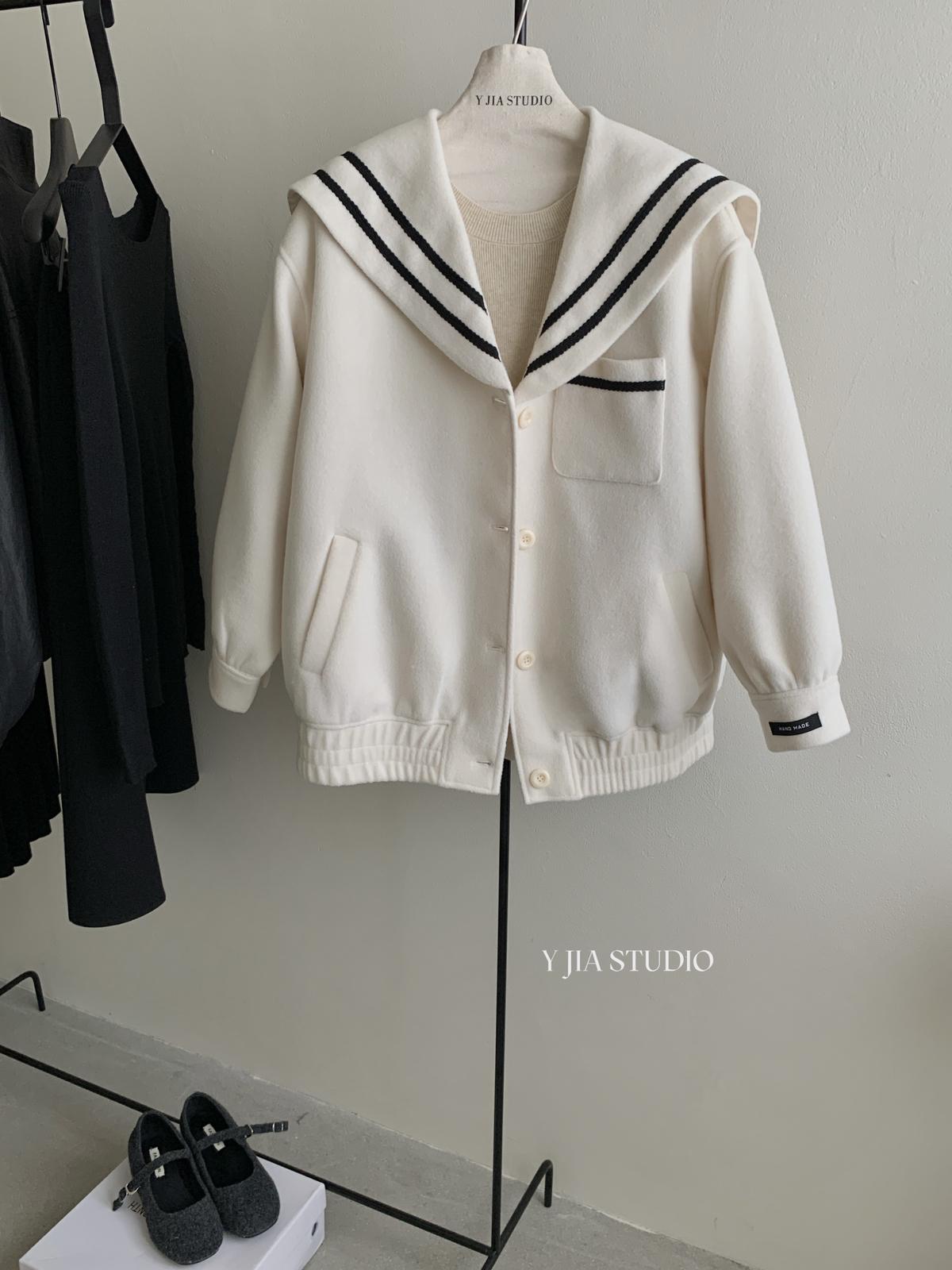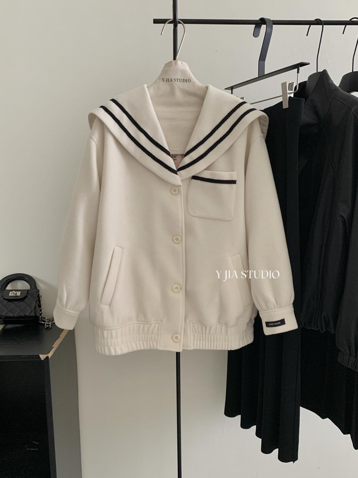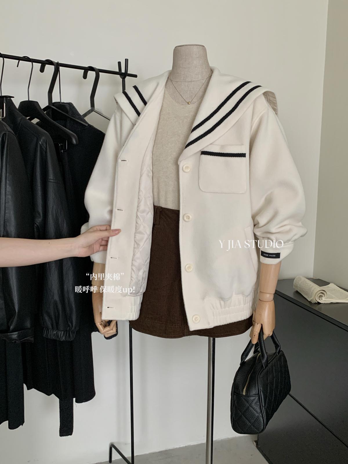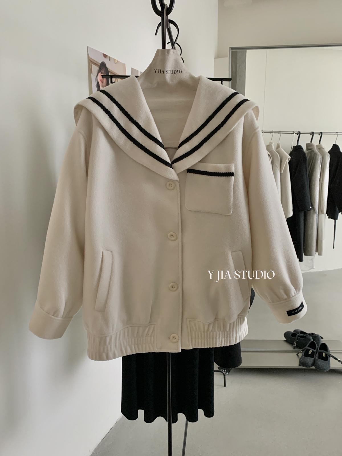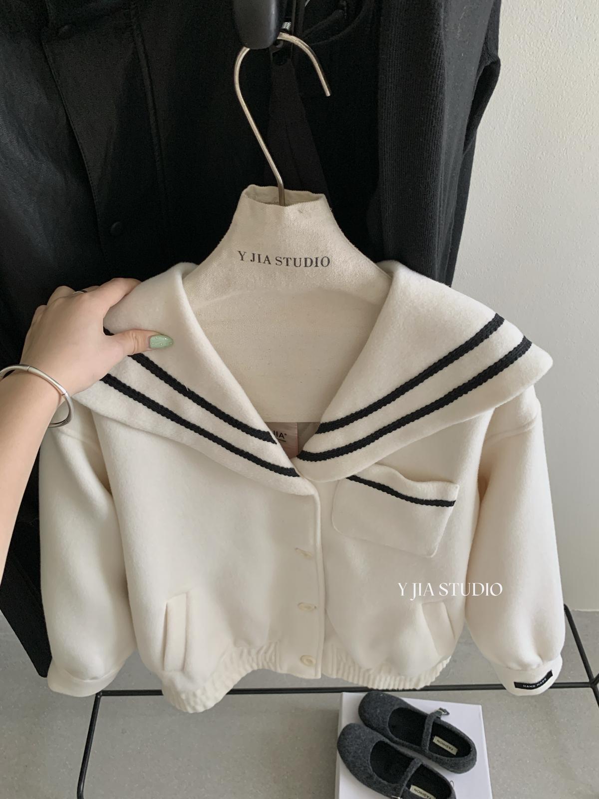 【C7543】miu系海軍領寬鬆顯瘦撞色毛呢短外套