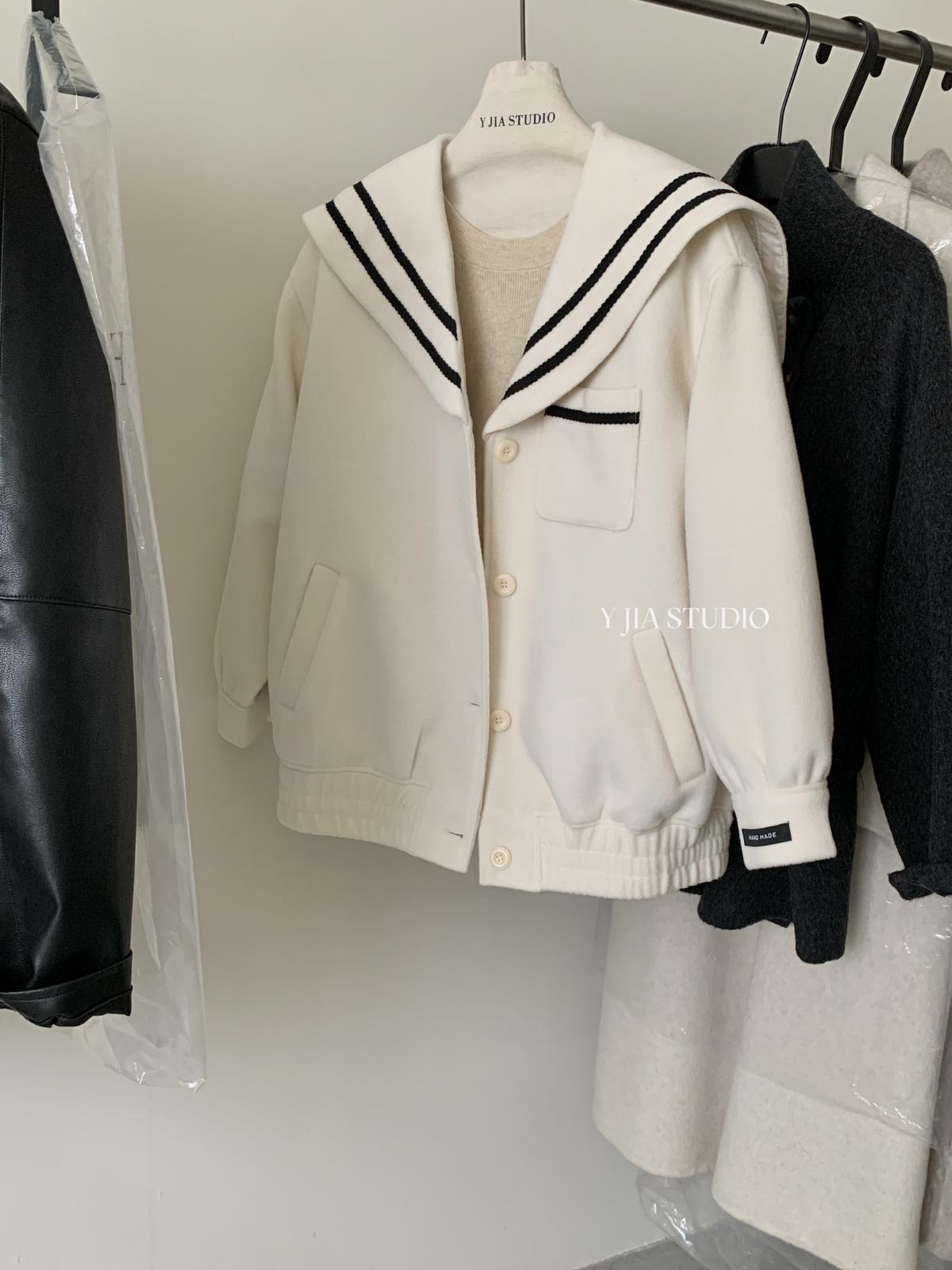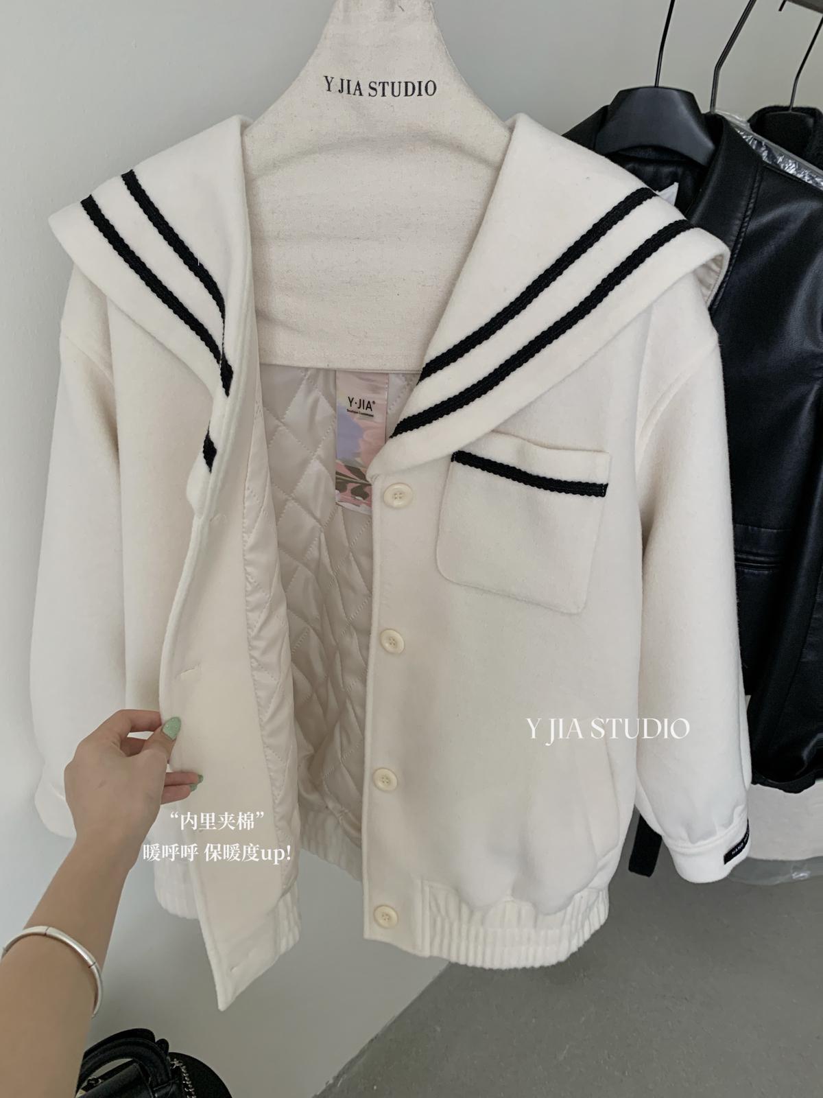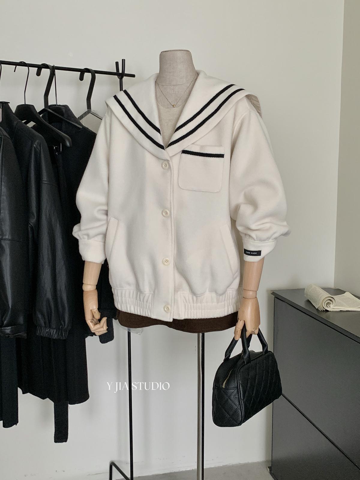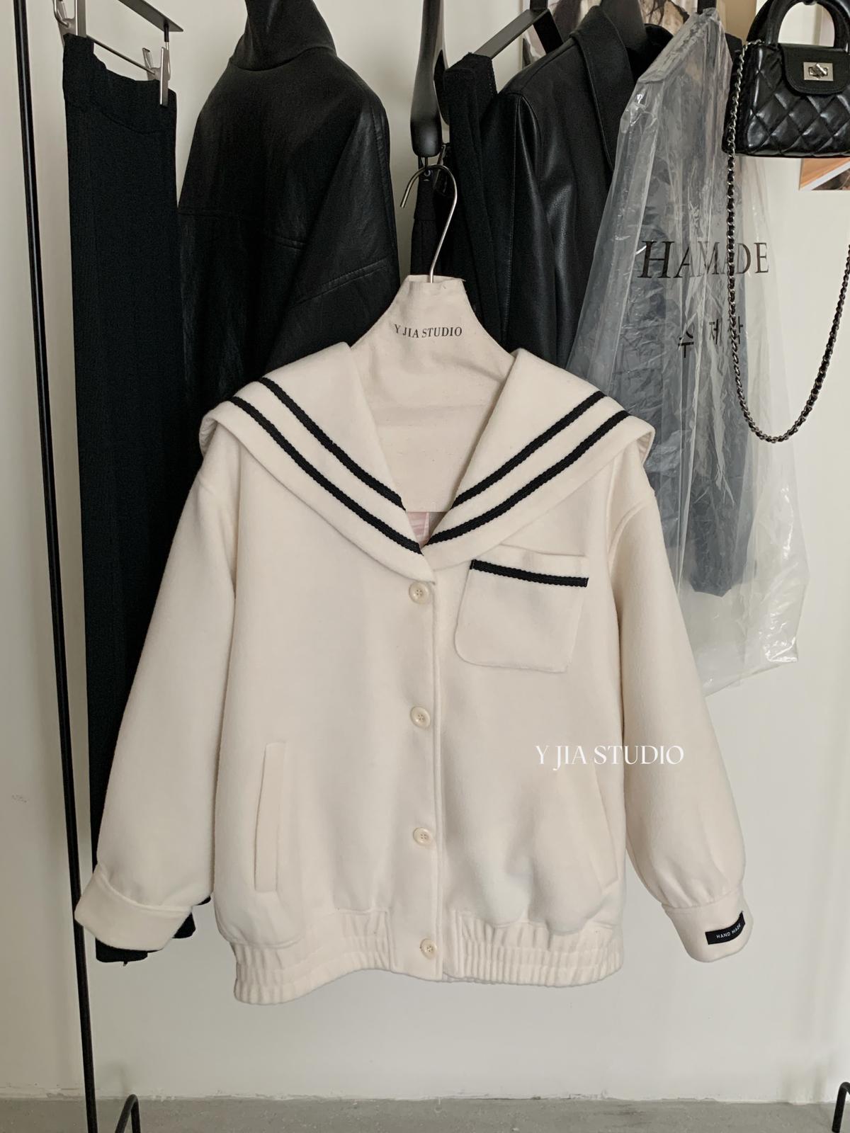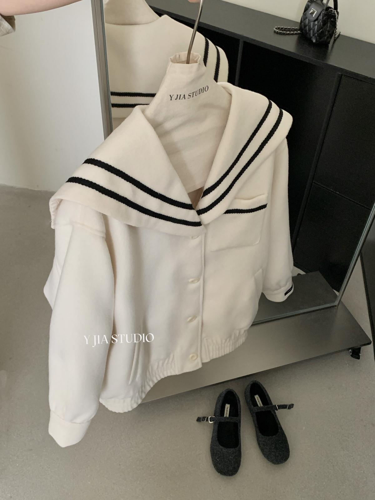 【C7543】miu系海軍領寬鬆顯瘦撞色毛呢短外套