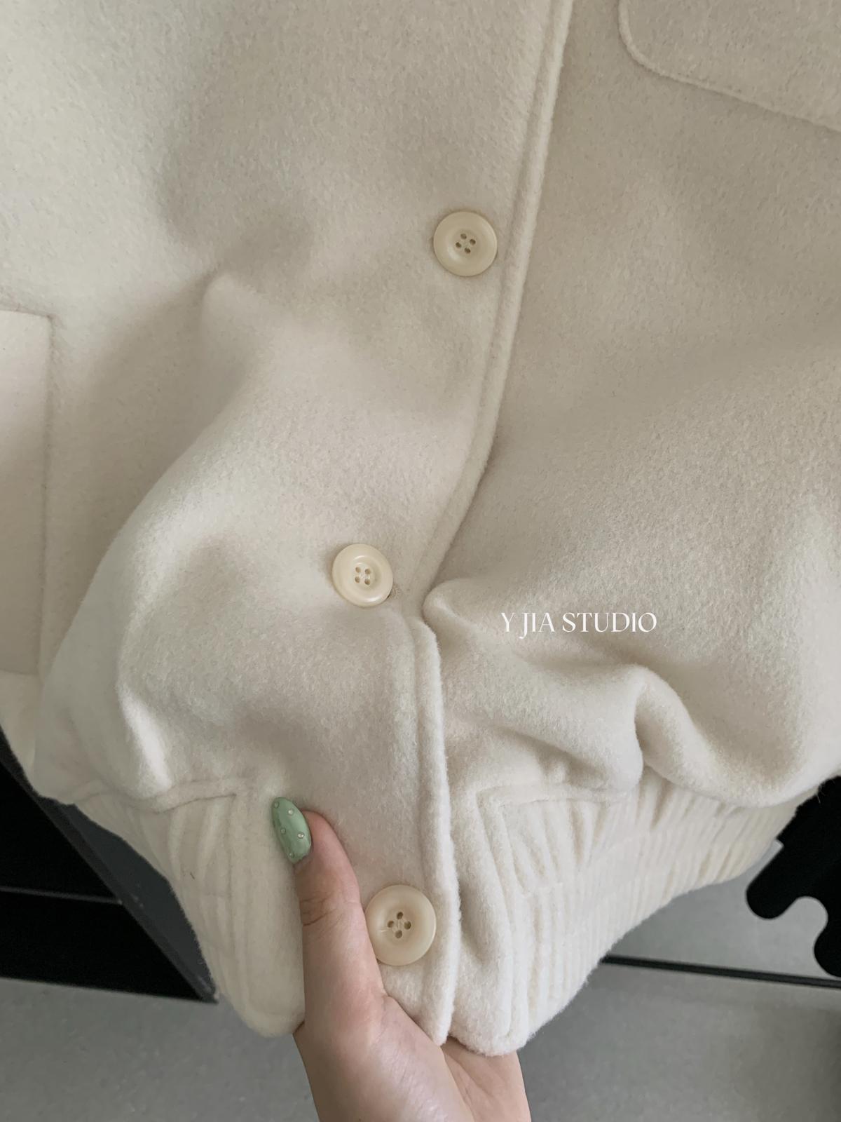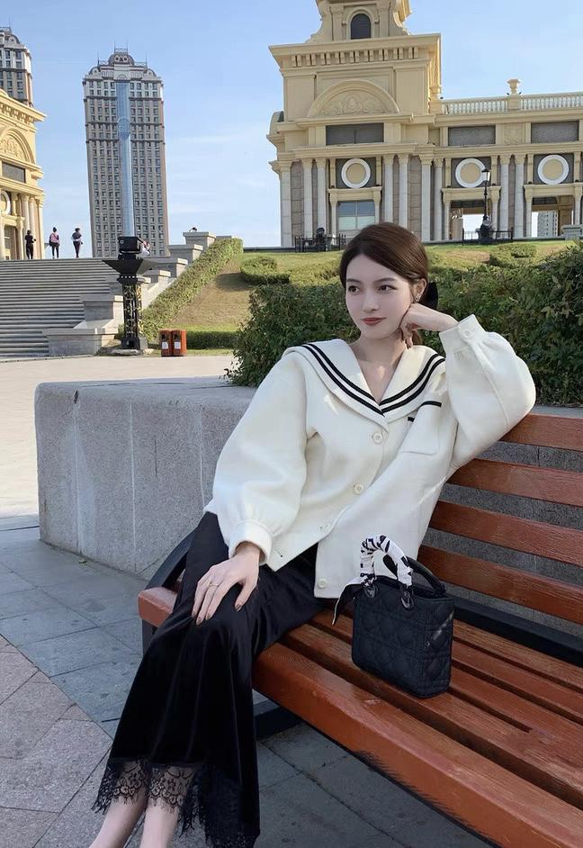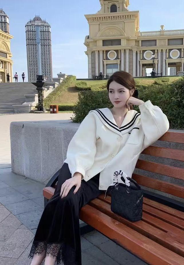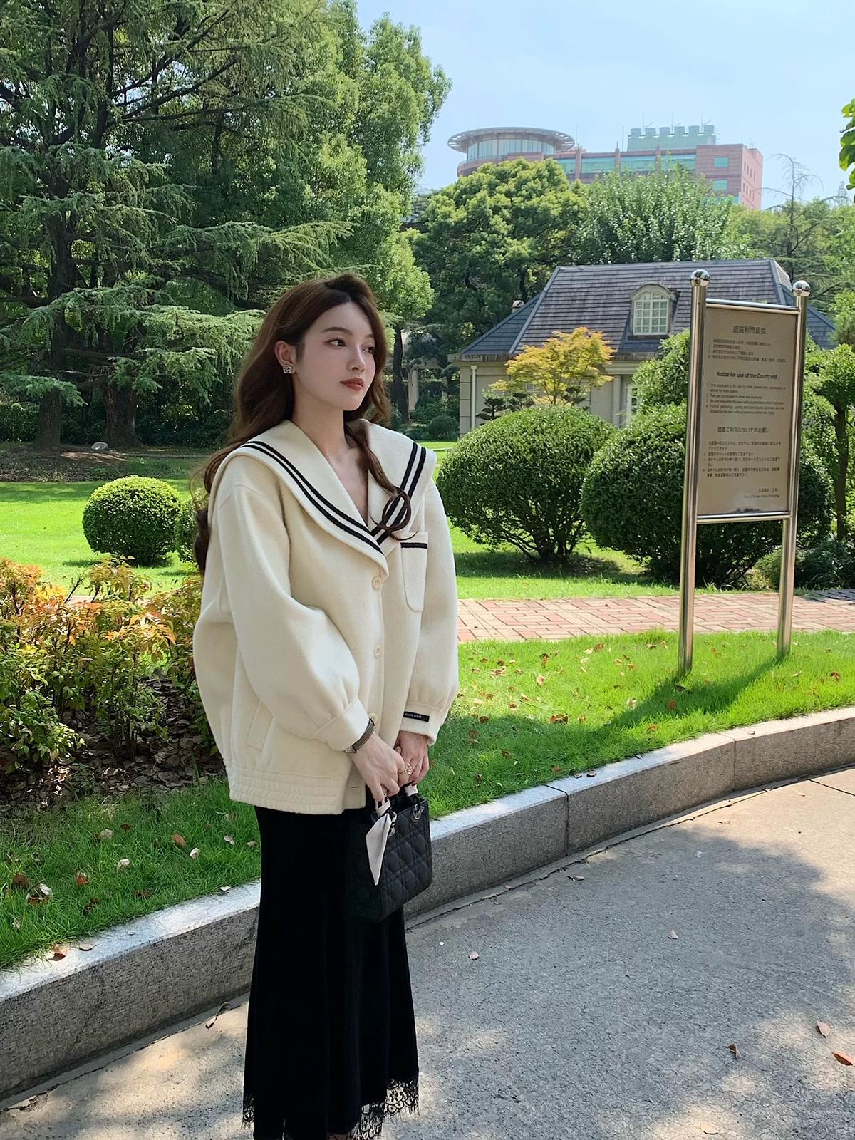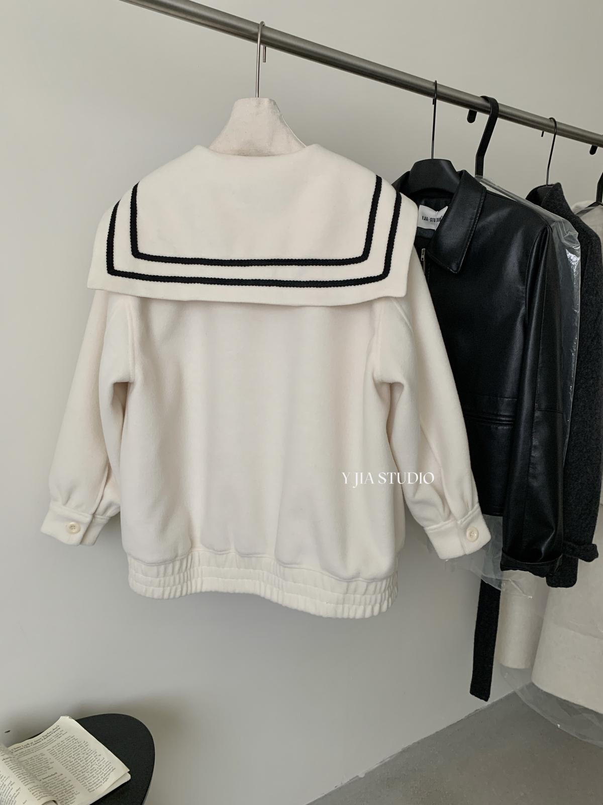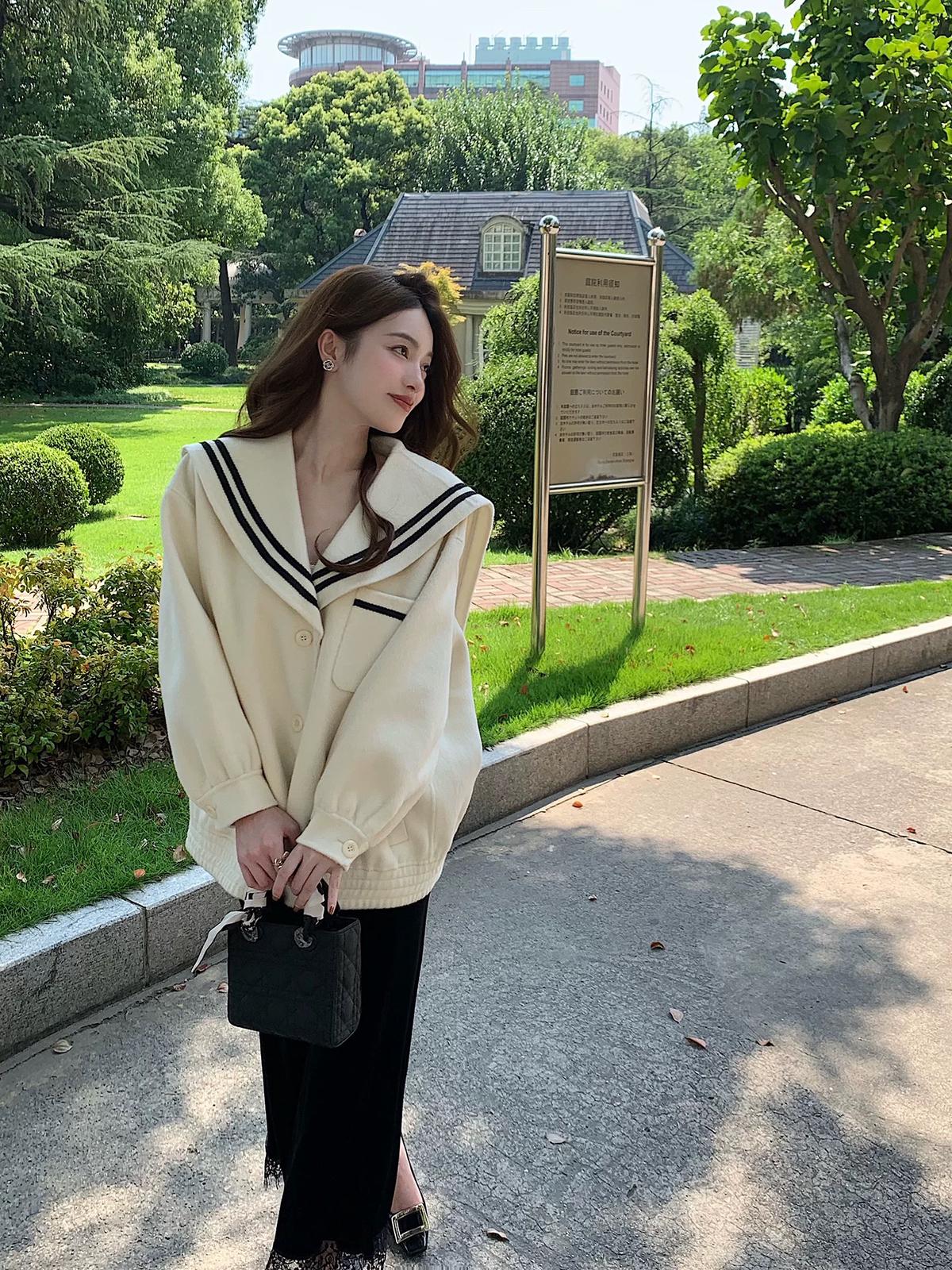 【C7543】miu系海軍領寬鬆顯瘦撞色毛呢短外套