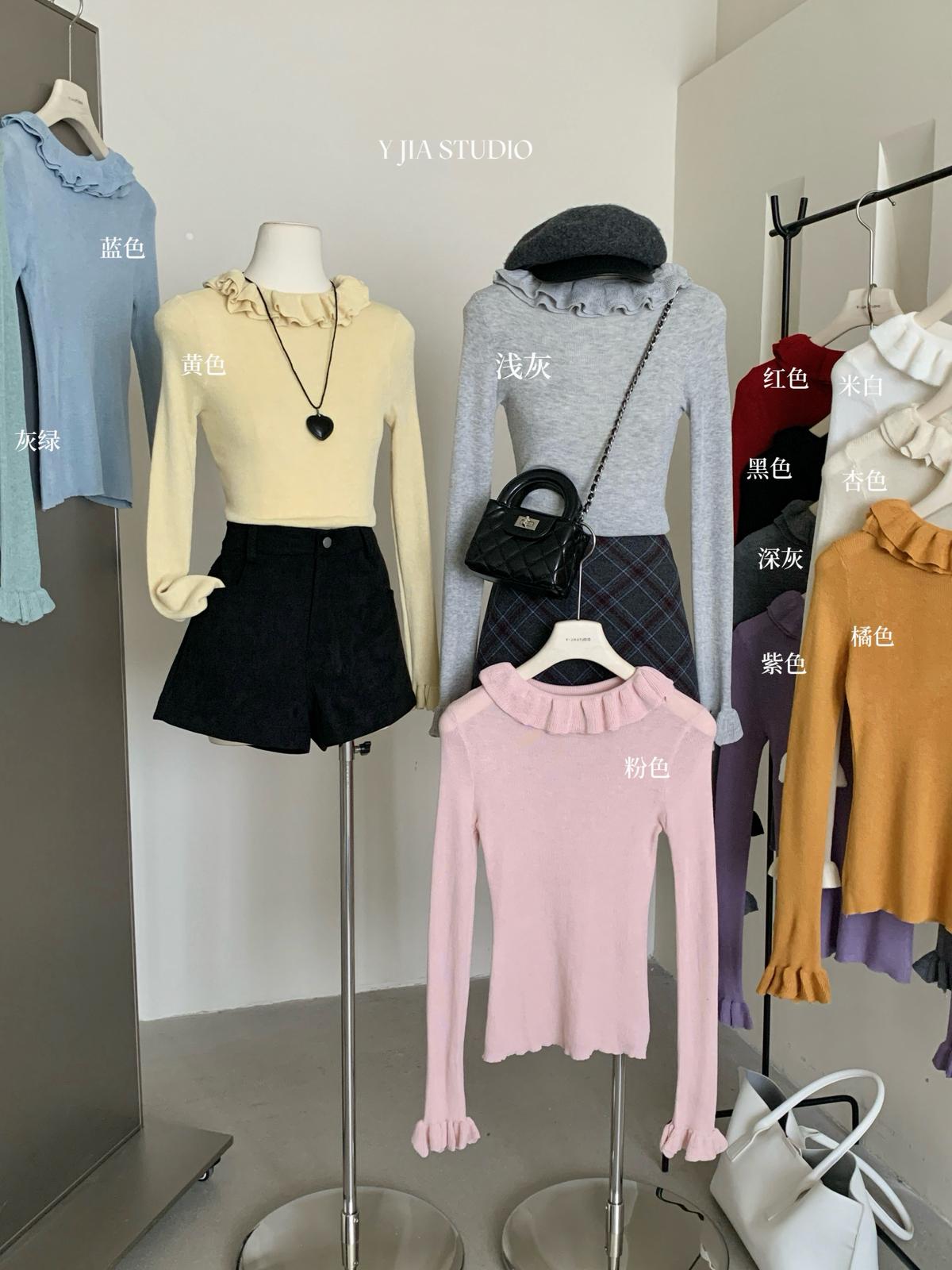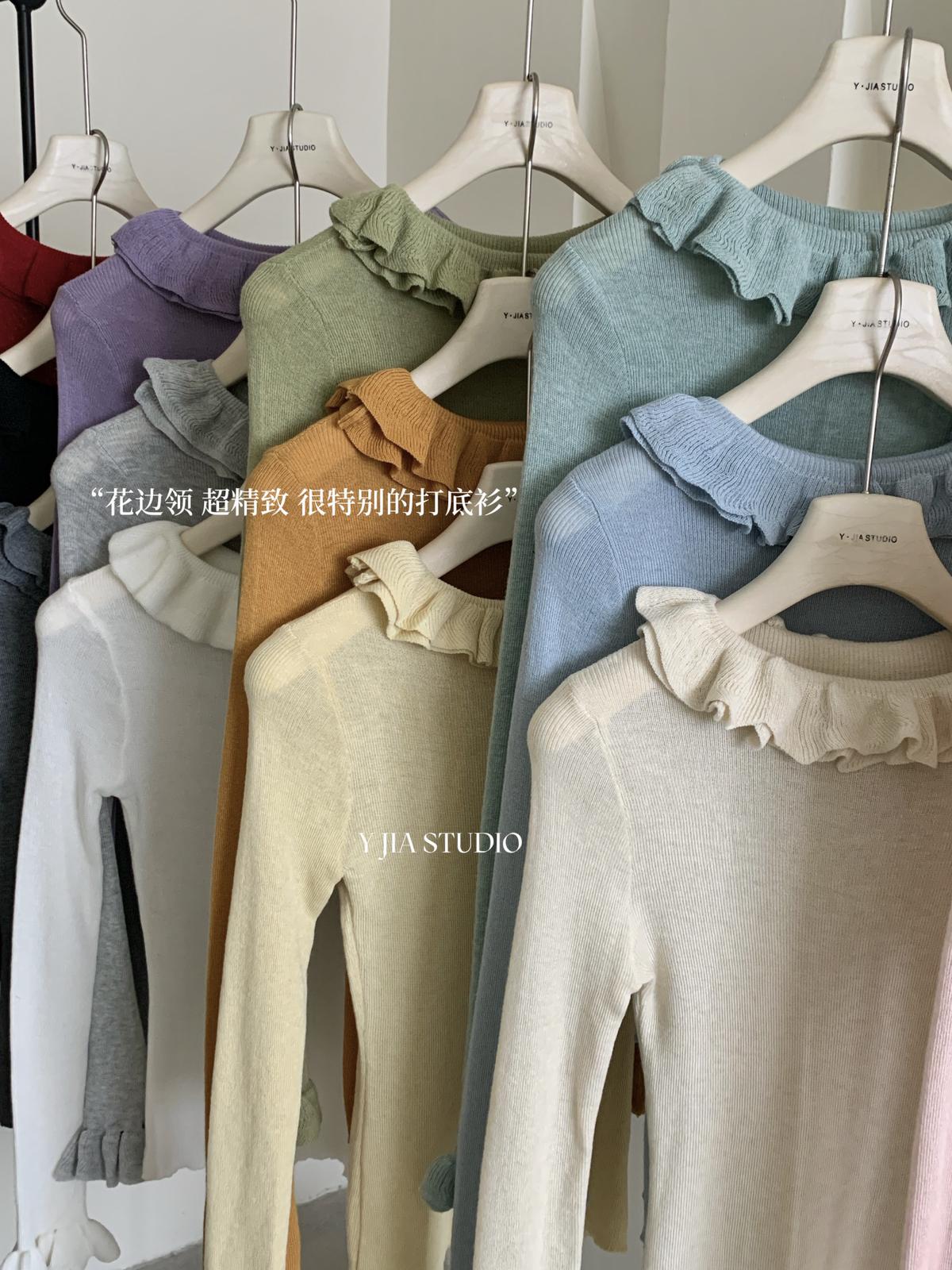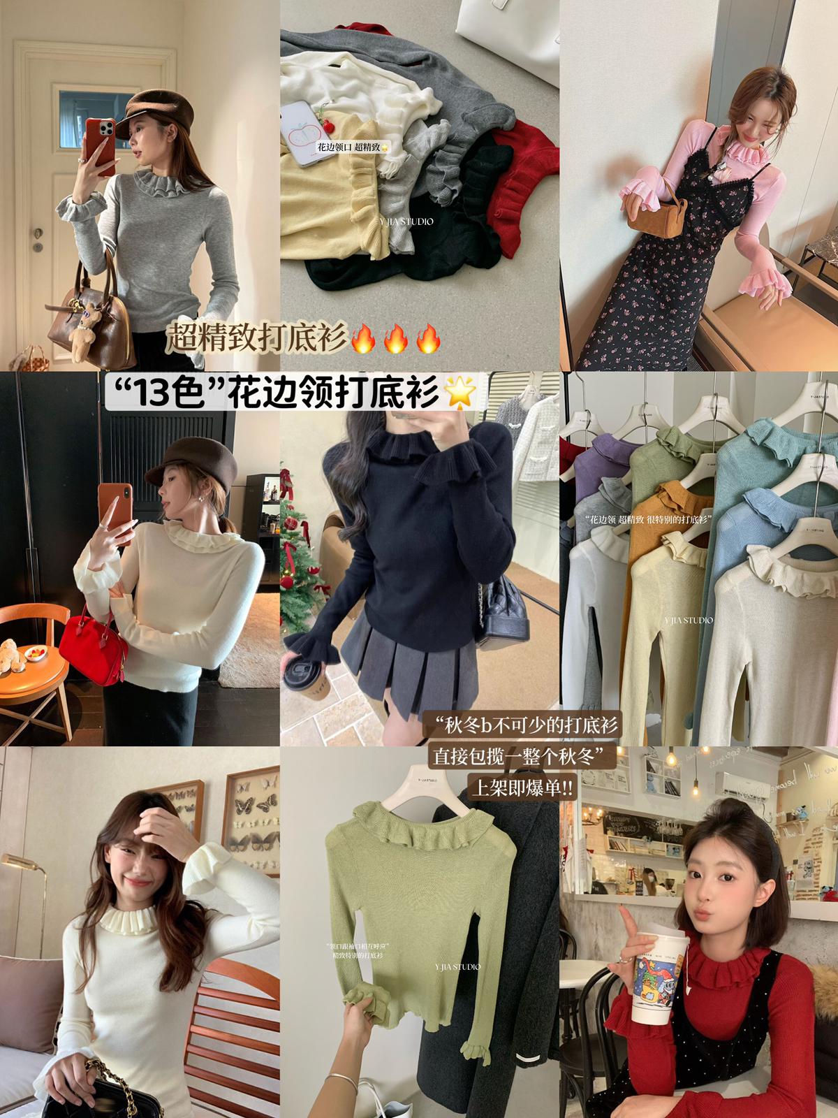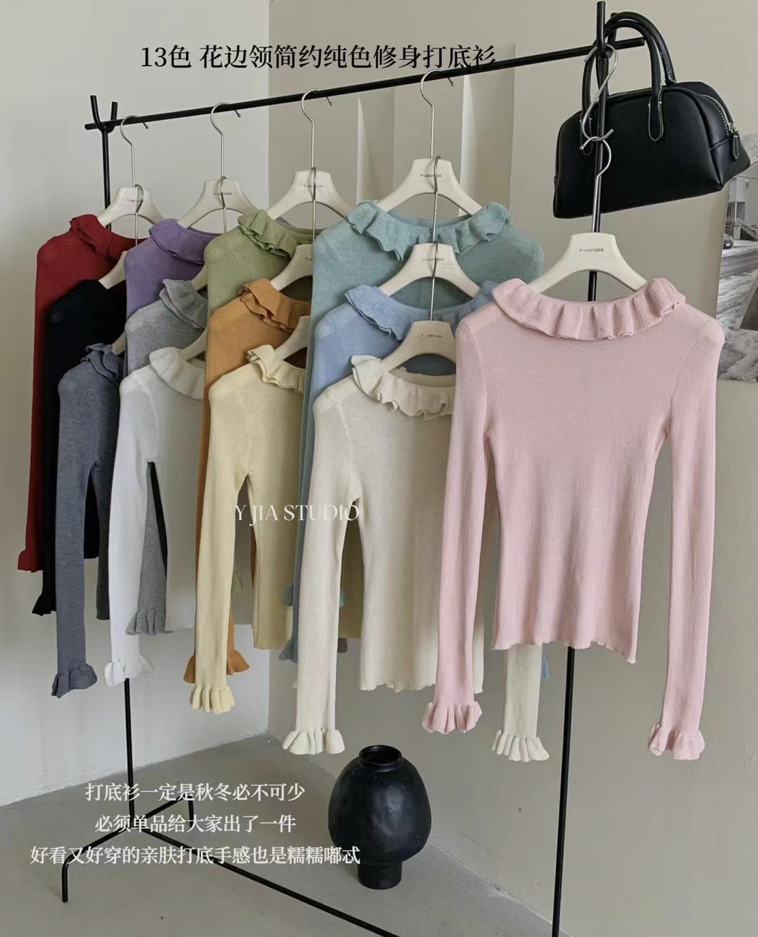 【C7544】13色 花邊領簡約純色修身顯瘦打底衫針織衫