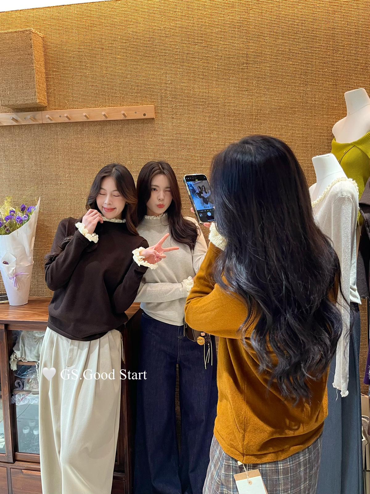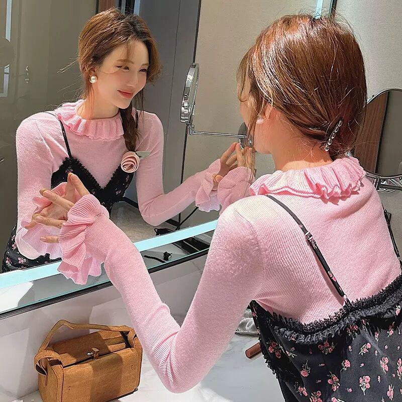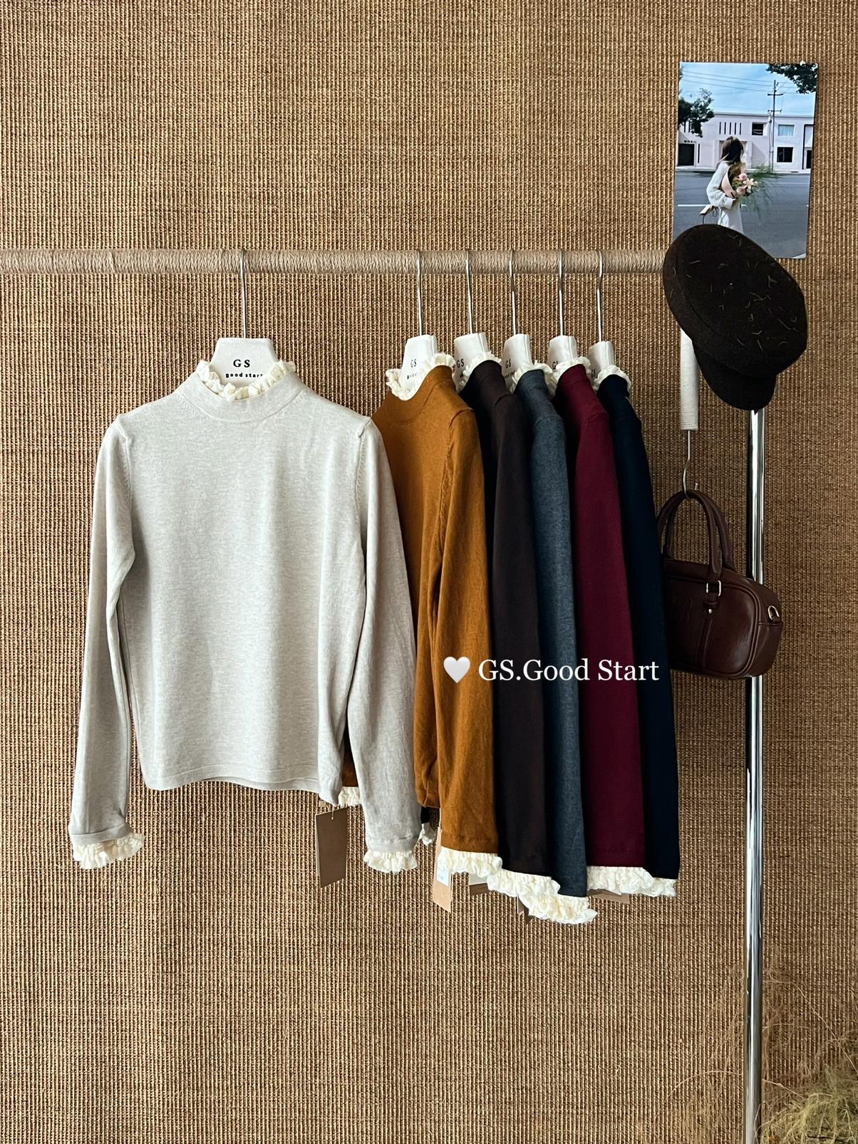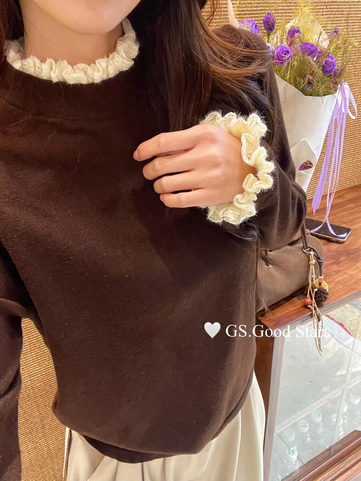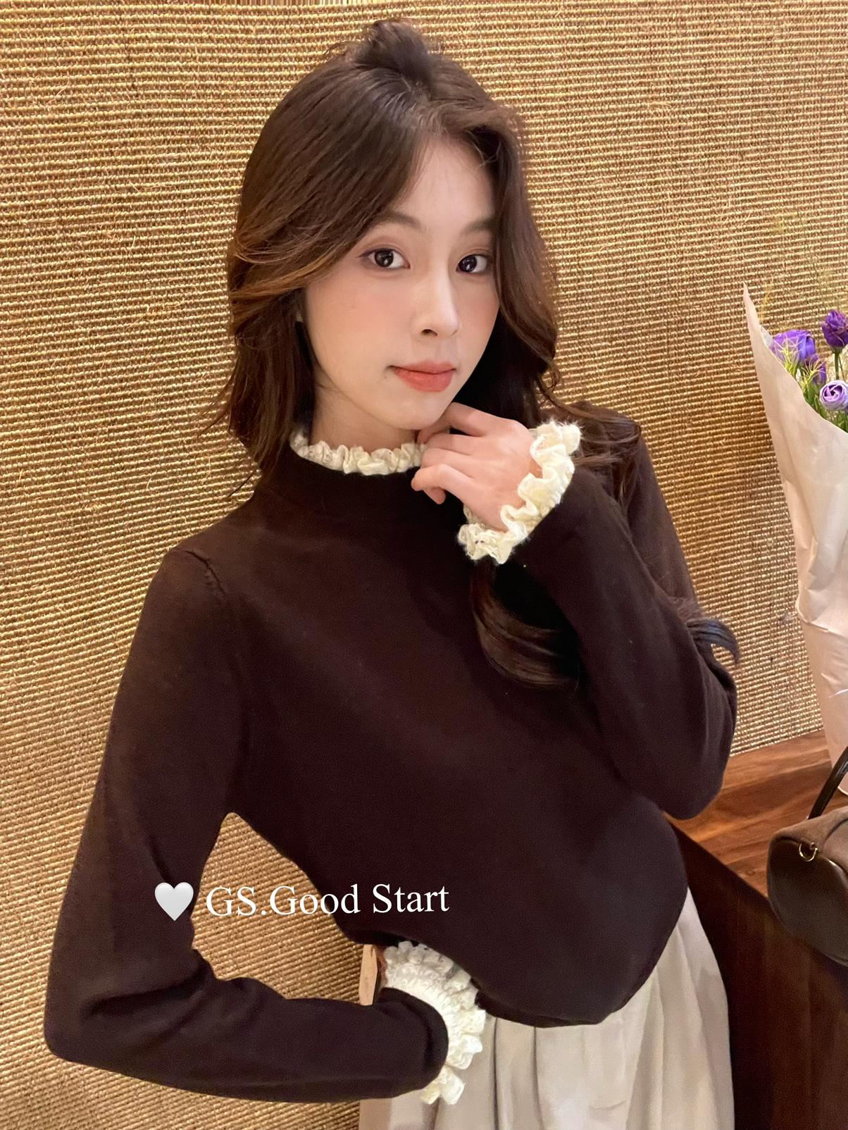 【C7560】面料超軟糯~好穿!秋法式氣質蕾絲花邊高領打底針織小衫