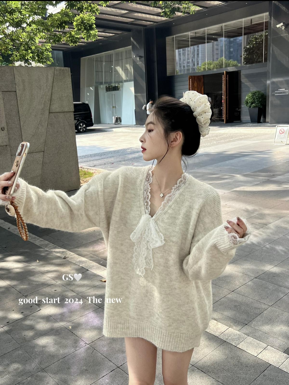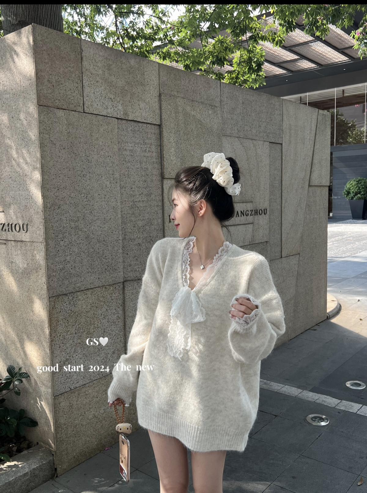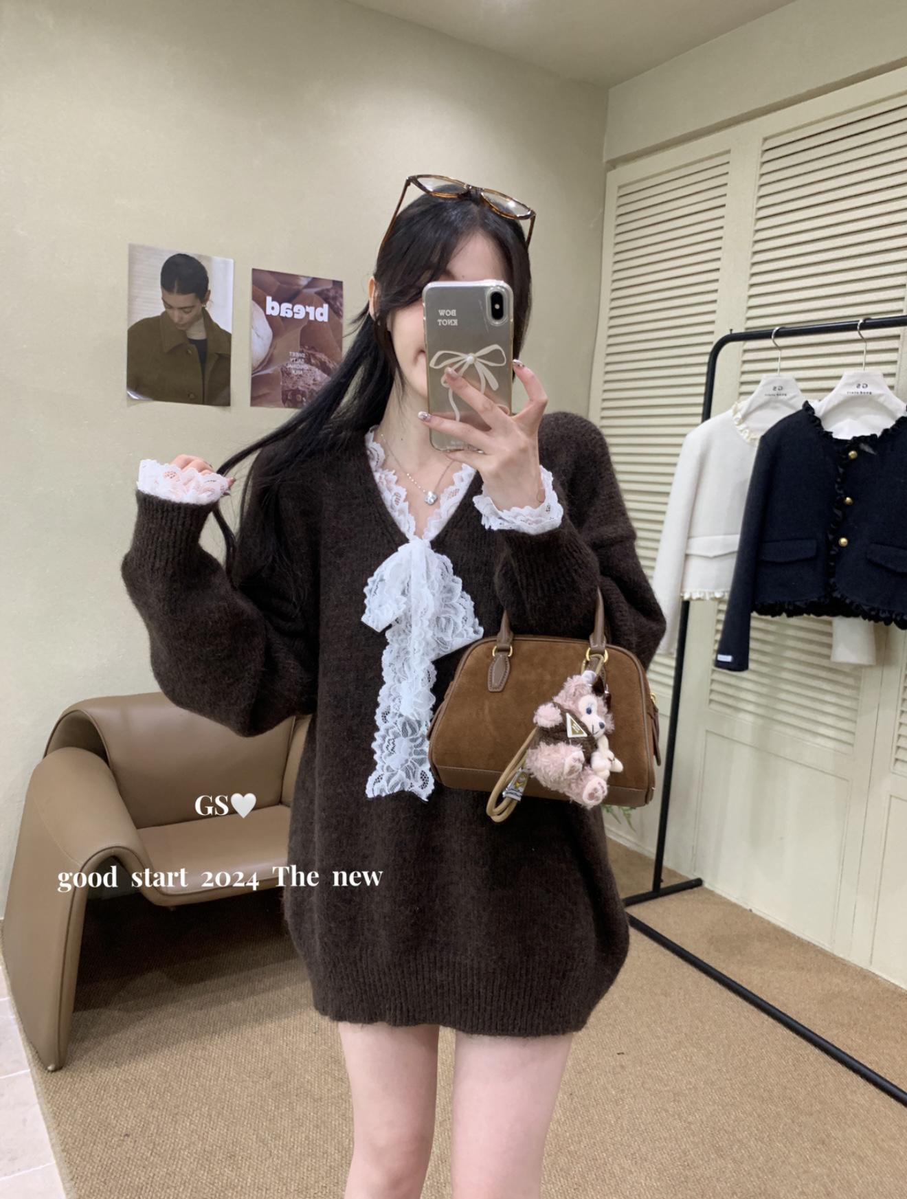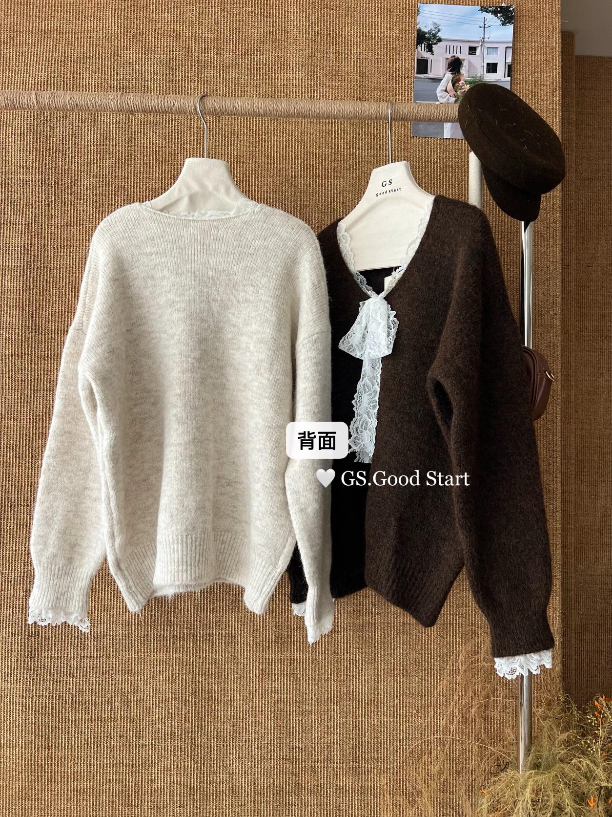 【C7559】香香爆款!pick一萬次~秋法式蕾絲蝴蝶結氛圍感寬鬆慵懶保暖毛衣