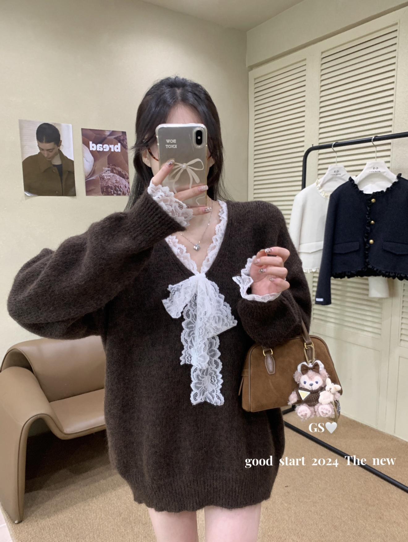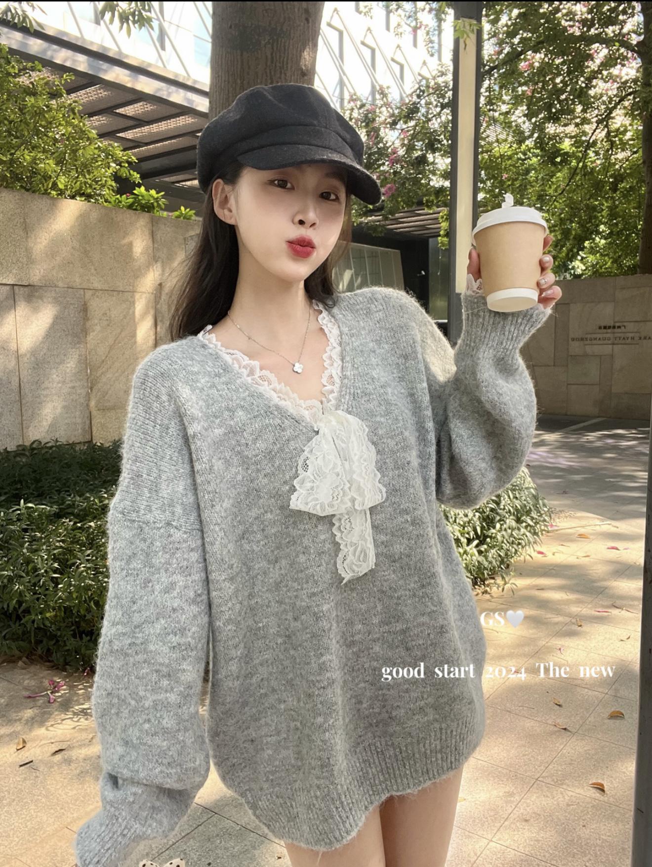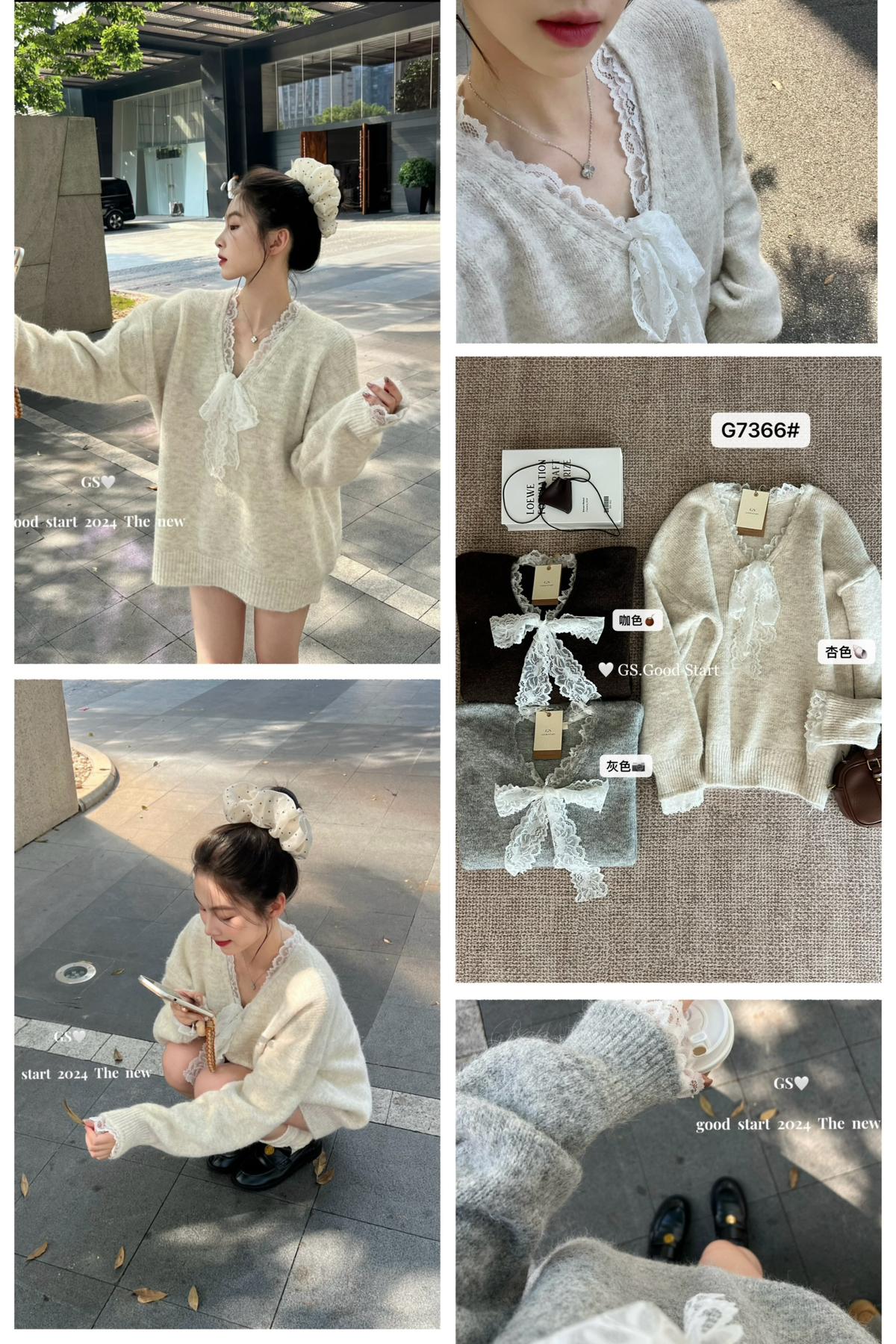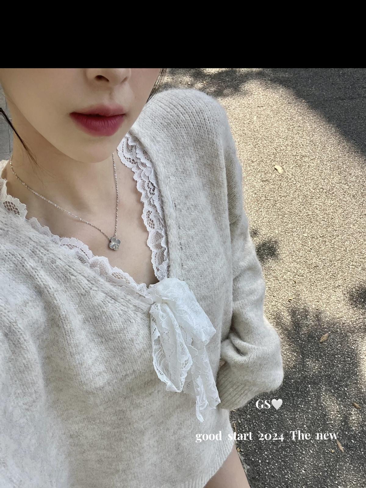 【C7559】香香爆款!pick一萬次~秋法式蕾絲蝴蝶結氛圍感寬鬆慵懶保暖毛衣