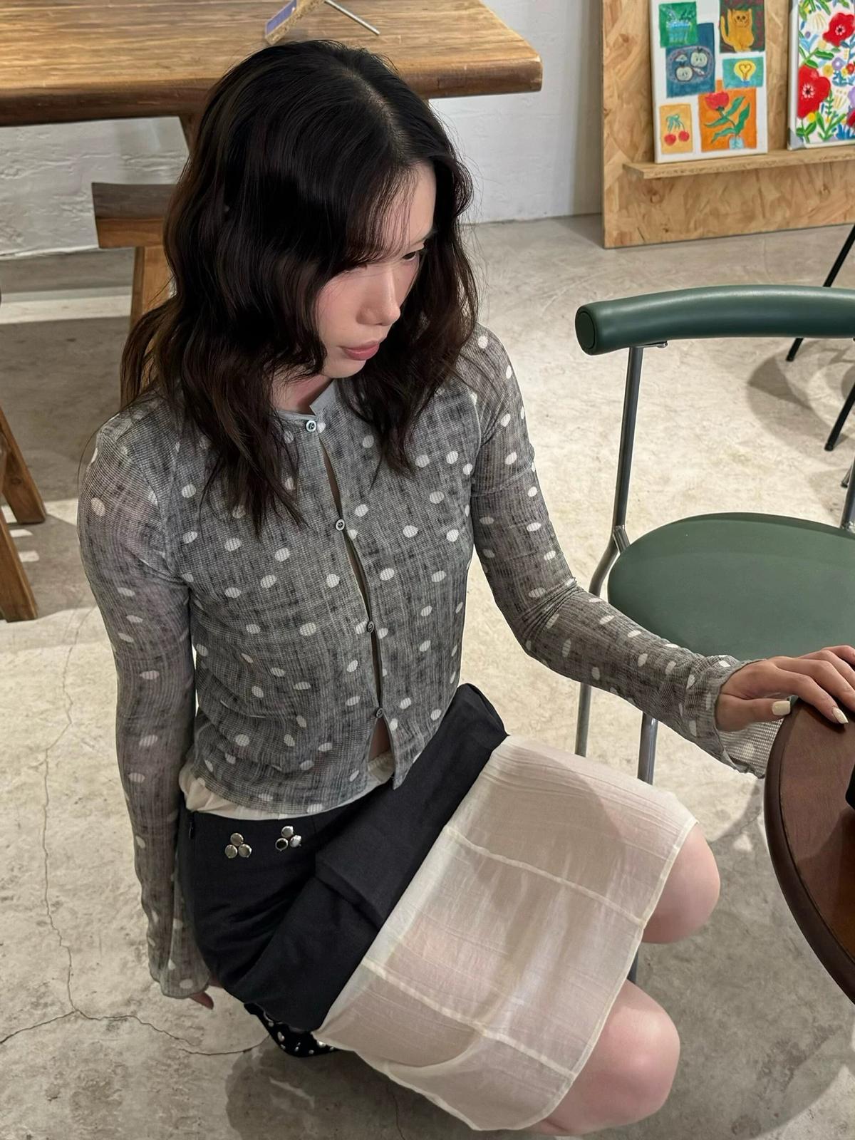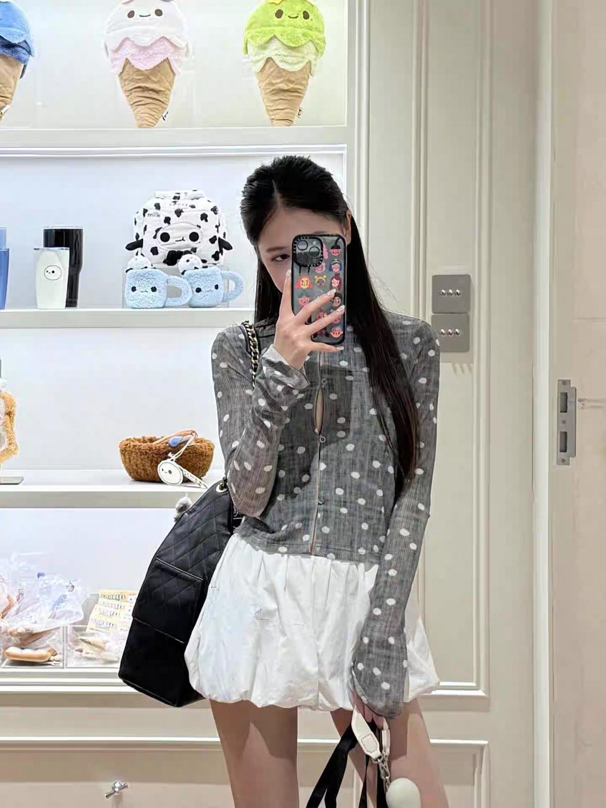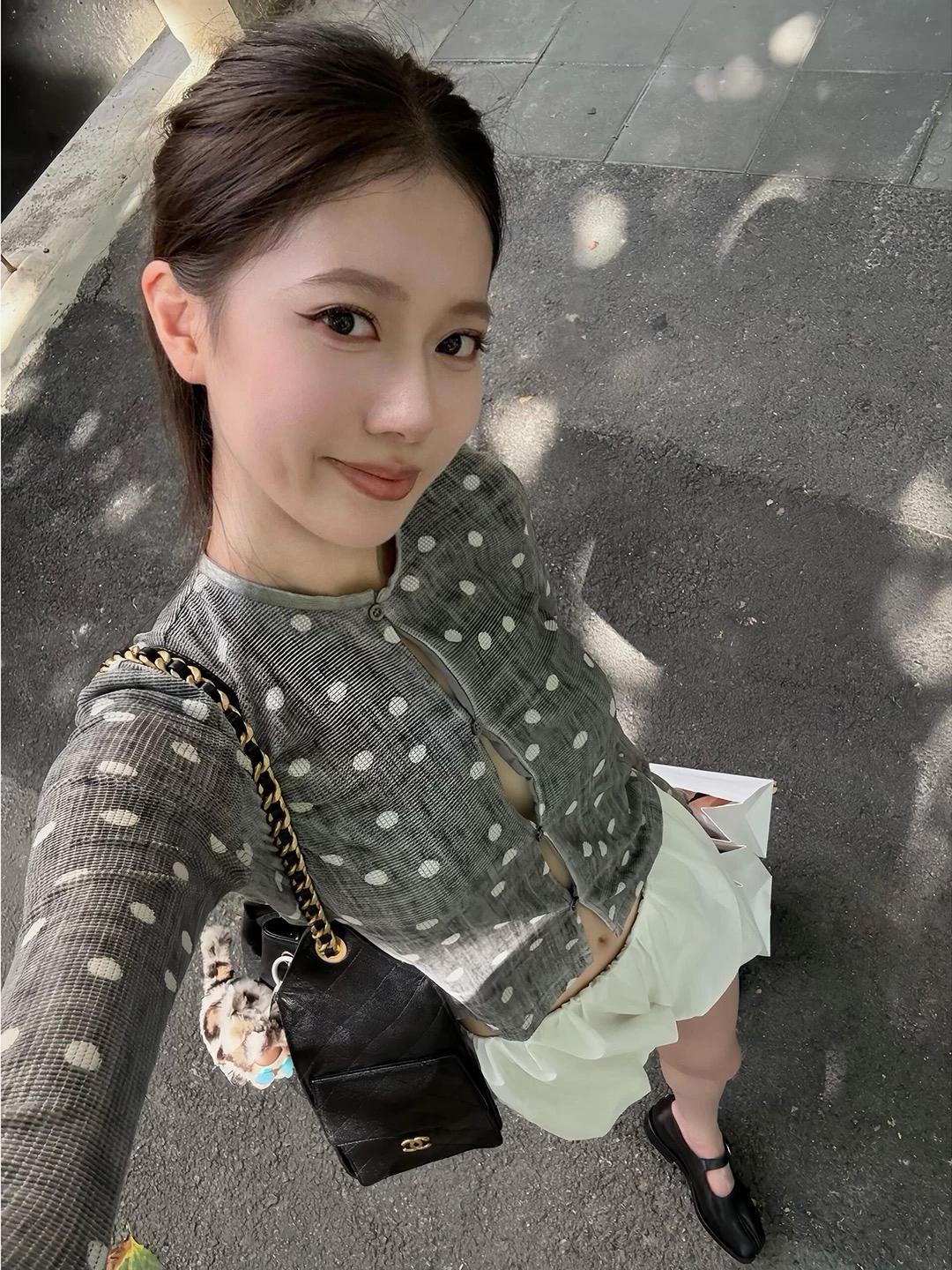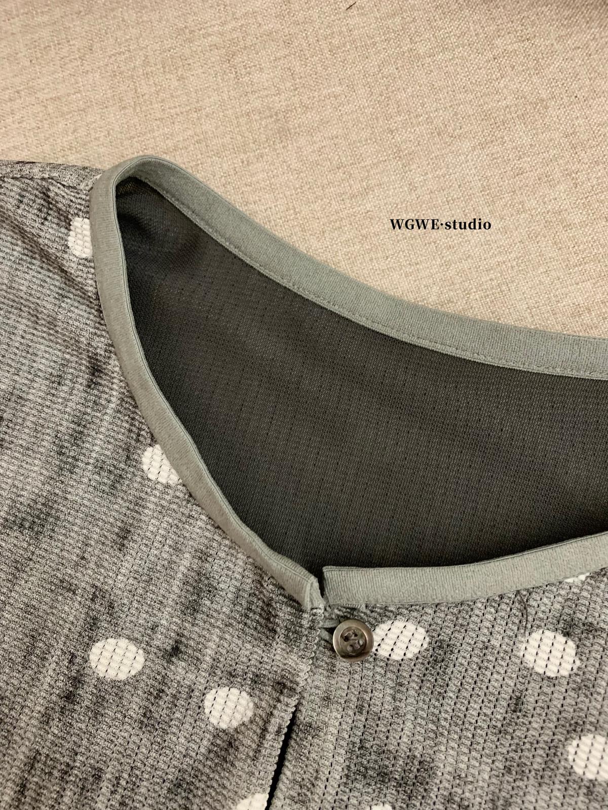 3. 【C7582】復古辣妹設計感短款露臍波點印花長袖修身收腰小衫