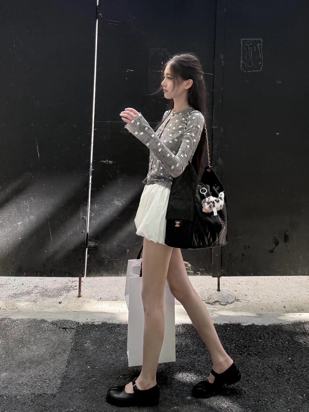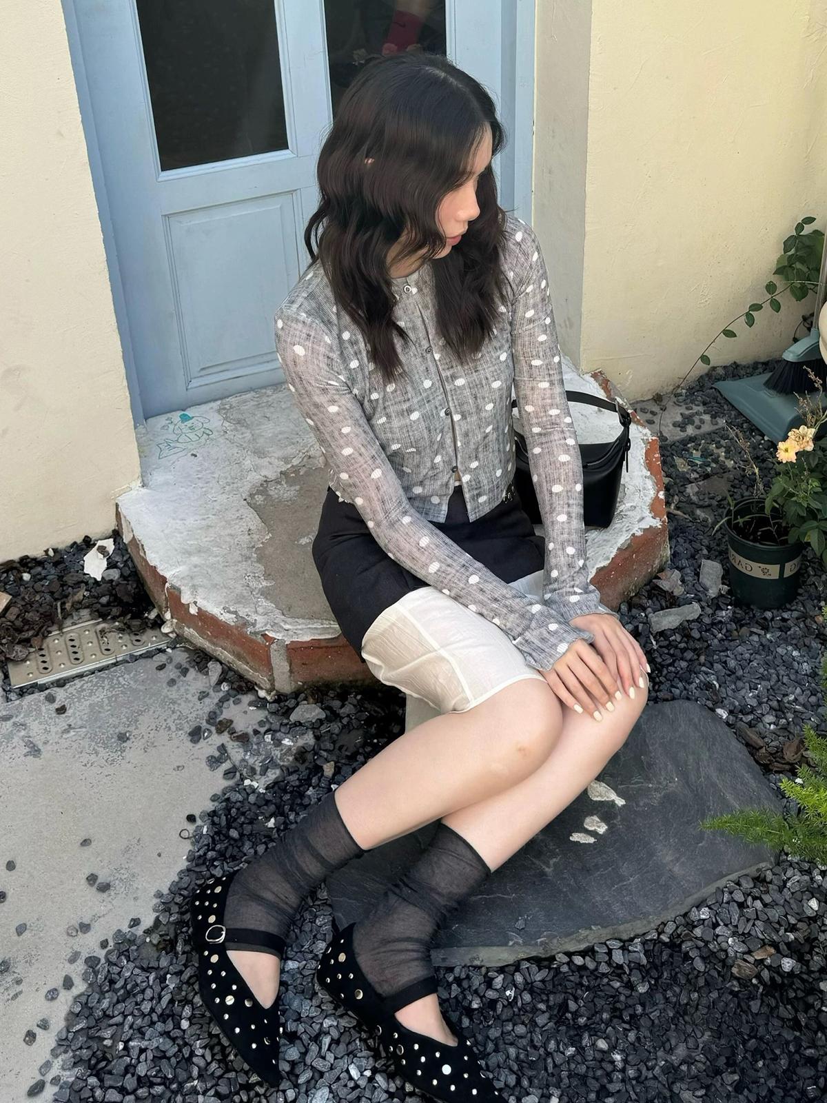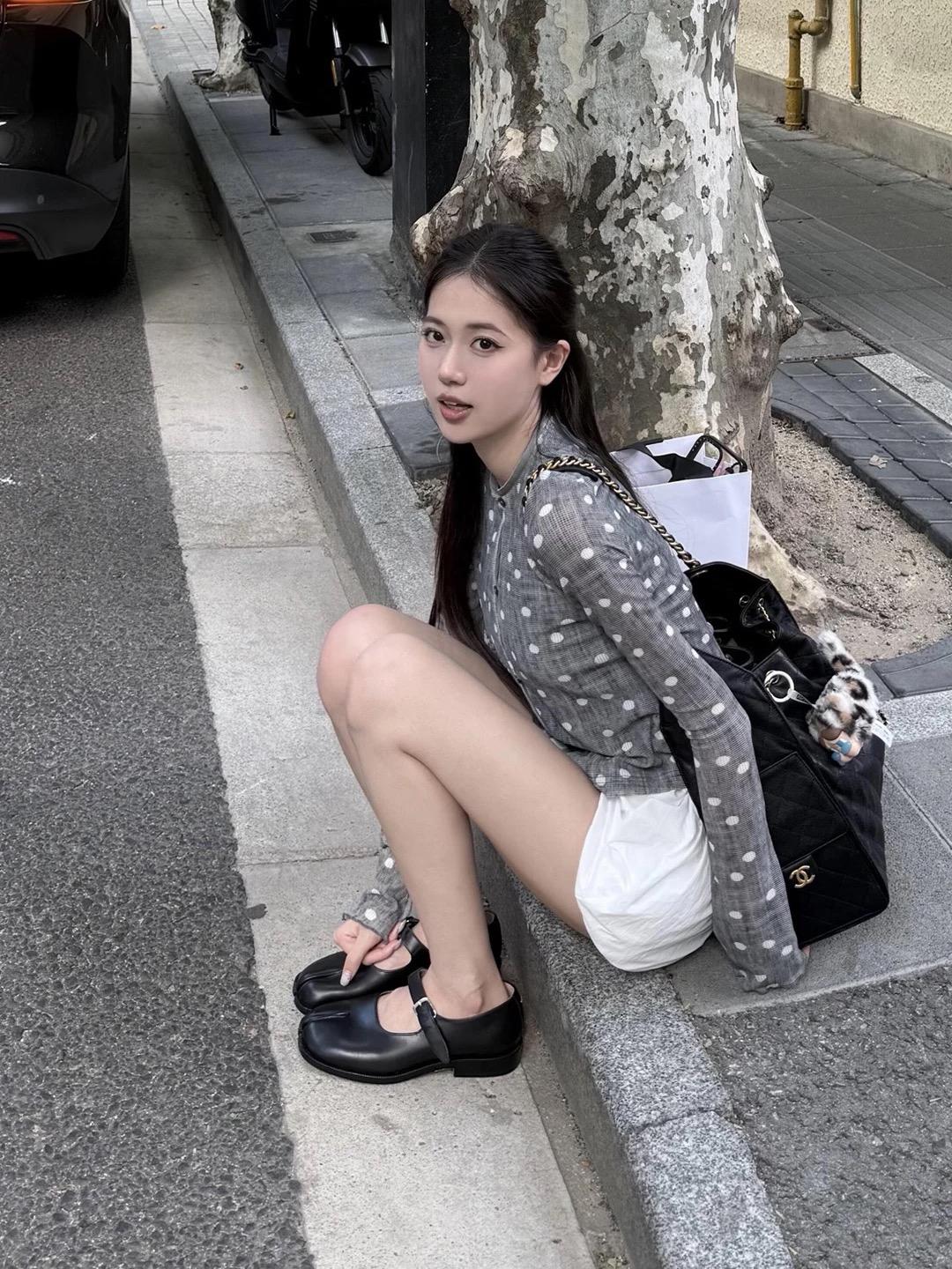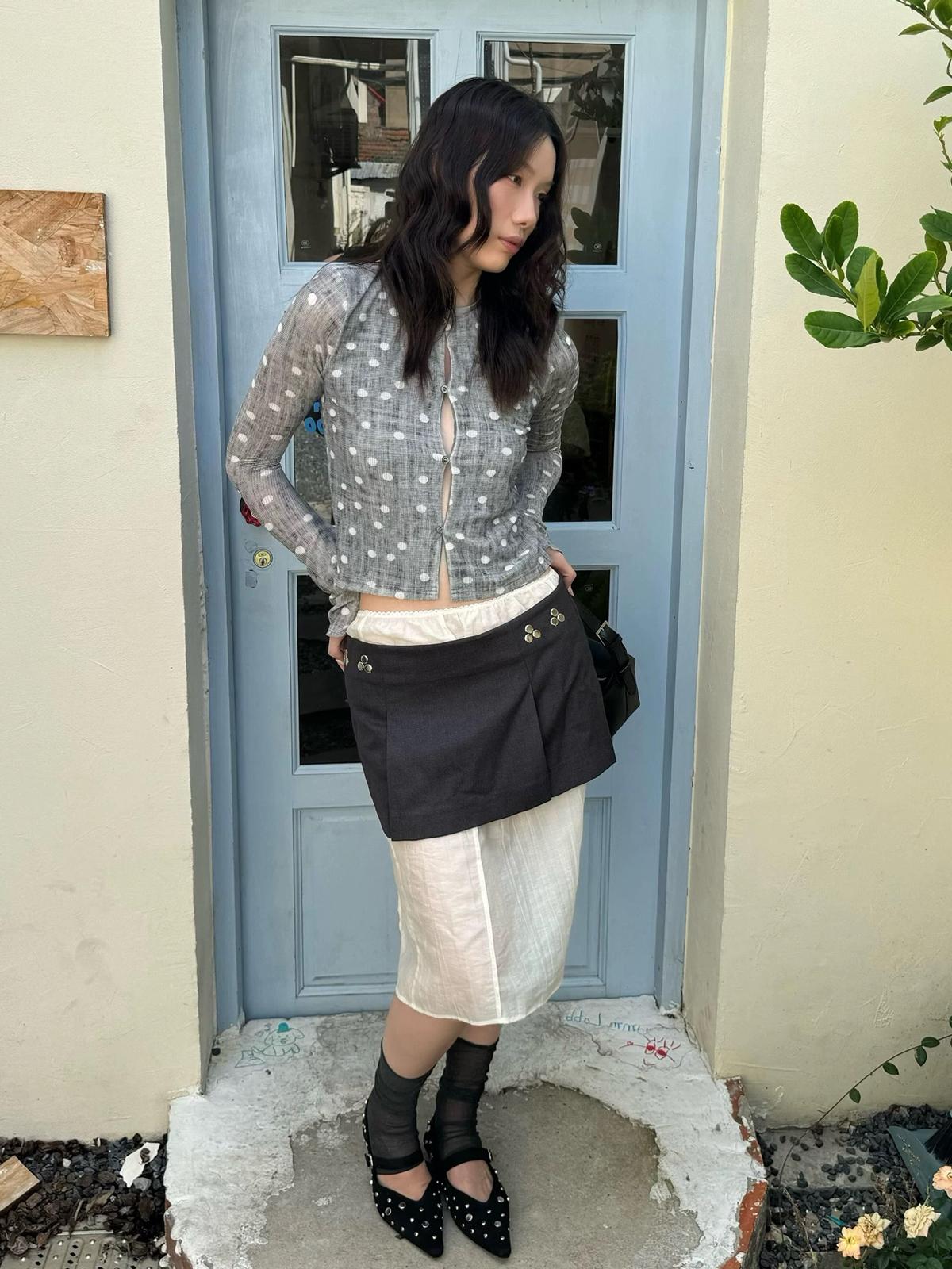 3. 【C7582】復古辣妹設計感短款露臍波點印花長袖修身收腰小衫