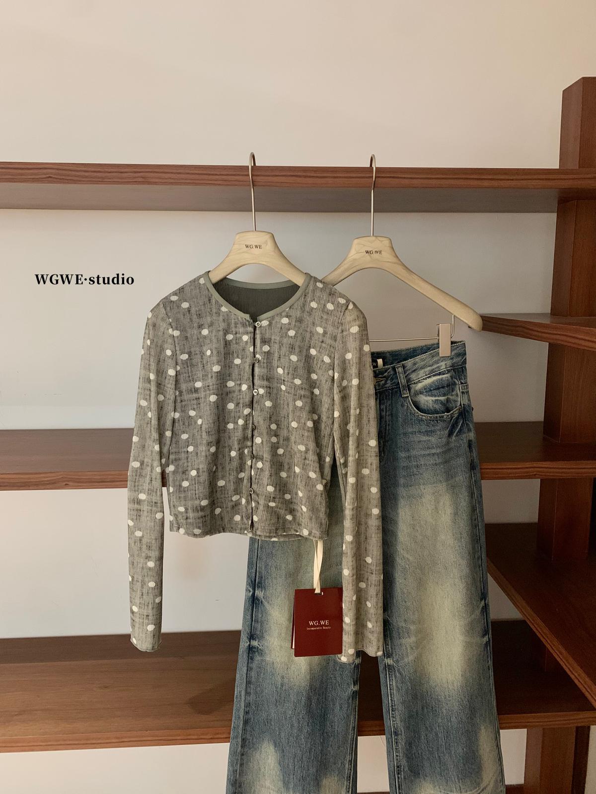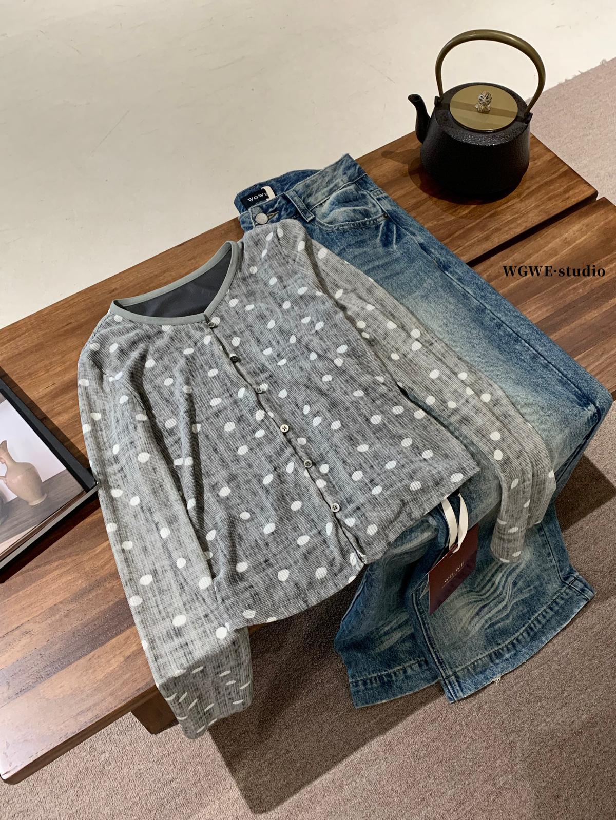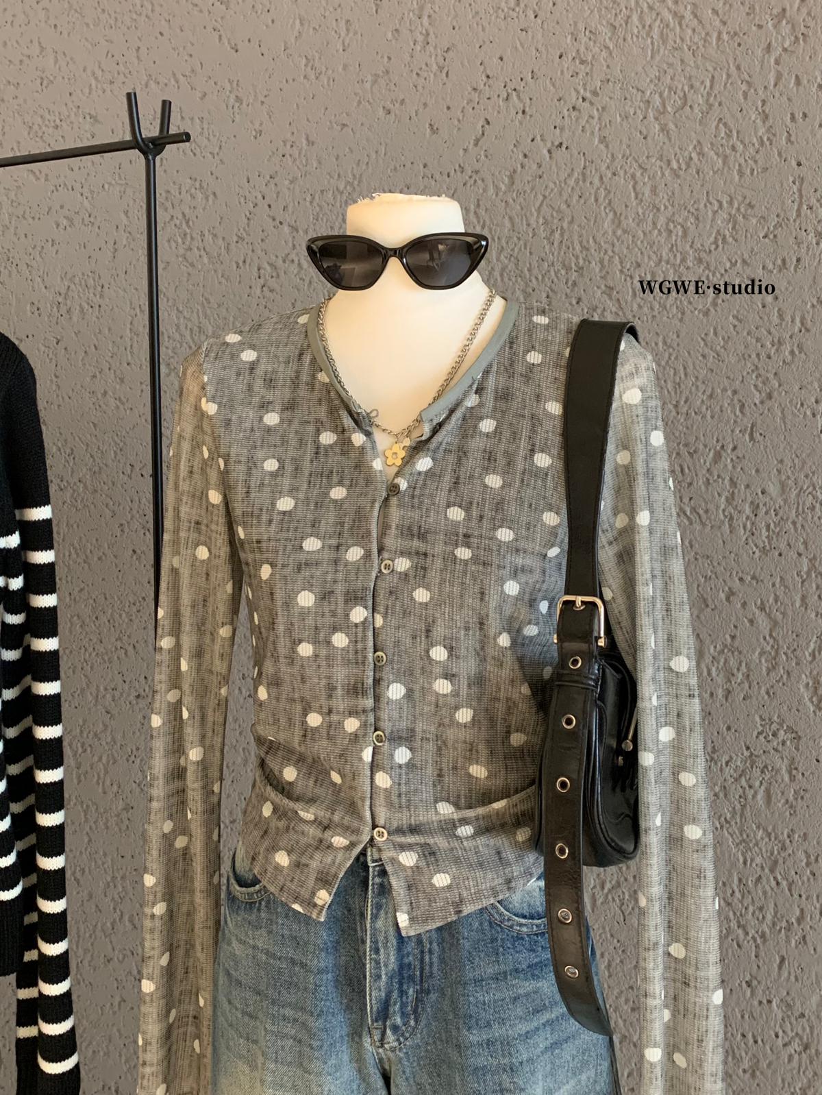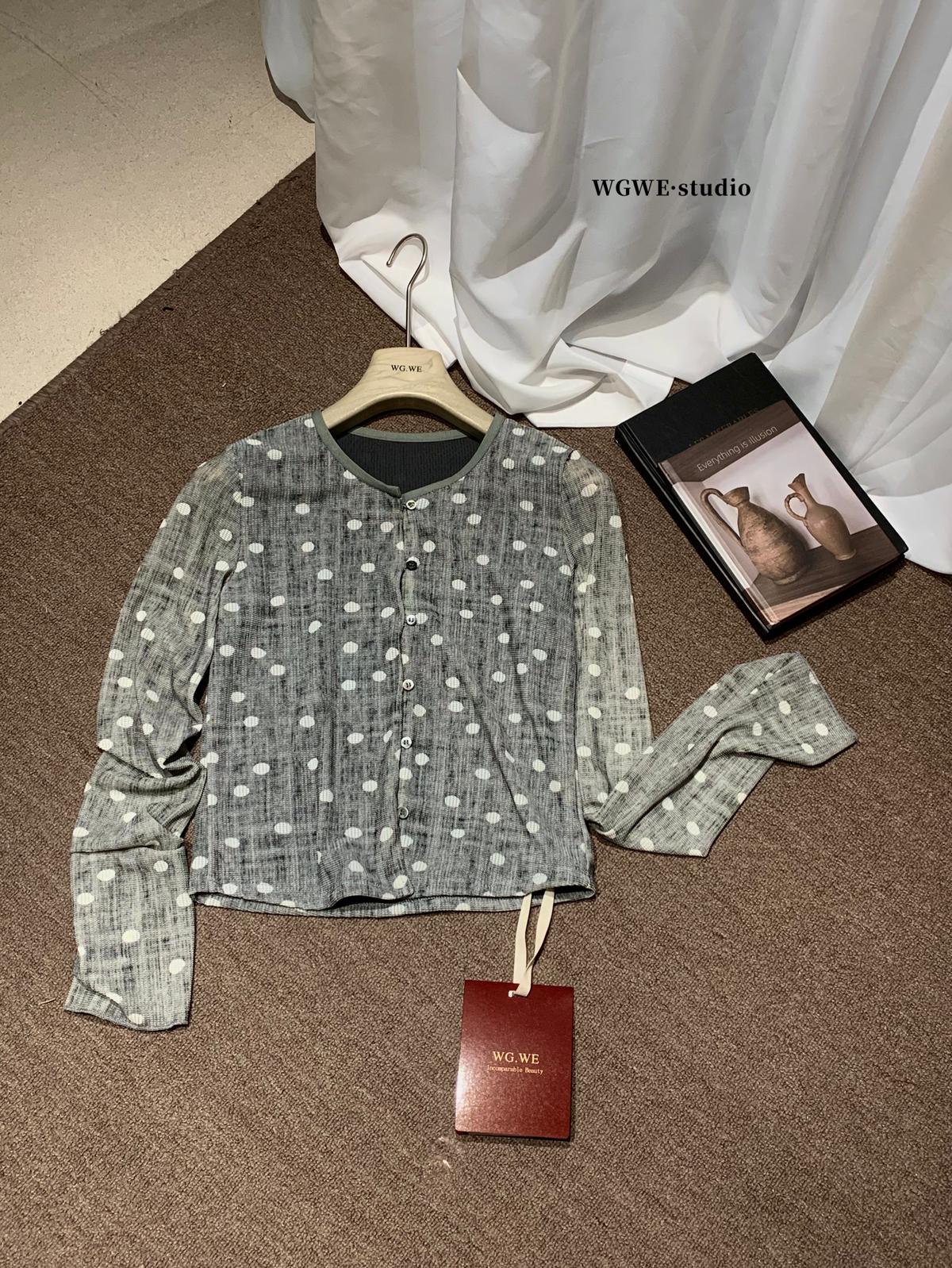 【C7582】復古辣妹設計感短款露臍波點印花長袖修身收腰小衫