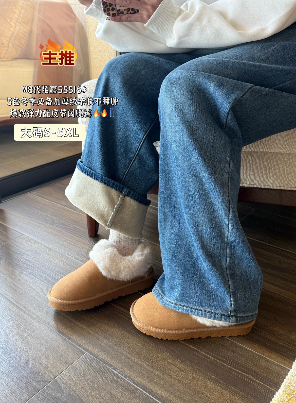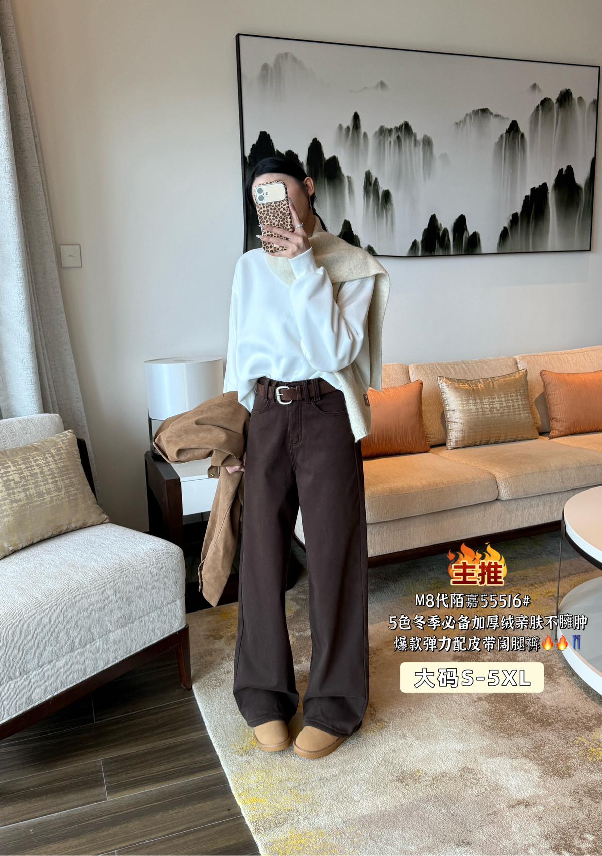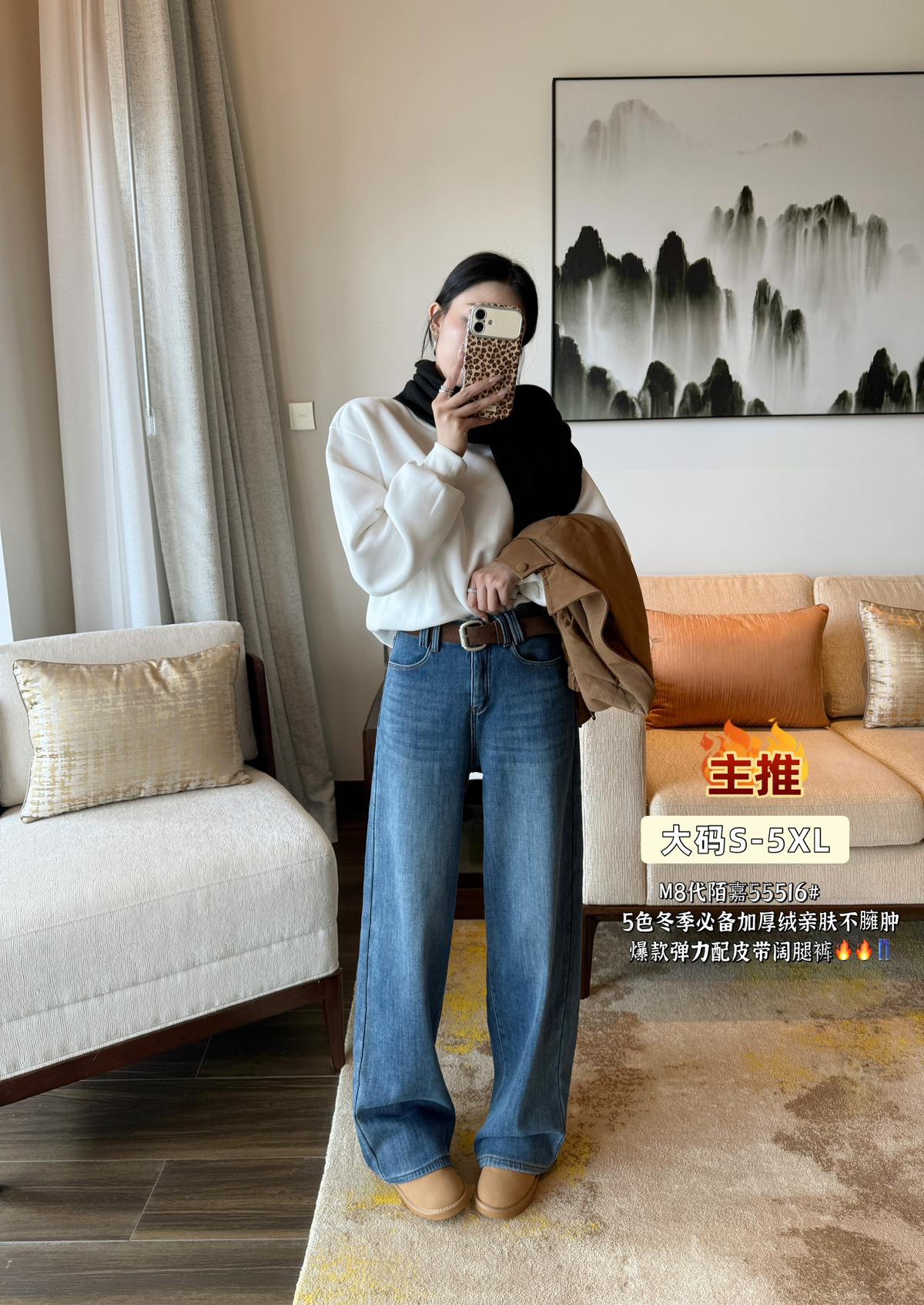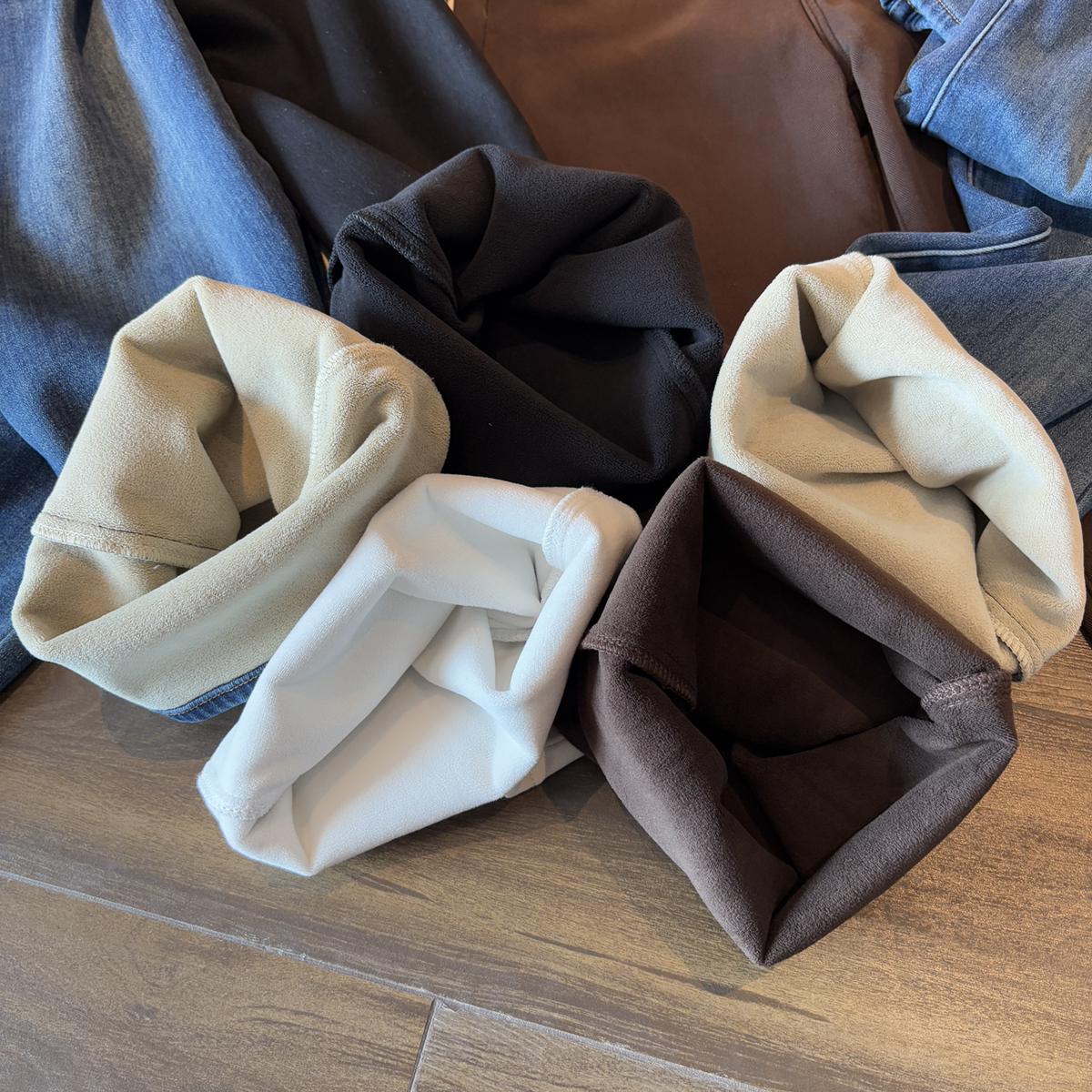 【C7614】冬季加厚保暖複合密密絨大碼簡約百搭五色彈力闊腿拖地褲牛仔褲(配腰帶)(大碼可穿200斤)