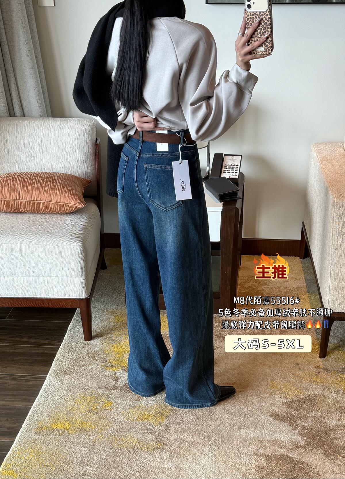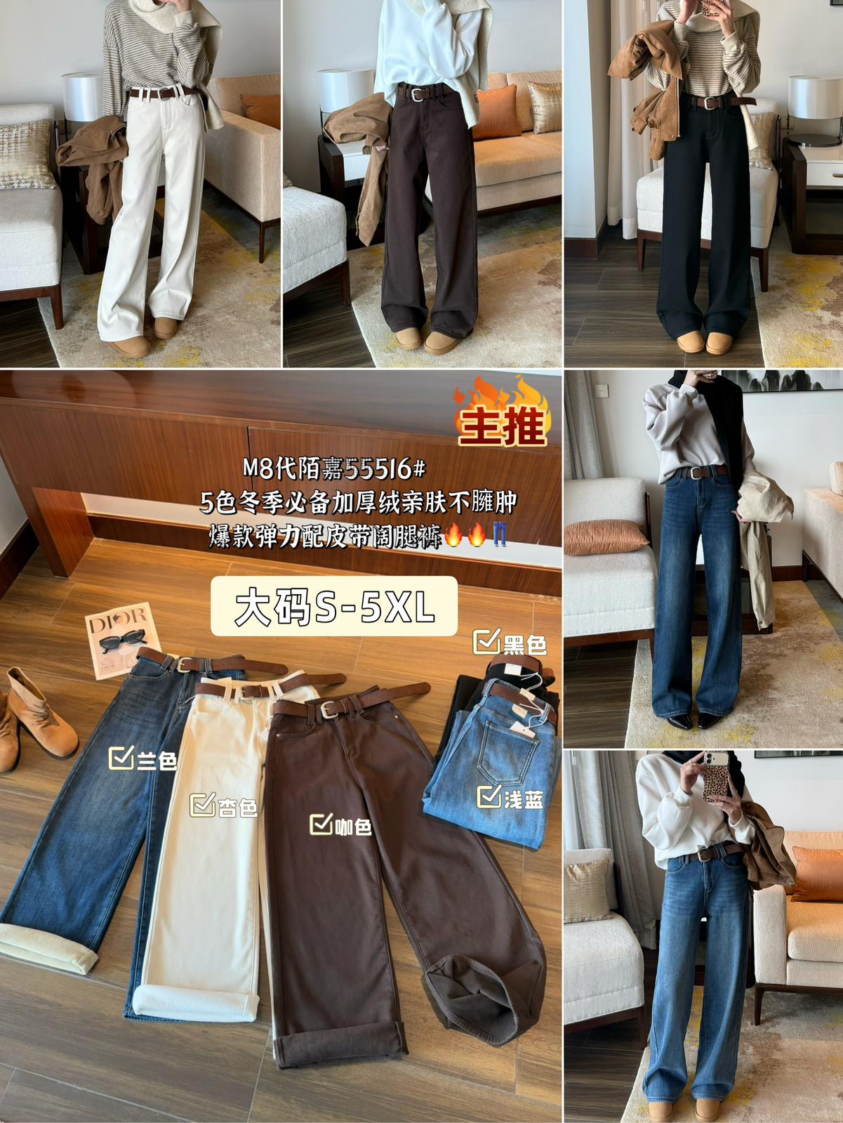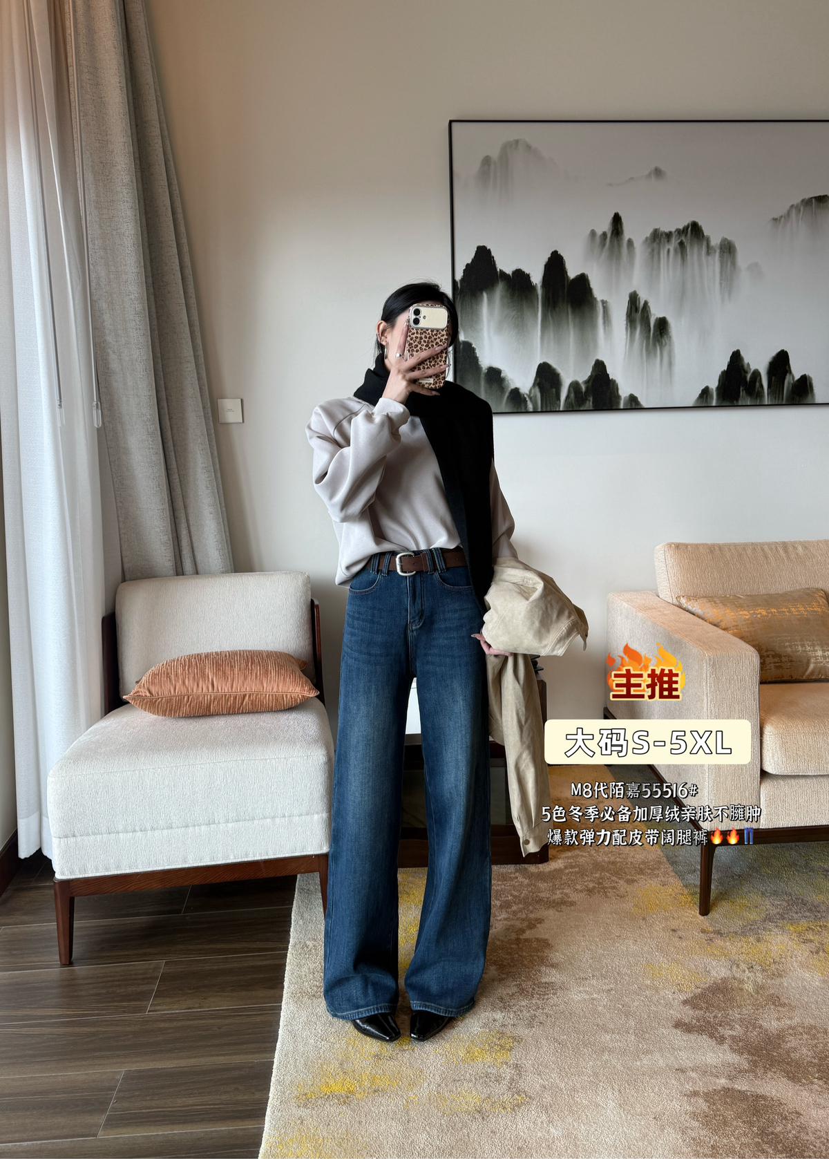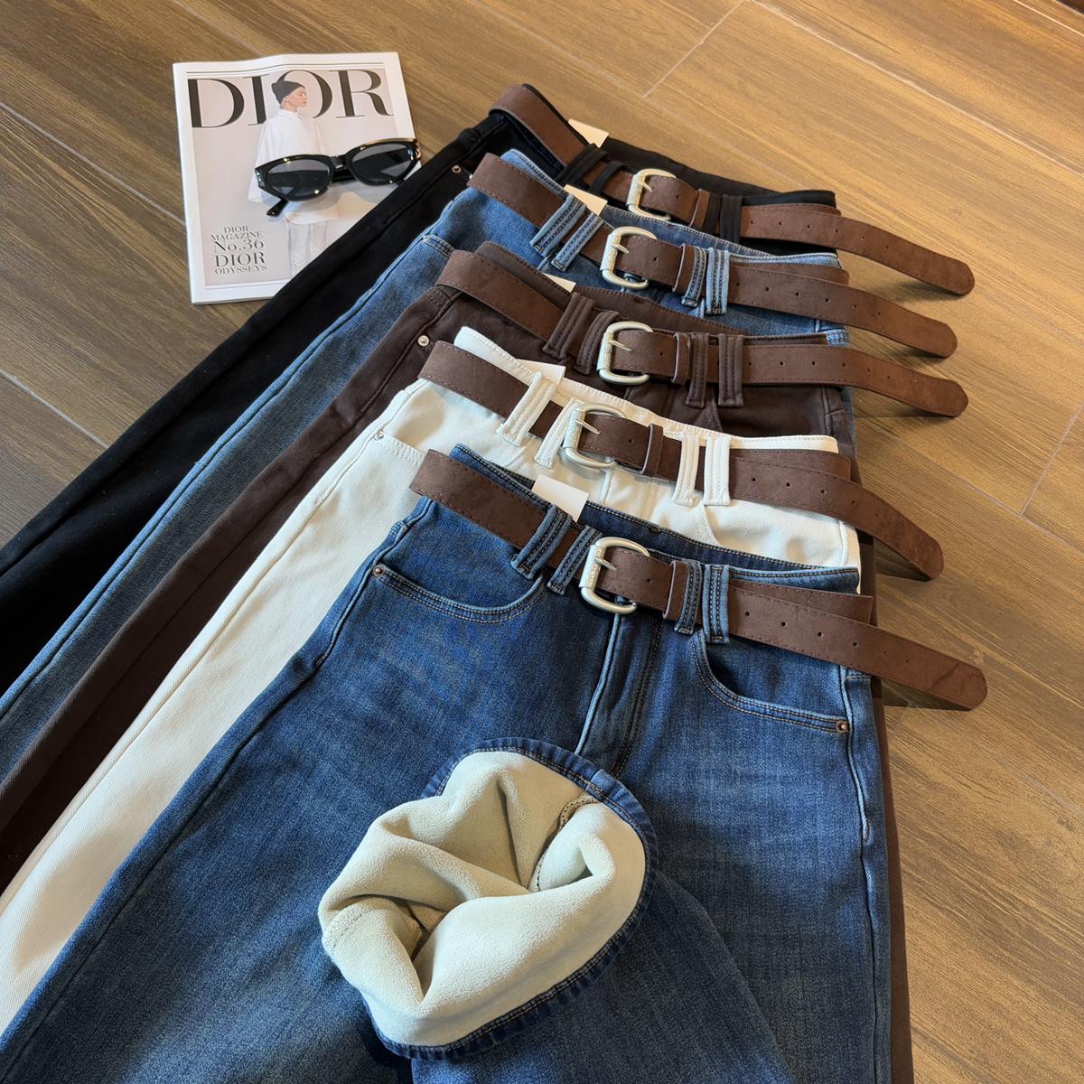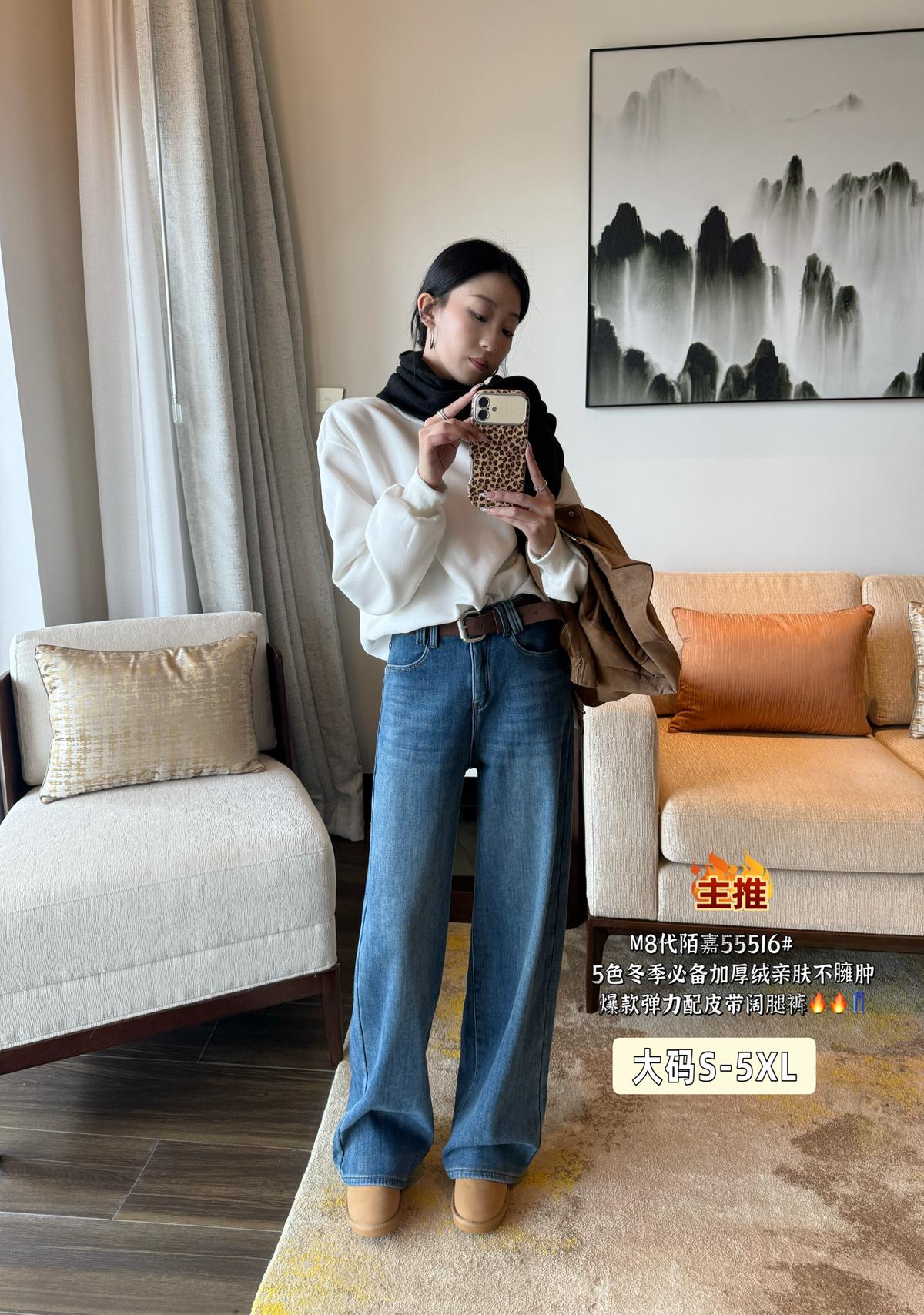 【C7614】冬季加厚保暖複合密密絨大碼簡約百搭五色彈力闊腿拖地褲牛仔褲(配腰帶)(大碼可穿200斤)