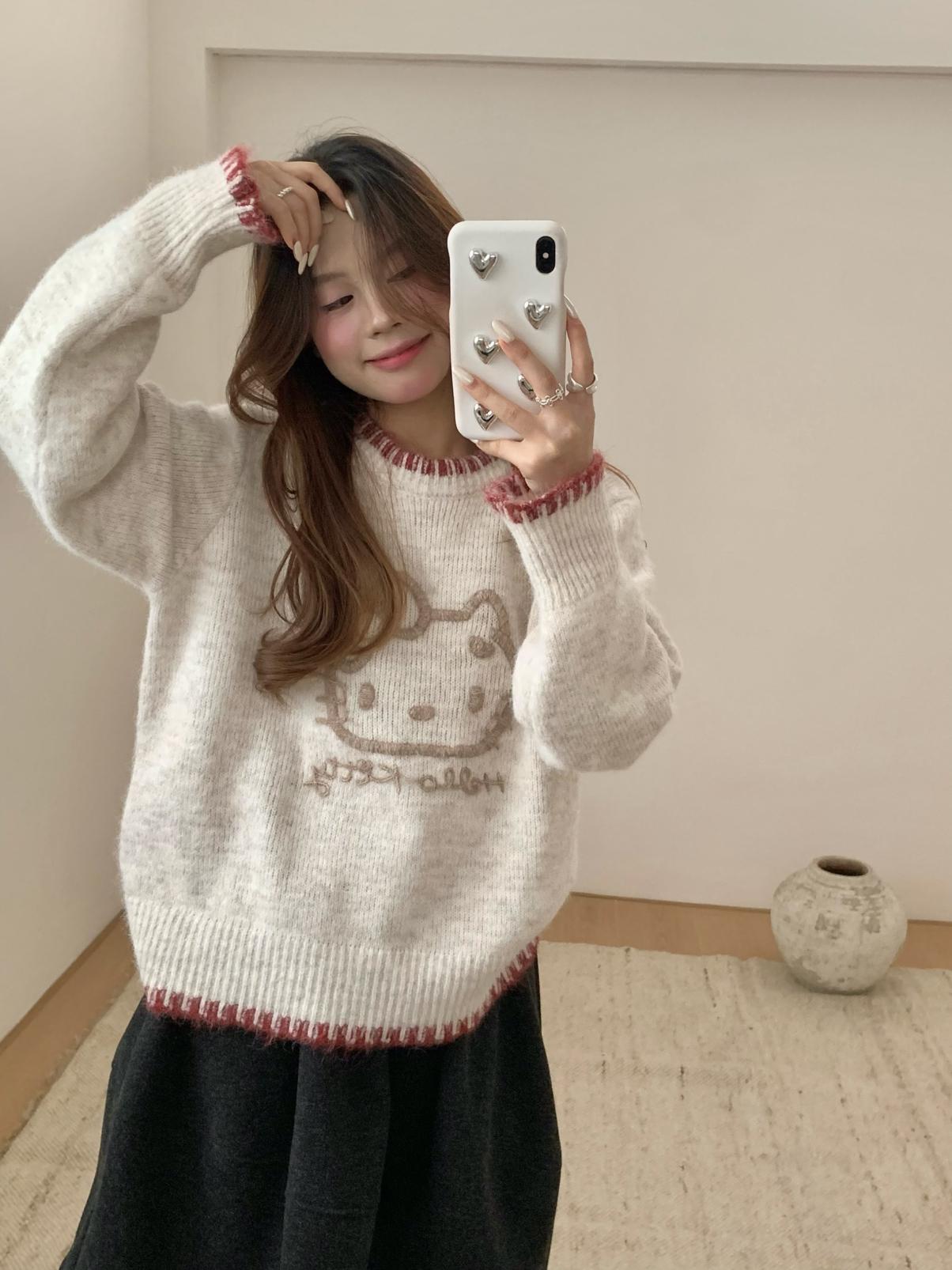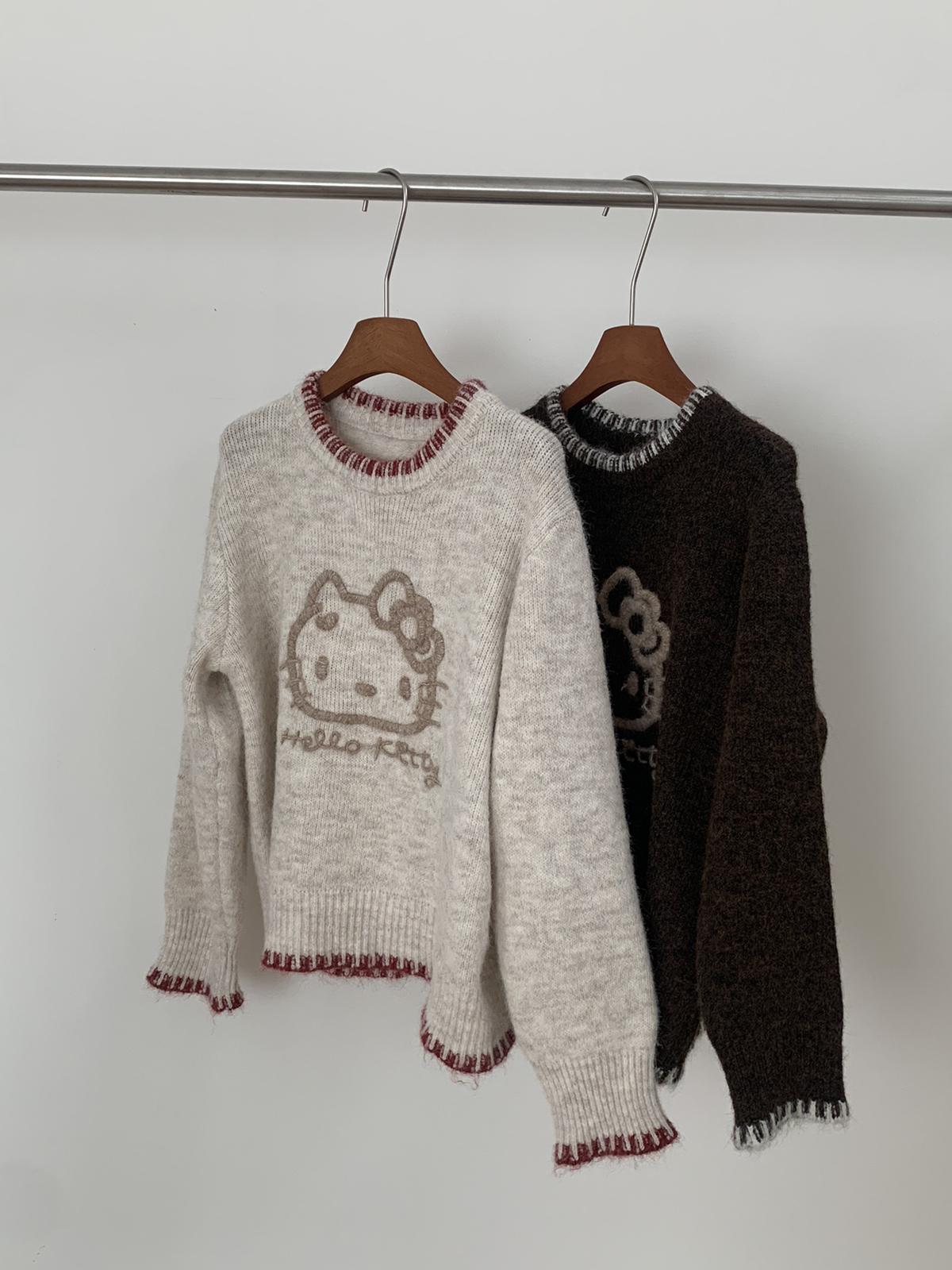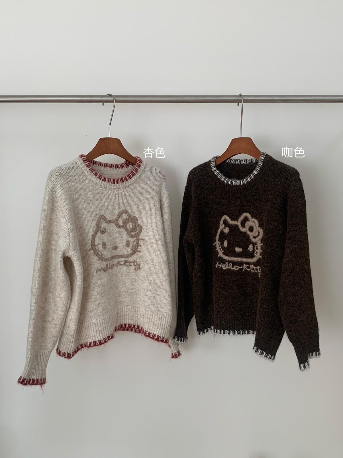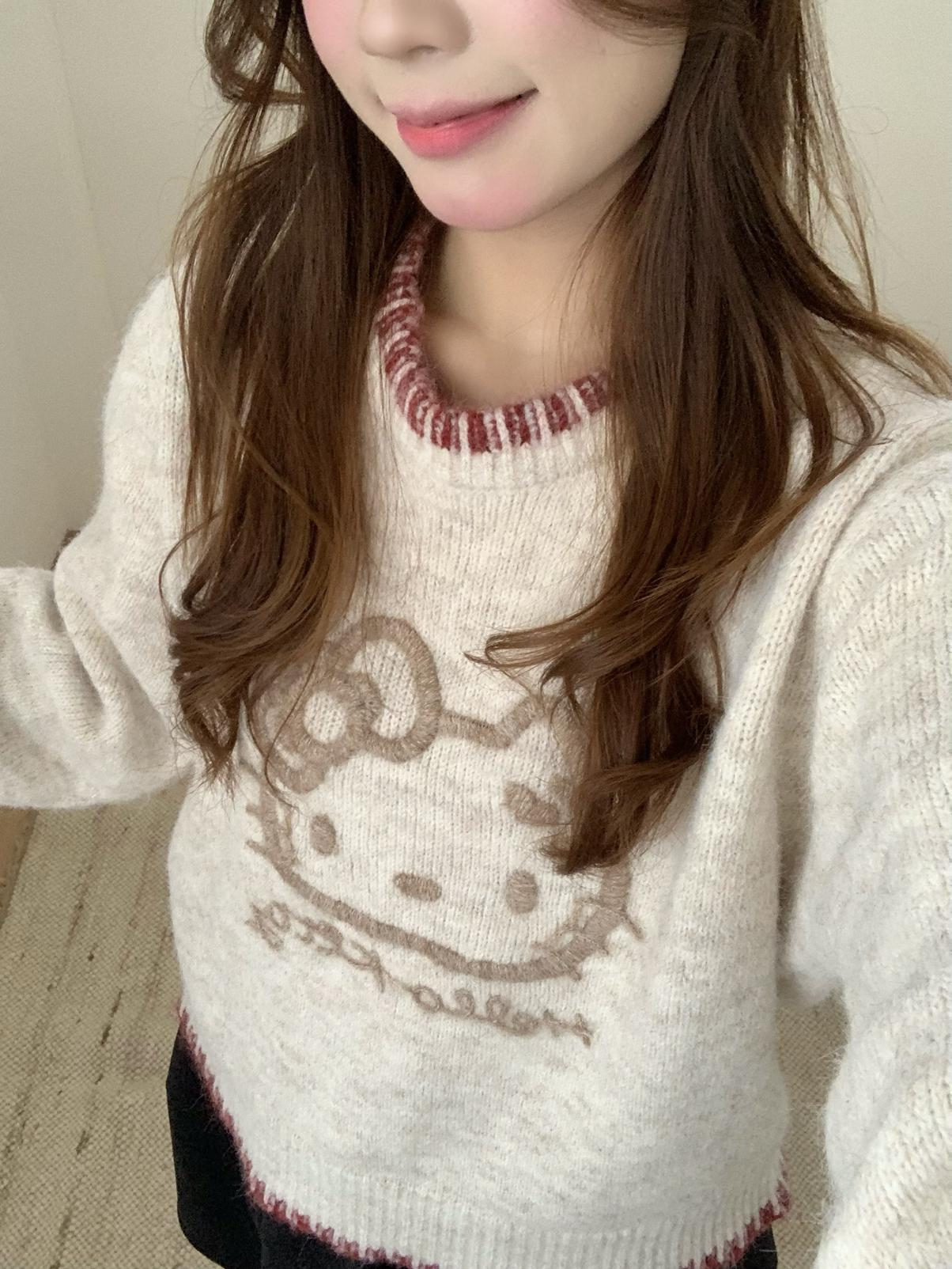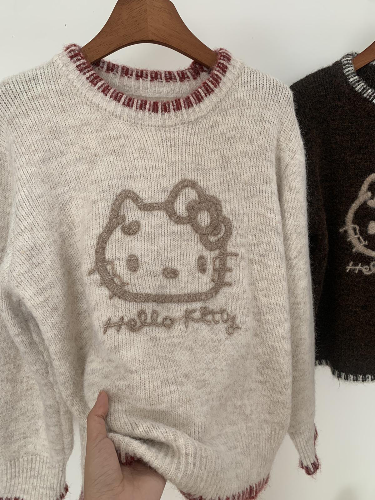 【C7655】可愛kitty貓圓領刺繡女冬季新款慵懶風寬鬆設計感保暖毛衣