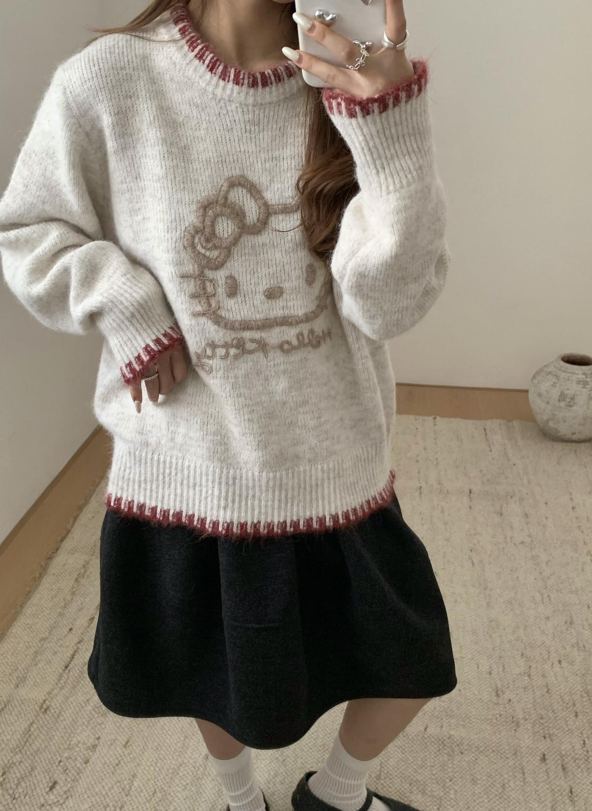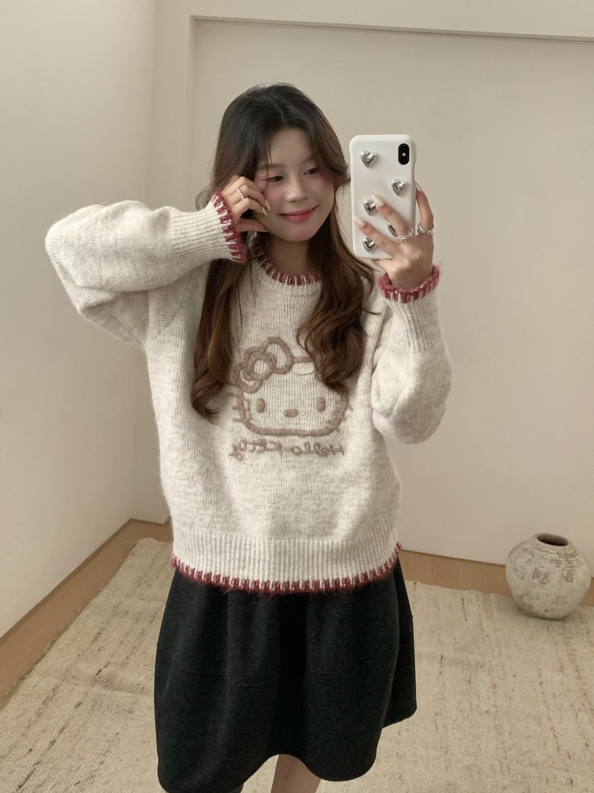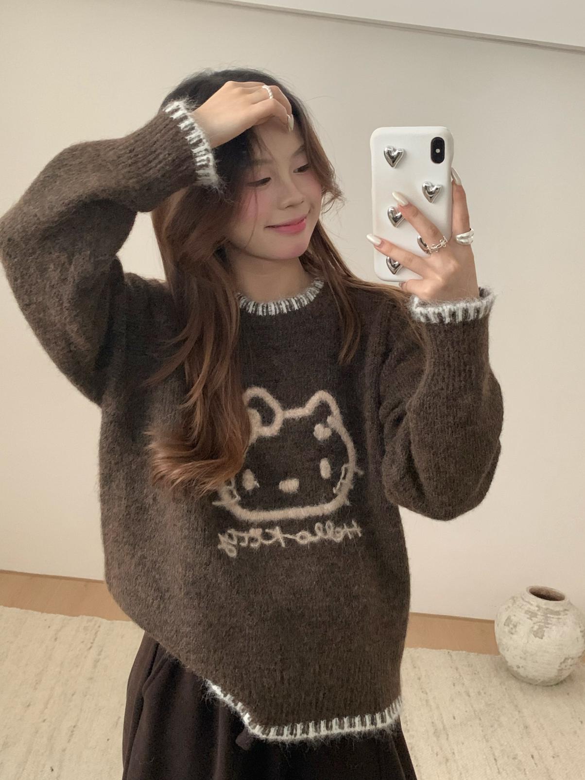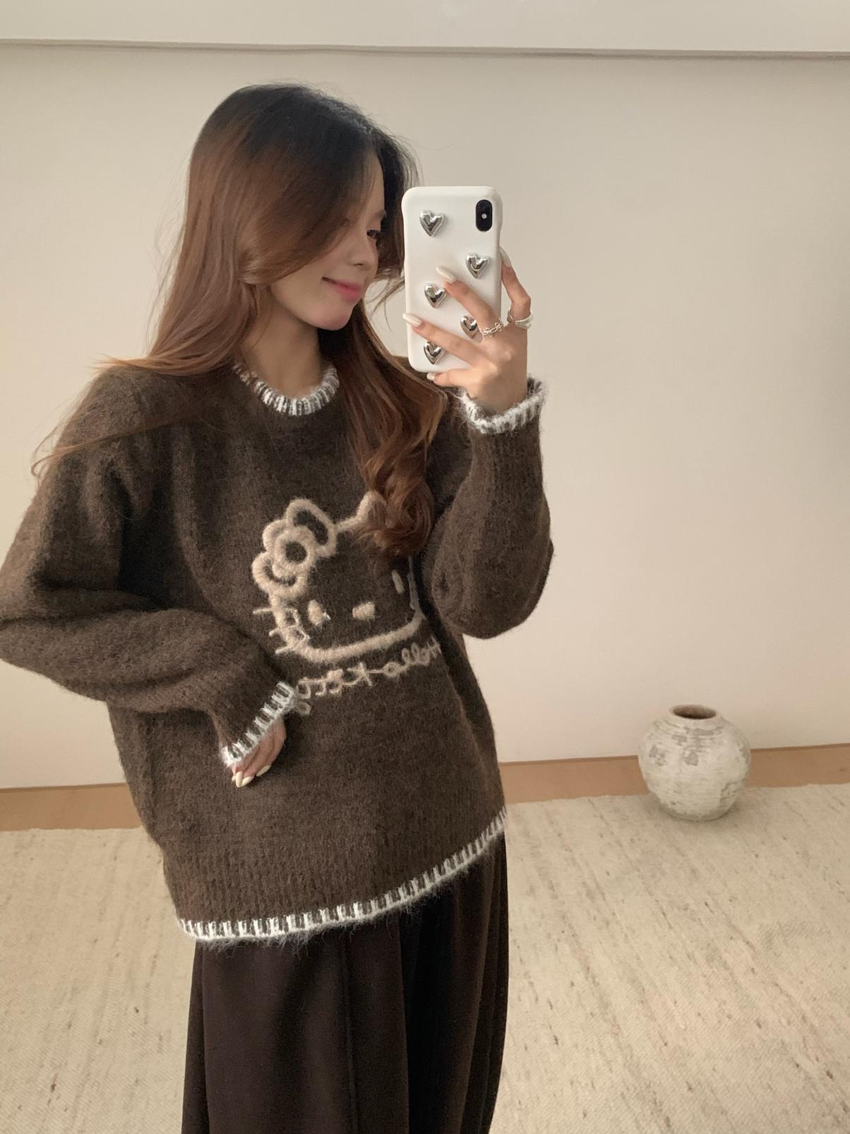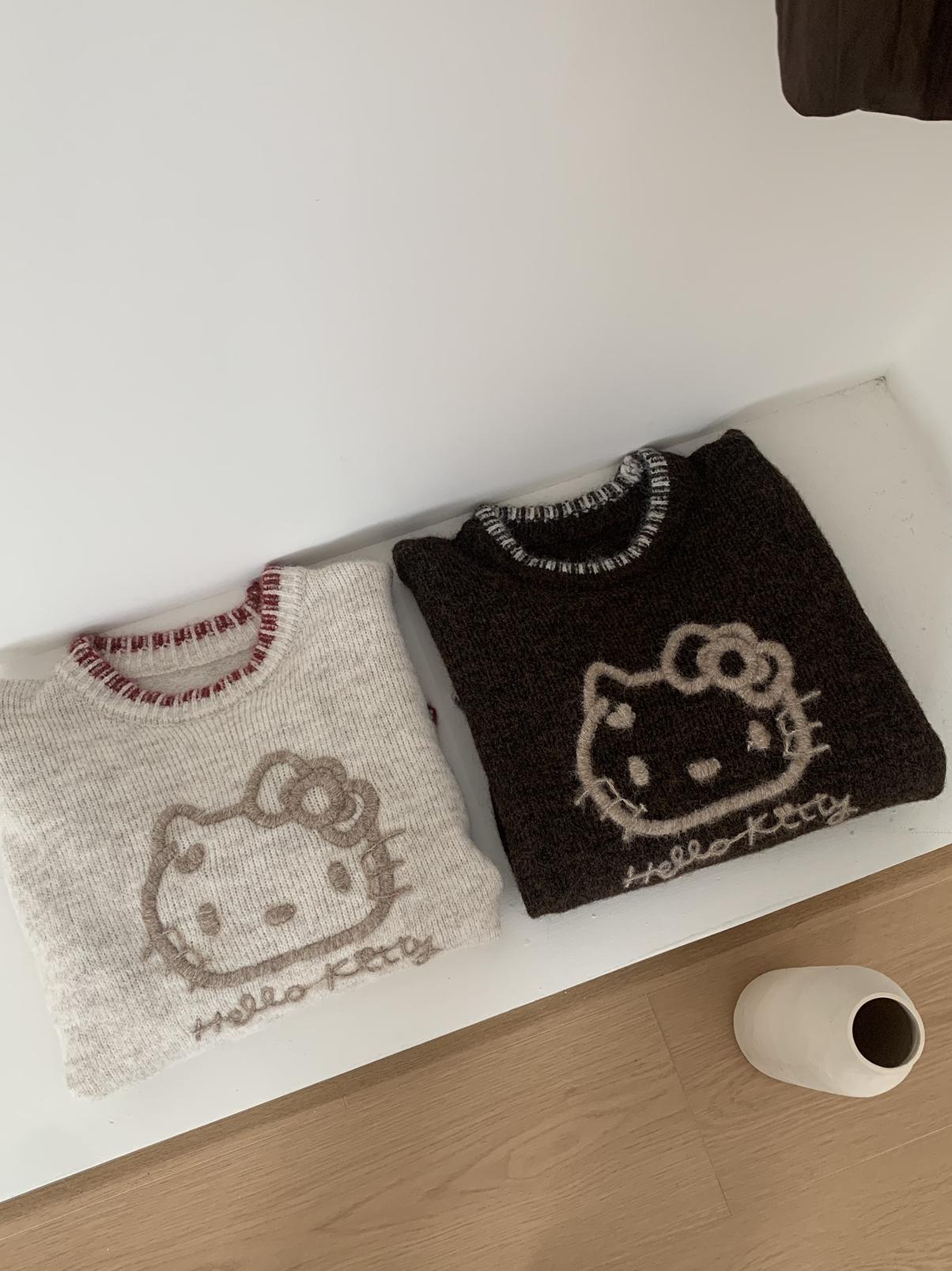 【C7655】可愛kitty貓圓領刺繡女冬季新款慵懶風寬鬆設計感保暖毛衣