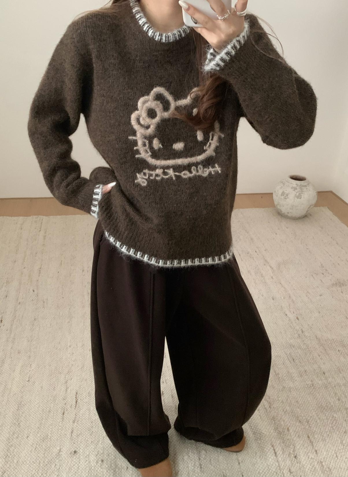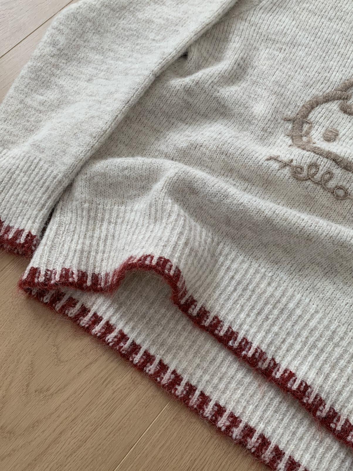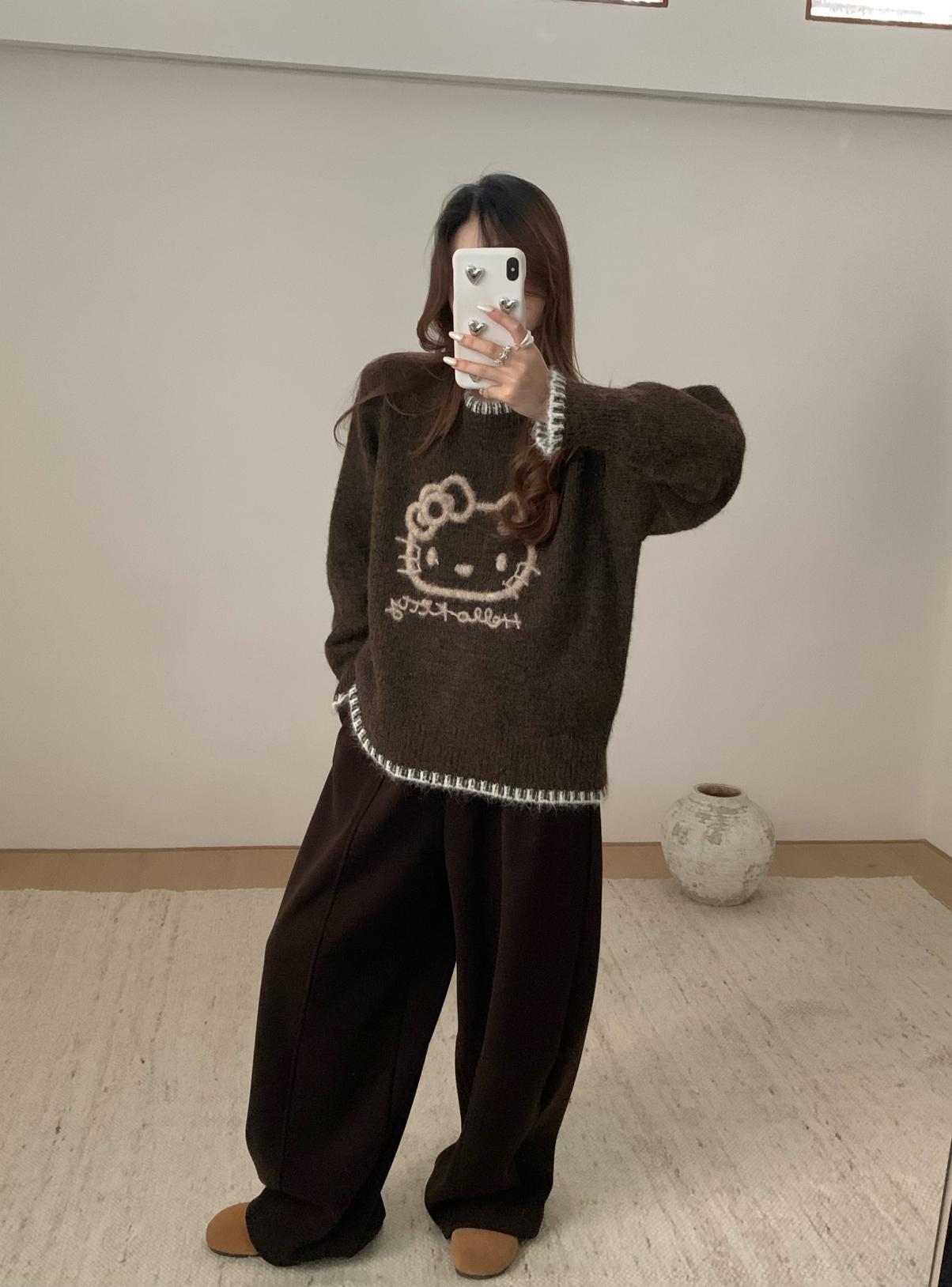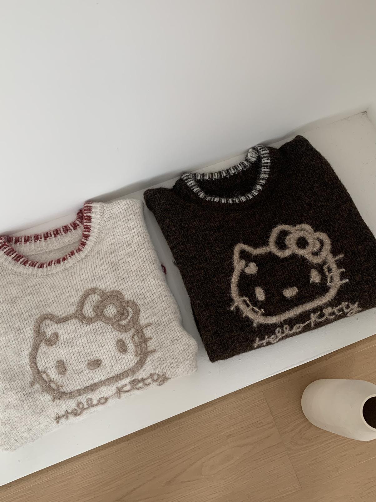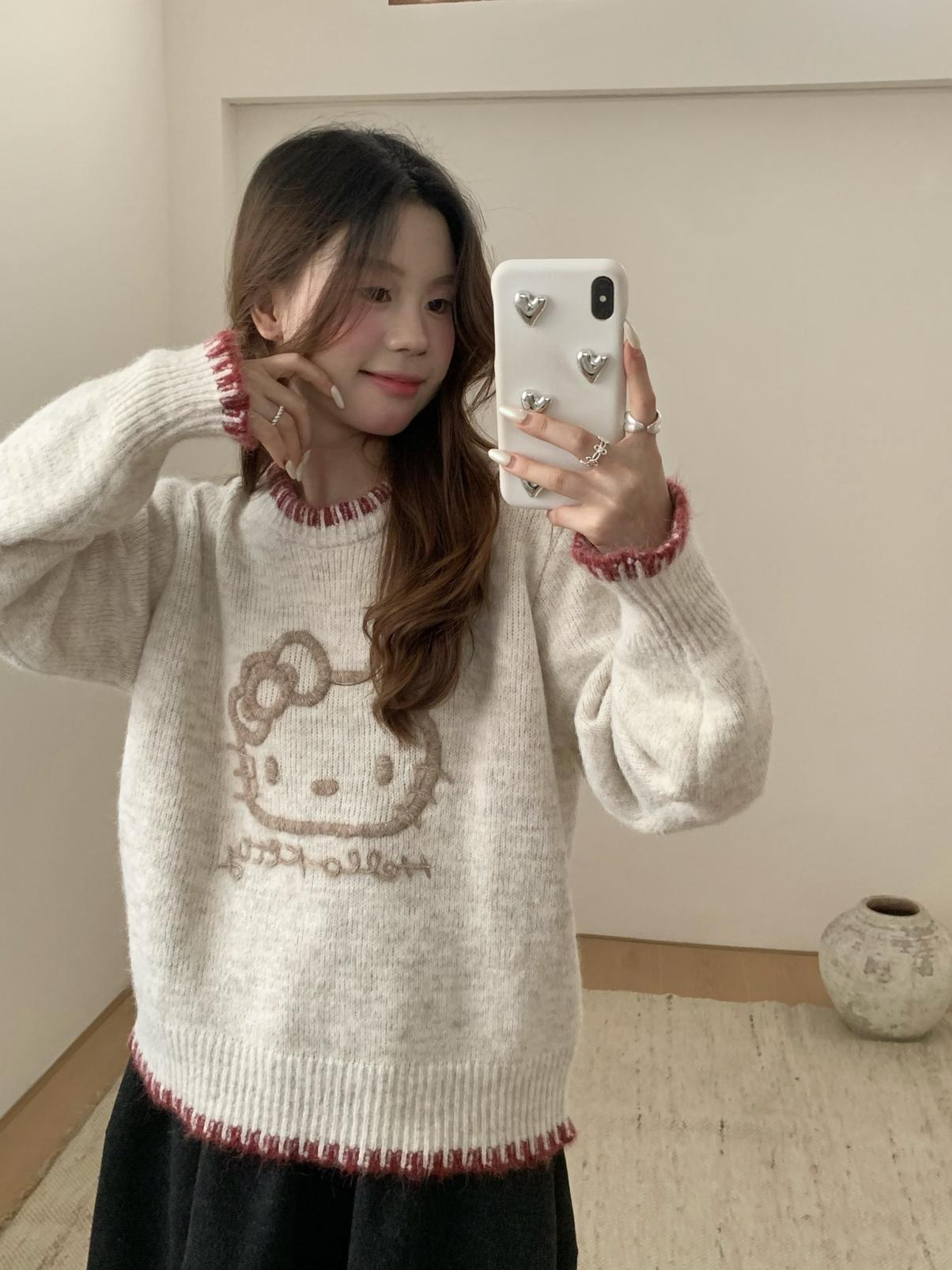 【C7655】可愛kitty貓圓領刺繡女冬季新款慵懶風寬鬆設計感保暖毛衣