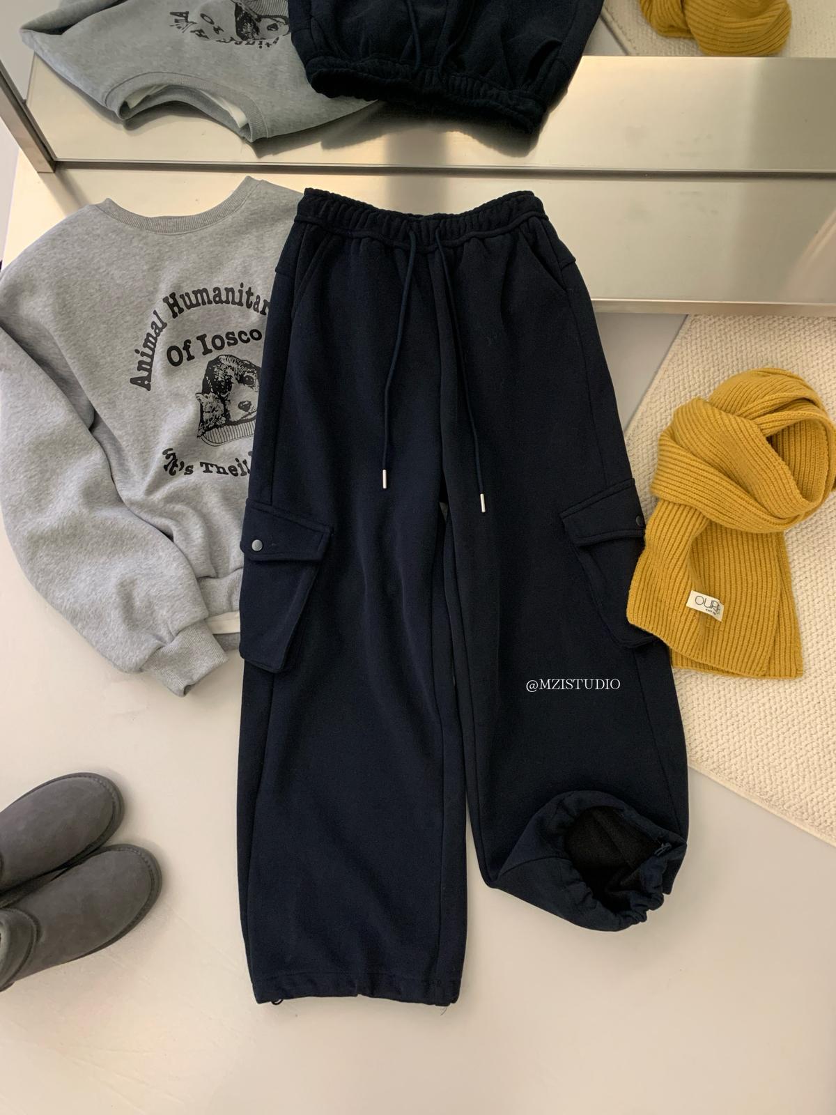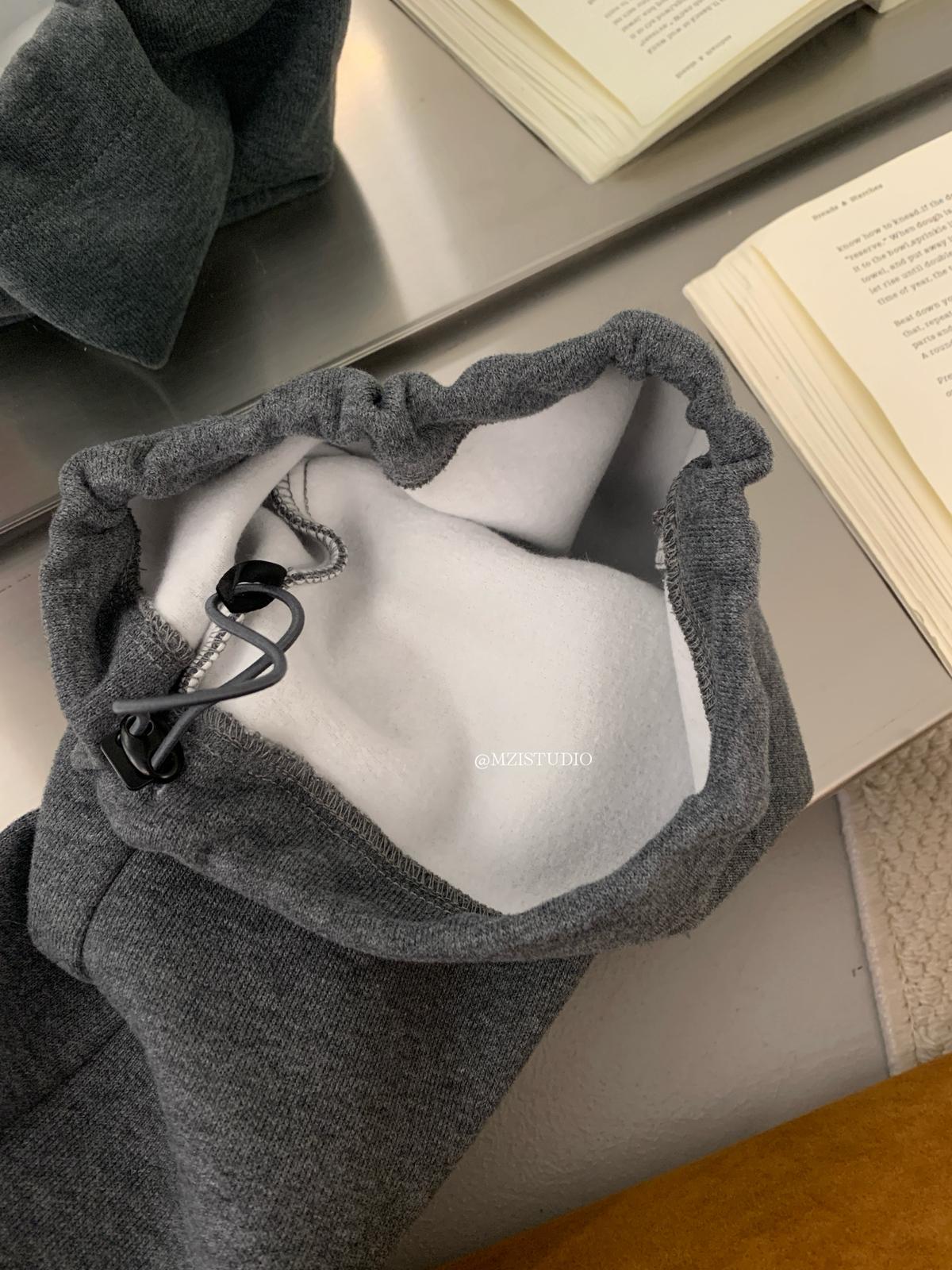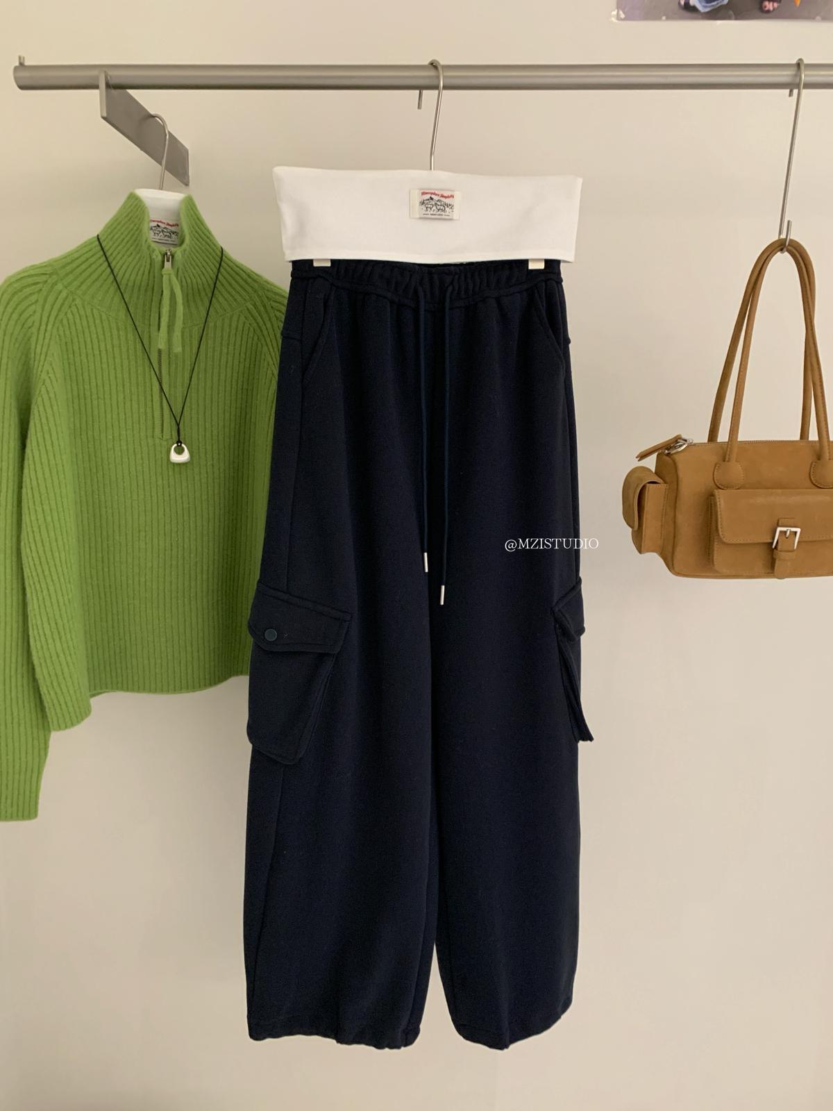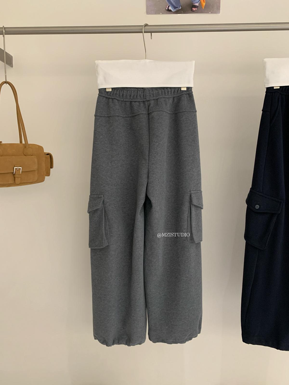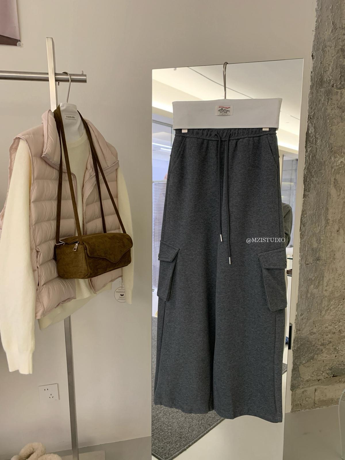 【C7682】冬日鬆弛答案韓系加絨大口袋抽繩高腰隨性寬鬆工裝闊腿休閒褲