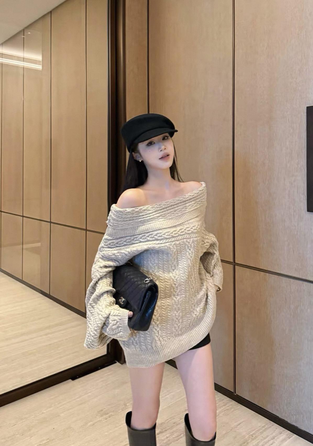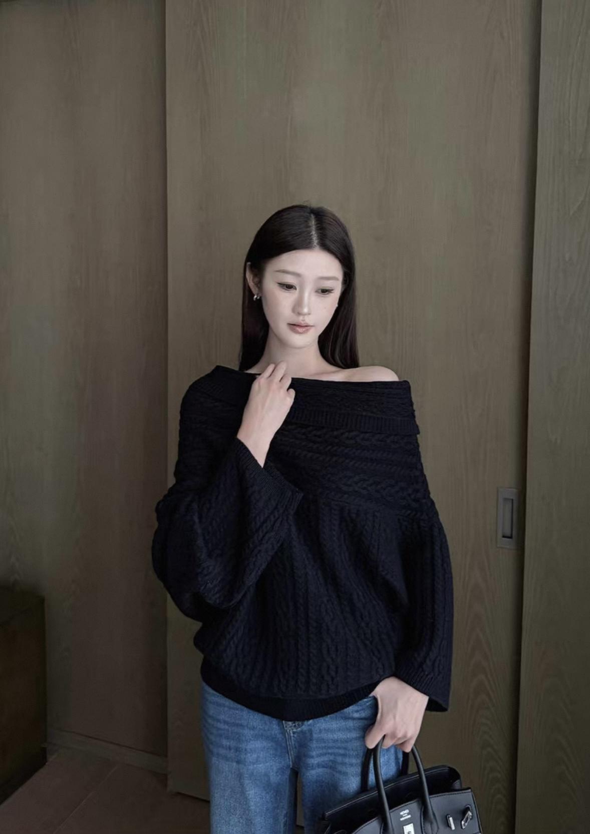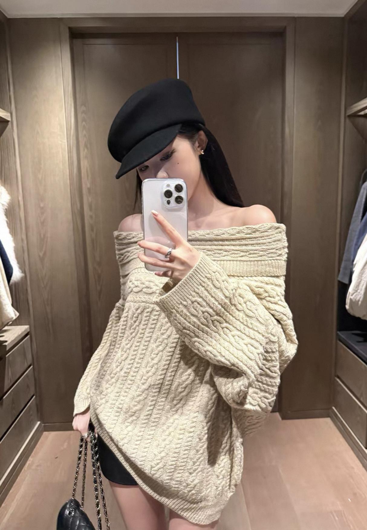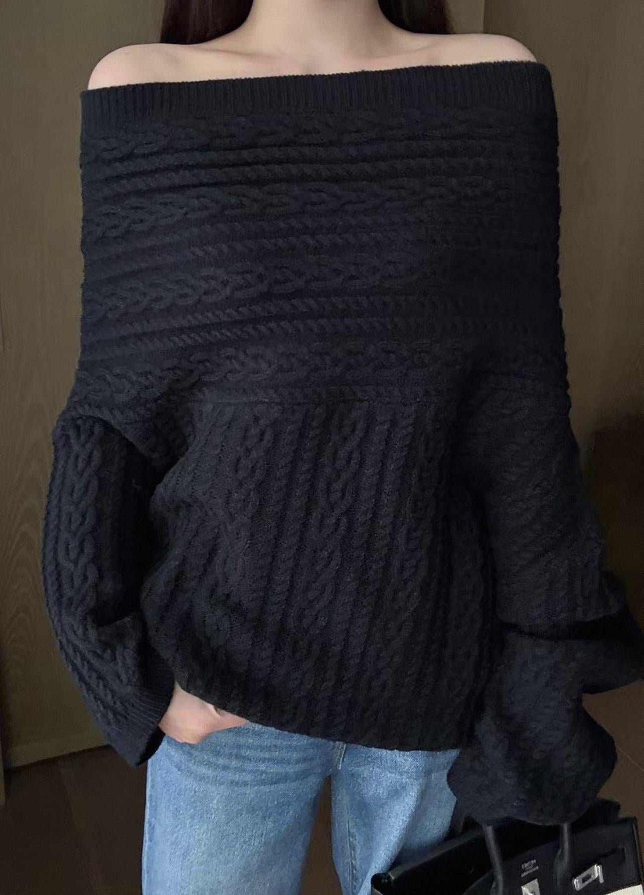 【C7668】洋氣百搭純色慵懶鬆弛一字領露肩提花肌理感寬鬆加厚長袖針織保暖毛衣