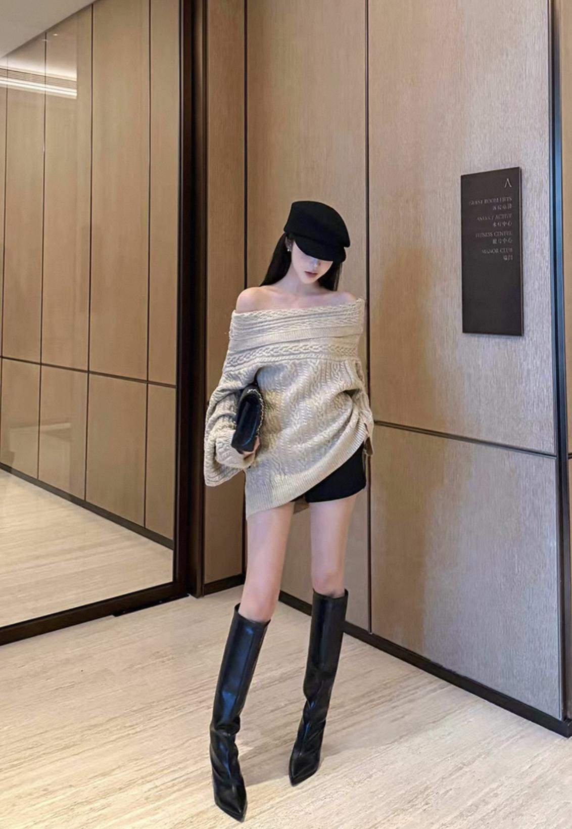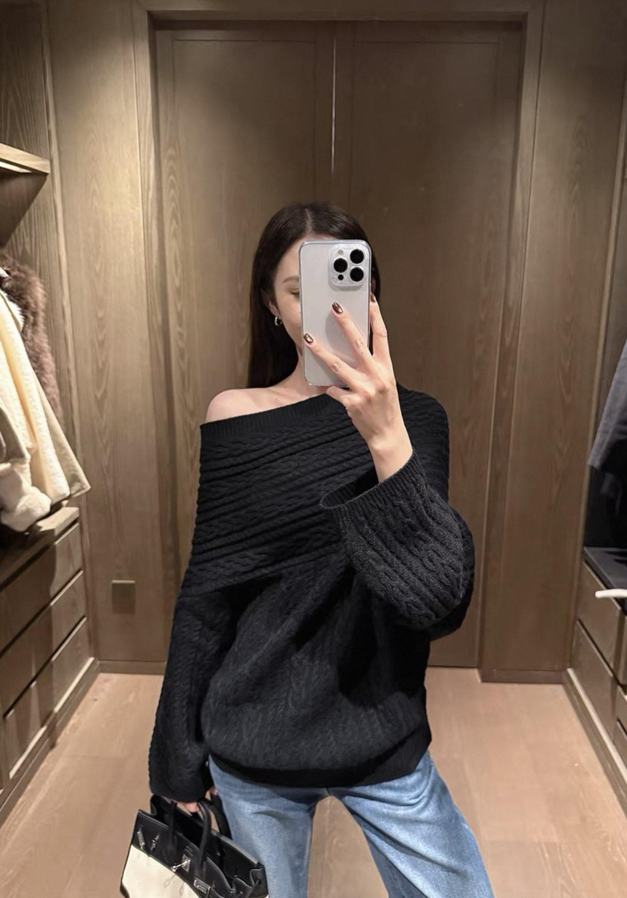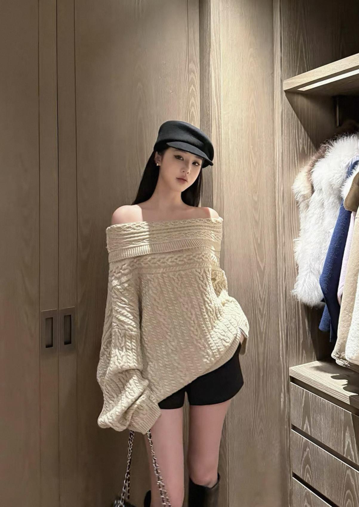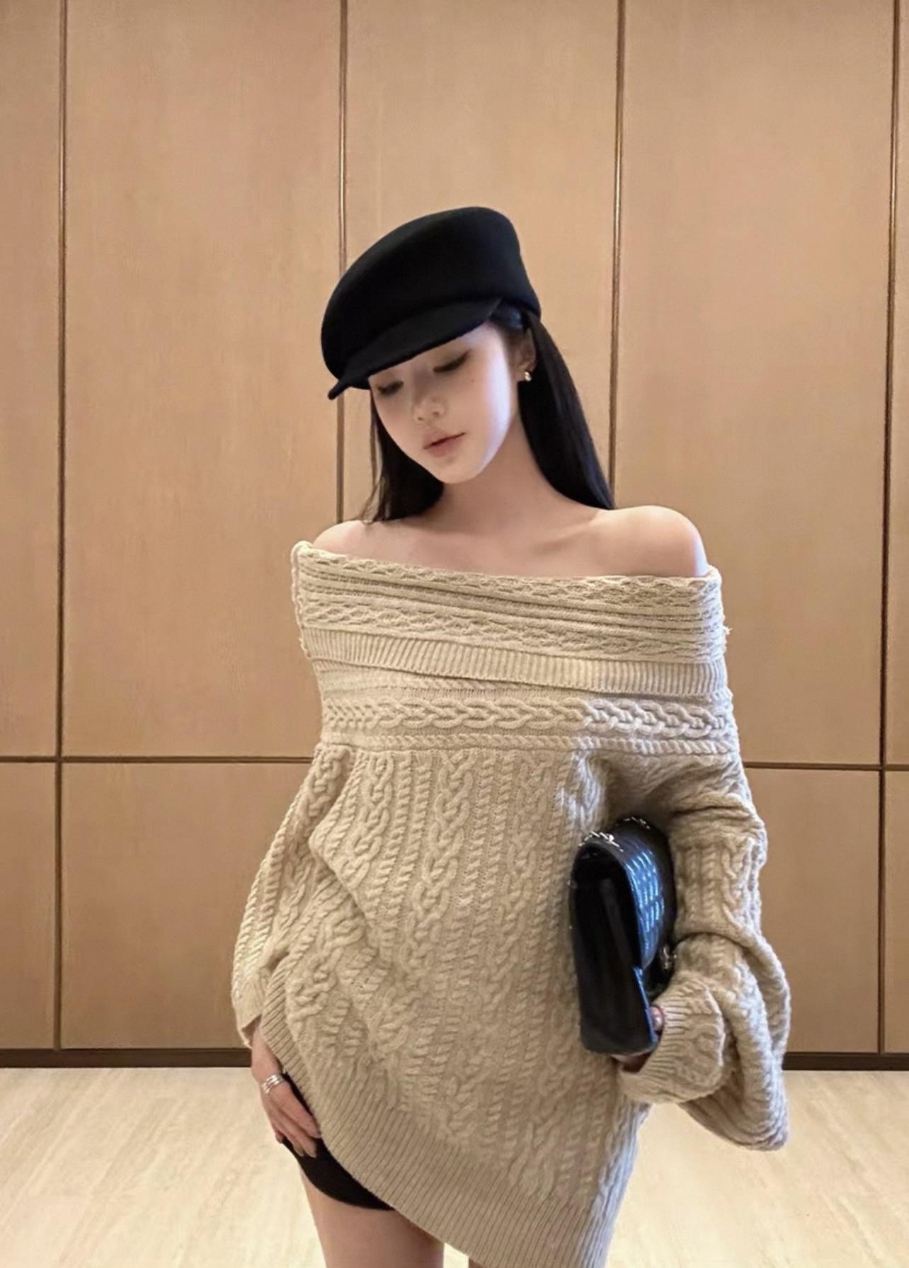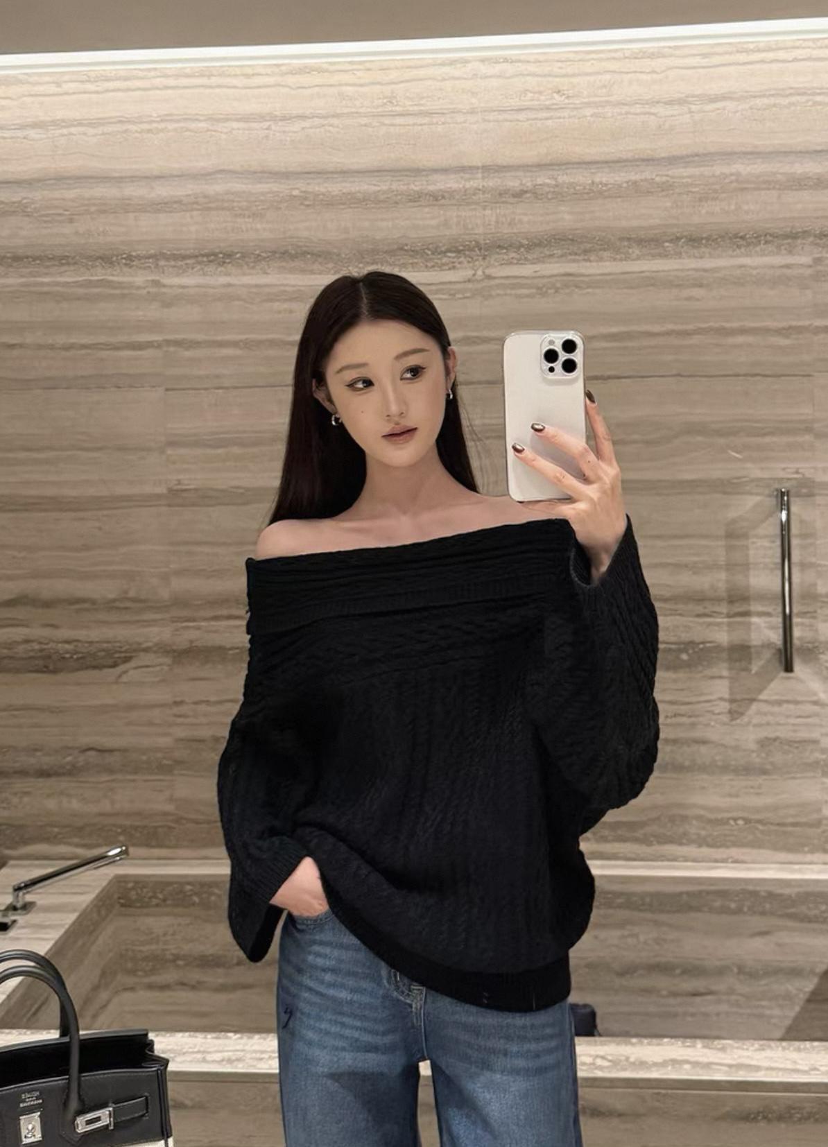 【C7668】洋氣百搭純色慵懶鬆弛一字領露肩提花肌理感寬鬆加厚長袖針織保暖毛衣