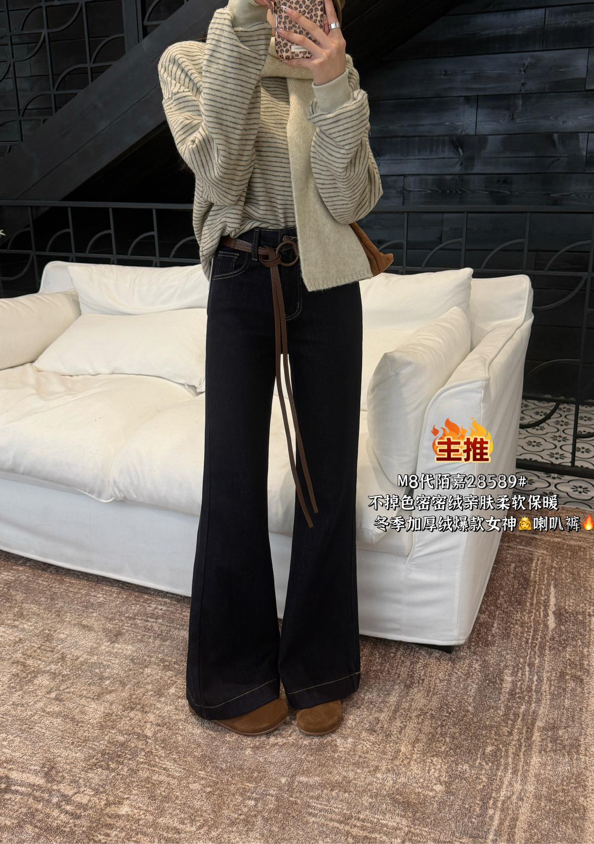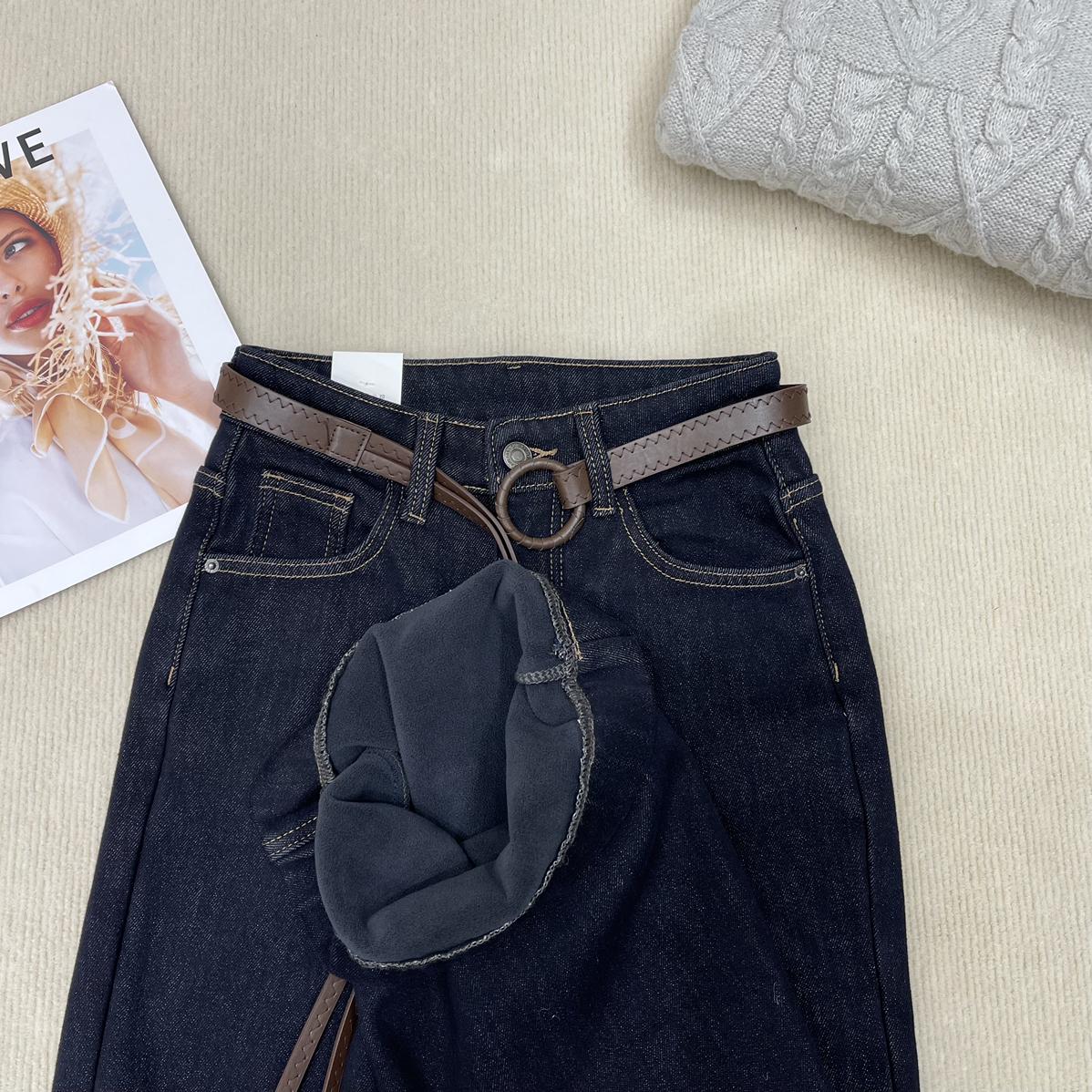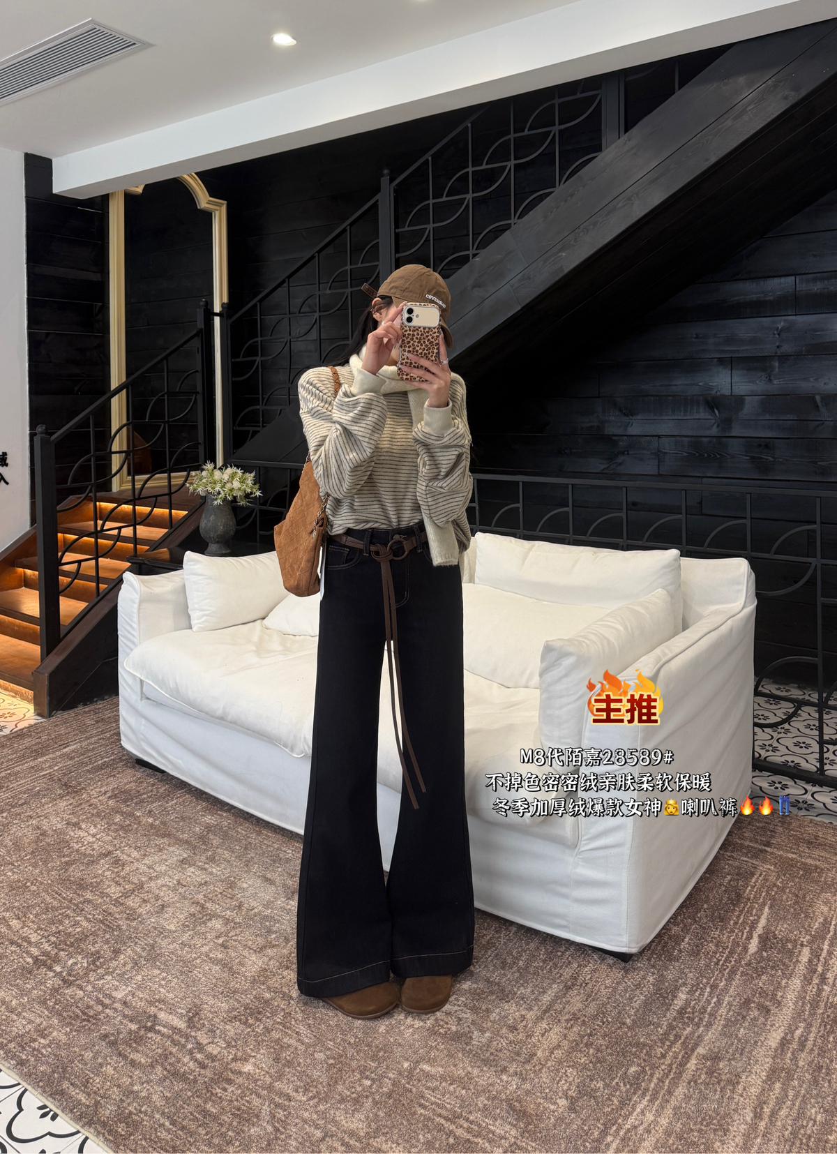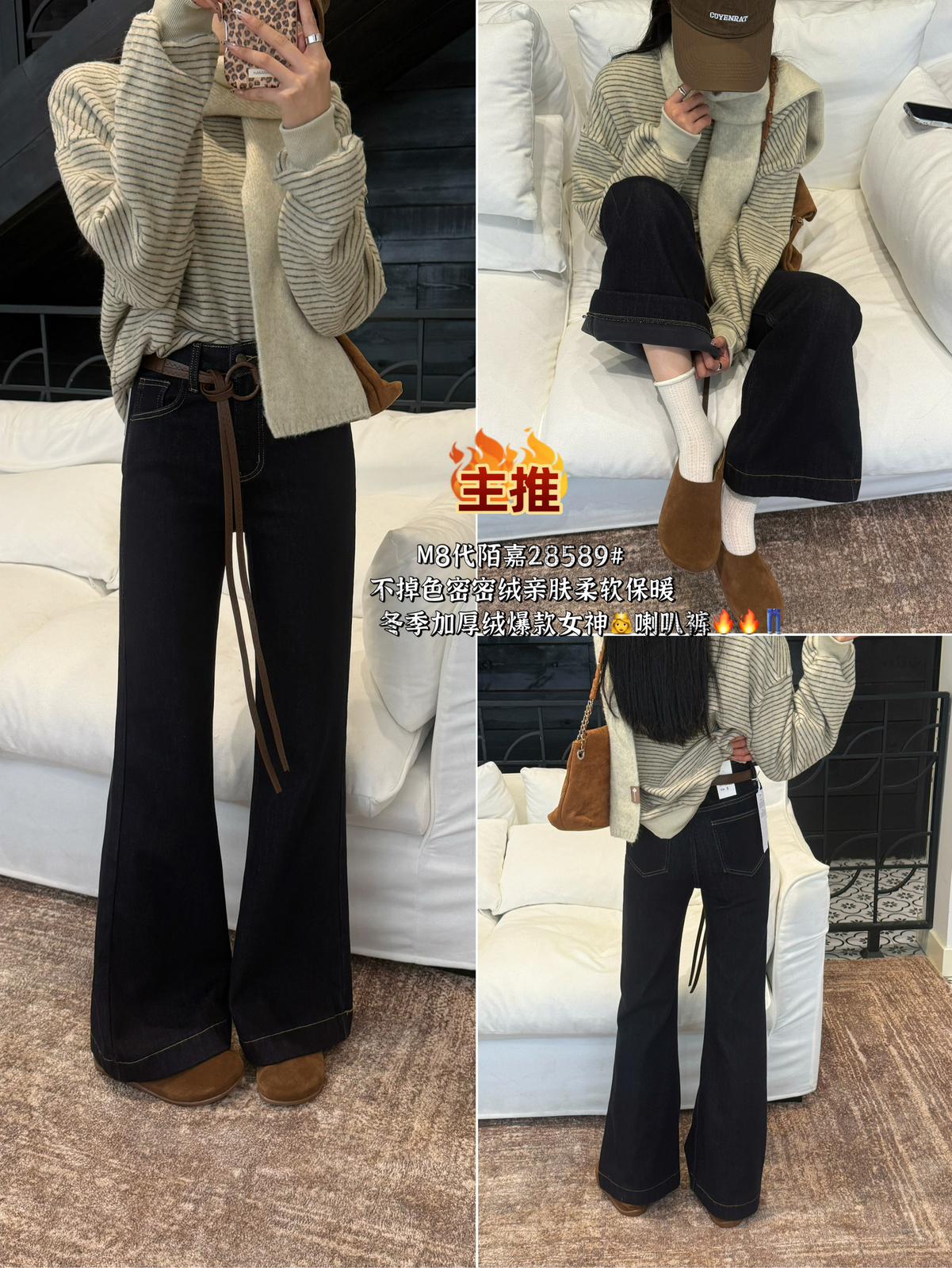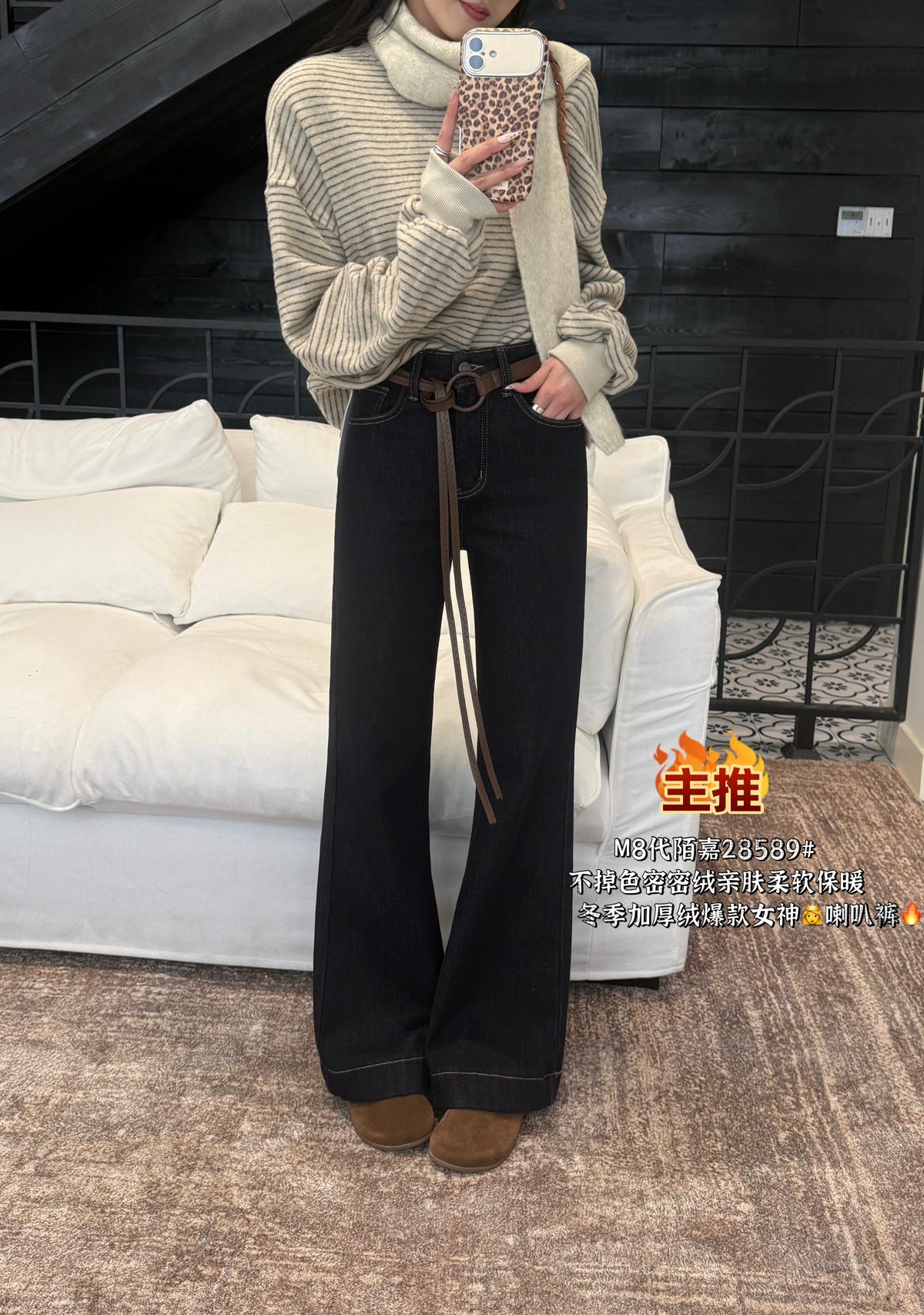 【C7686】冬季加厚保暖複合密密絨修身顯瘦顯腿長彈力喇叭褲牛仔褲(配腰帶)