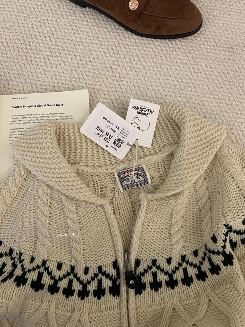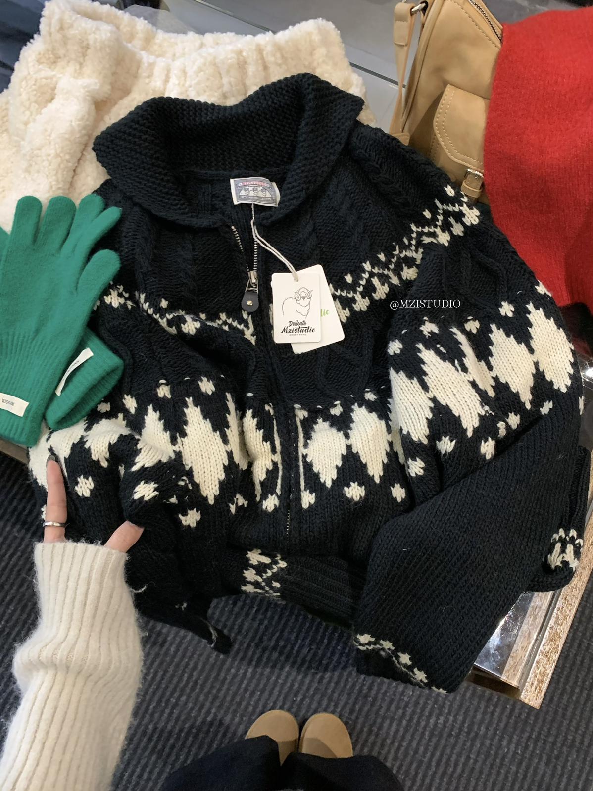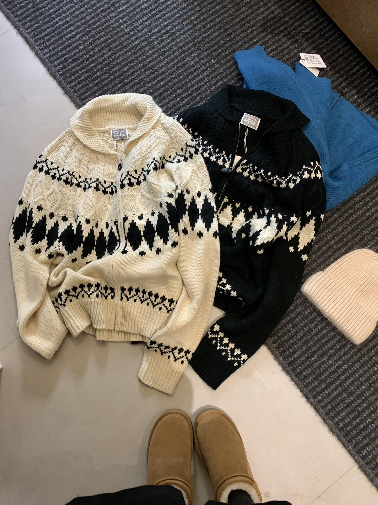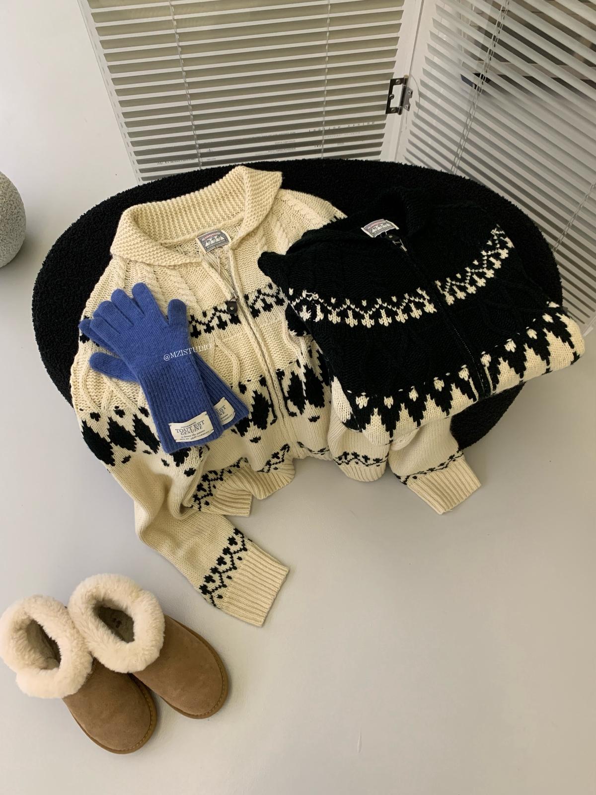 【C7683】冬日氛圍費爾島提花復古情懷翻領拉鍊外套保暖毛衣