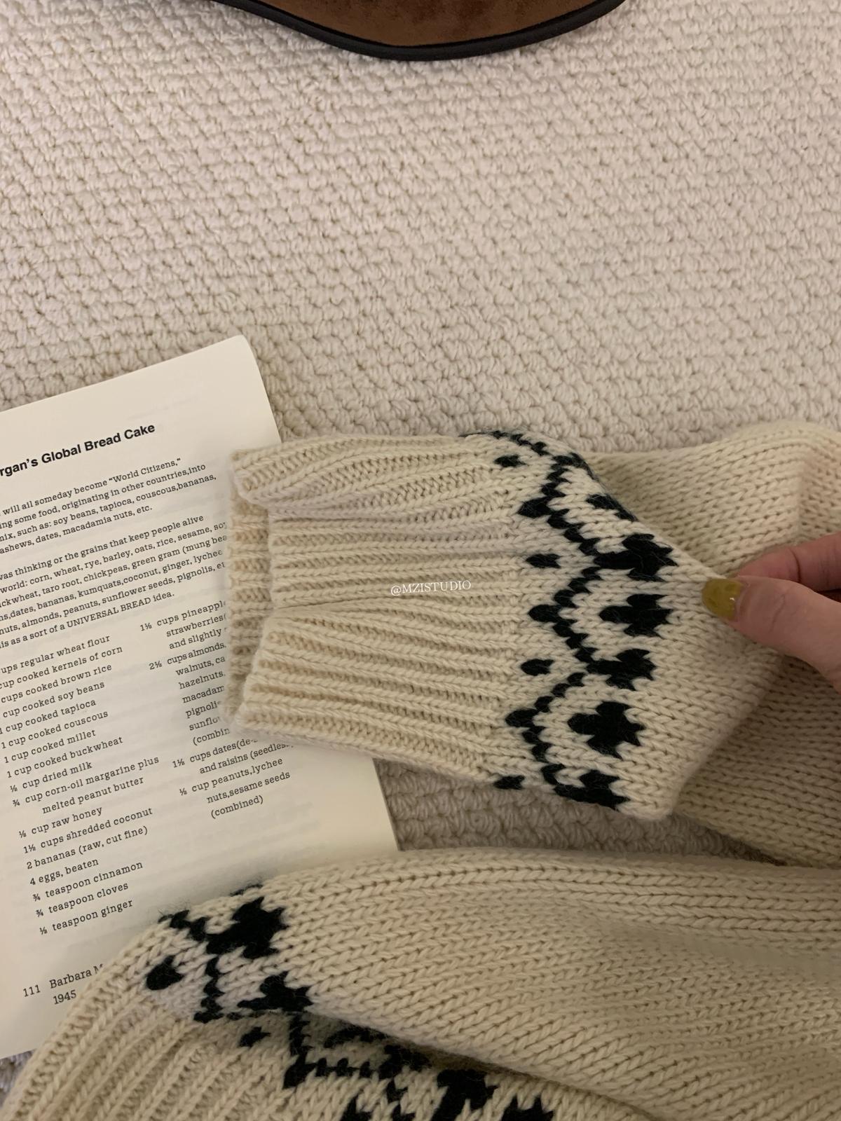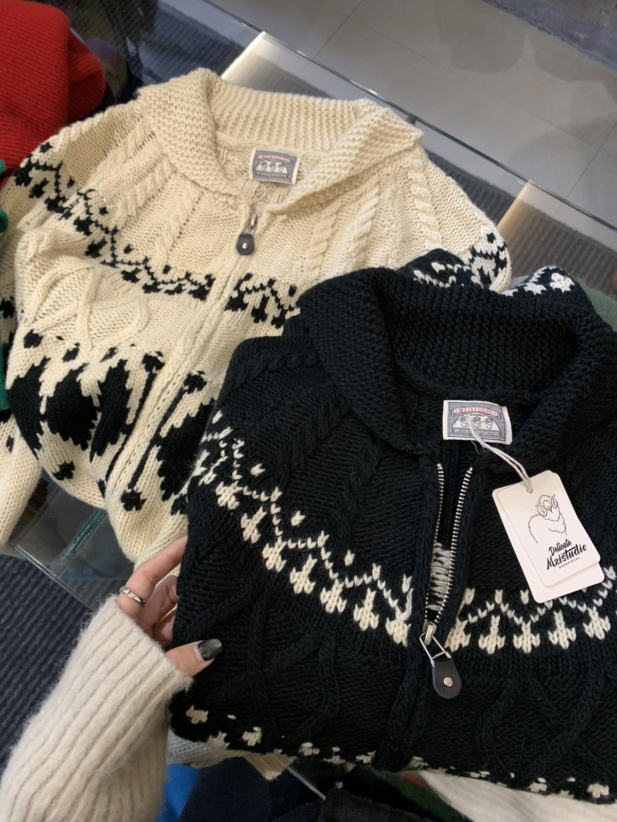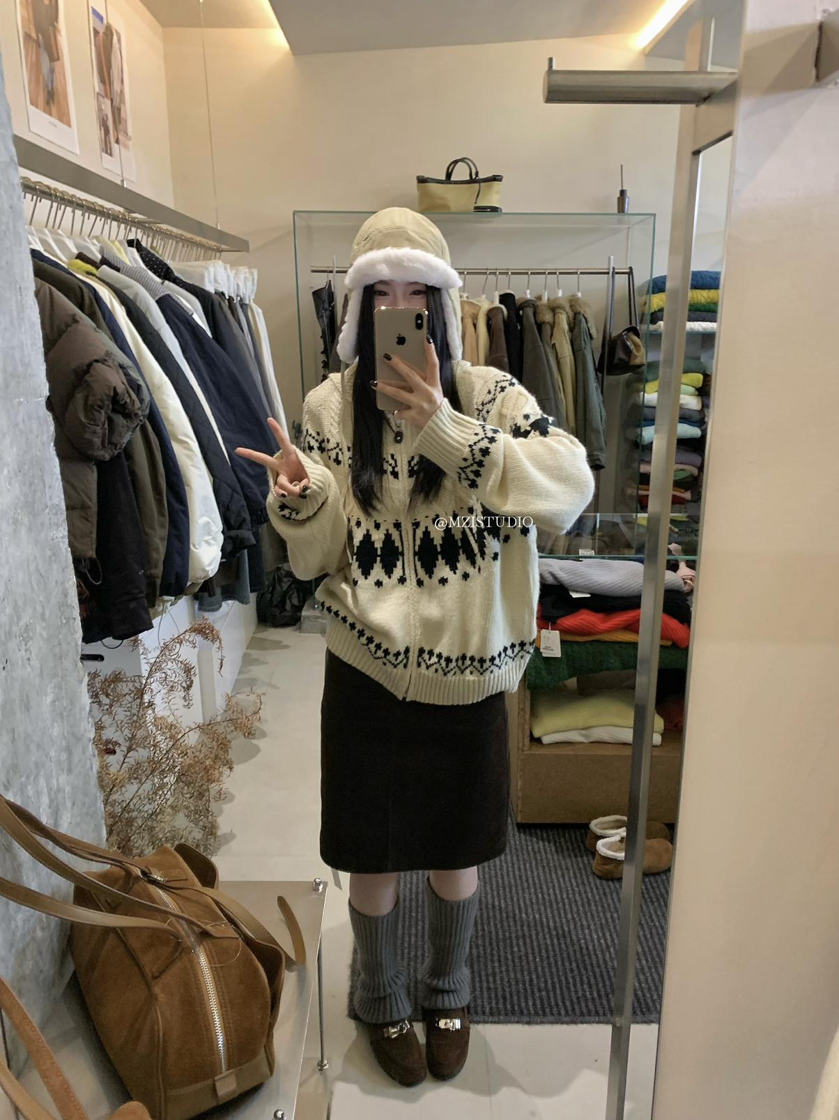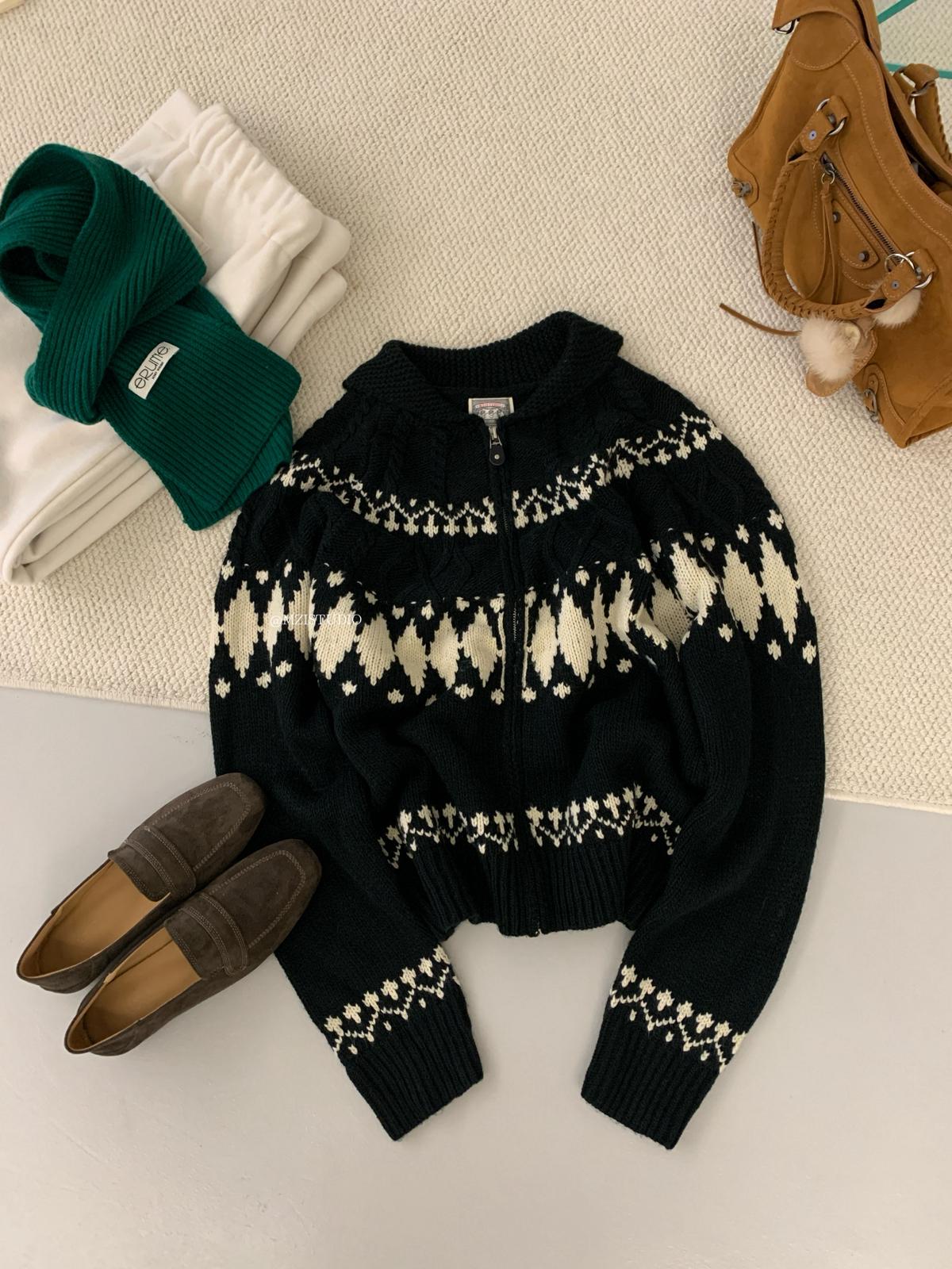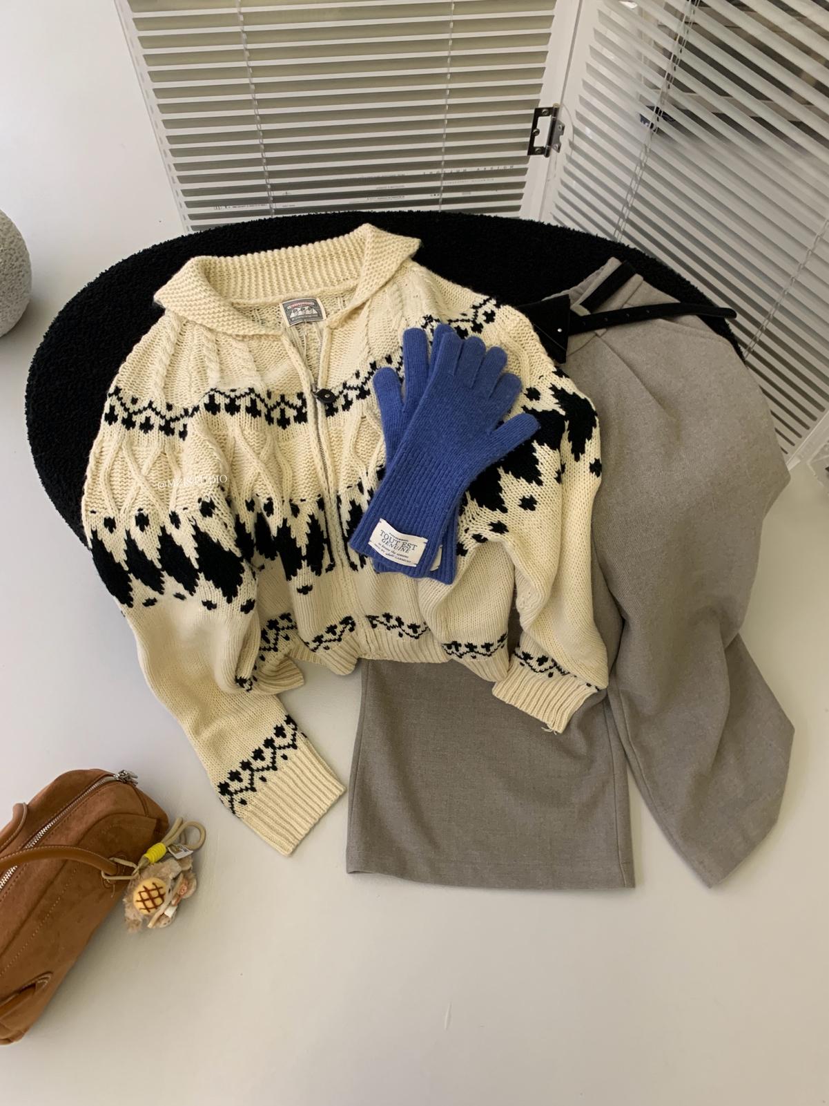 【C7683】冬日氛圍費爾島提花復古情懷翻領拉鍊外套保暖毛衣