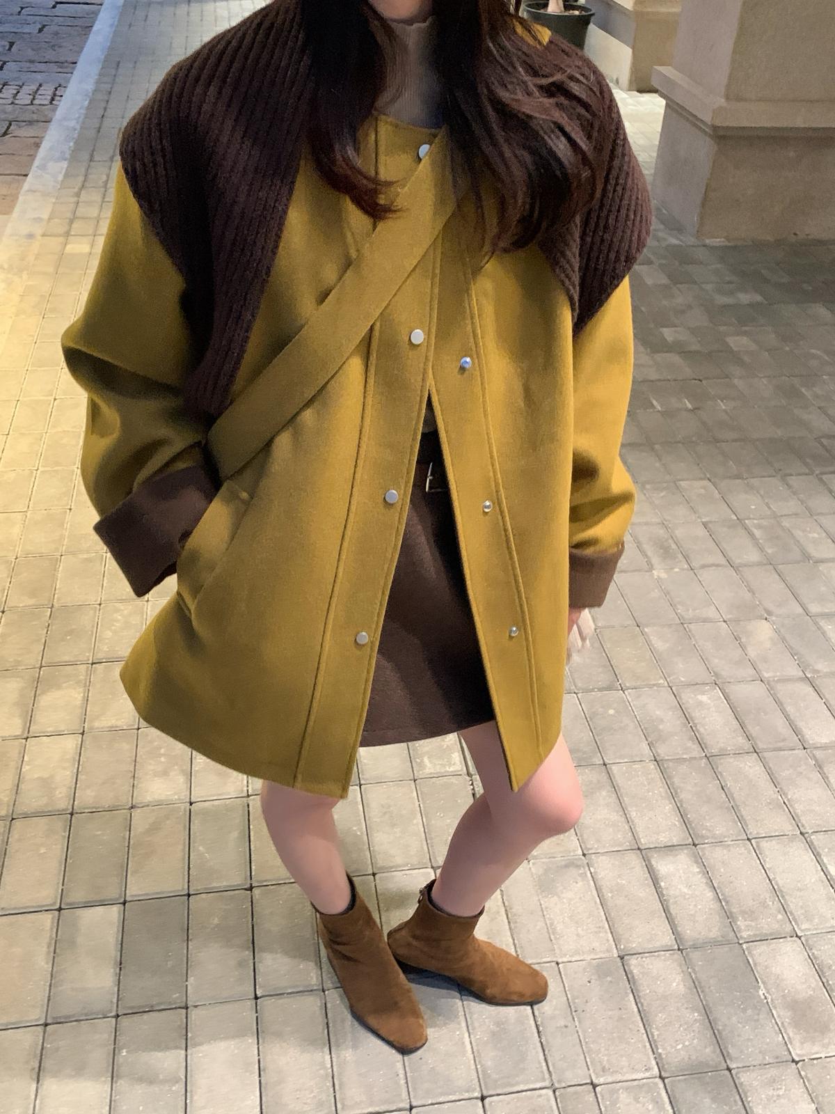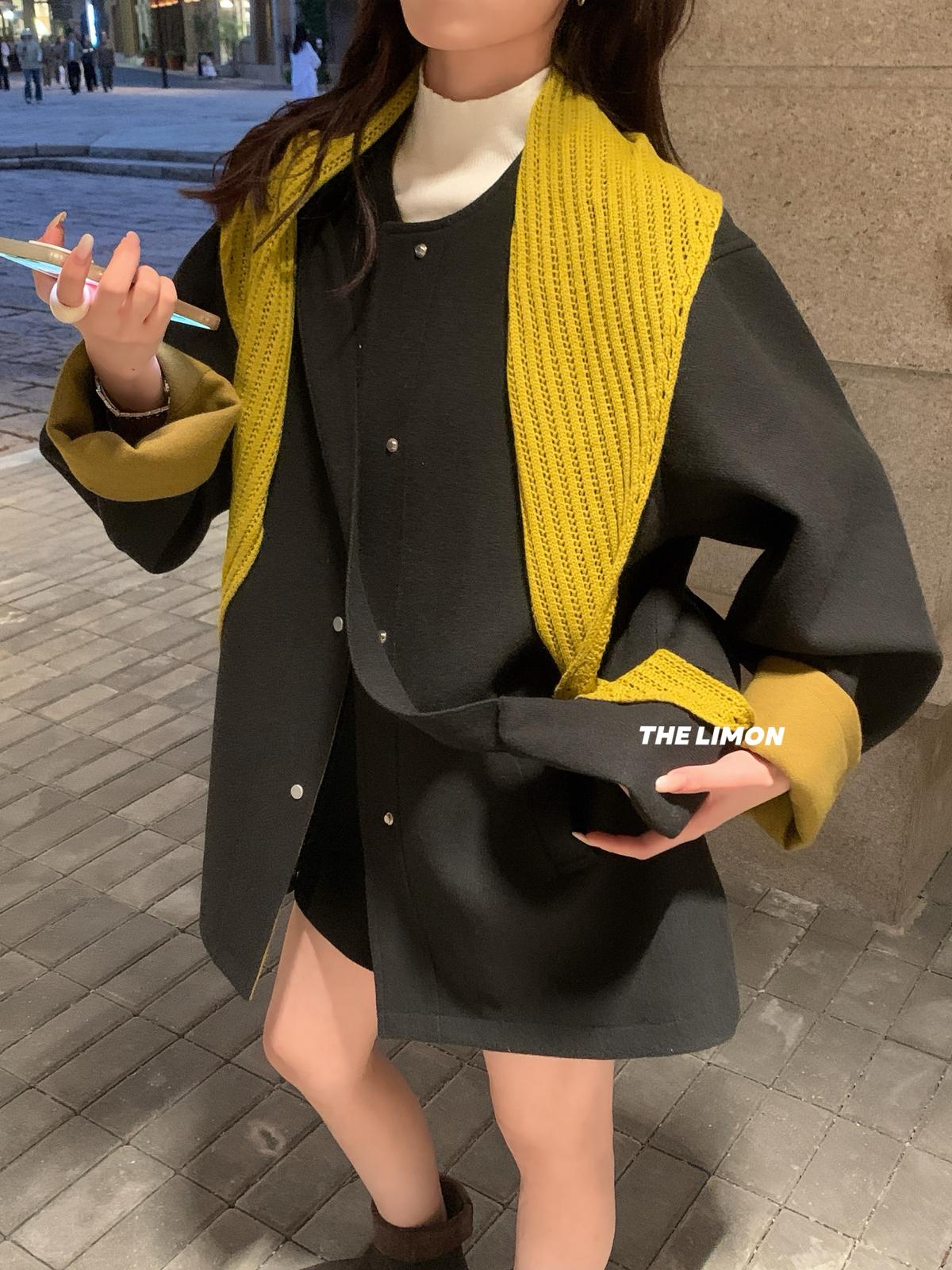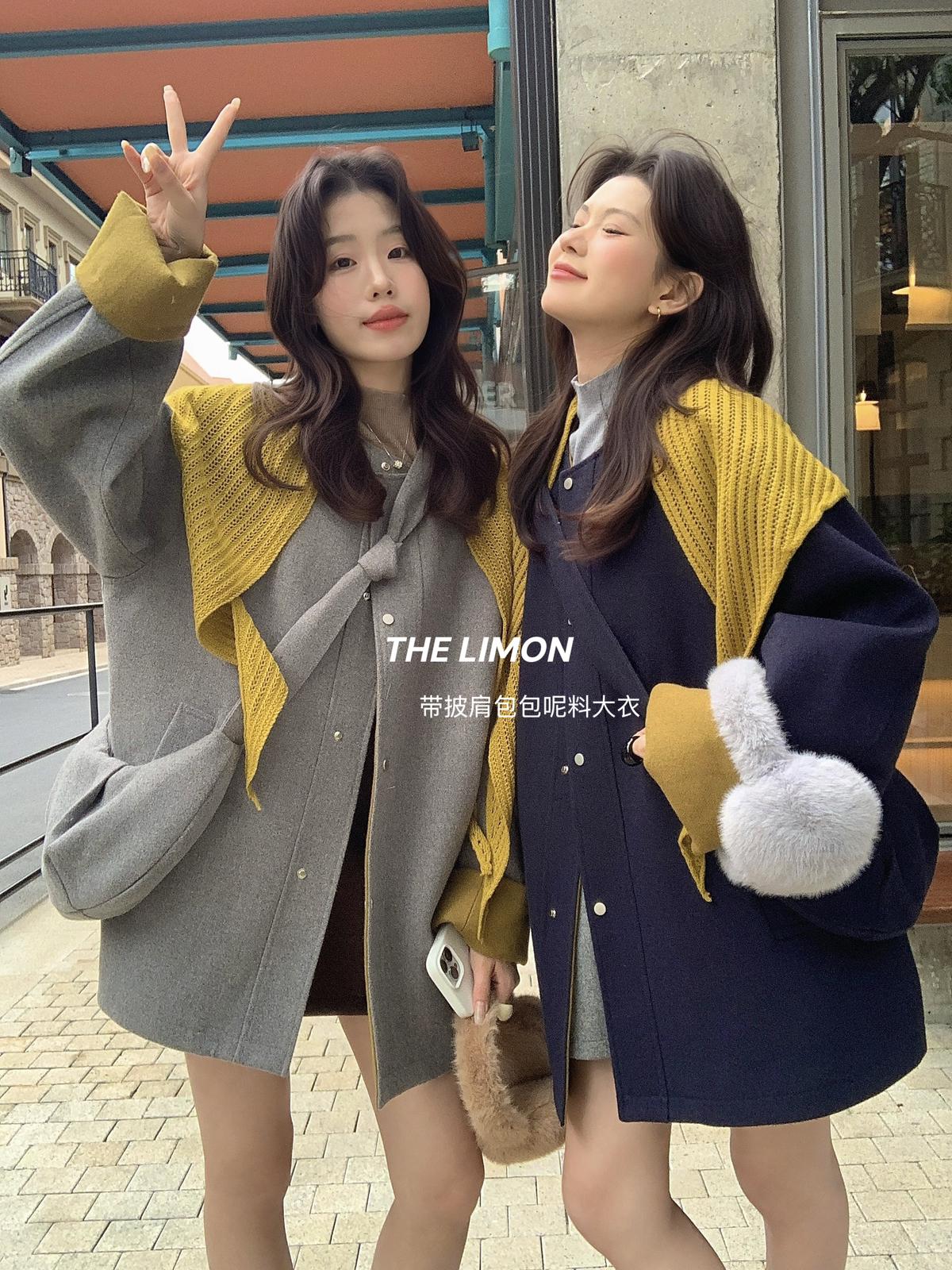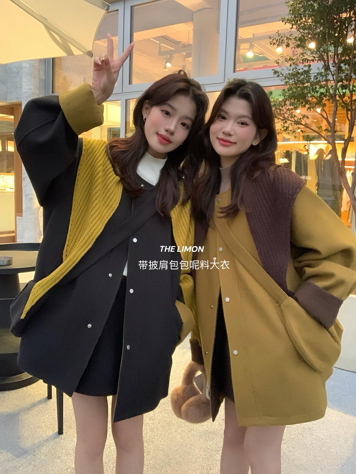 【C7697】超好看設計感撞色寬鬆呢料大衣(配披肩,斜挎包)