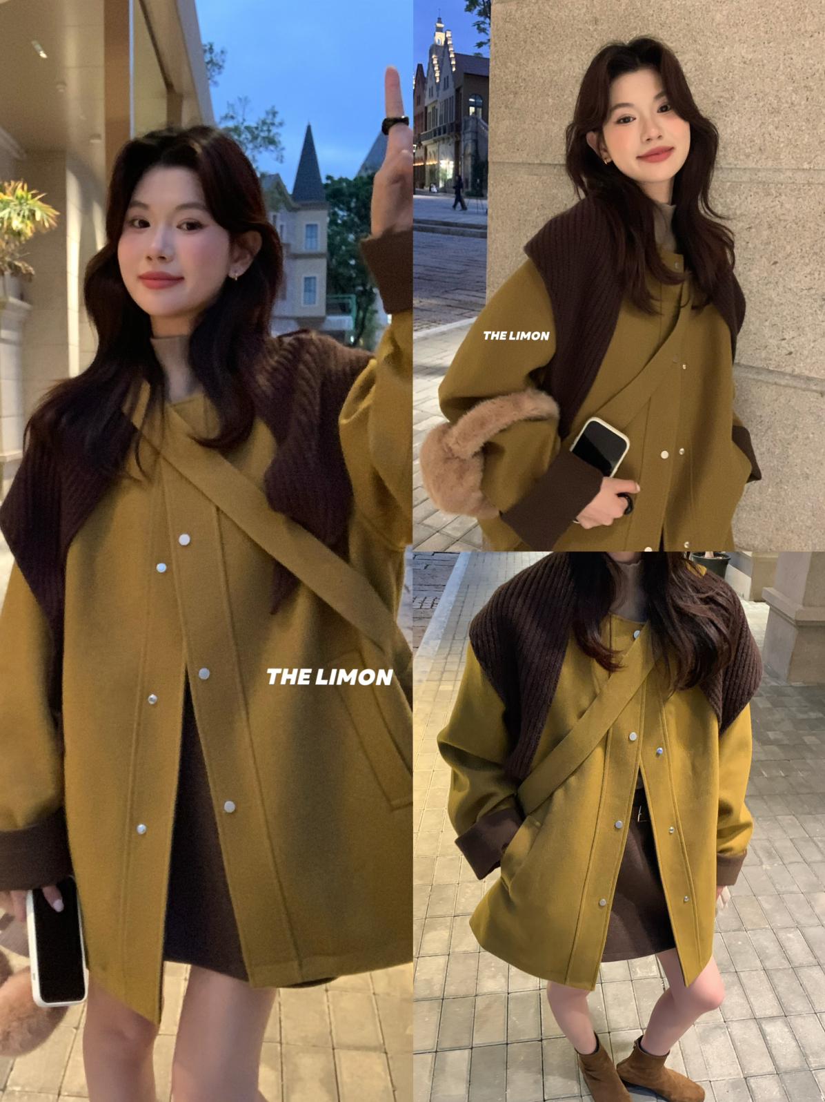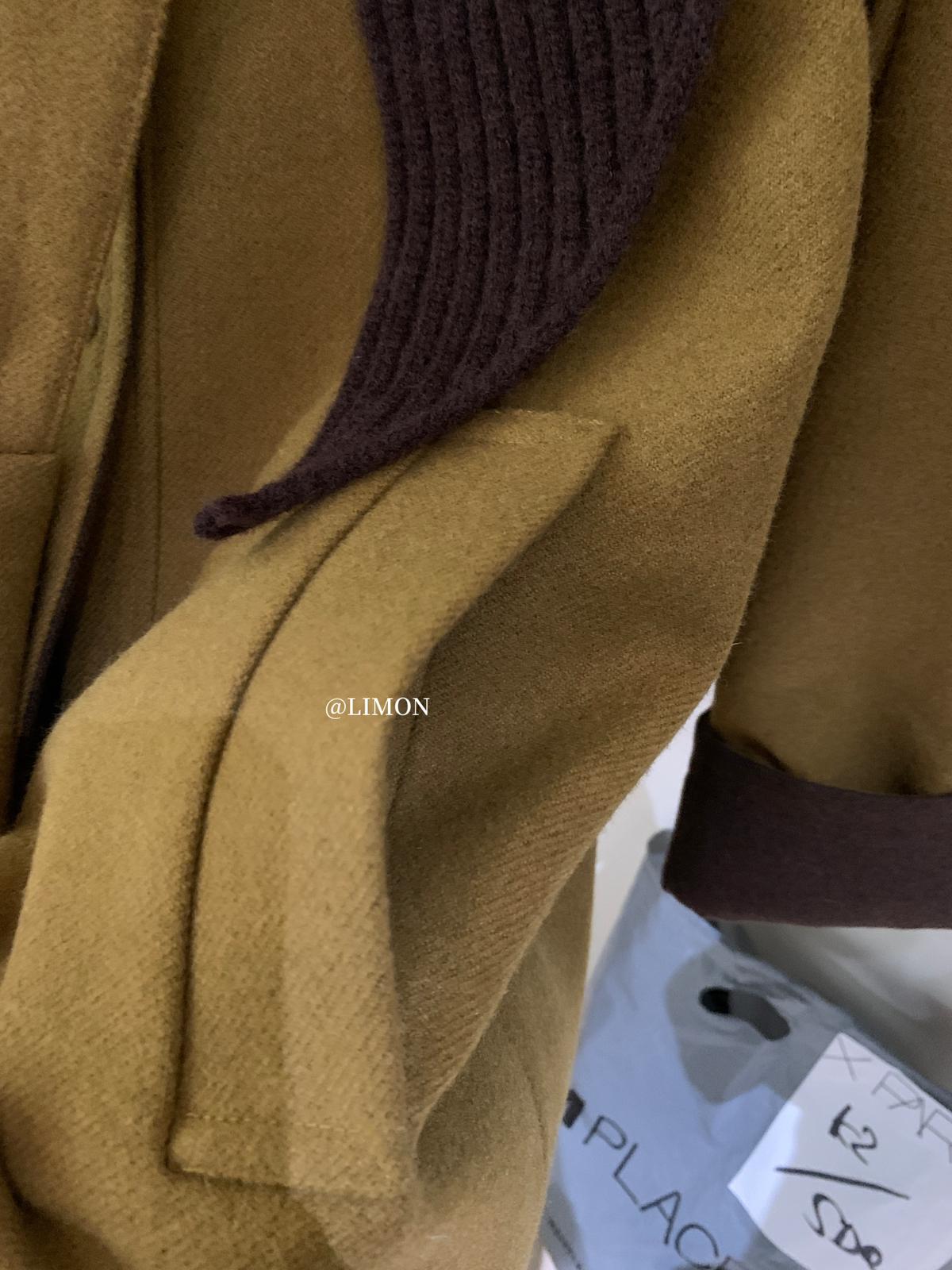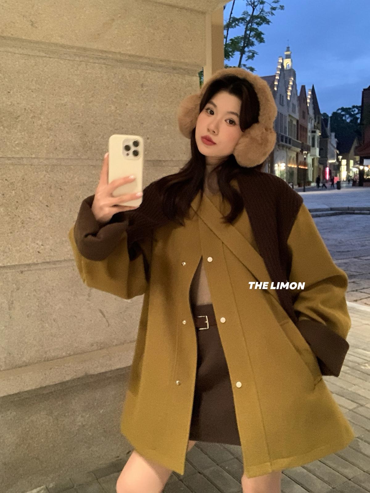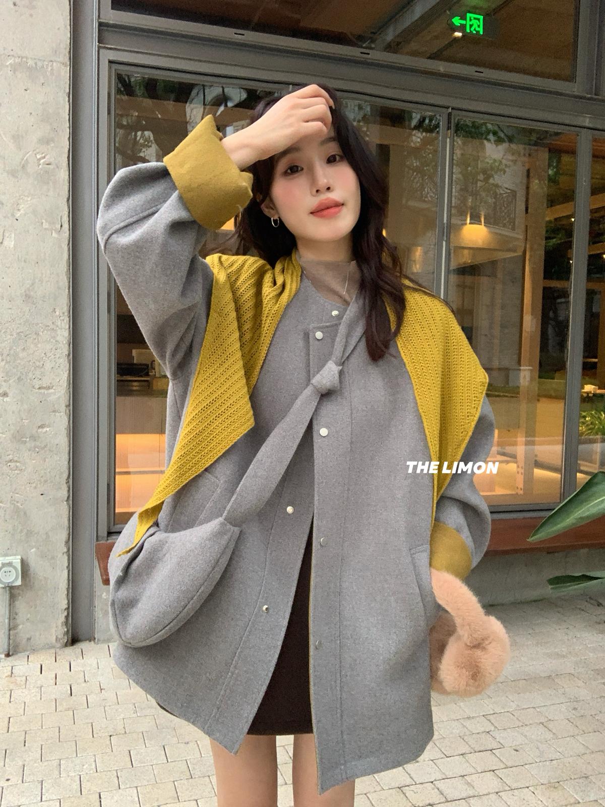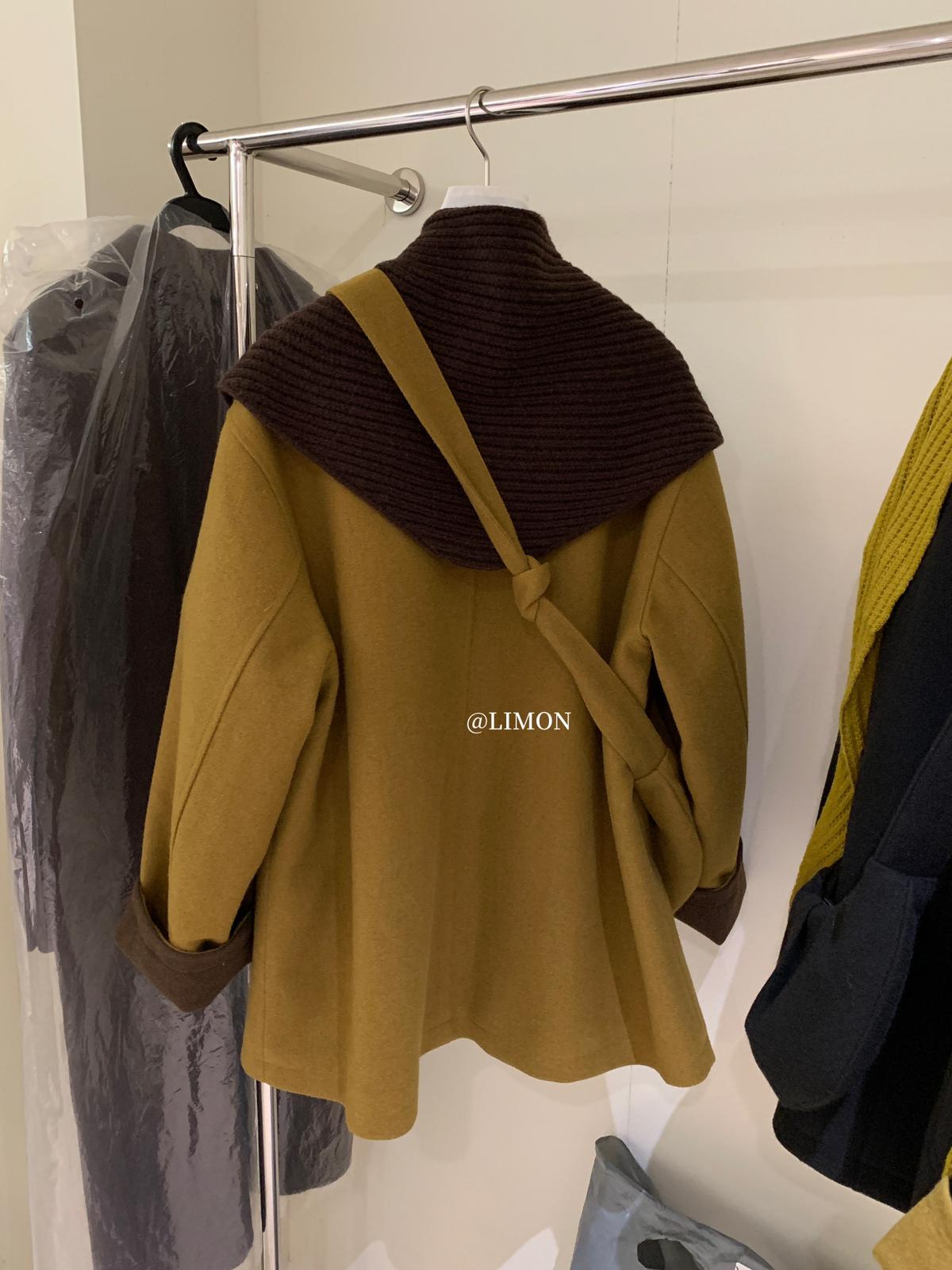【C7697】超好看設計感撞色寬鬆呢料大衣(配披肩,斜挎包)