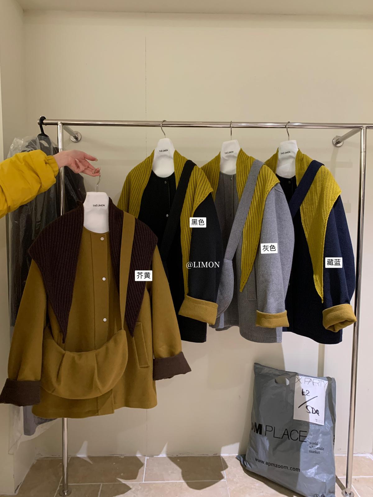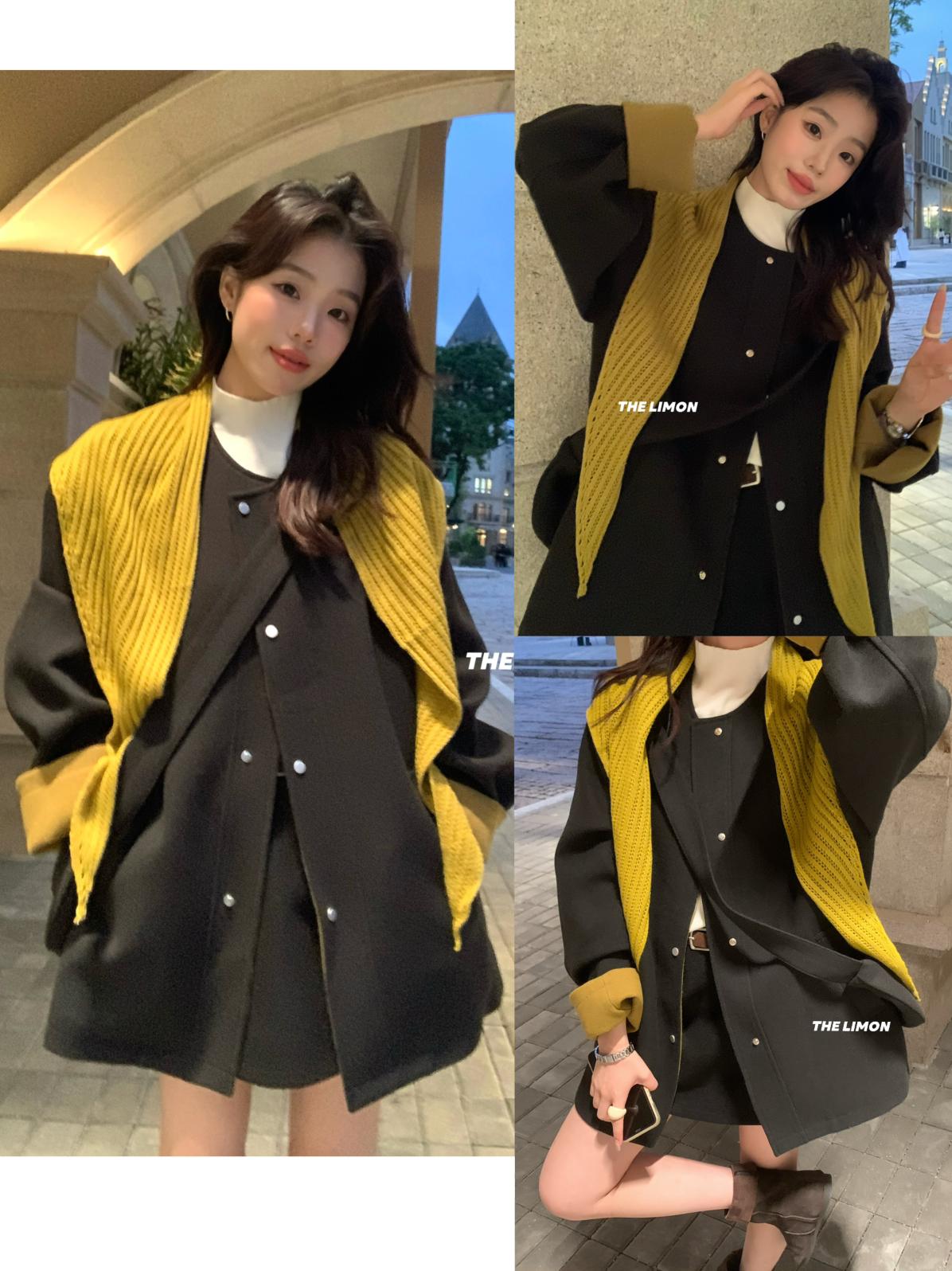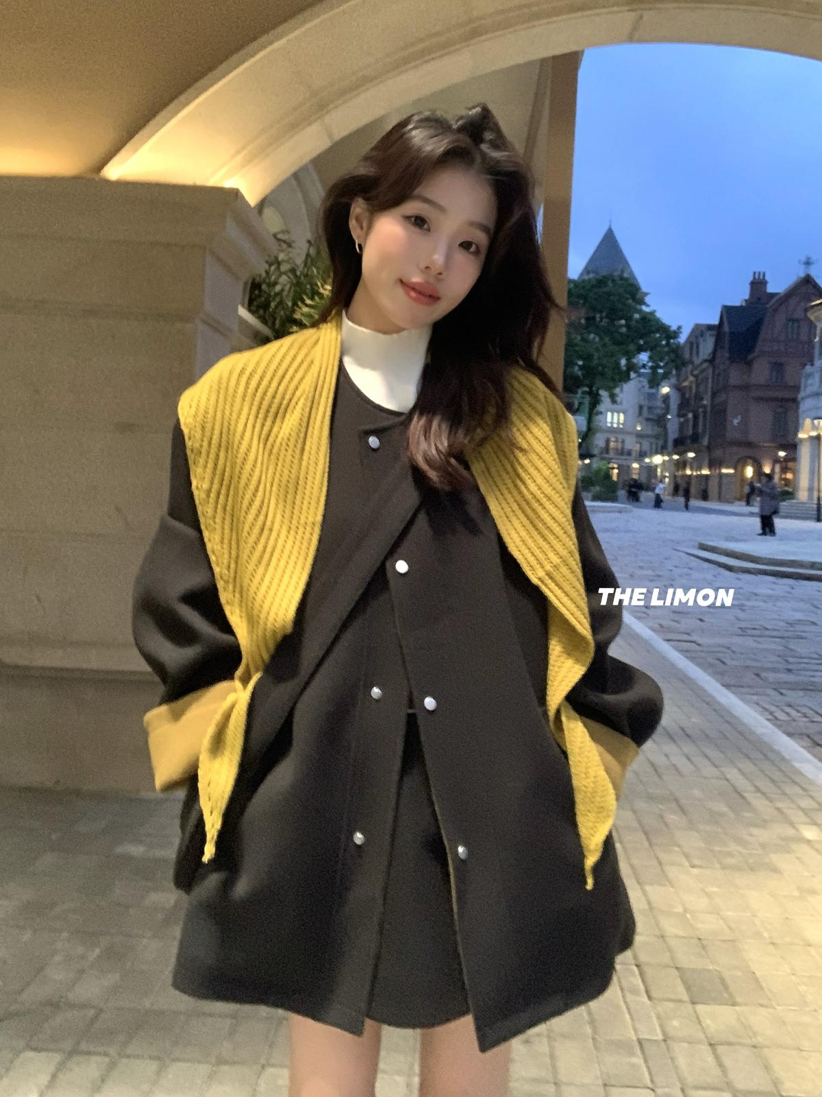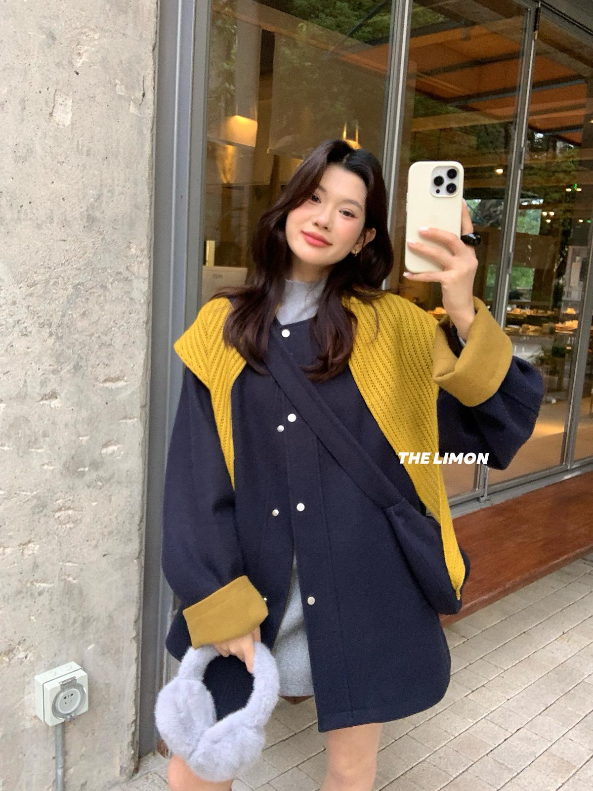 【C7697】超好看設計感撞色寬鬆呢料大衣(配披肩,斜挎包)