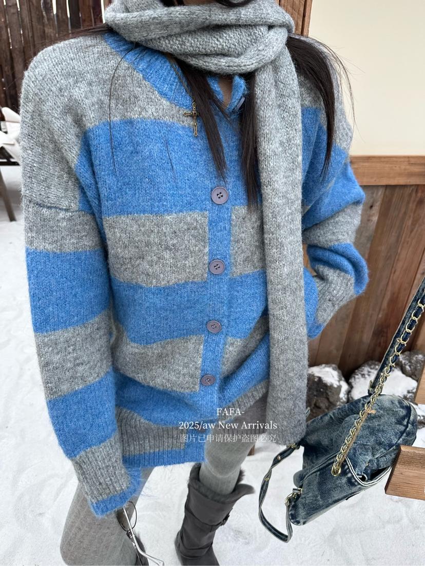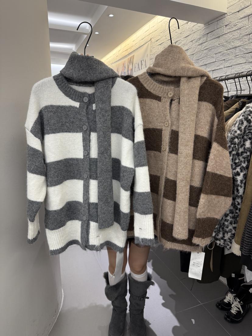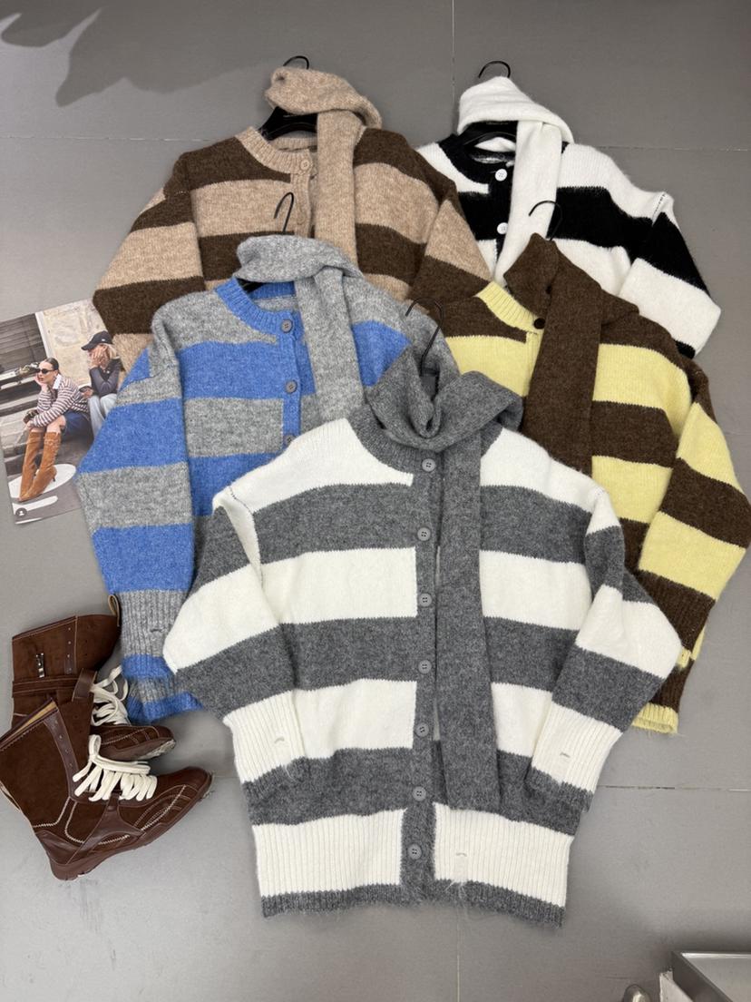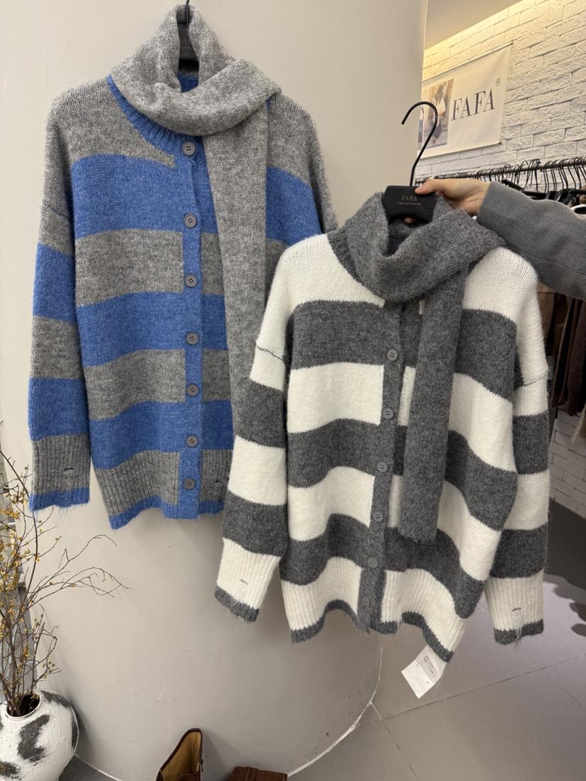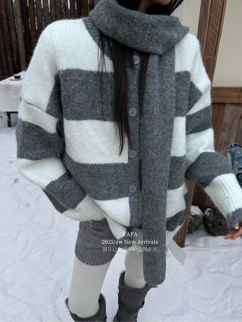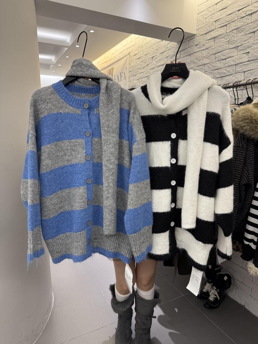 【C7731】條紋百搭圓領單排扣長袖保暖毛衣(配圍巾)