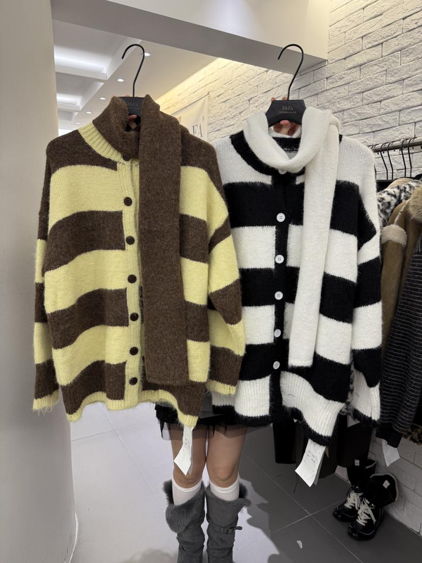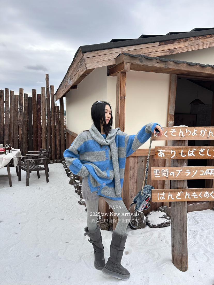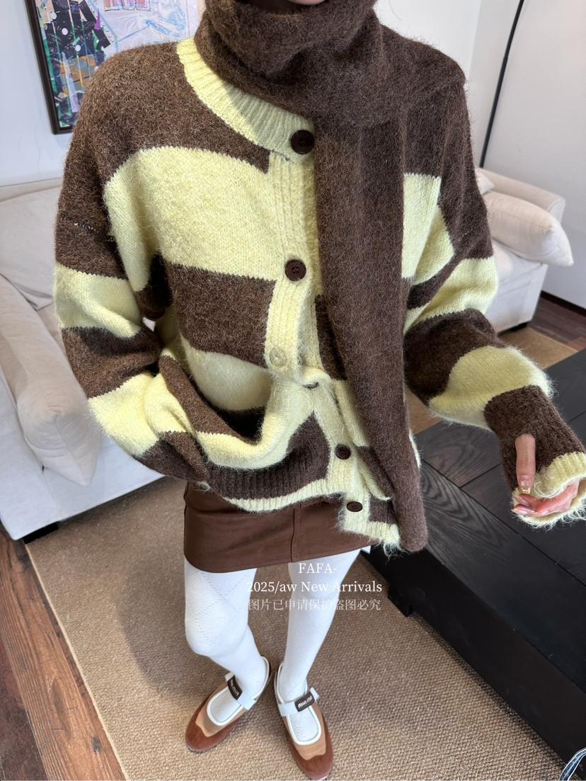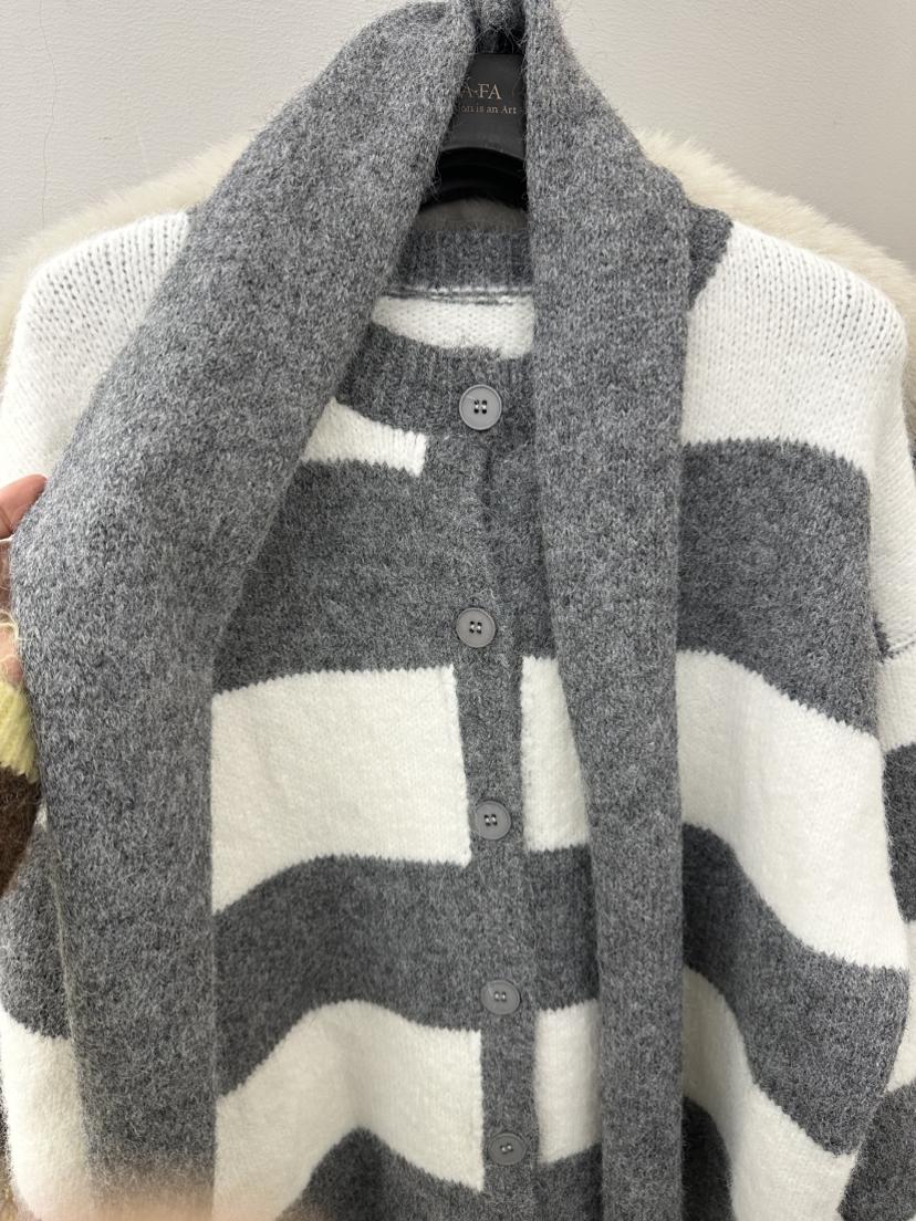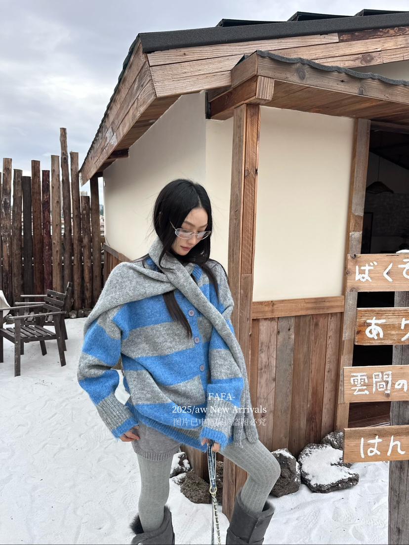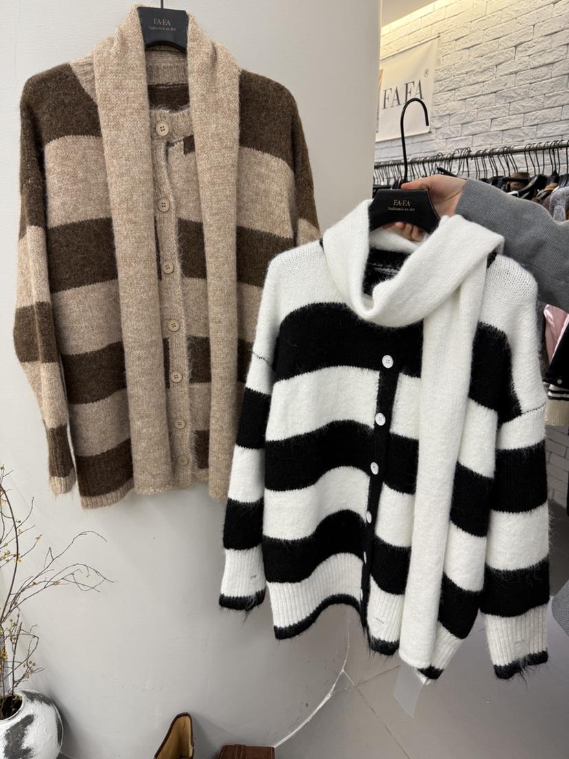 【C7731】條紋百搭圓領單排扣長袖保暖毛衣(配圍巾)