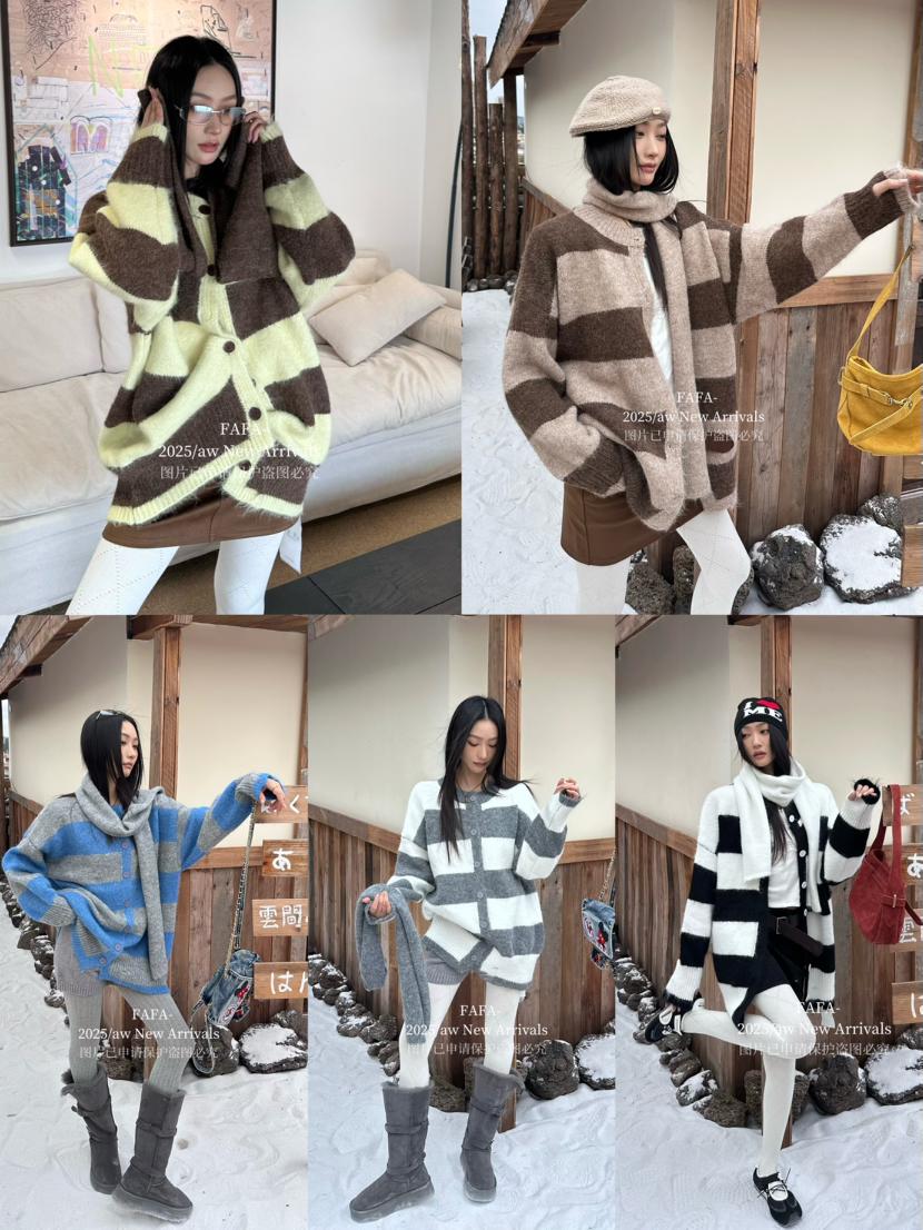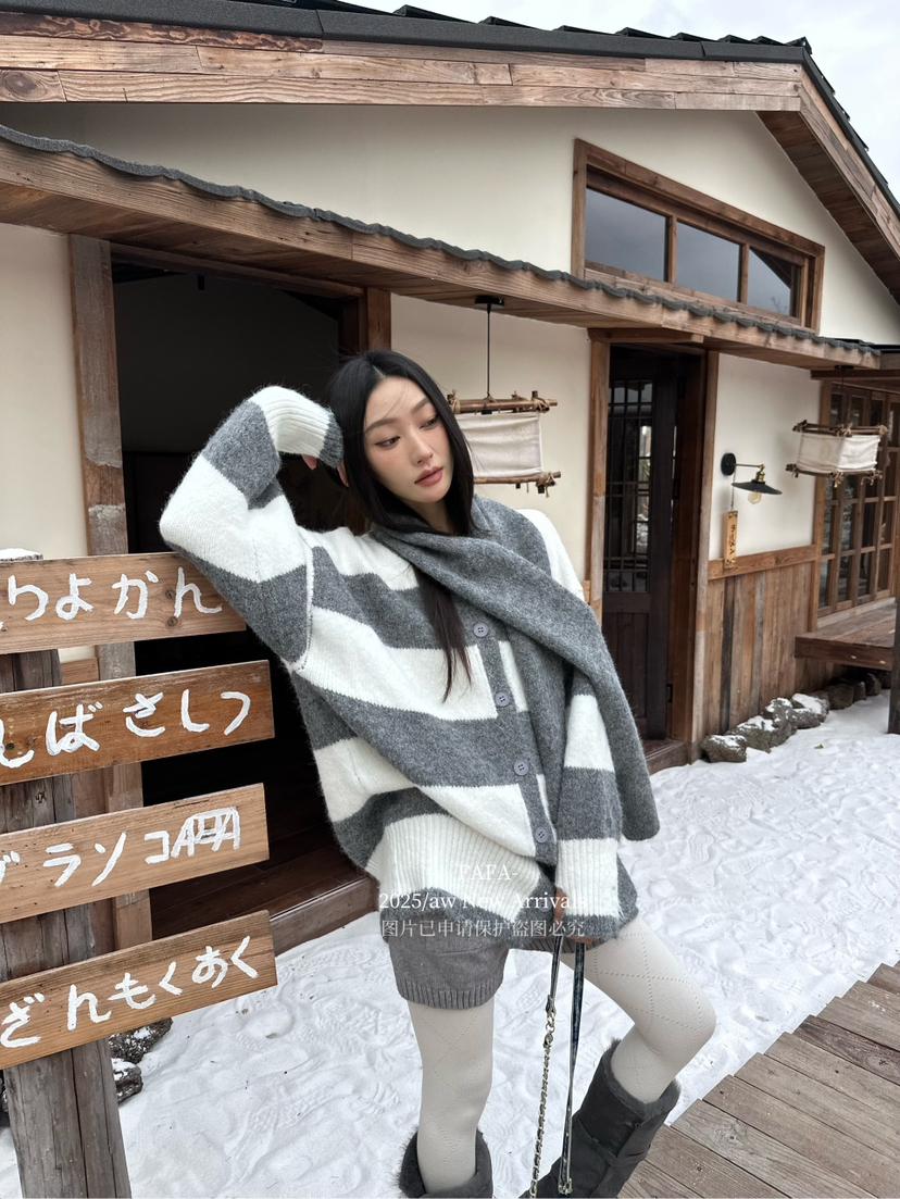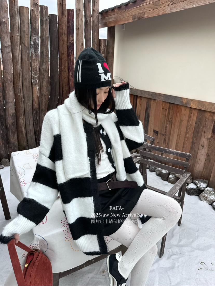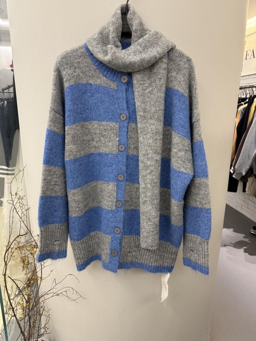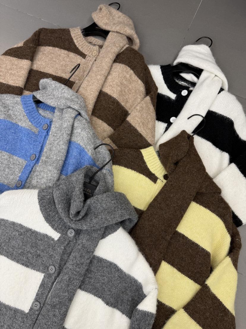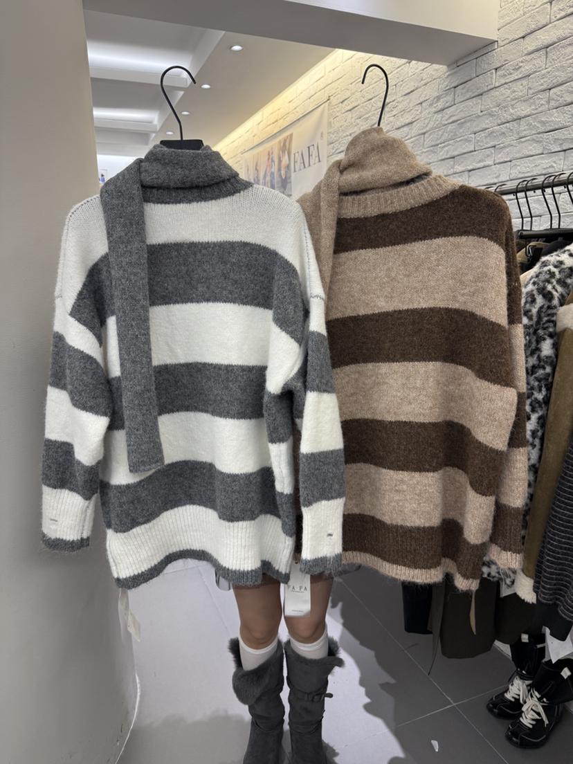 【C7731】條紋百搭圓領單排扣長袖保暖毛衣(配圍巾)