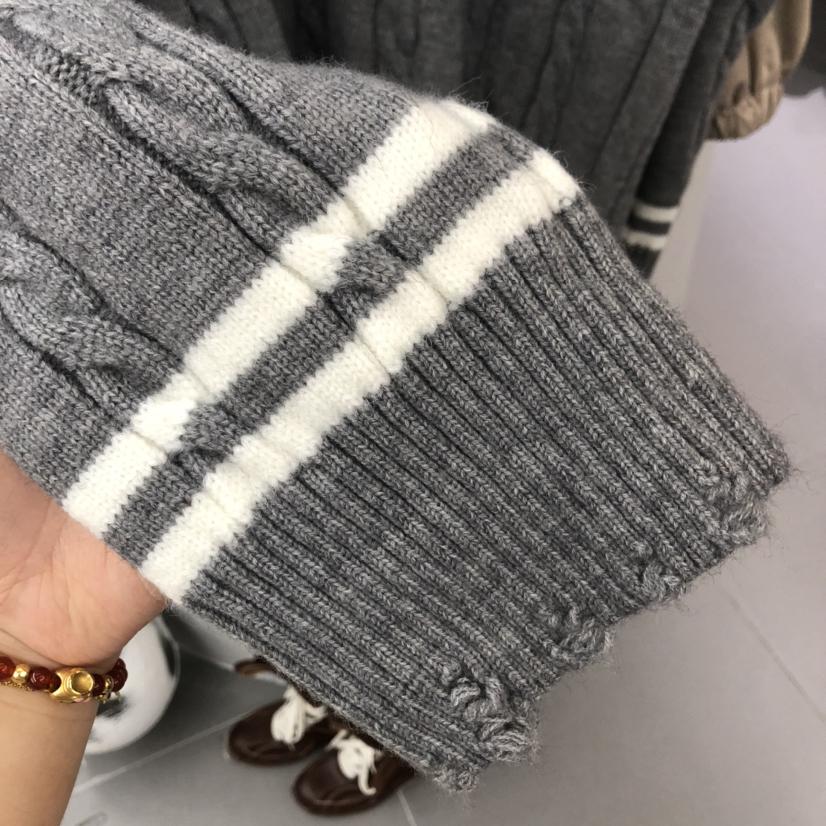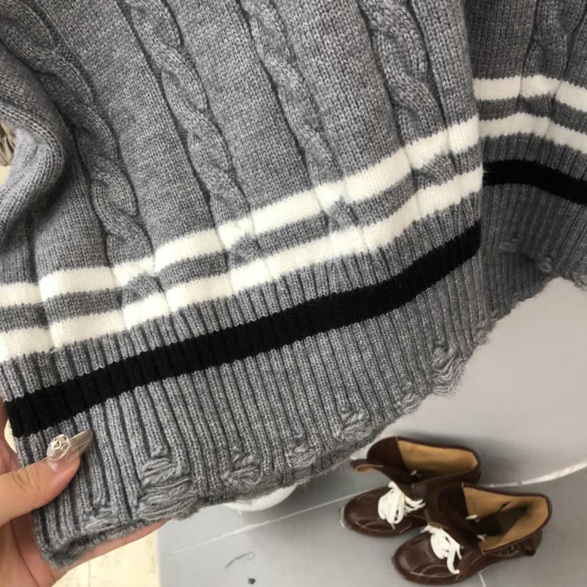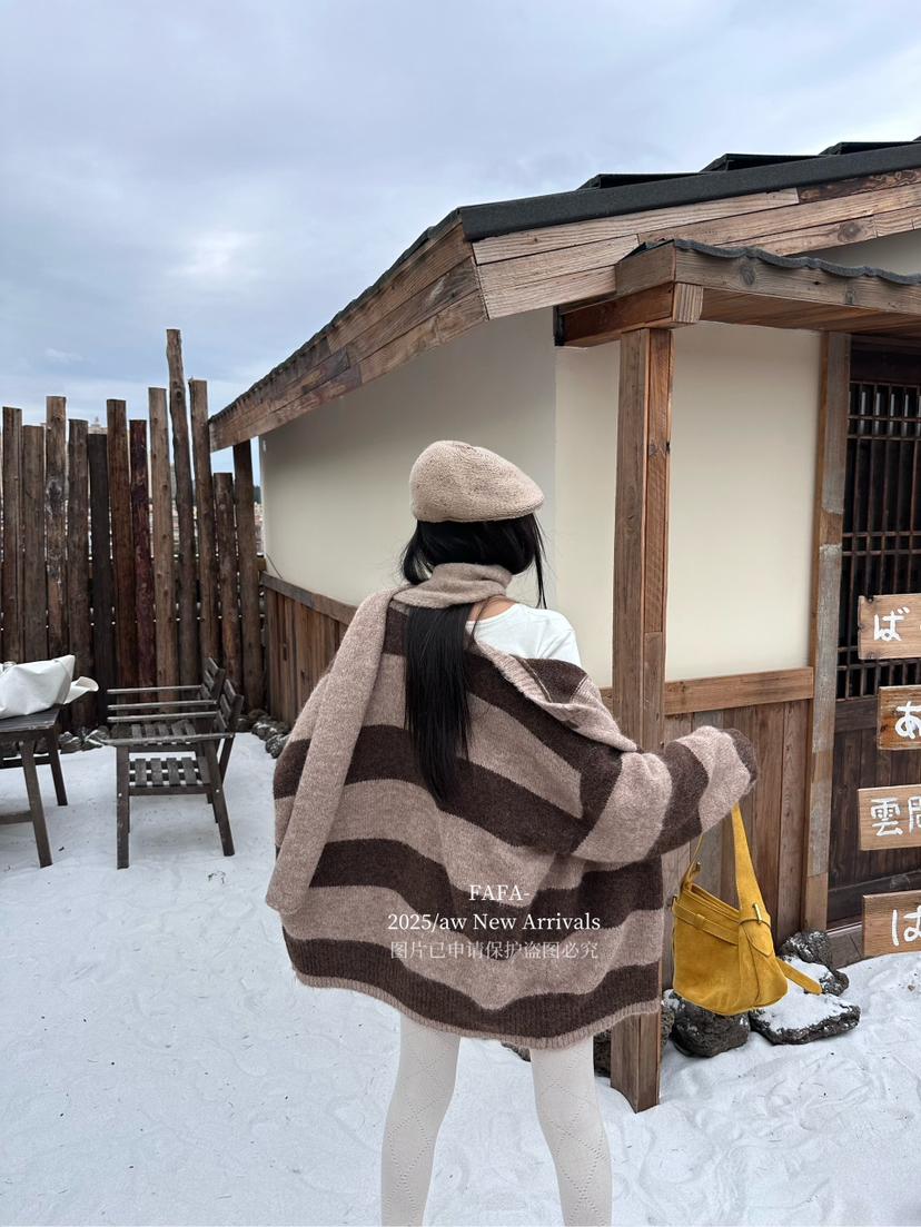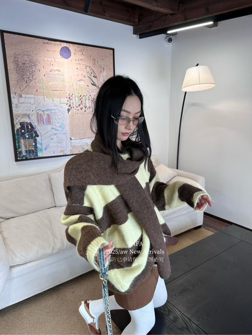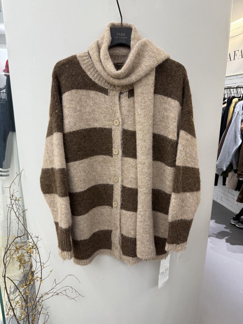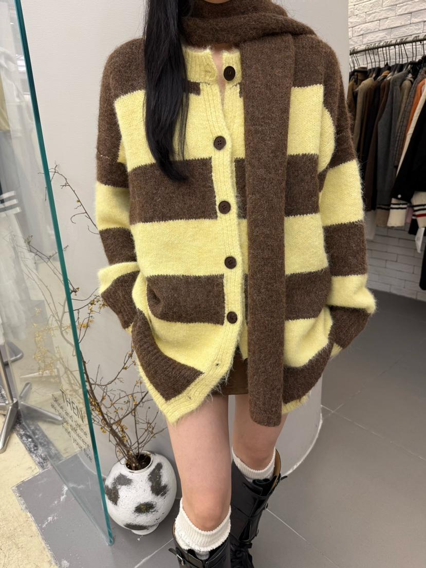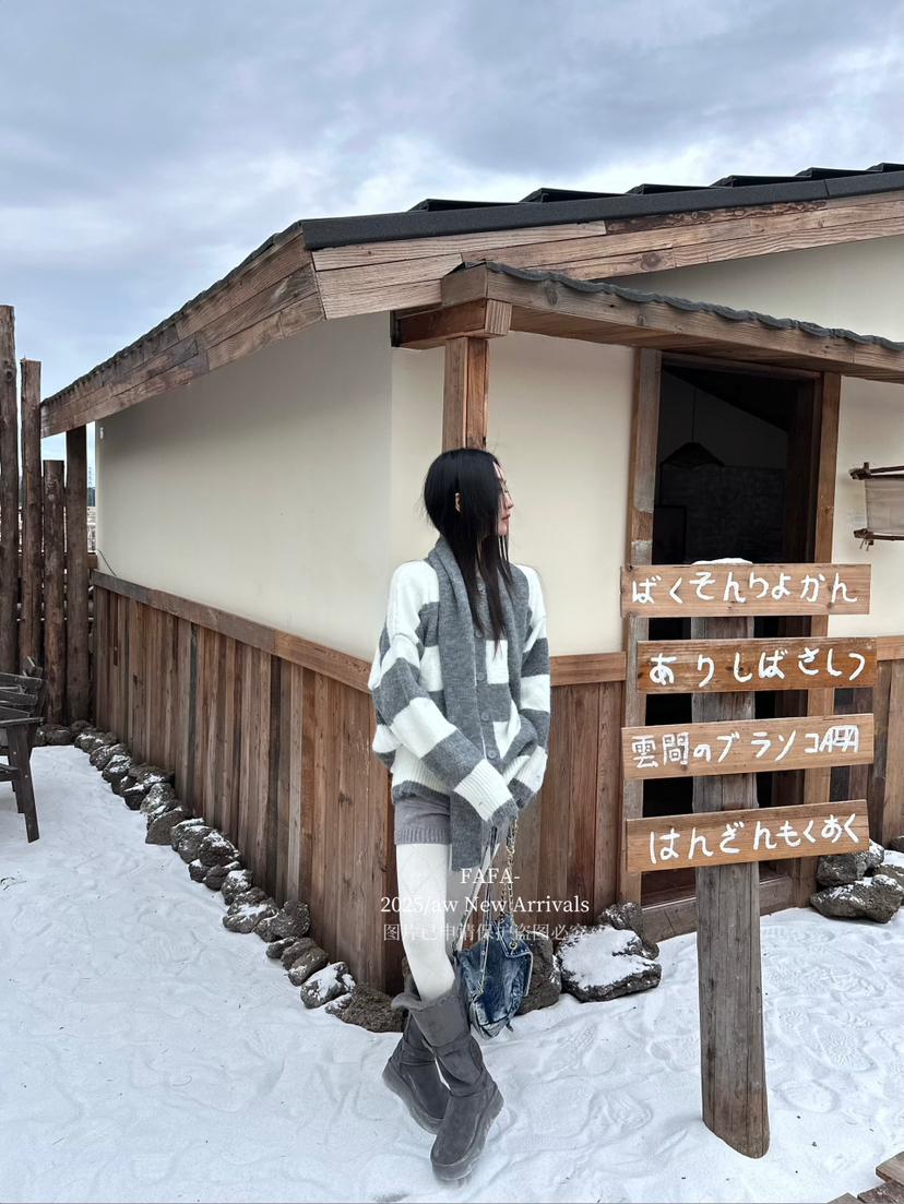 【C7731】條紋百搭圓領單排扣長袖保暖毛衣(配圍巾)